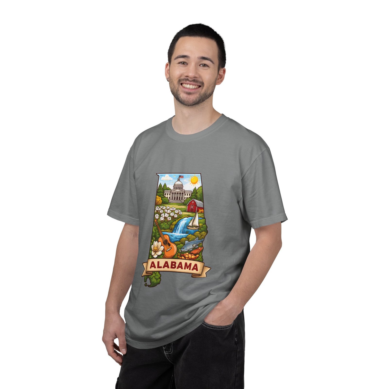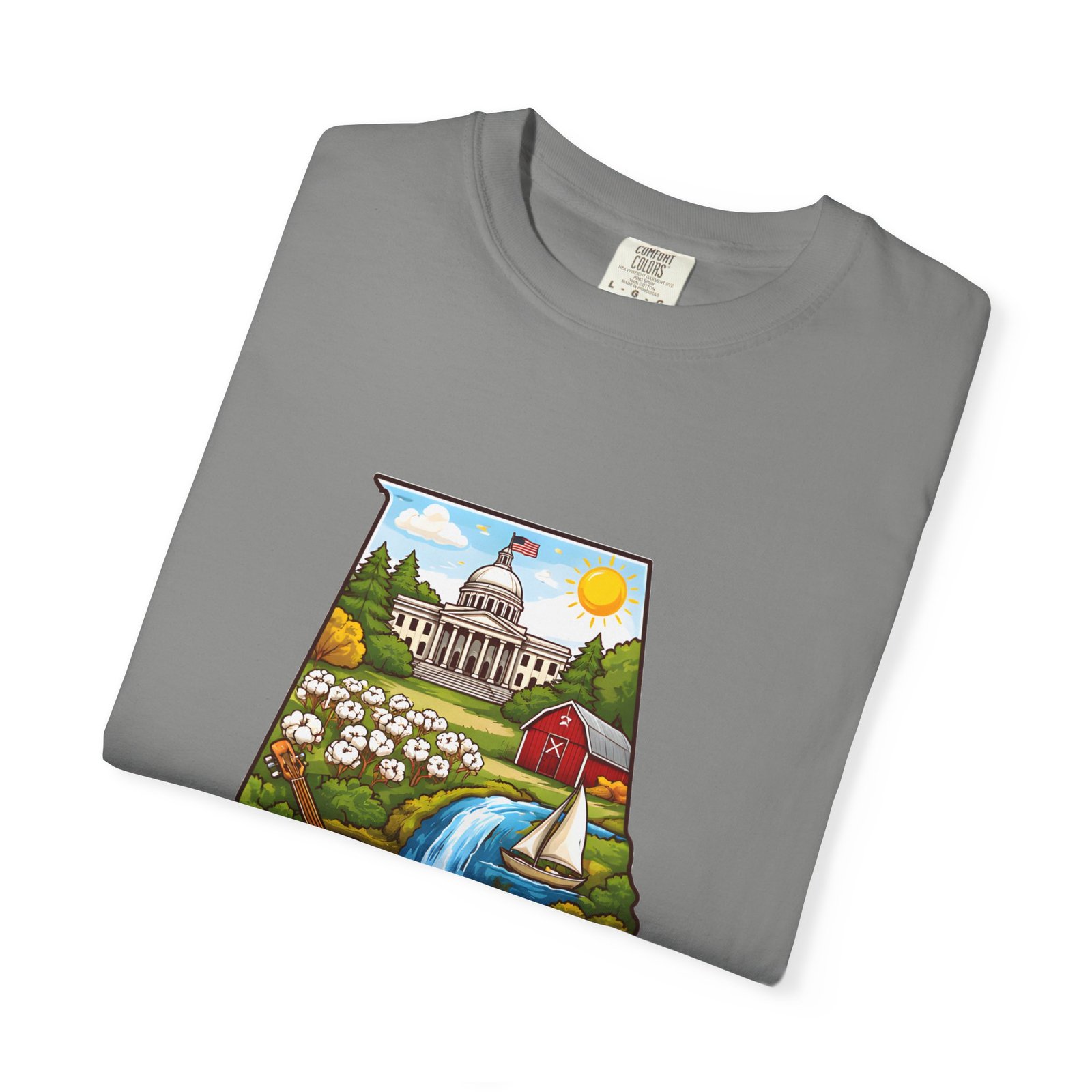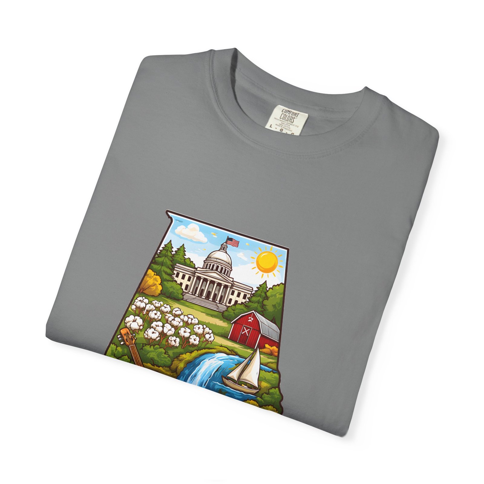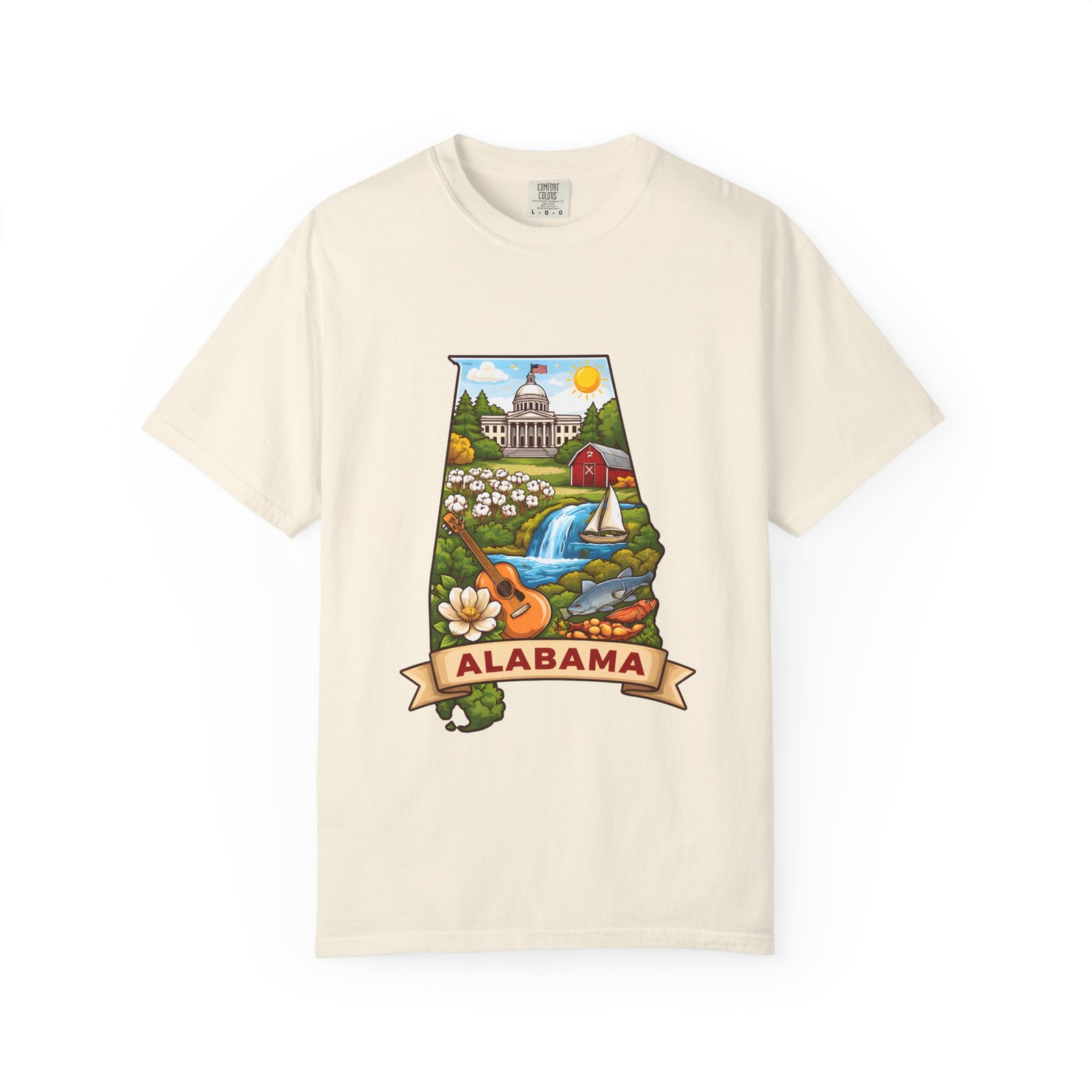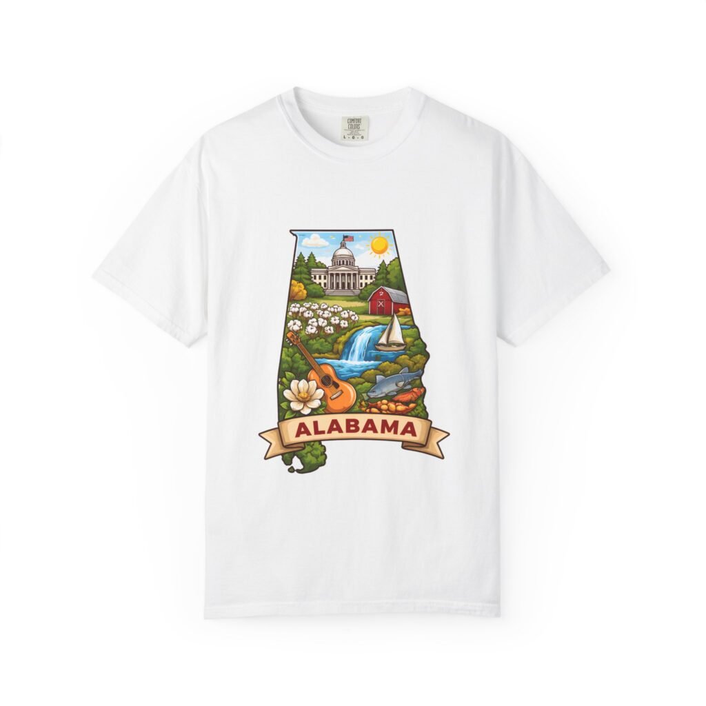 Soft, heavyweight comfort meets hometown pride. This garment-dyed cotton tee carries a vibrant Alabama illustration—capitol dome, rolling hills, a river and wildflowers—centered on the chest. The relaxed, slightly lived-in feel of the dye and heavyweight knit makes it a go-to layer for weekend drives, farmers market mornings, and slow afternoons by the river. It sits comfortably through long days outdoors and washes into an even softer hand without losing its shape or bold print.