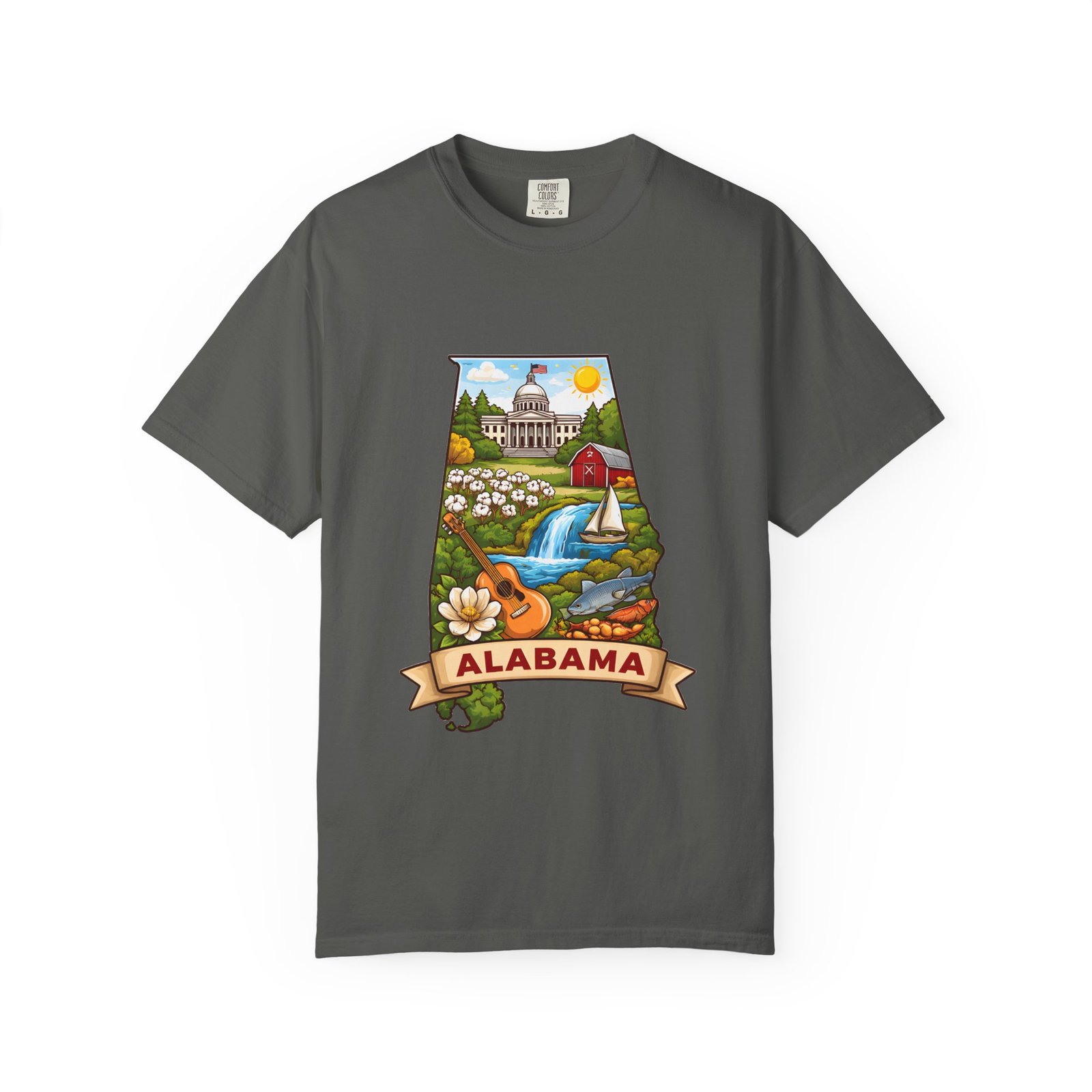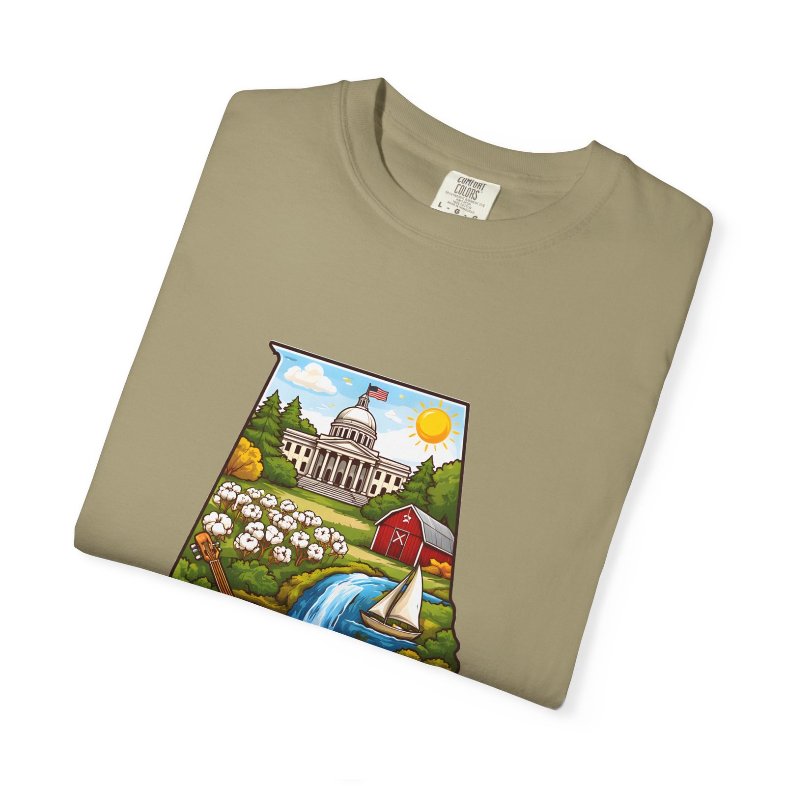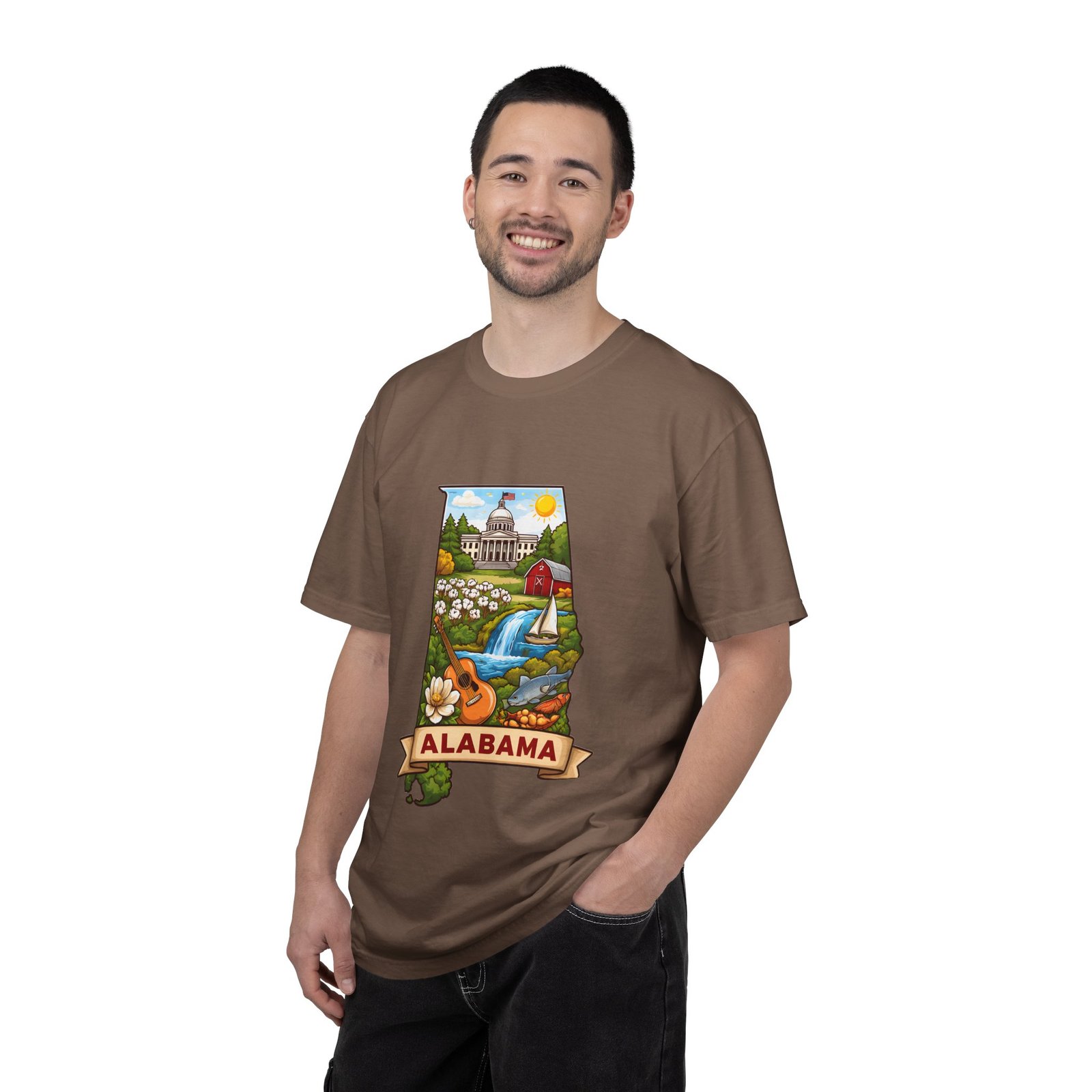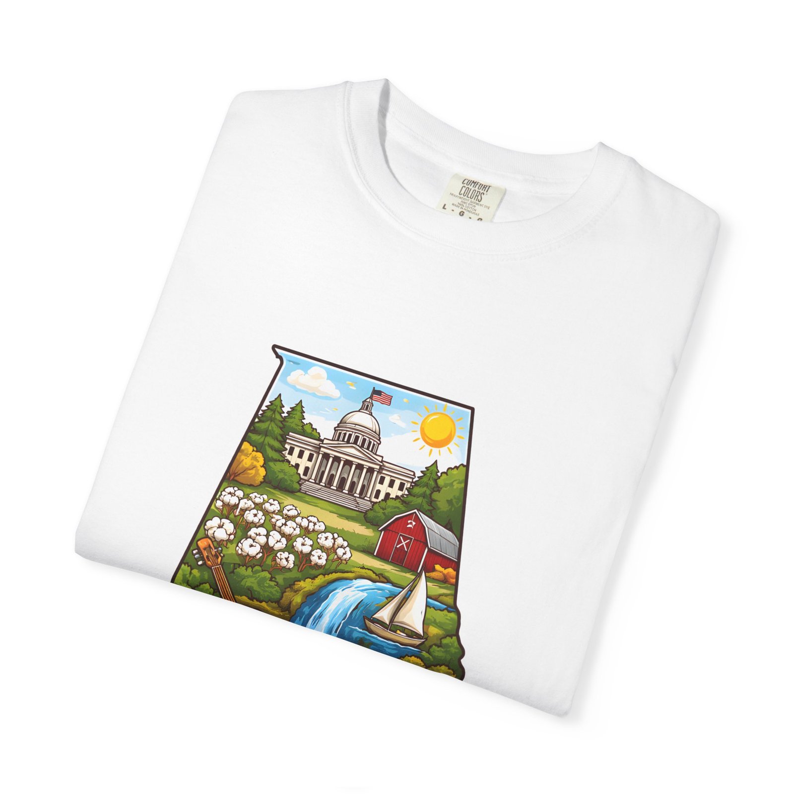 Soft, heavyweight comfort meets hometown pride. This garment-dyed cotton tee carries a vibrant Alabama illustration—capitol dome, rolling hills, a river and wildflowers—centered on the chest. The relaxed, slightly lived-in feel of the dye and heavyweight knit makes it a go-to layer for weekend drives, farmers market mornings, and slow afternoons by the river. It sits comfortably through long days outdoors and washes into an even softer hand without losing its shape or bold print.