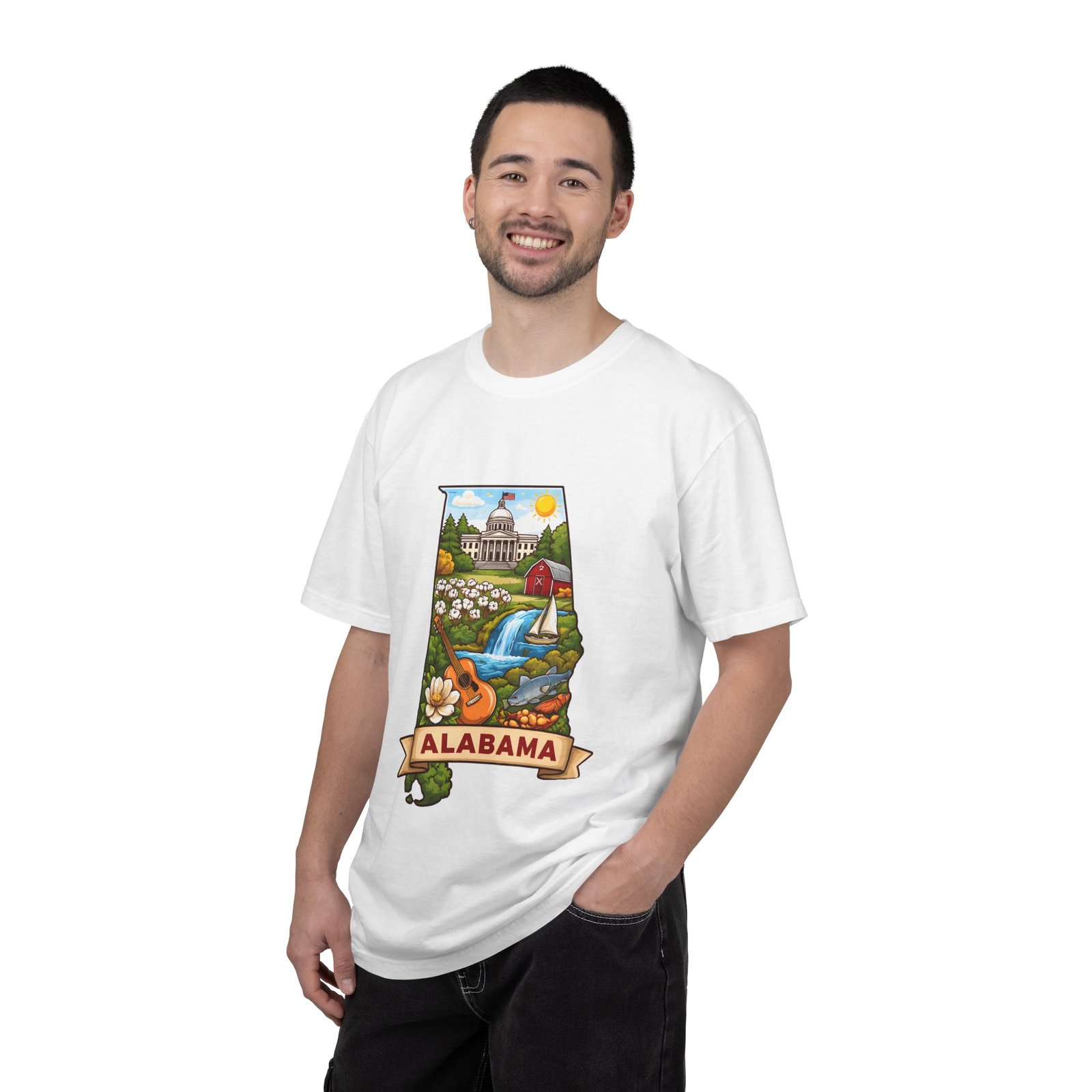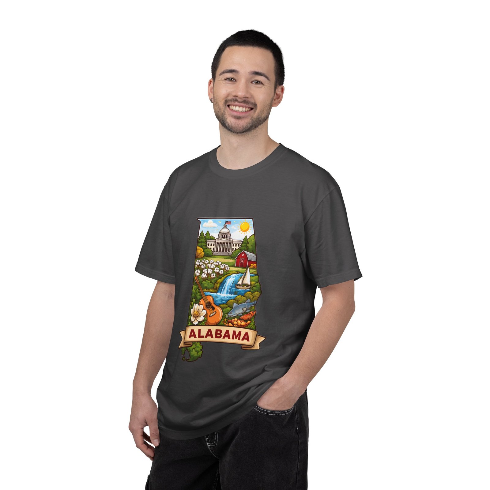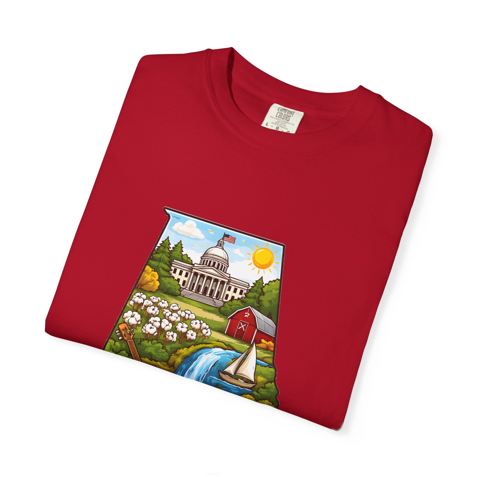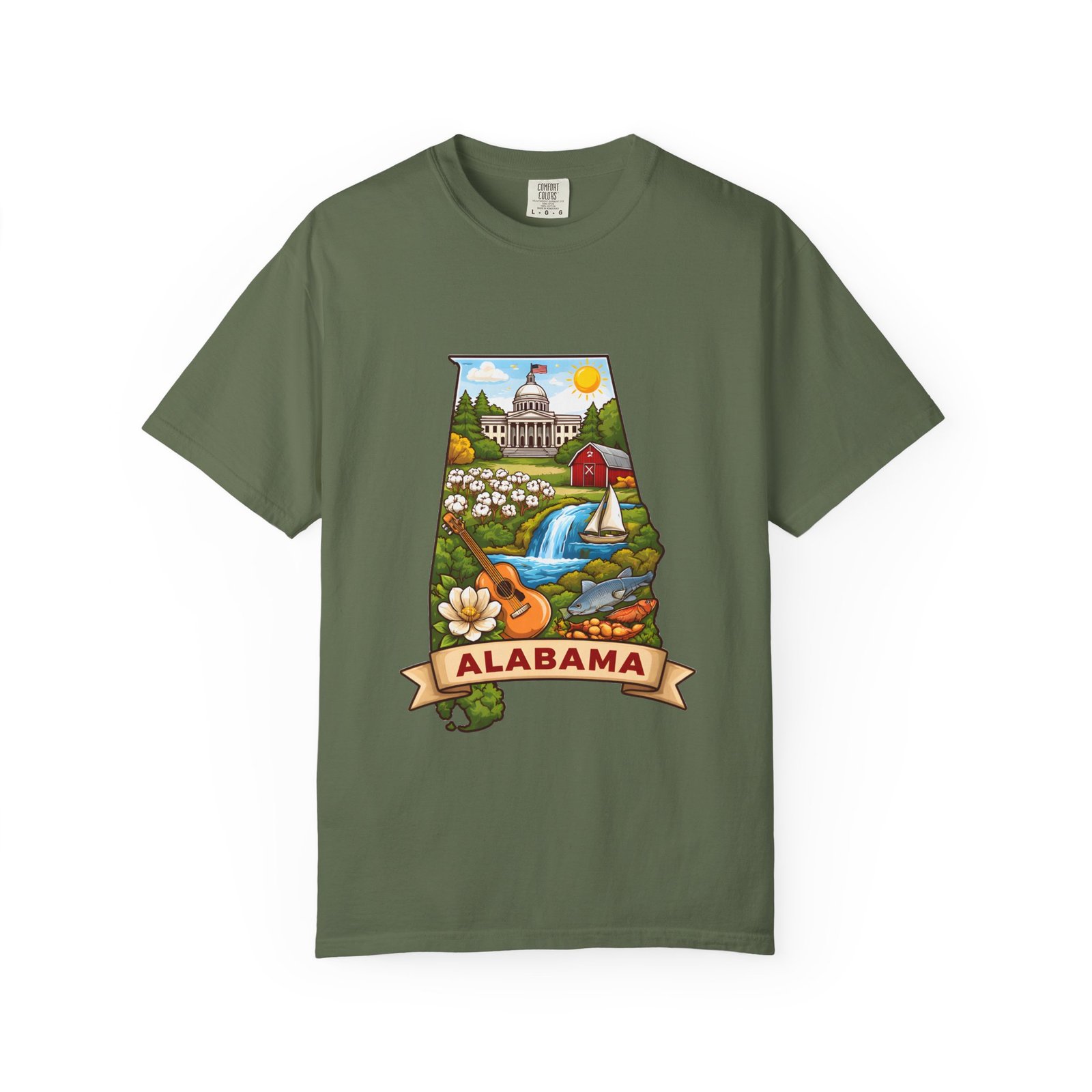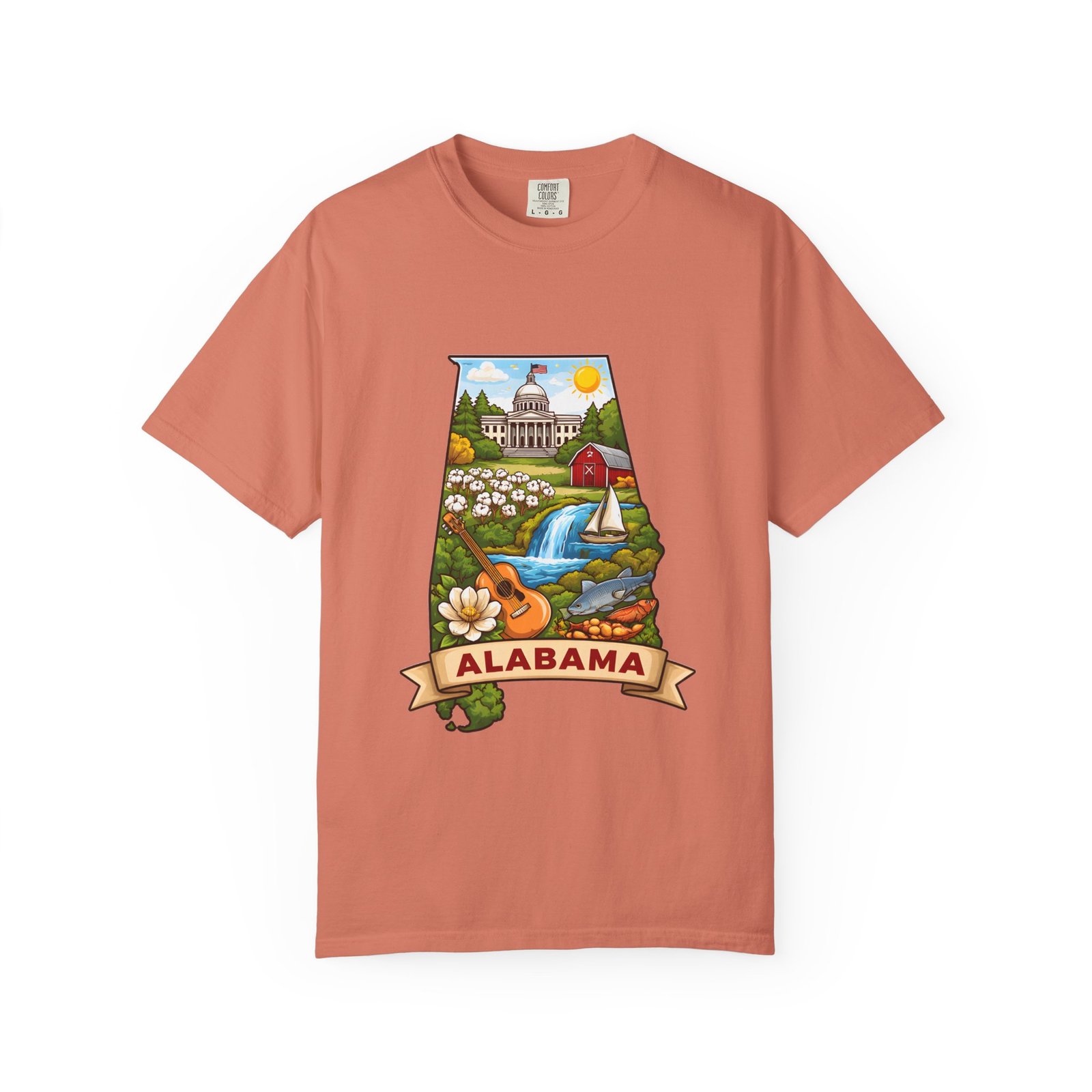 Soft, heavyweight comfort meets hometown pride. This garment-dyed cotton tee carries a vibrant Alabama illustration—capitol dome, rolling hills, a river and wildflowers—centered on the chest. The relaxed, slightly lived-in feel of the dye and heavyweight knit makes it a go-to layer for weekend drives, farmers market mornings, and slow afternoons by the river. It sits comfortably through long days outdoors and washes into an even softer hand without losing its shape or bold print.