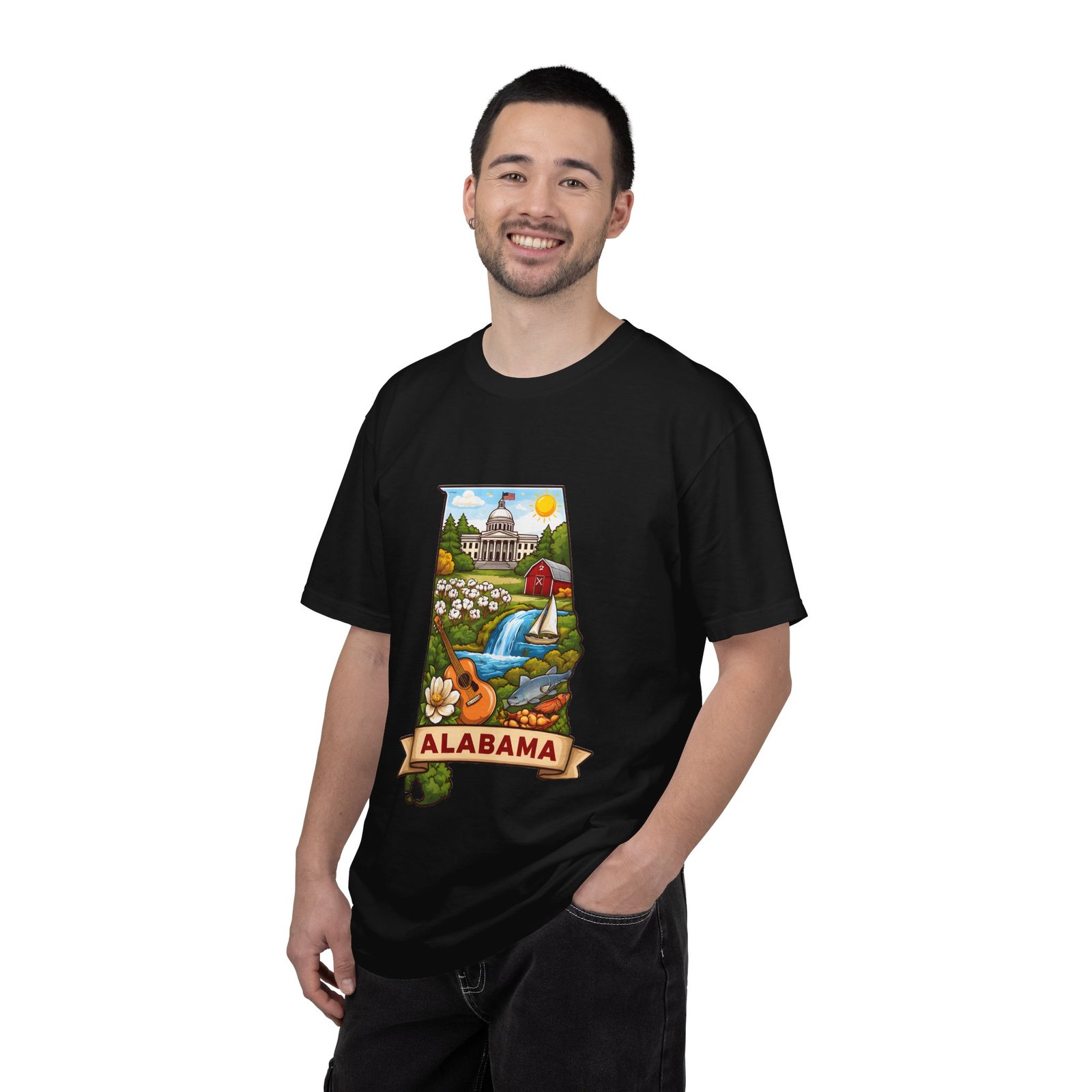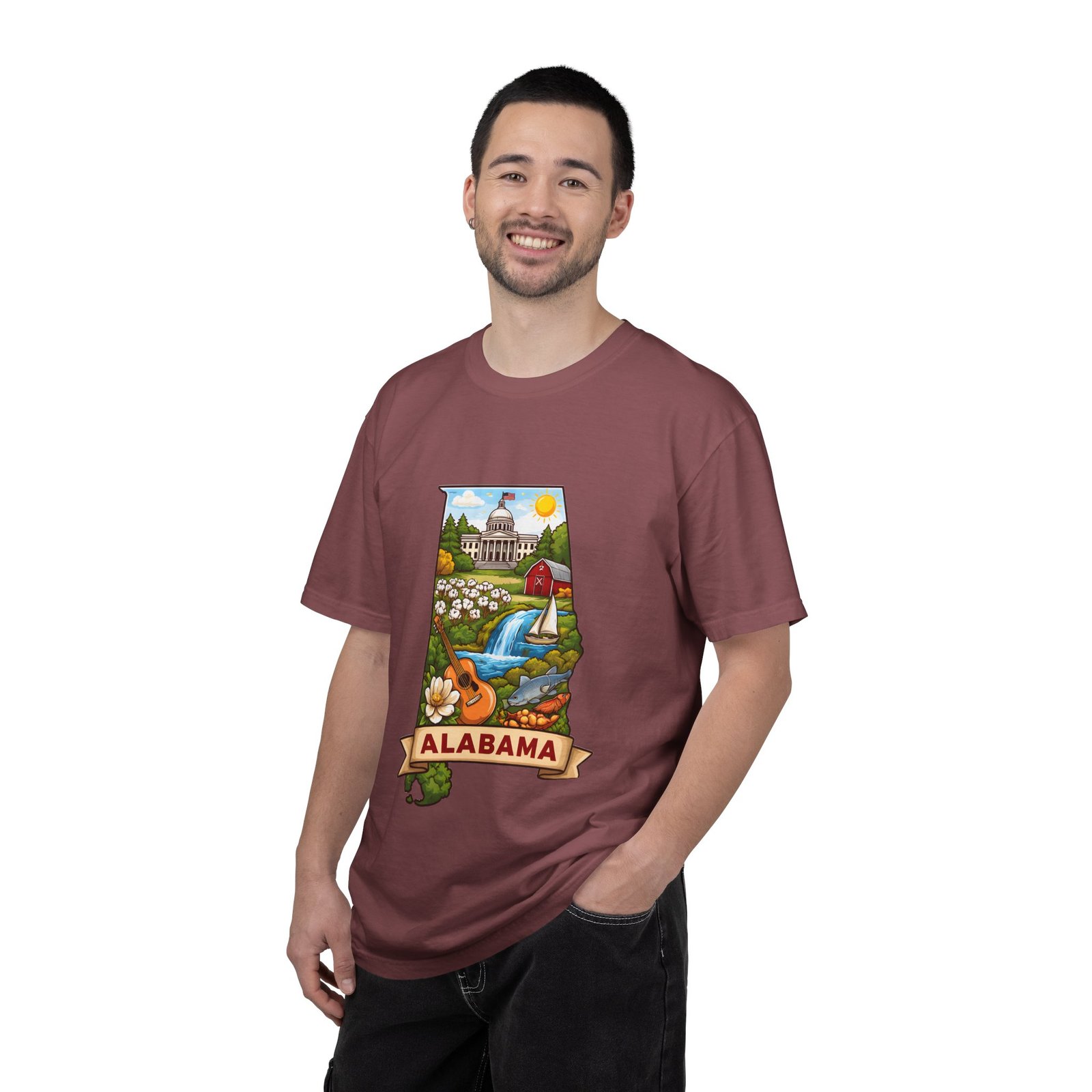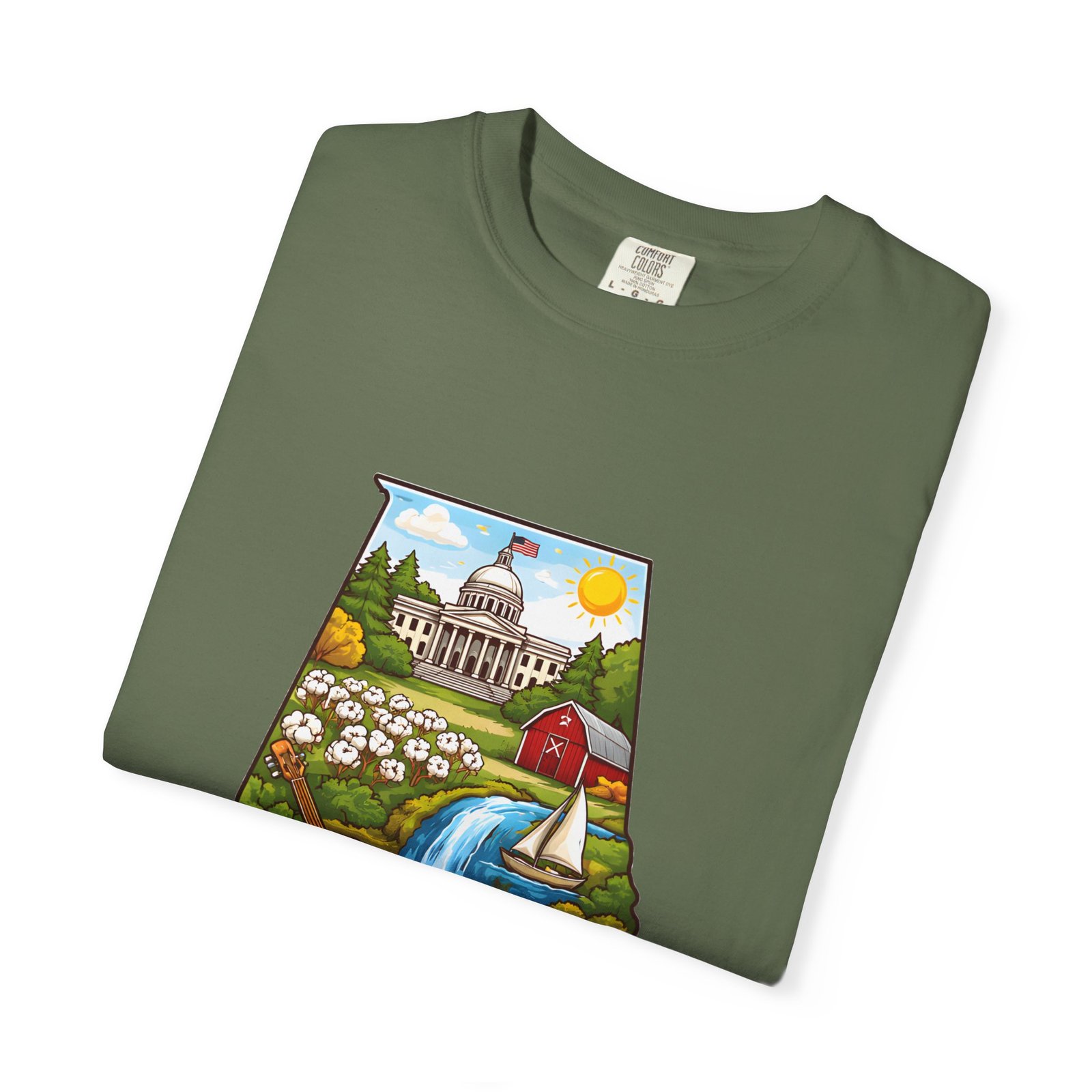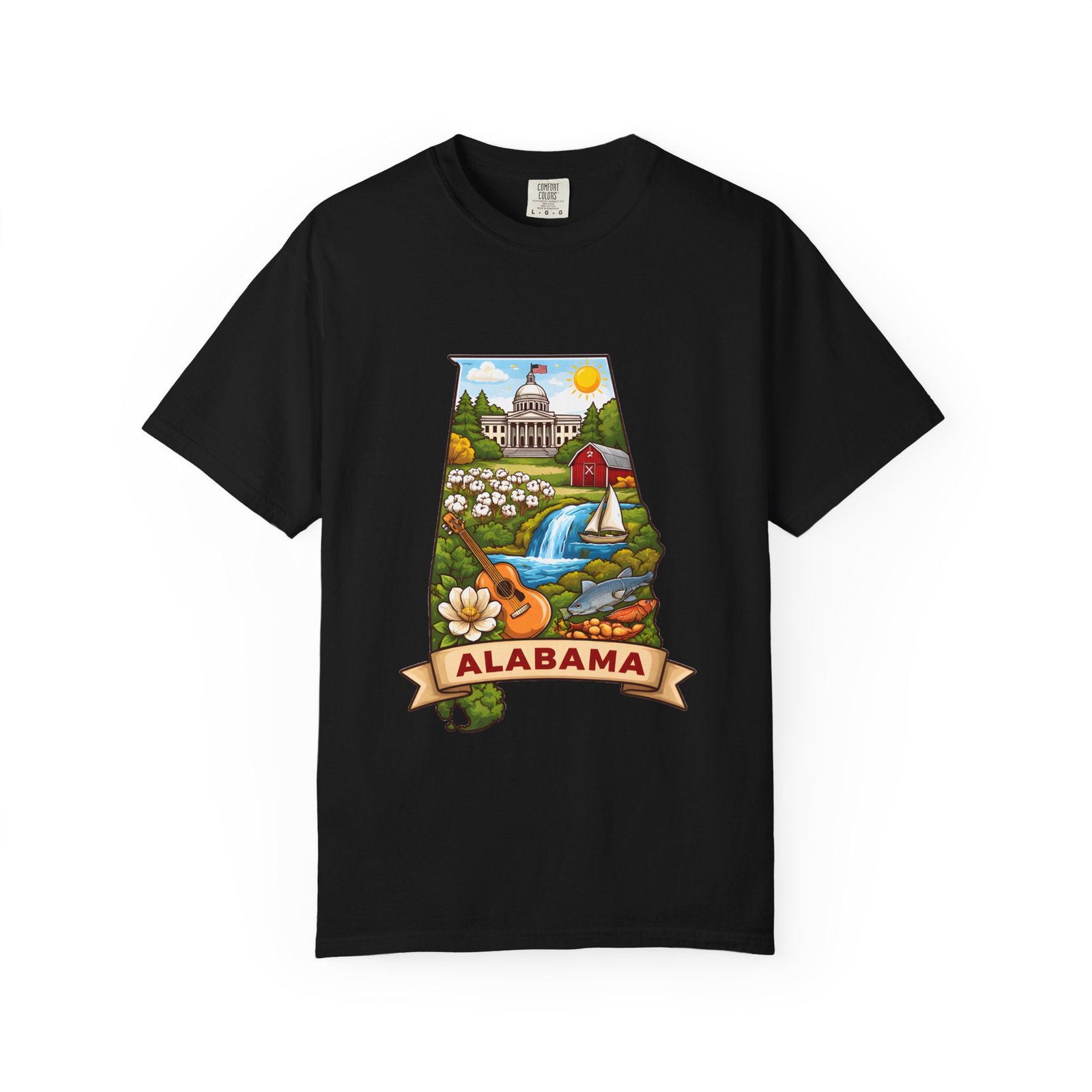 Soft, heavyweight comfort meets hometown pride. This garment-dyed cotton tee carries a vibrant Alabama illustration—capitol dome, rolling hills, a river and wildflowers—centered on the chest. The relaxed, slightly lived-in feel of the dye and heavyweight knit makes it a go-to layer for weekend drives, farmers market mornings, and slow afternoons by the river. It sits comfortably through long days outdoors and washes into an even softer hand without losing its shape or bold print.