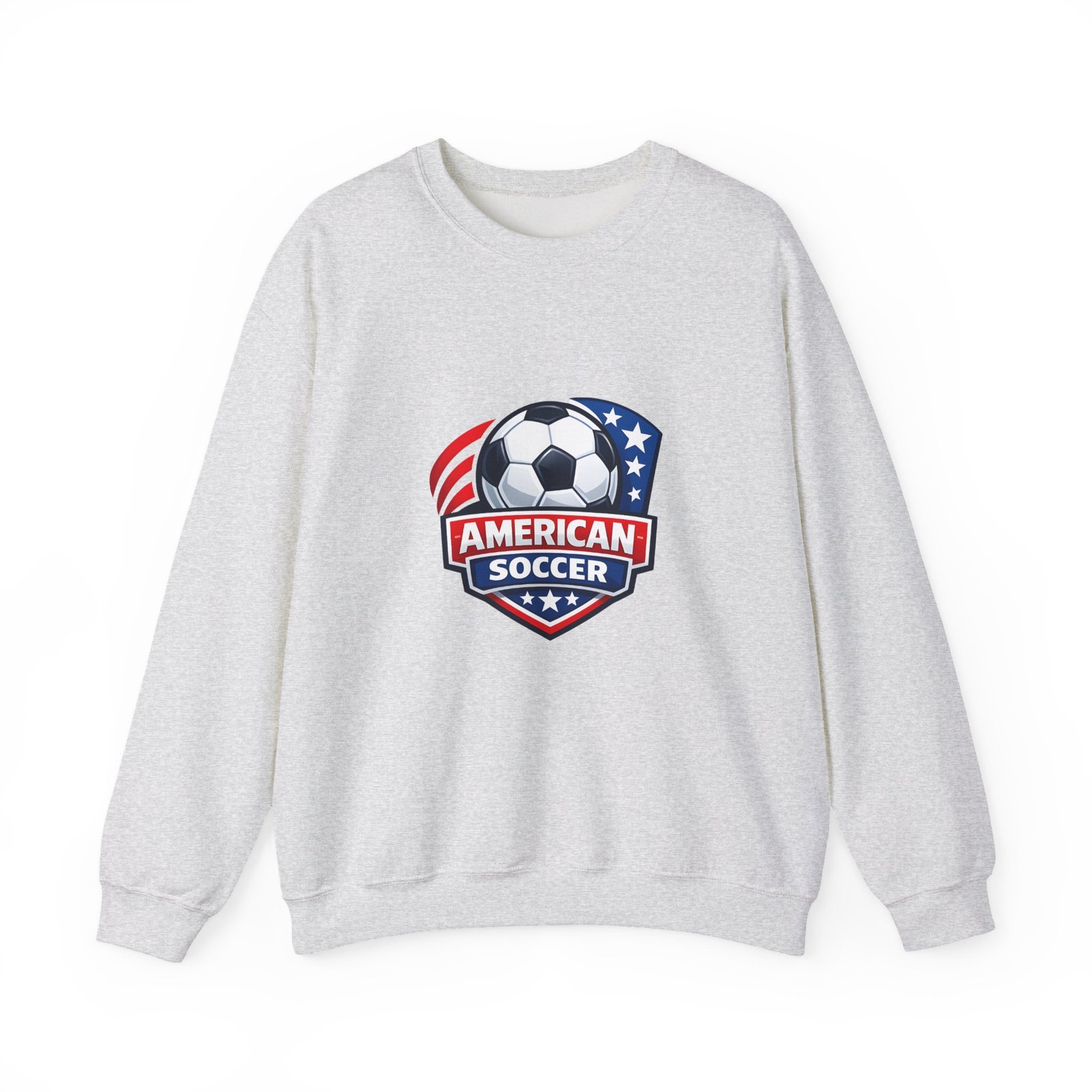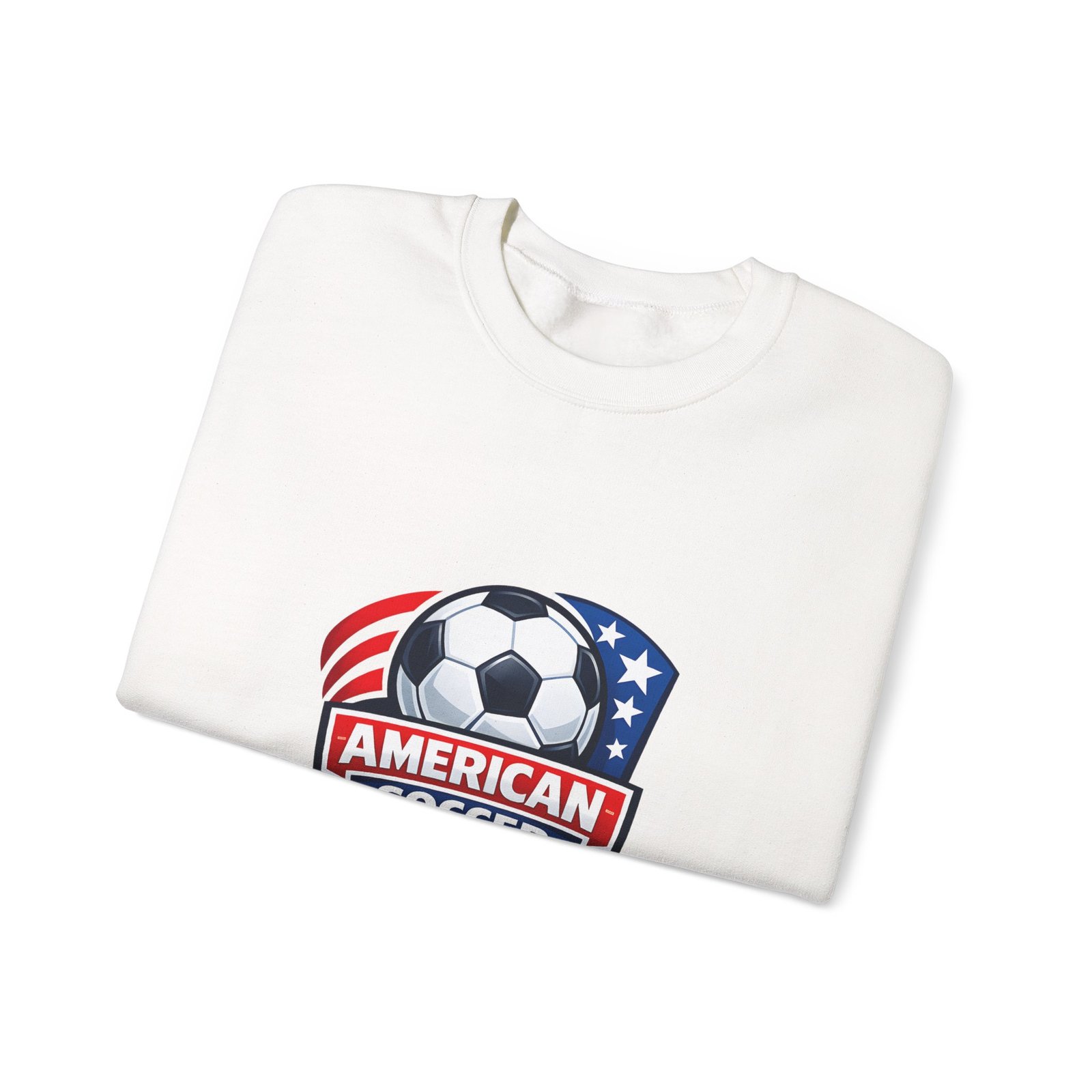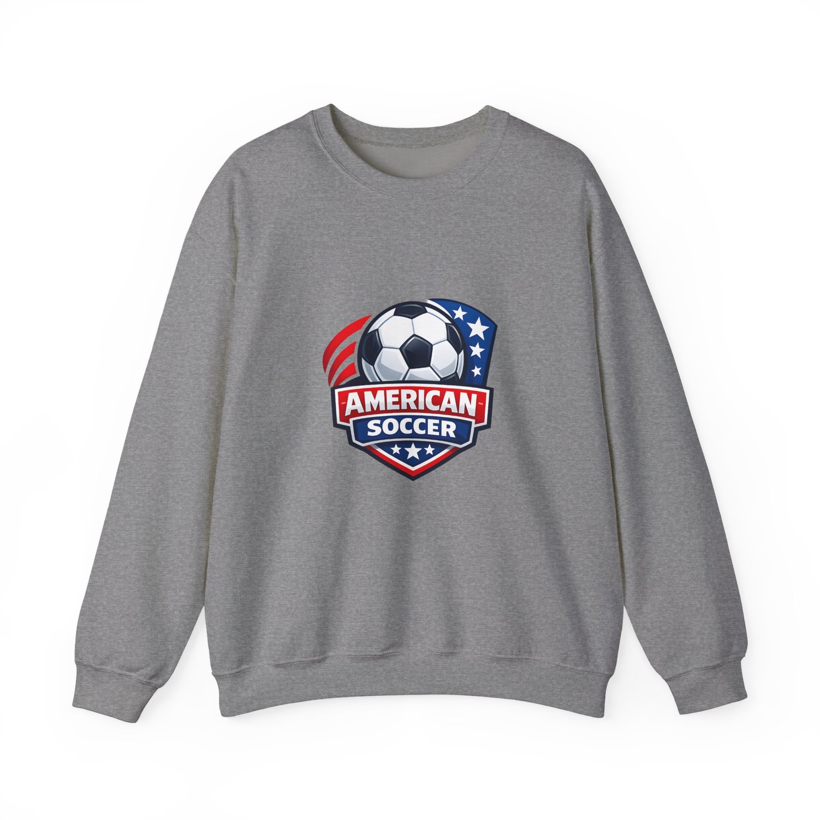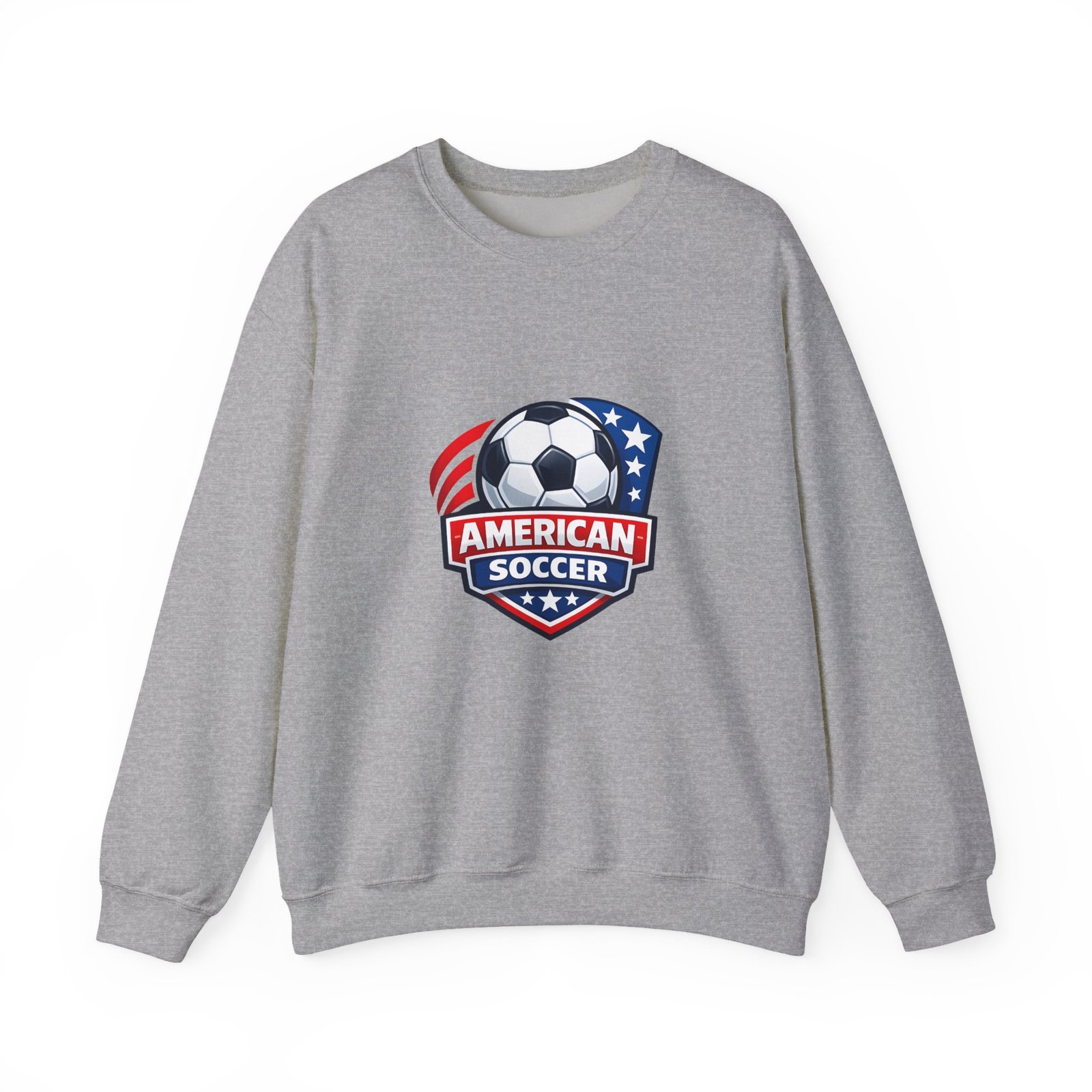 This cozy crewneck brings the energy of the pitch to everyday wear. A bold, retro-style American soccer crest sits on the chest — a soccer ball framed by stars and stripes — giving the sweatshirt a spirited, club-like feel. The medium-heavy cotton-poly blend holds shape and warmth without feeling bulky. Subtle details like a ribbed collar, double-needle stitching, and a tear-away label keep it comfortable through practices, travel days, or relaxed weekends. Wear it to warm up before a game, cheer from the sidelines, or carry your team pride into town.