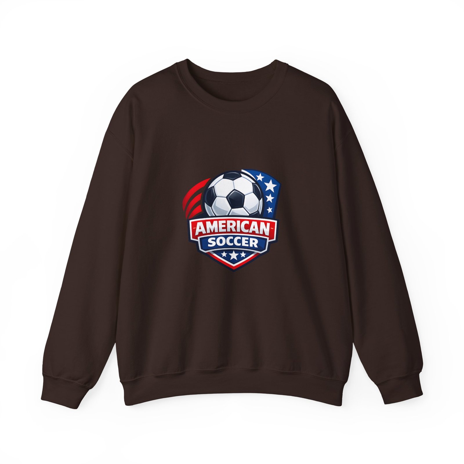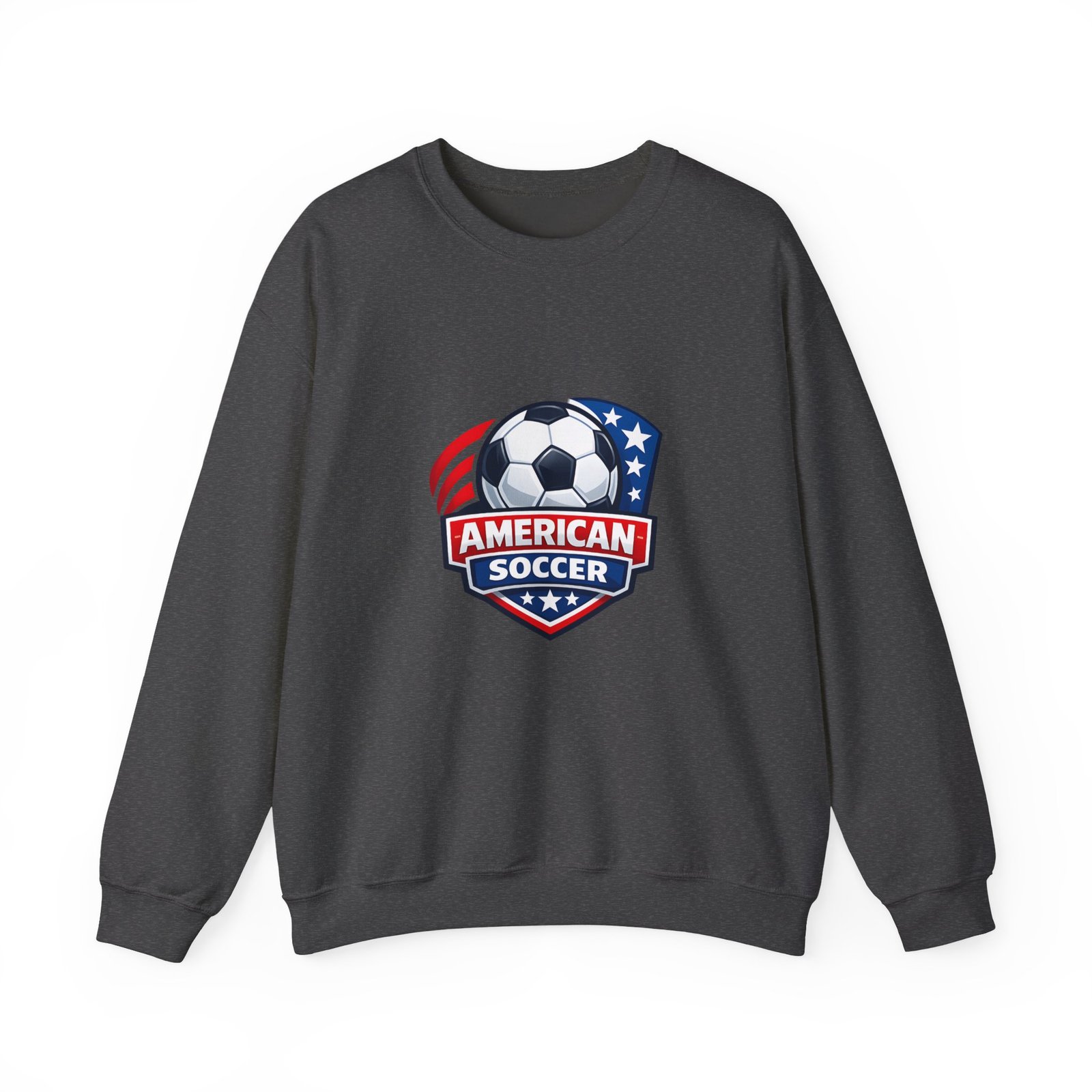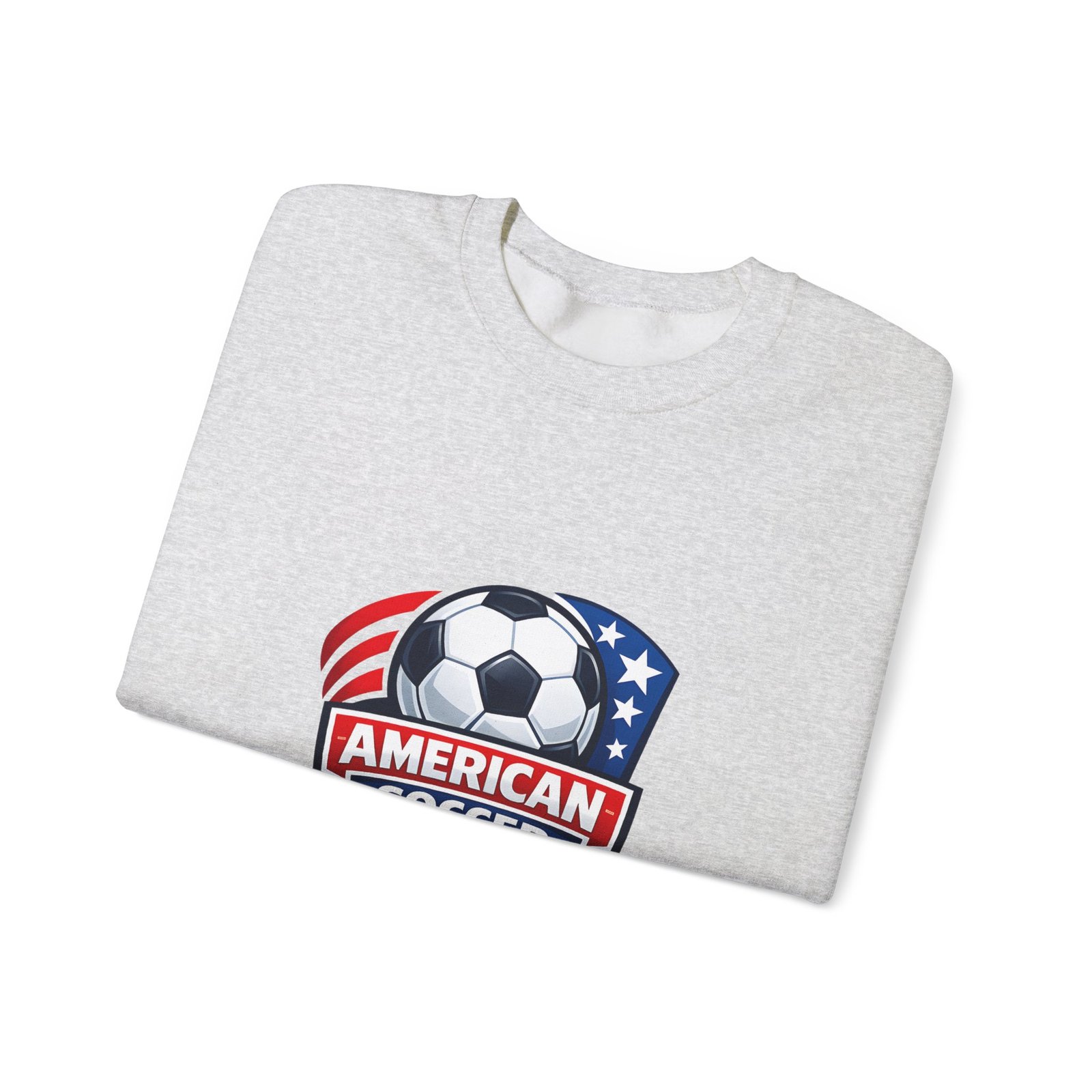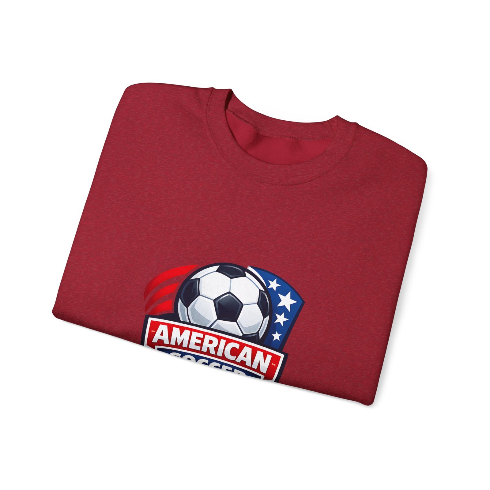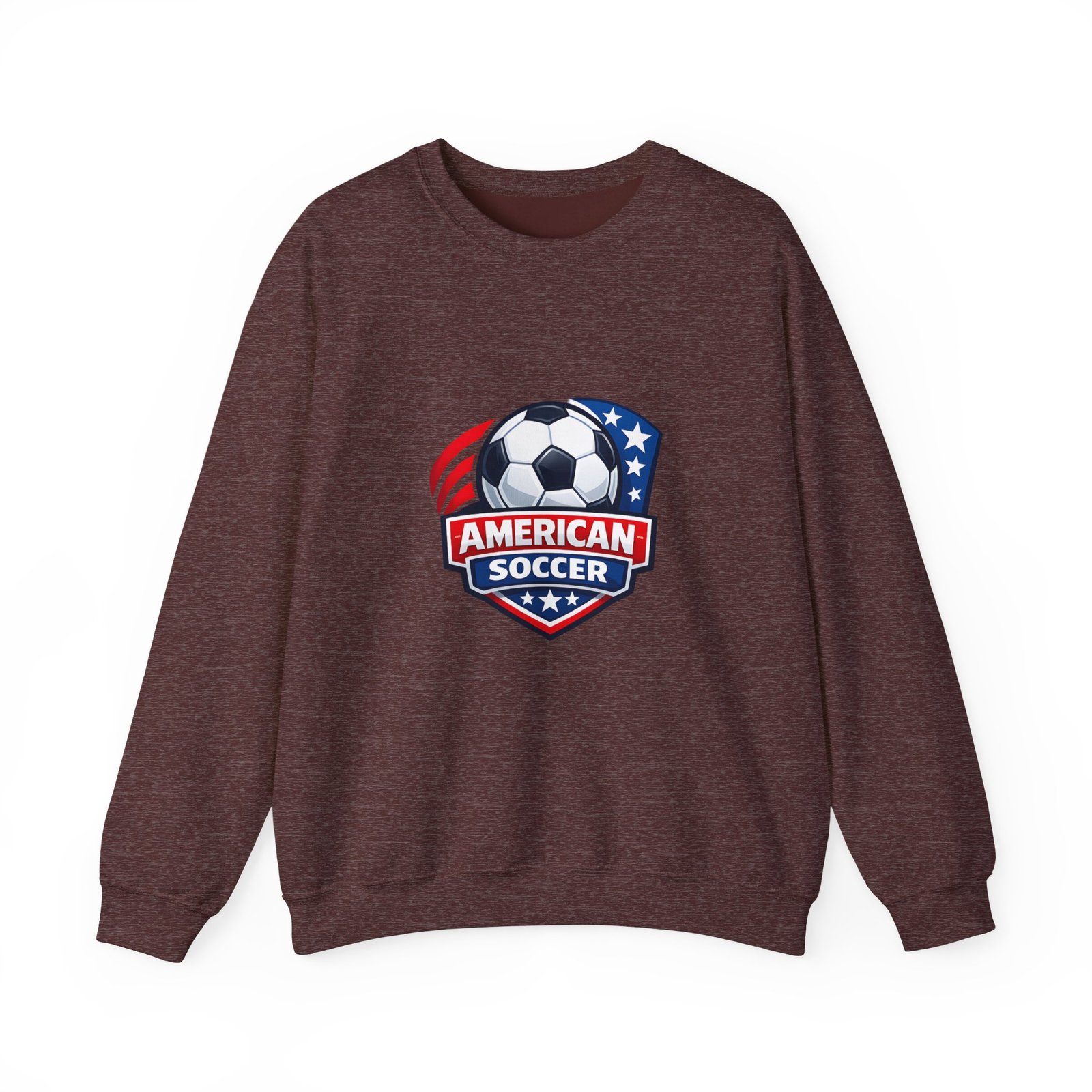 This cozy crewneck brings the energy of the pitch to everyday wear. A bold, retro-style American soccer crest sits on the chest — a soccer ball framed by stars and stripes — giving the sweatshirt a spirited, club-like feel. The medium-heavy cotton-poly blend holds shape and warmth without feeling bulky. Subtle details like a ribbed collar, double-needle stitching, and a tear-away label keep it comfortable through practices, travel days, or relaxed weekends. Wear it to warm up before a game, cheer from the sidelines, or carry your team pride into town.
