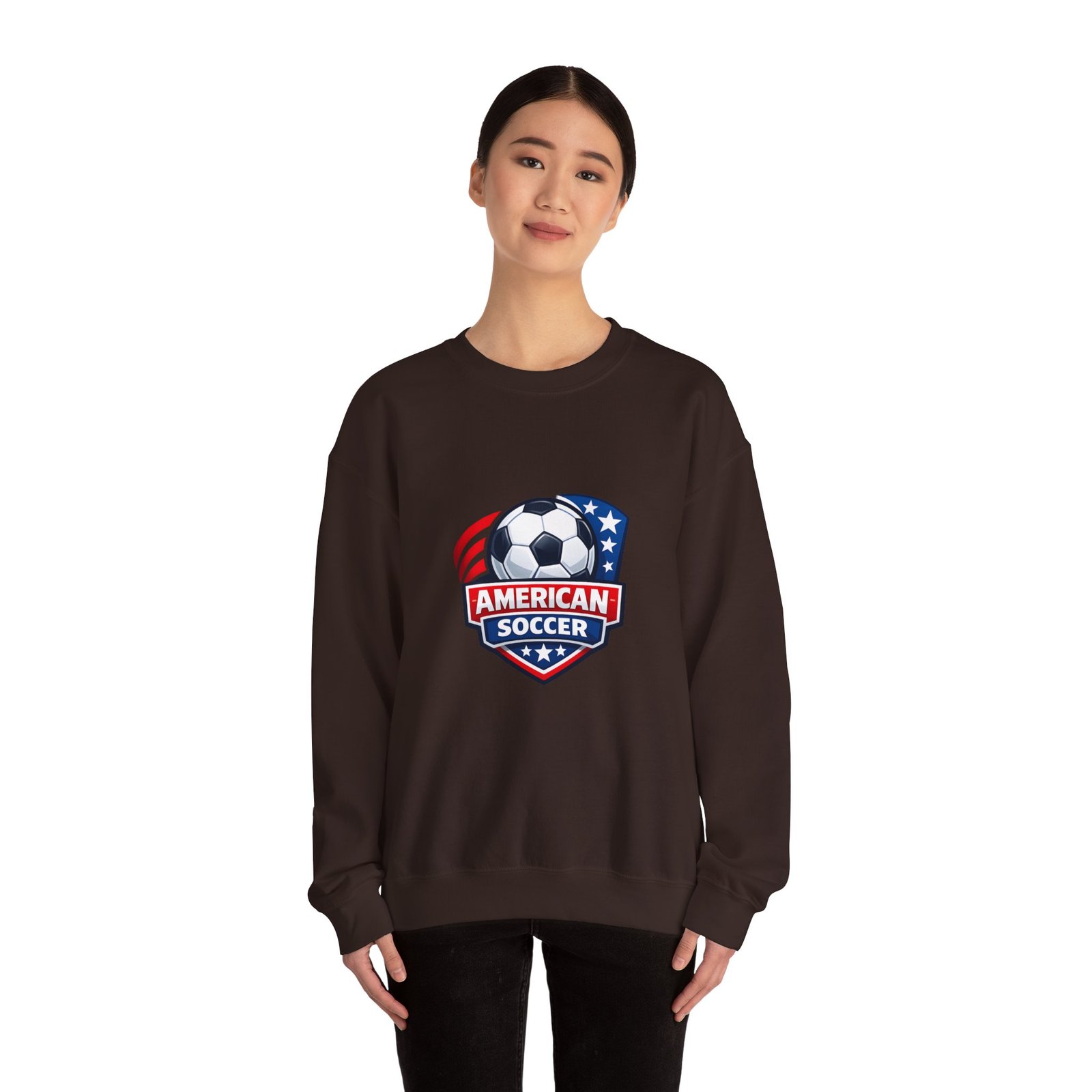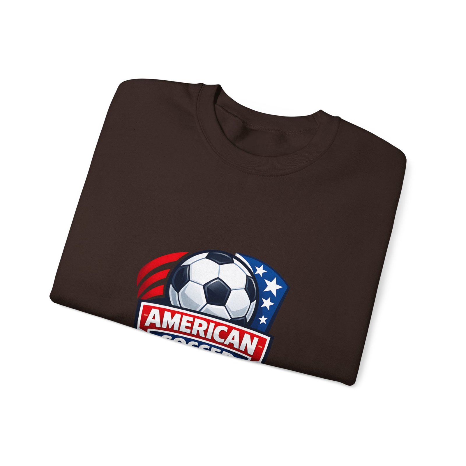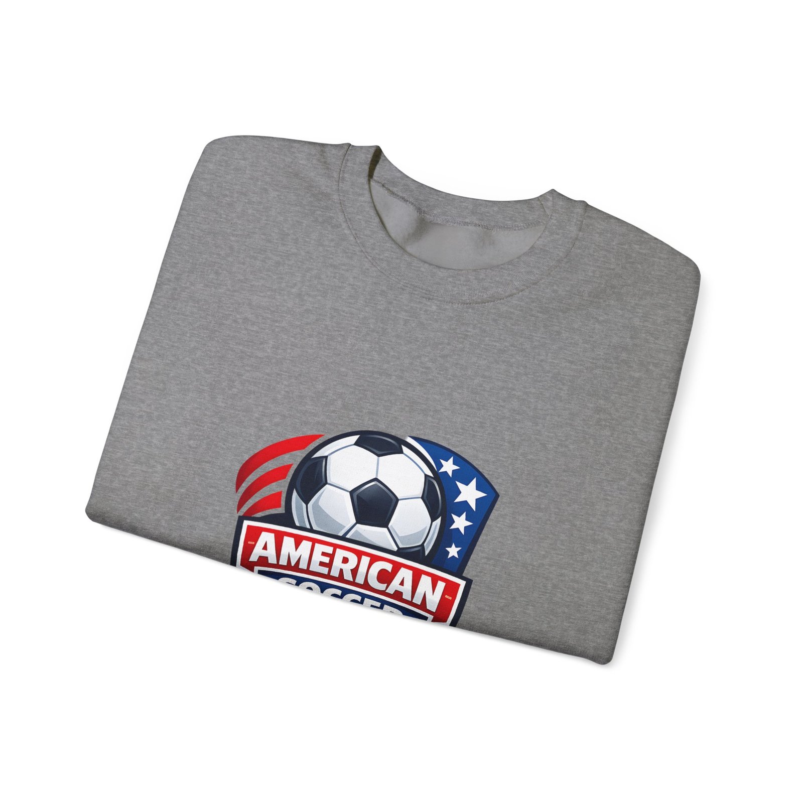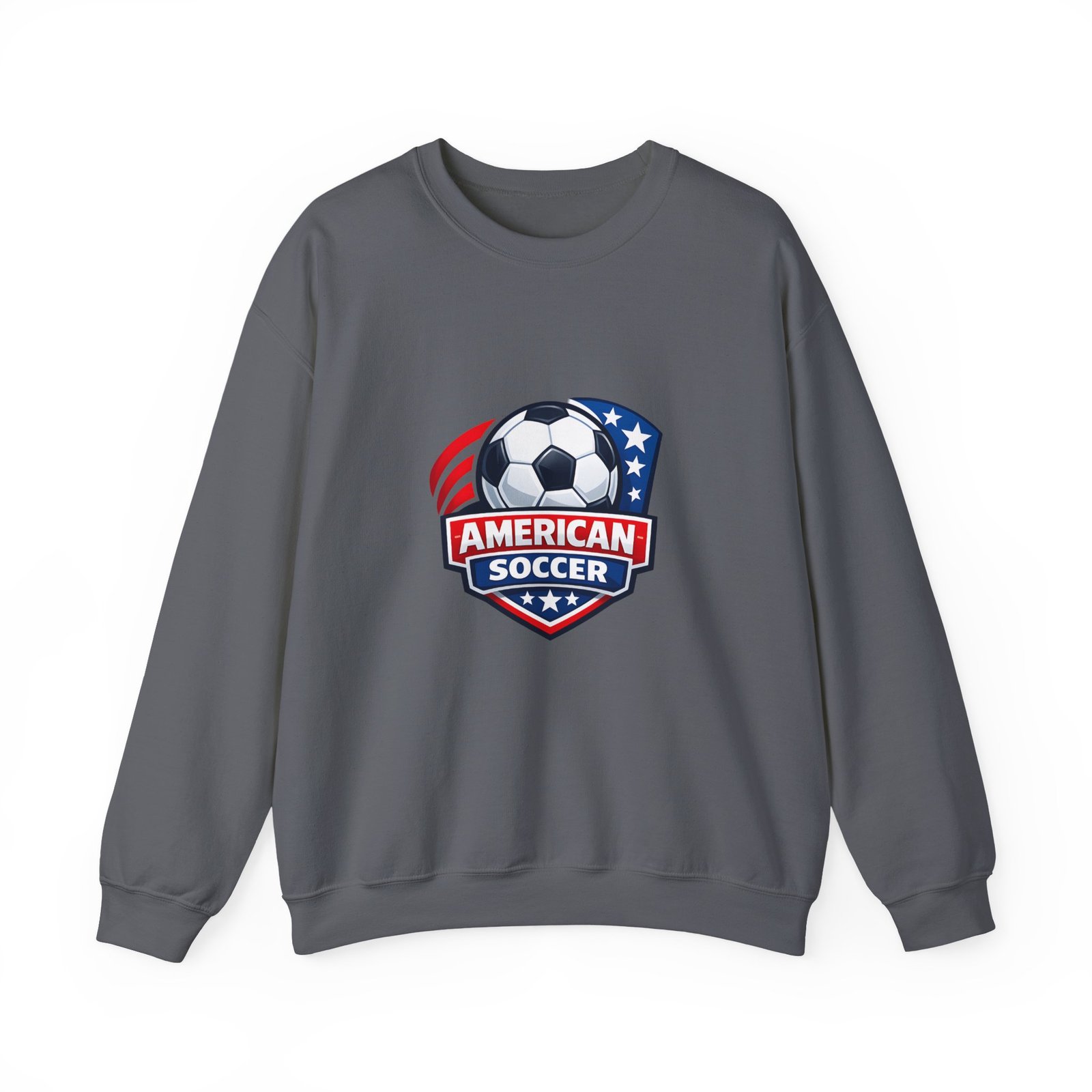 This cozy crewneck brings the energy of the pitch to everyday wear. A bold, retro-style American soccer crest sits on the chest — a soccer ball framed by stars and stripes — giving the sweatshirt a spirited, club-like feel. The medium-heavy cotton-poly blend holds shape and warmth without feeling bulky. Subtle details like a ribbed collar, double-needle stitching, and a tear-away label keep it comfortable through practices, travel days, or relaxed weekends. Wear it to warm up before a game, cheer from the sidelines, or carry your team pride into town.