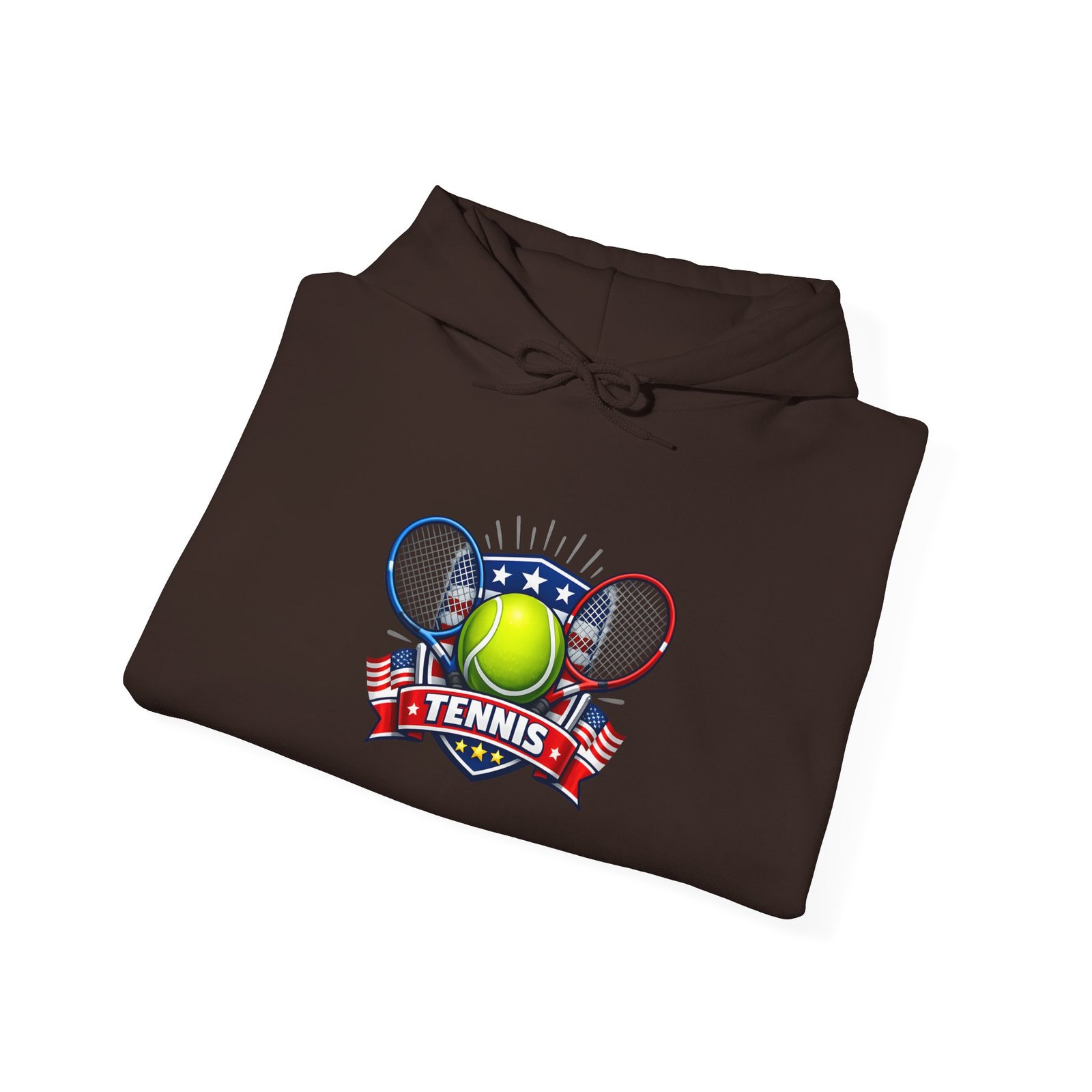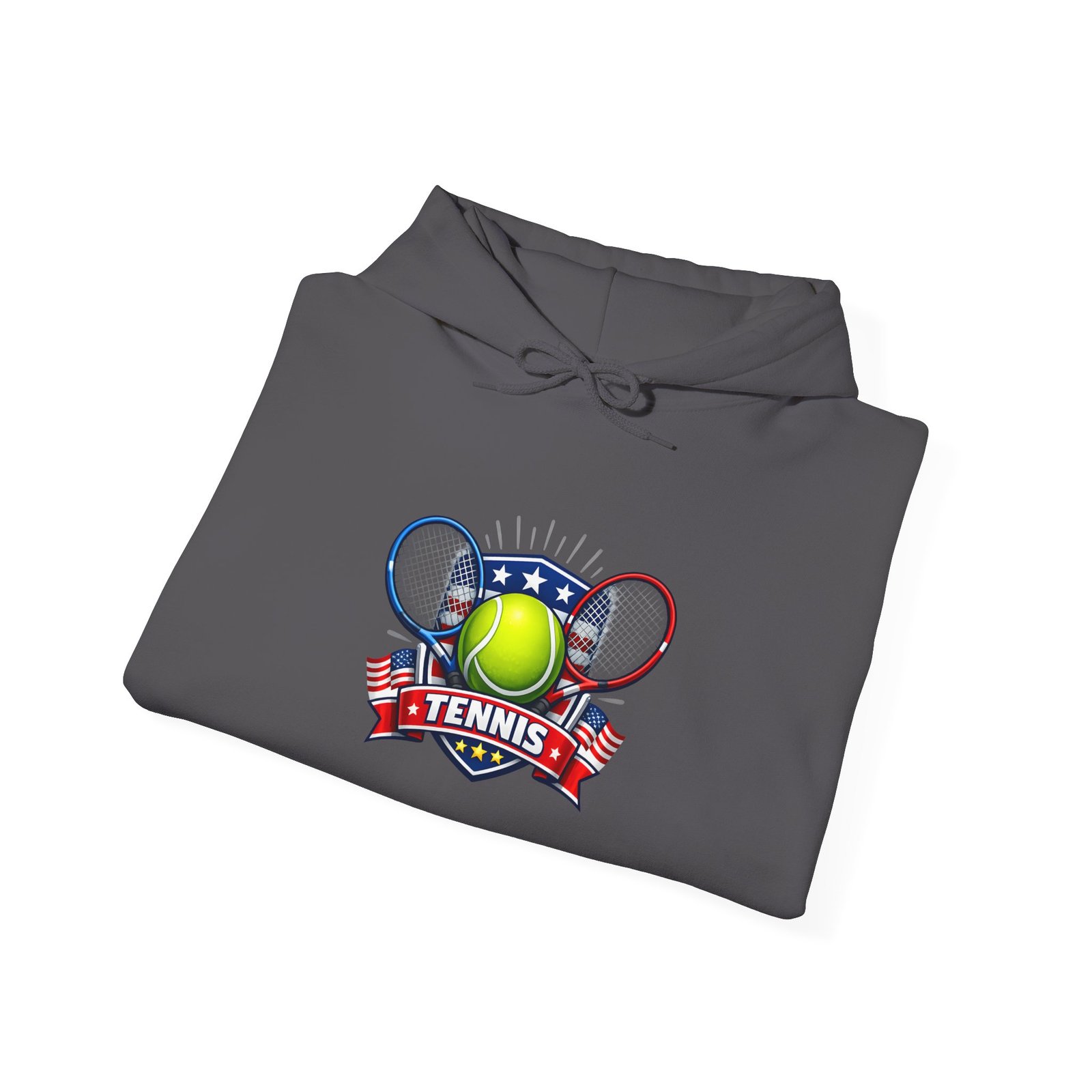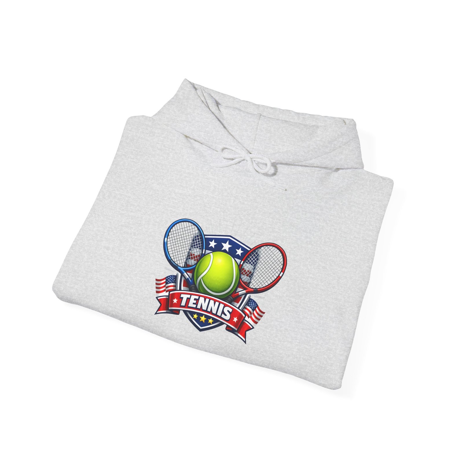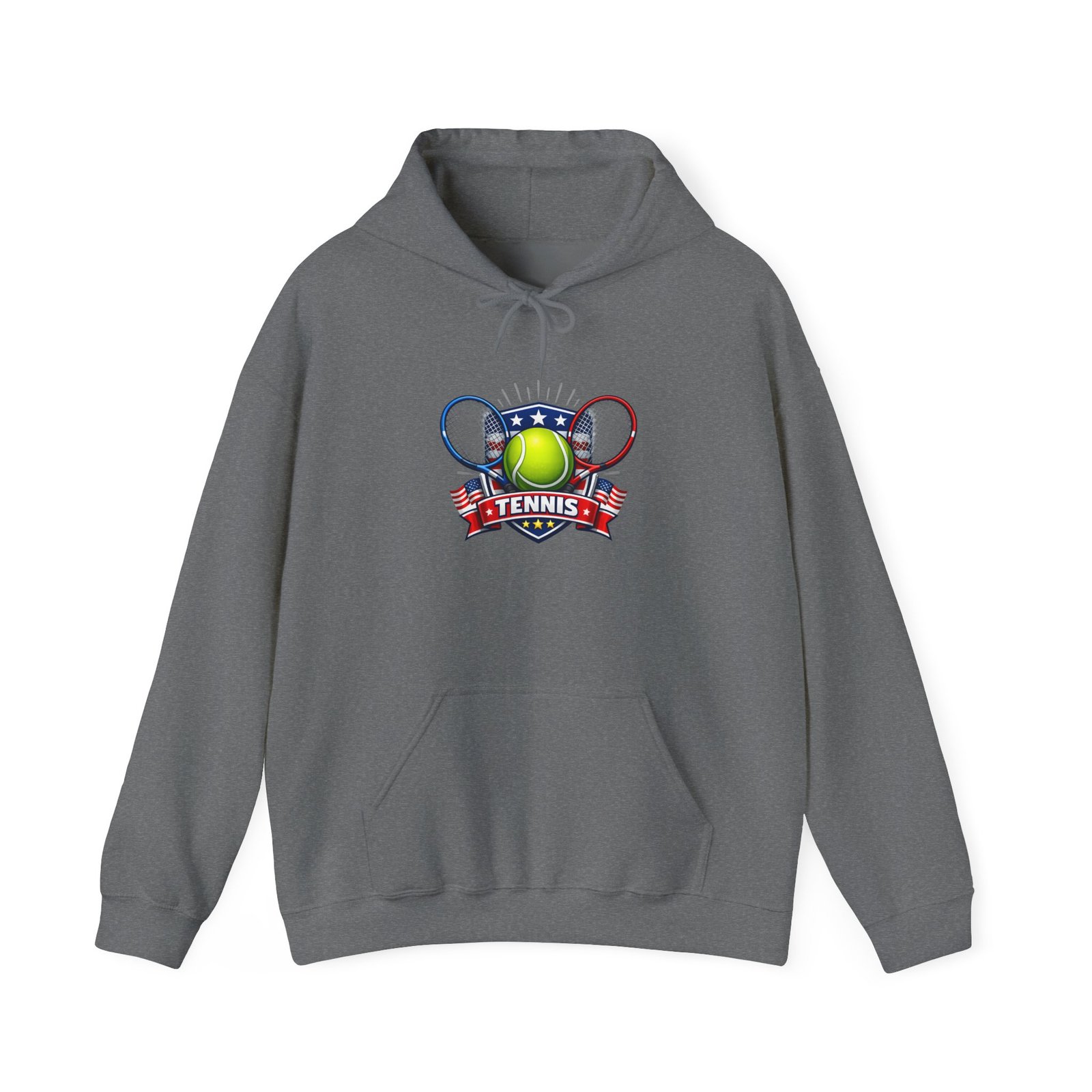 A cozy, sport-ready hooded sweatshirt that celebrates tennis with clean, bold graphics. Soft yet sturdy midweight fabric wraps you in warmth on cool mornings or late-night matches. The front features a vibrant tennis emblem—a bright ball, crossed rackets, and a ribbon banner—that pops against the solid background. A double-lined hood with matching drawcord, roomy kangaroo pocket and classic fit make this hoodie easy to pull on after practice or wear to the courtside. Thoughtful construction (tubular knit, tear-away label) keeps the silhouette smooth and comfortable, while available DTF prints or embroidery options let you choose a sharp, lasting finish.