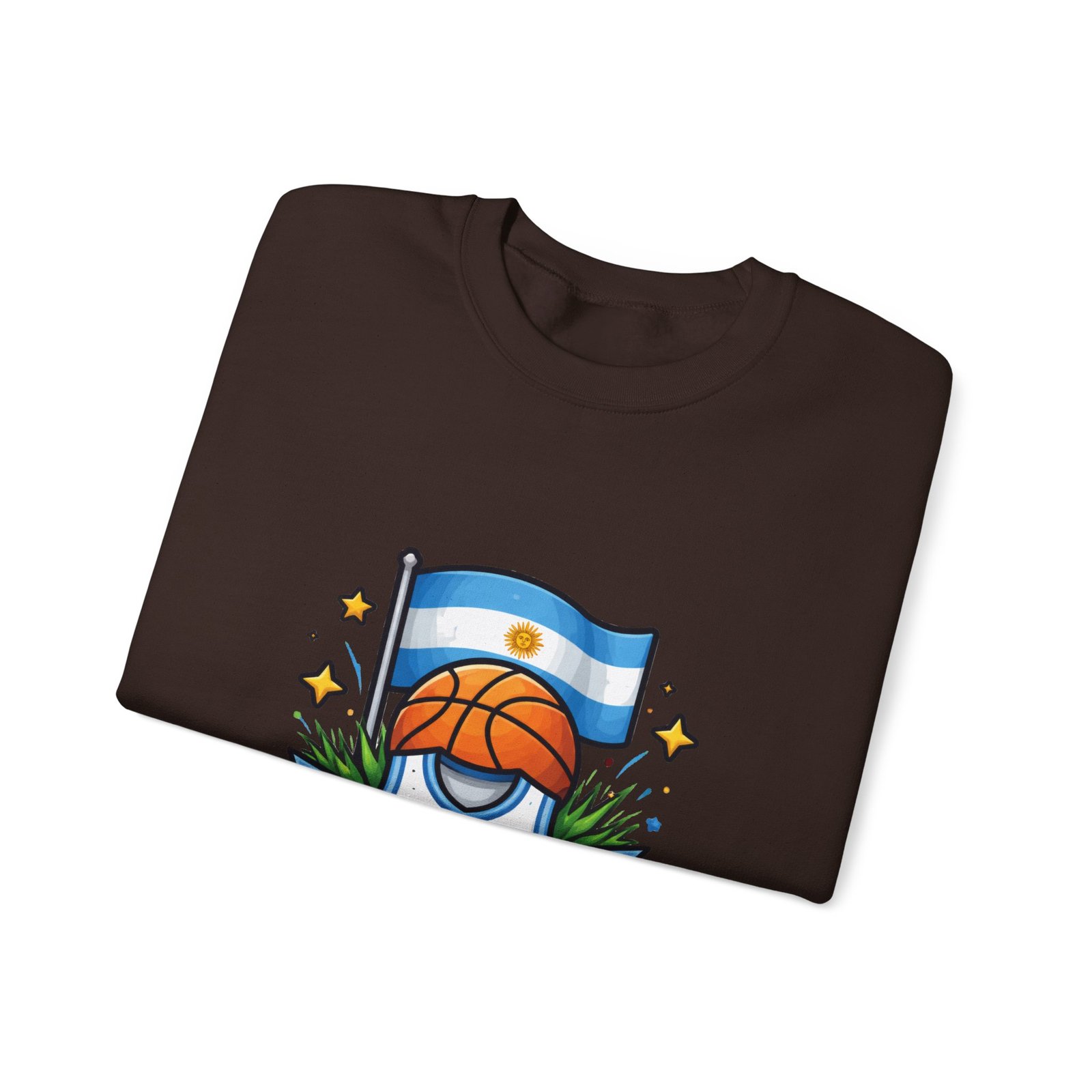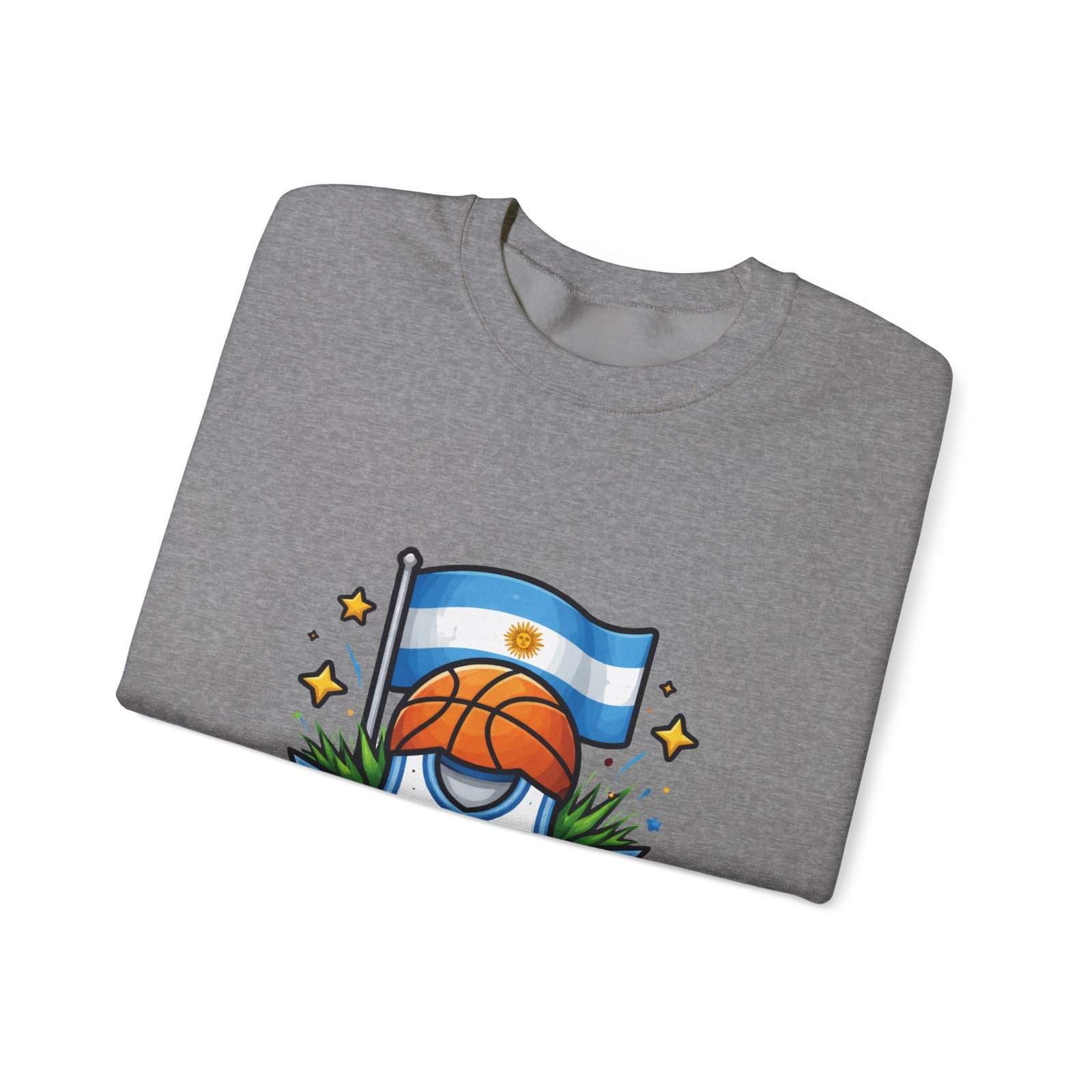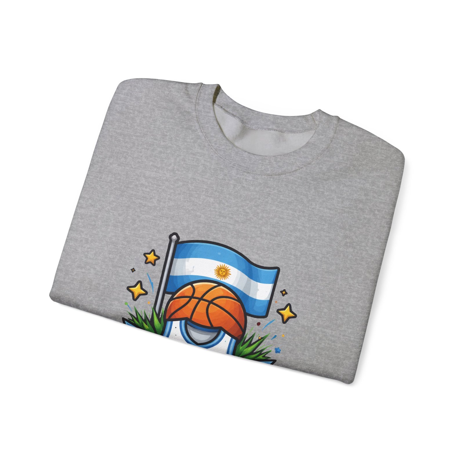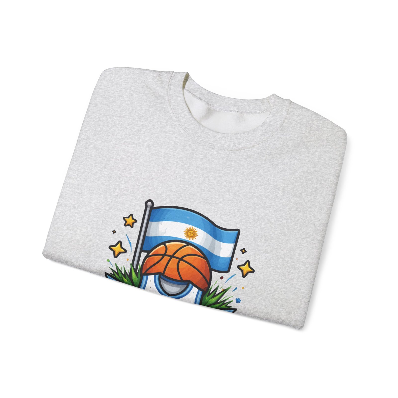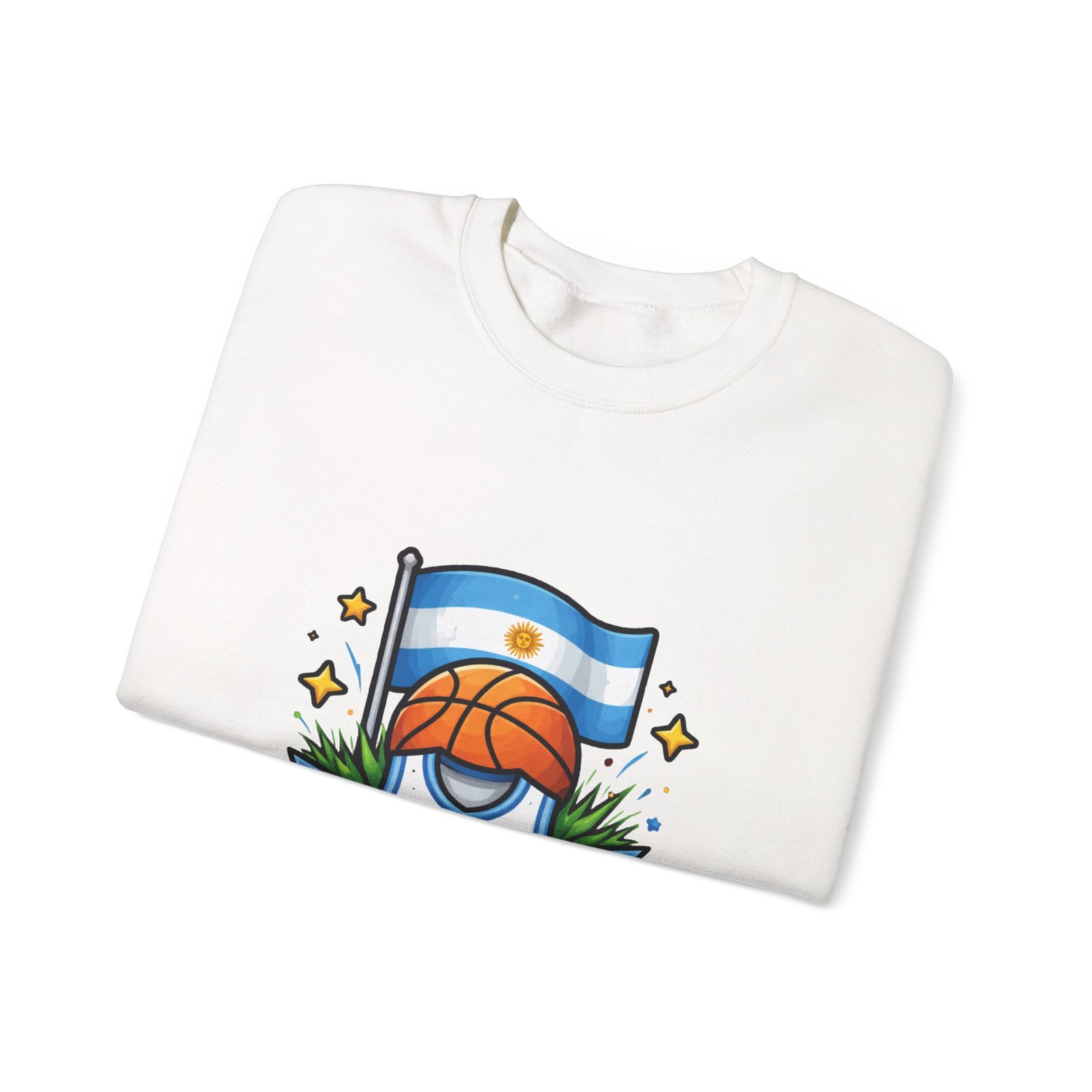A soft, midweight crewneck that carries the energy of the court and the pride of Argentina. The white sweatshirt features a vibrant, embroidered-style basketball crest with the Argentine flag, laurel leaves, and subtle star accents—clean enough for everyday wear, bold enough to stand out at local games or while cheering from the stands. The fabric has a balanced cotton-poly feel that warms without weighing you down. Thoughtful details like a ribbed collar, durable double-needle stitching, and a tear-away label keep it comfortable long after the season ends. Wear it to practices, pick-up games, or weekend walks when you want a casual layer that speaks to your team loyalty.