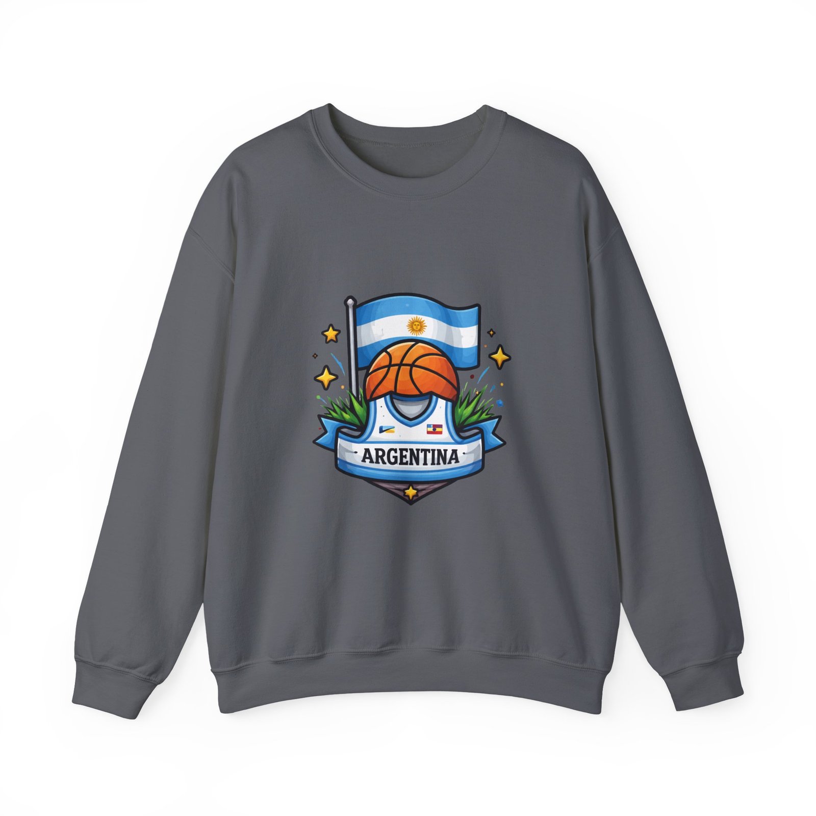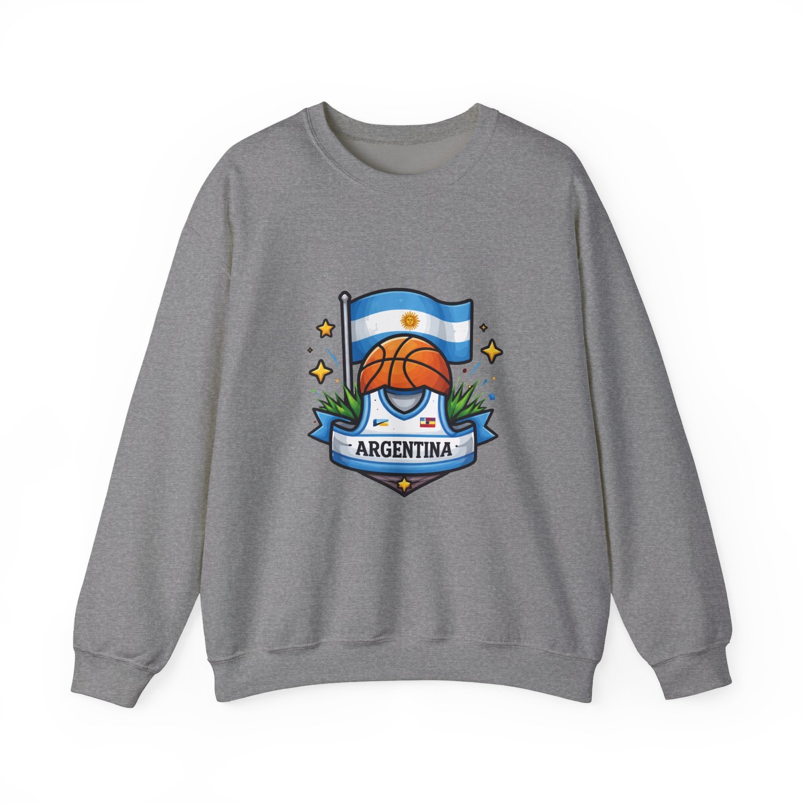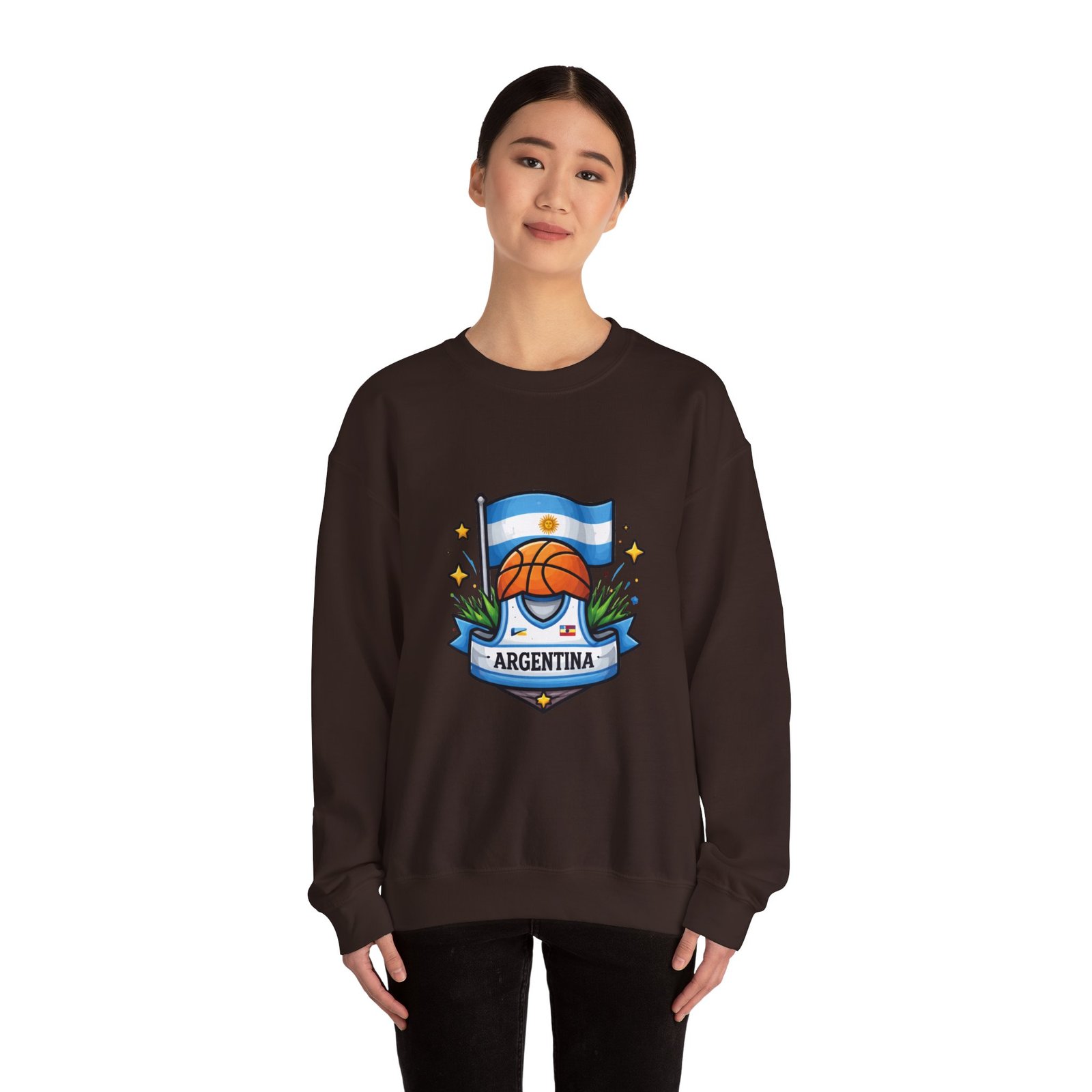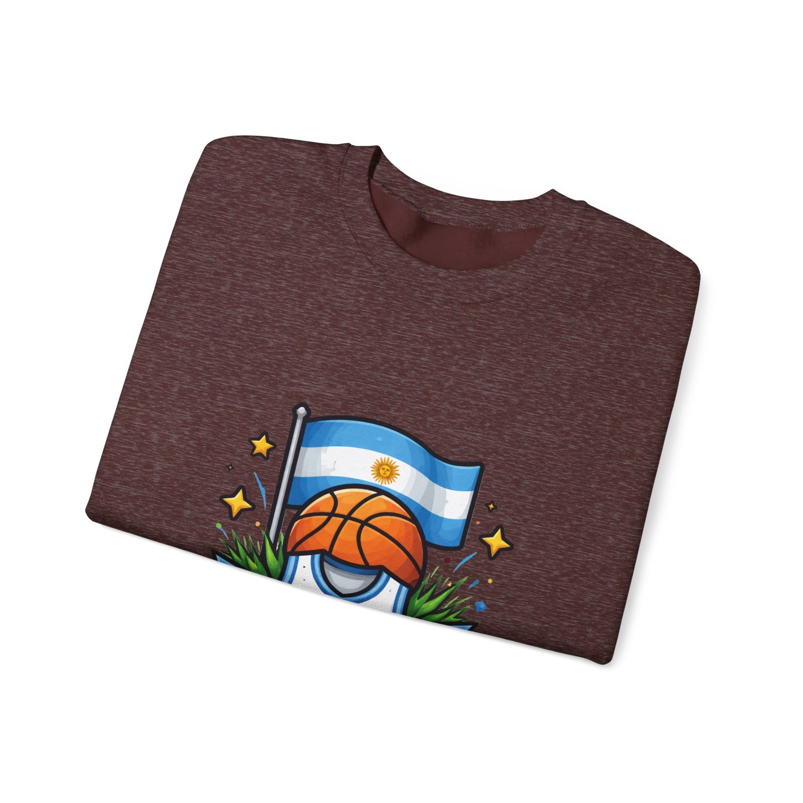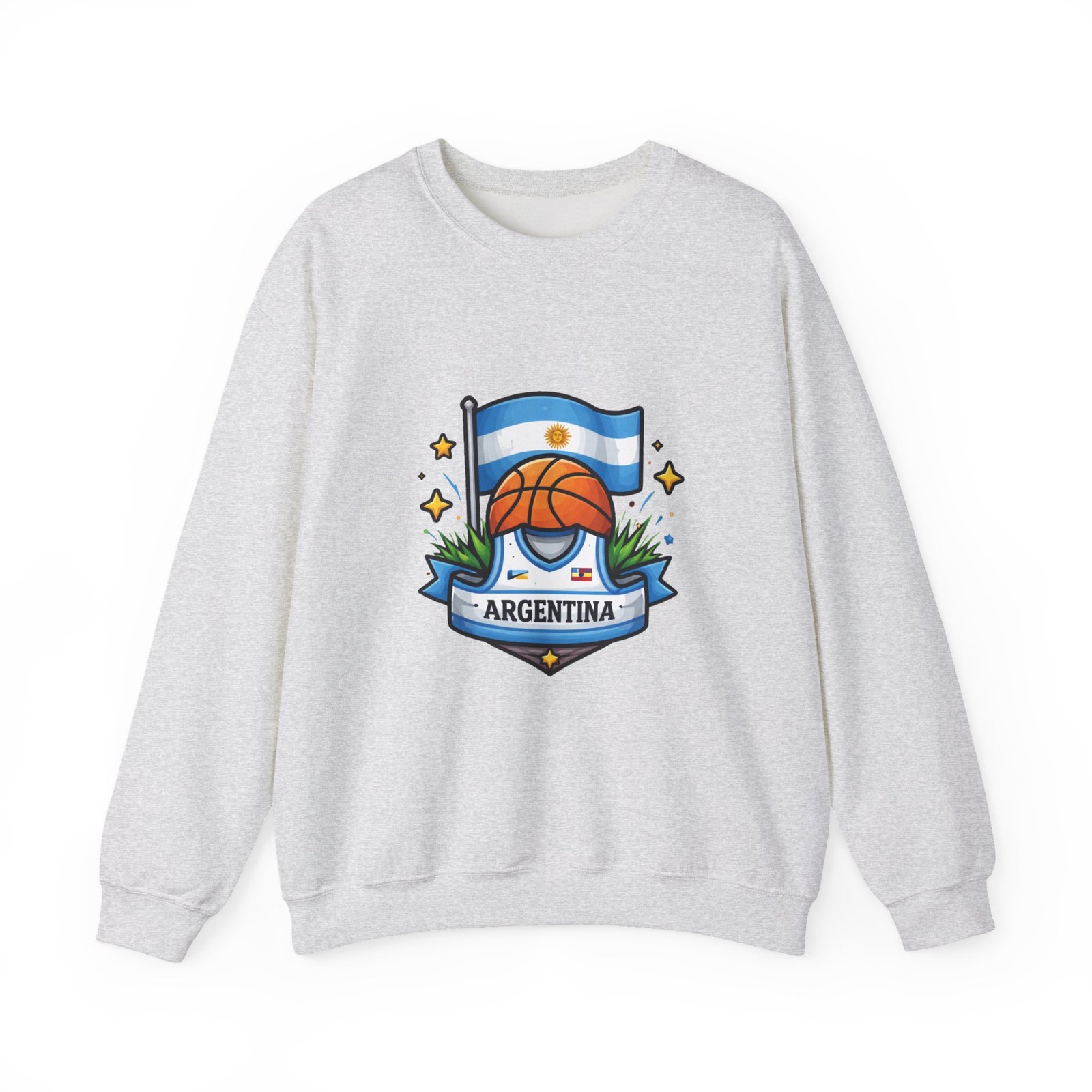 A soft, midweight crewneck that carries the energy of the court and the pride of Argentina. The white sweatshirt features a vibrant, embroidered-style basketball crest with the Argentine flag, laurel leaves, and subtle star accents—clean enough for everyday wear, bold enough to stand out at local games or while cheering from the stands. The fabric has a balanced cotton-poly feel that warms without weighing you down. Thoughtful details like a ribbed collar, durable double-needle stitching, and a tear-away label keep it comfortable long after the season ends. Wear it to practices, pick-up games, or weekend walks when you want a casual layer that speaks to your team loyalty.