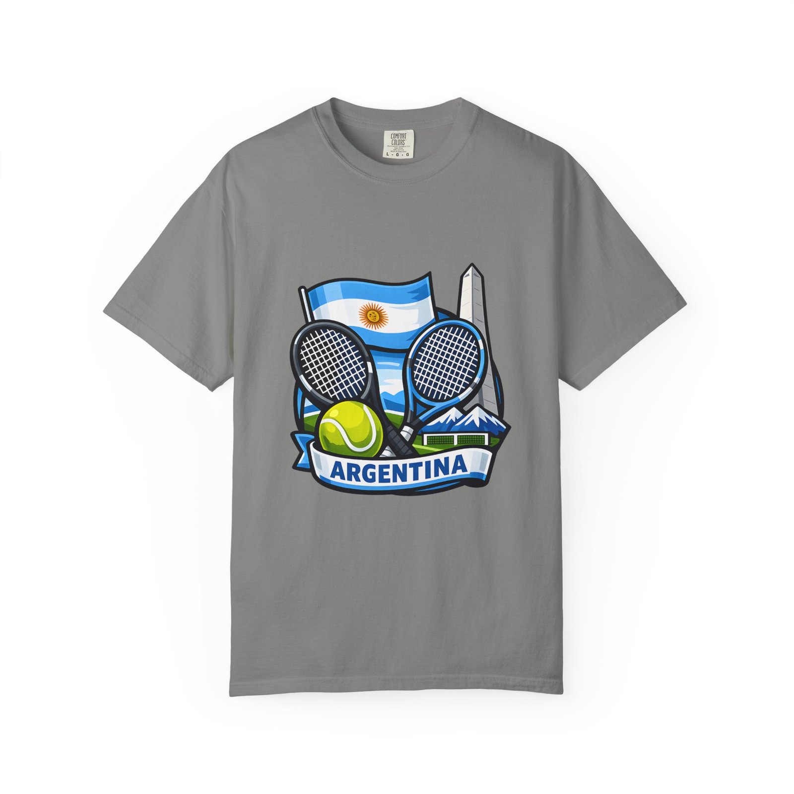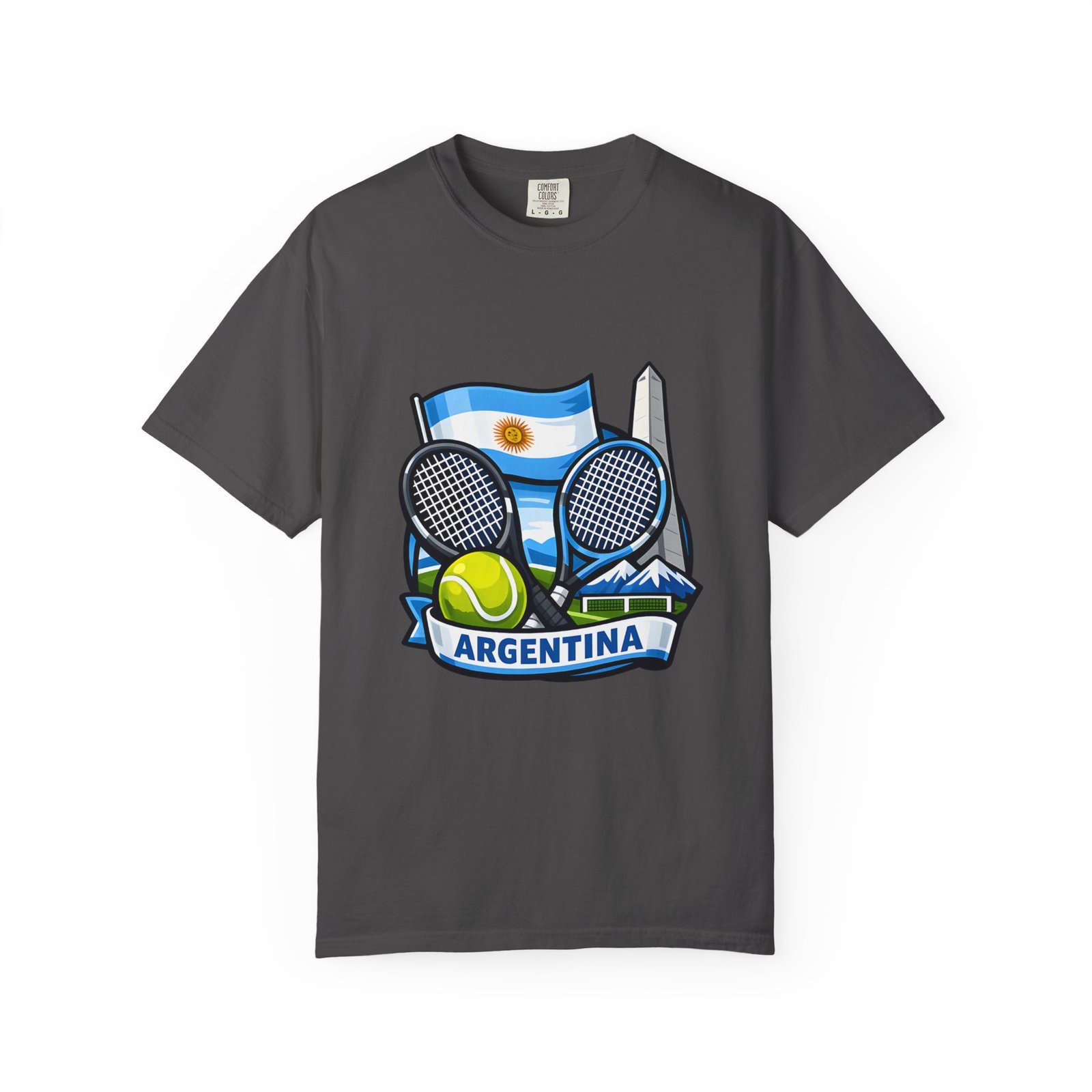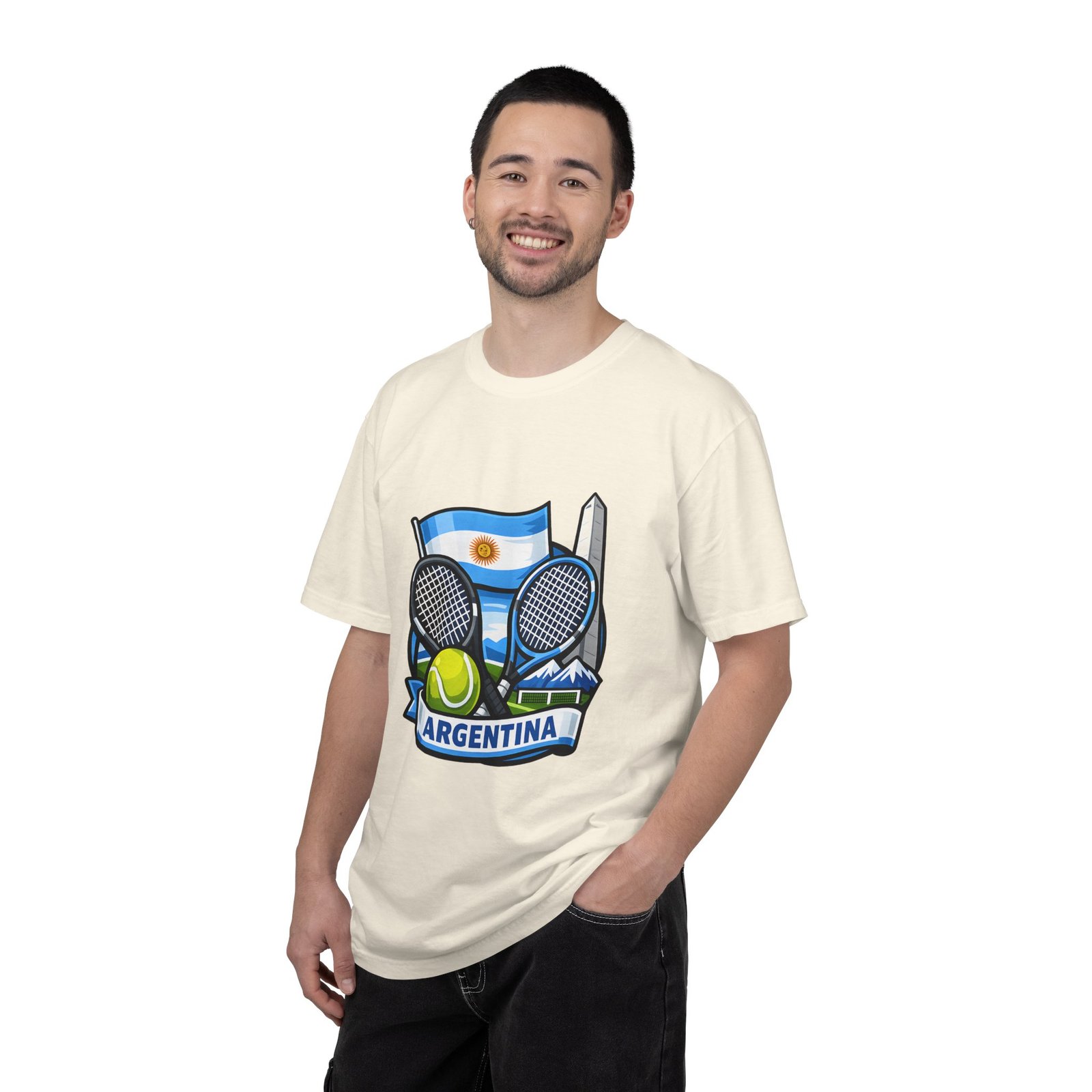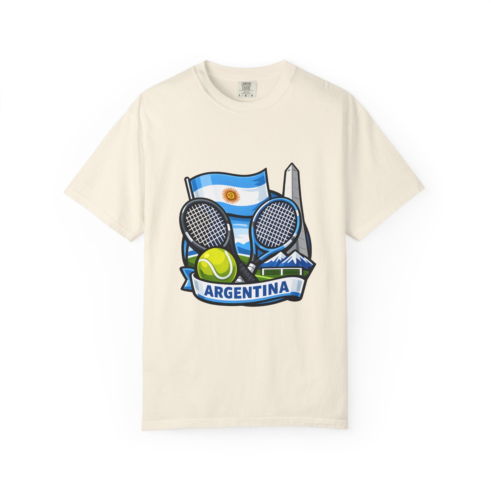This garment-dyed tee carries a relaxed, lived-in feel that pairs performance-ready imagery with everyday comfort. A vivid Argentina tennis crest—two rackets, a bright tennis ball, and the Obelisco silhouette against the Argentine flag—sits on the chest, projecting quiet pride and court-side energy. The heavy-weight ring-spun cotton softens with wear, the dye process gives a subtle vintage texture, and the roomy cut lets you move freely between practice sessions, club nights, and weekend wanderings. Worn by fans who love the game and their country, it reads like a favorite jersey reimagined for streetwear — breathable, durable, and made to age well with you.