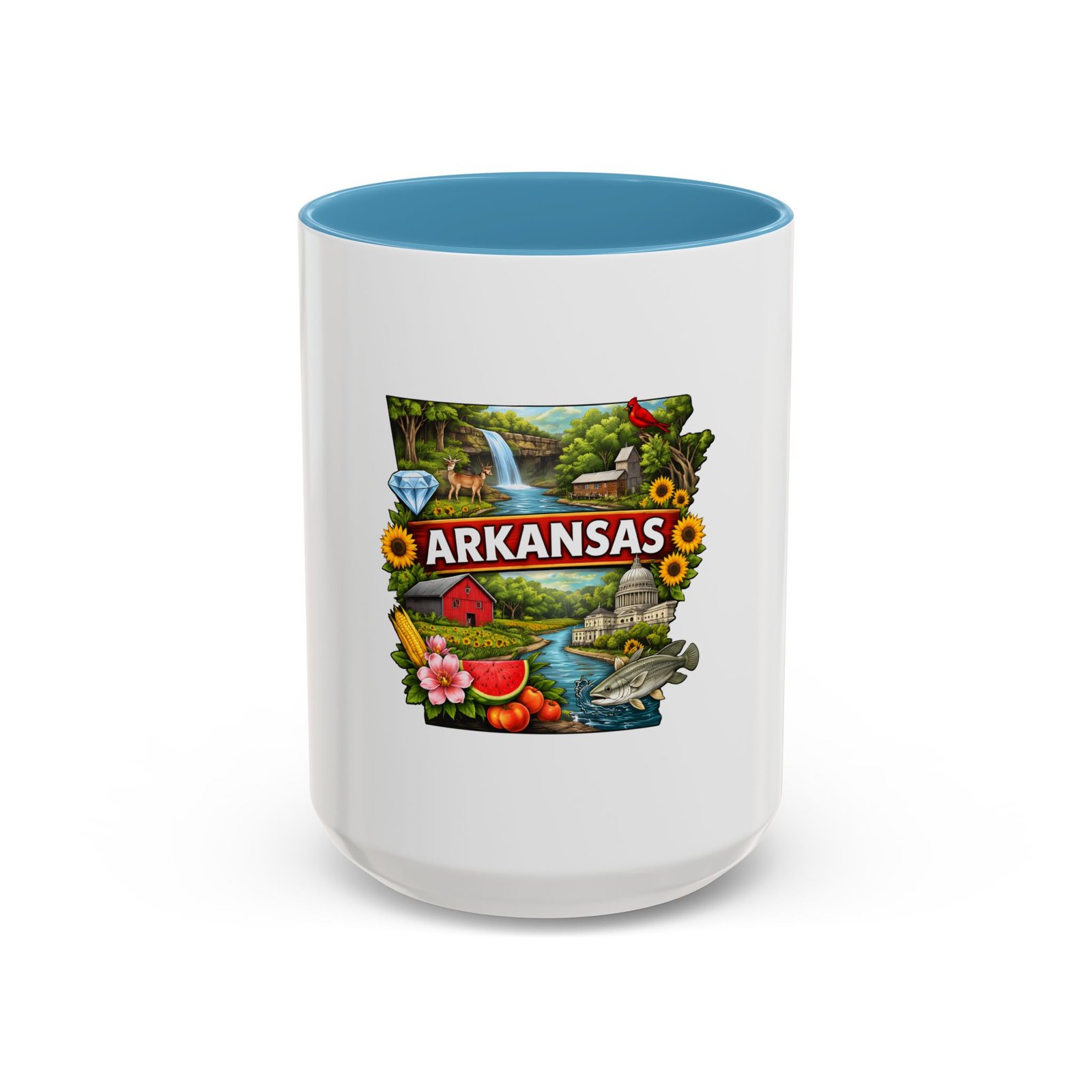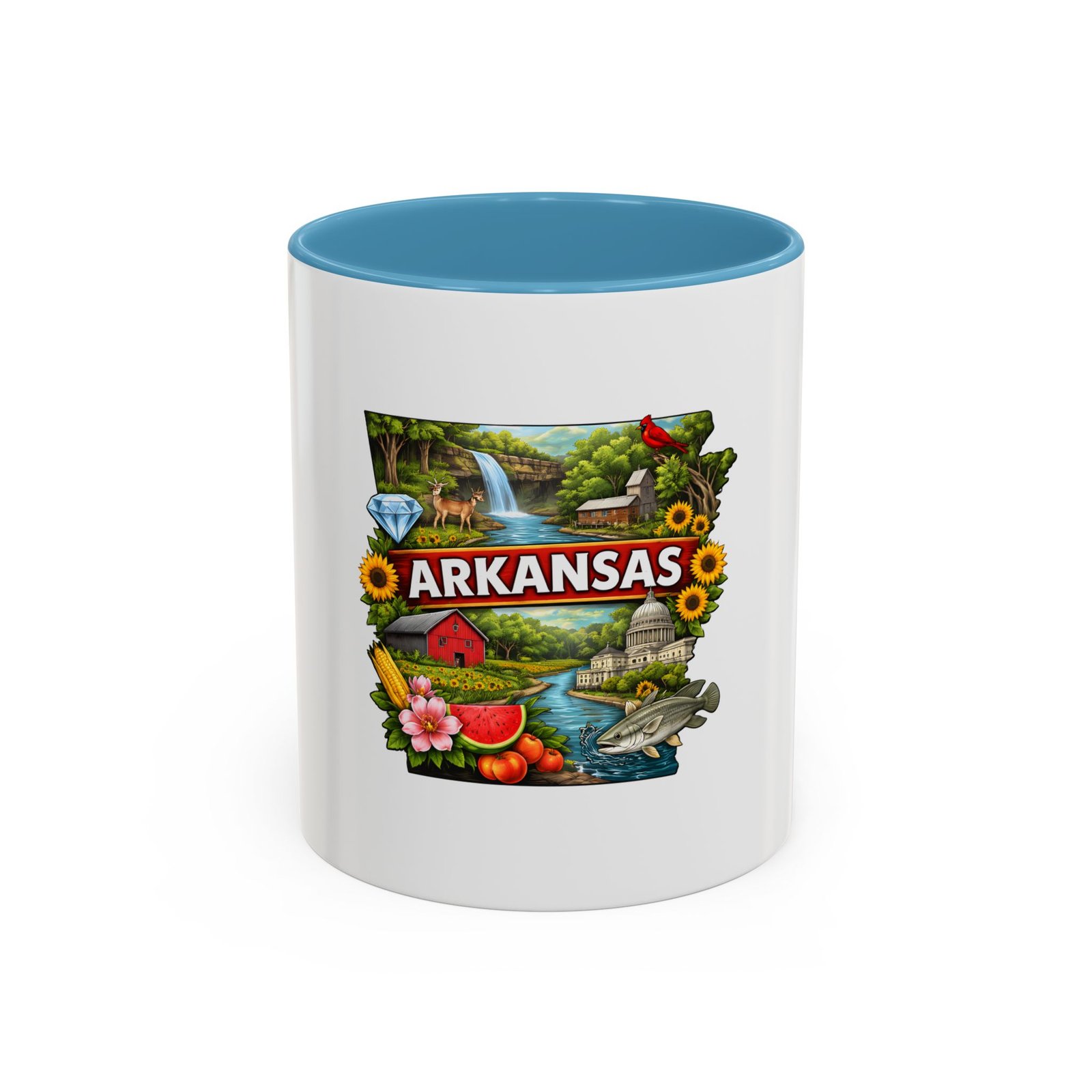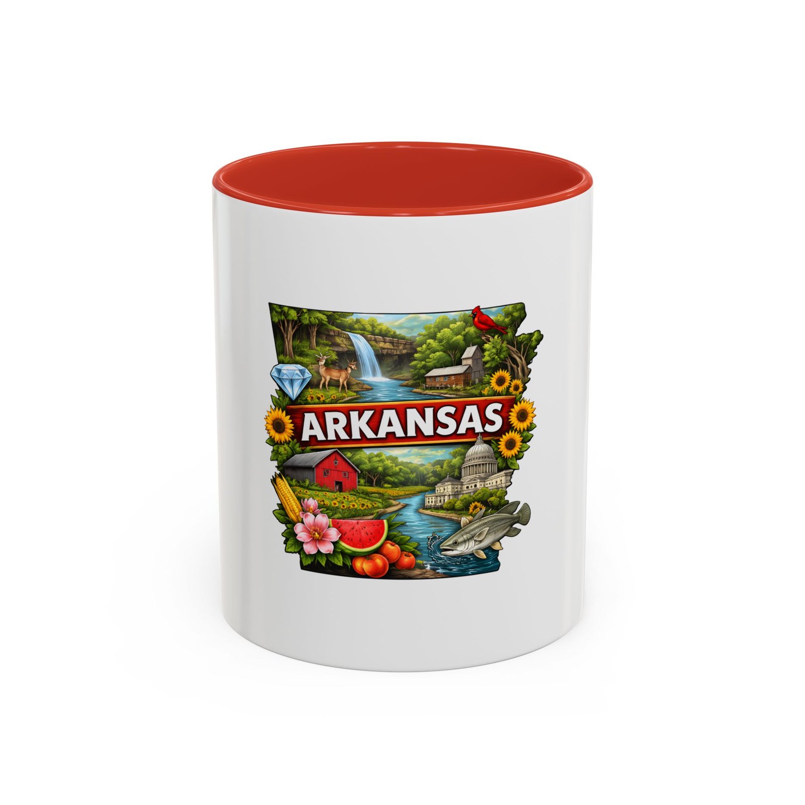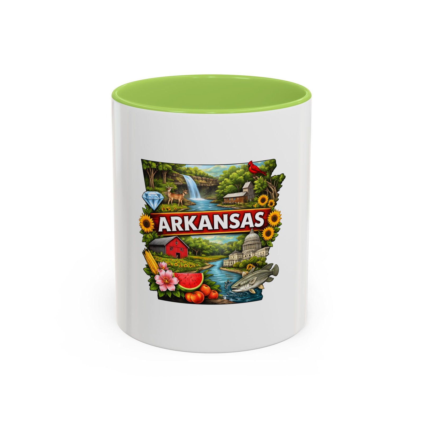 This glossy ceramic mug brings Arkansas to your morning routine with bright, detailed artwork that celebrates the state’s landscapes and local flavor. The colored interior and handle add a playful contrast to the white exterior, framing the vibrant design of waterfalls, wildlife, farmland, and regional icons. It feels like a little escape—hold it in your hands and remember riverbank mornings, shaded hollows, and weekend drives through blooming fields. Durable for everyday use, the mug stands up to microwave reheats and dishwasher cycles without dulling the print. For anyone who carries Arkansas in their heart, this mug turns coffee breaks into familiar, homespun moments.
