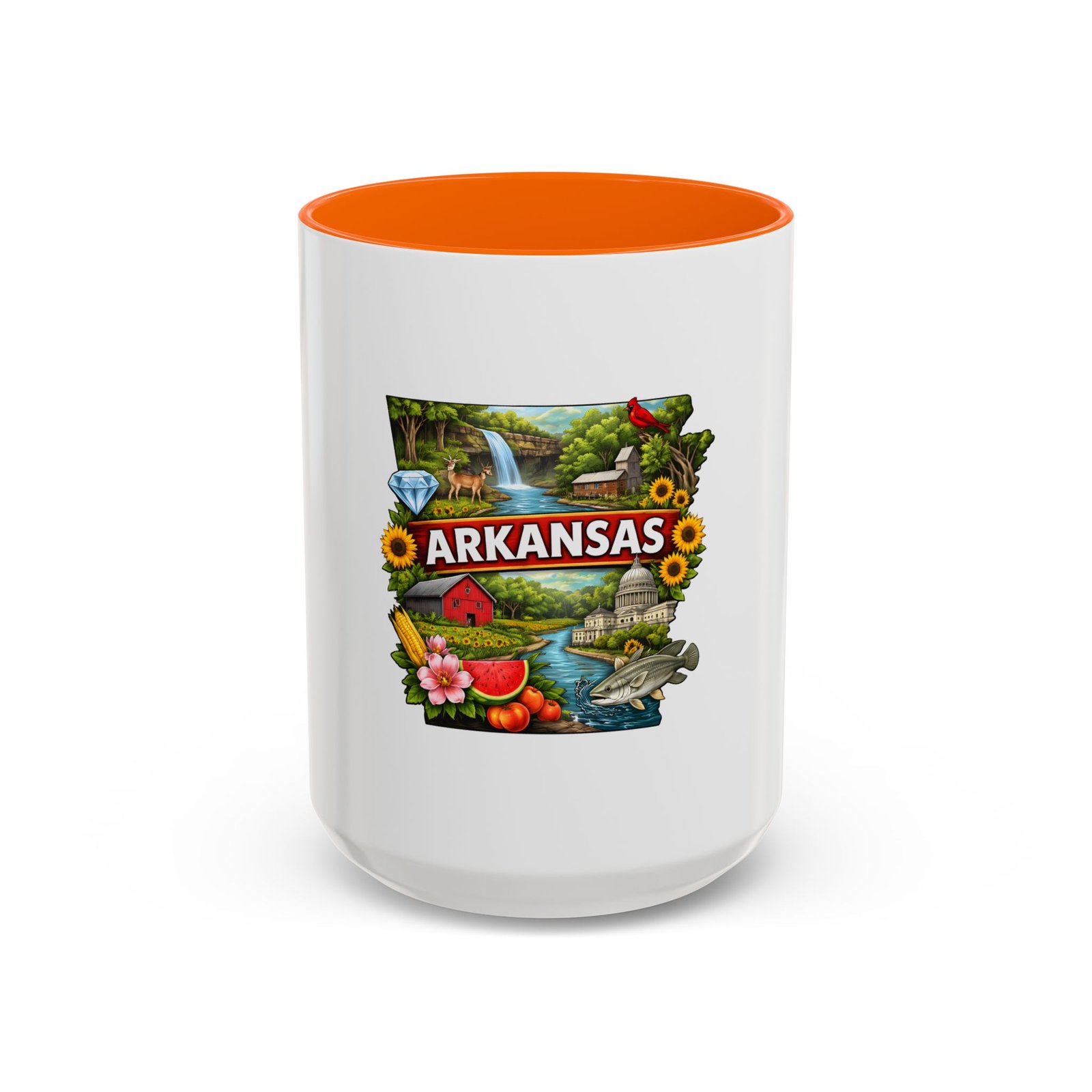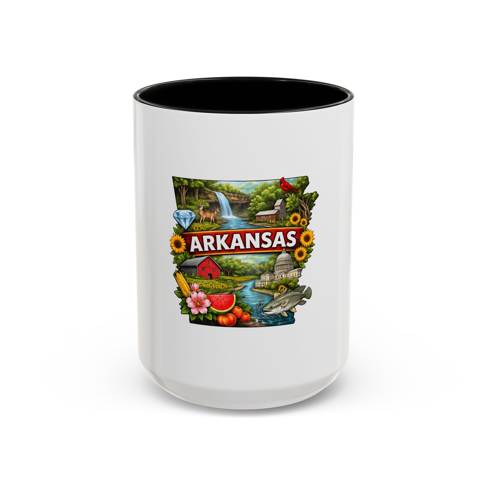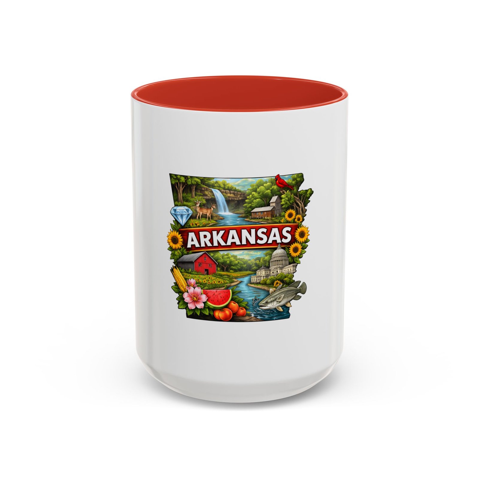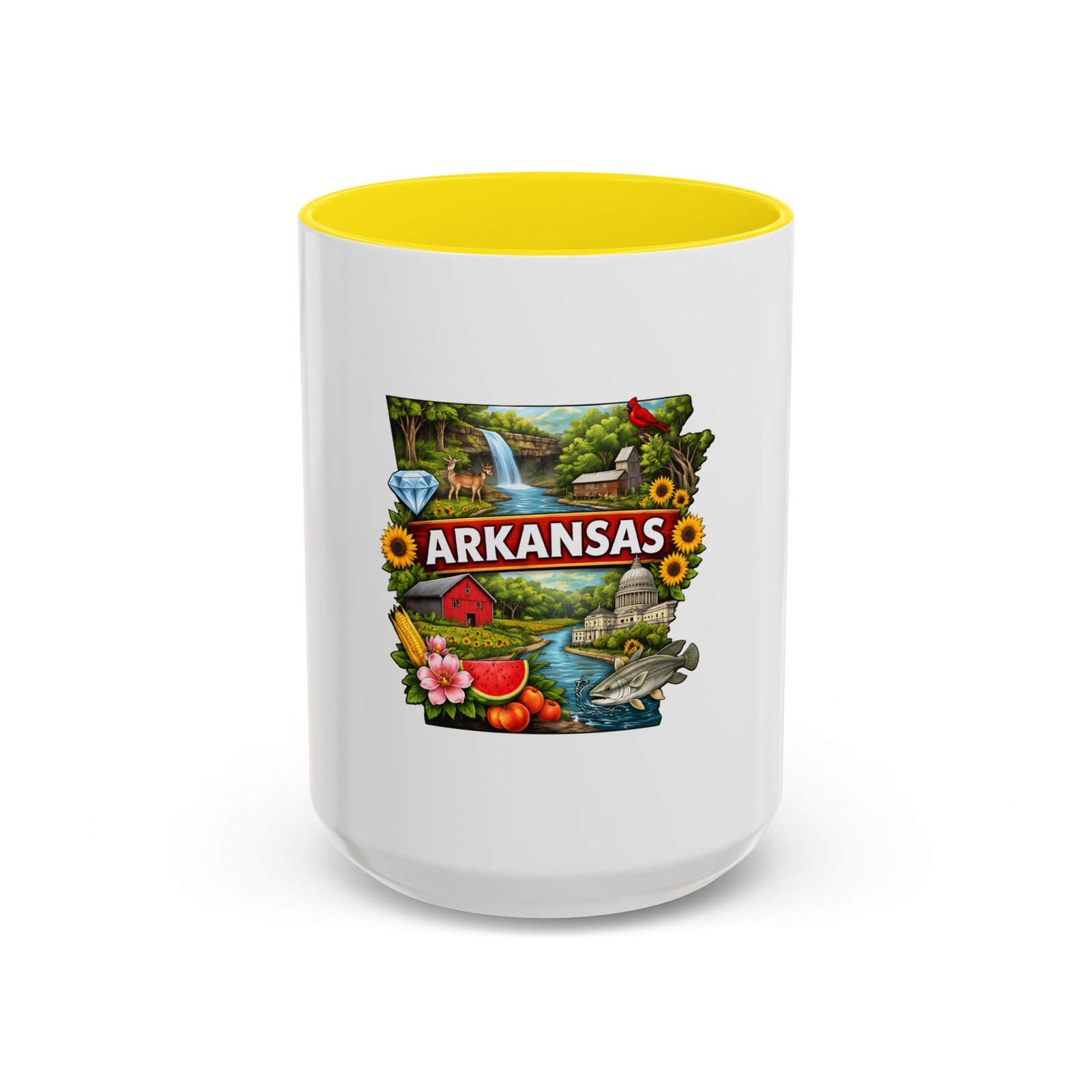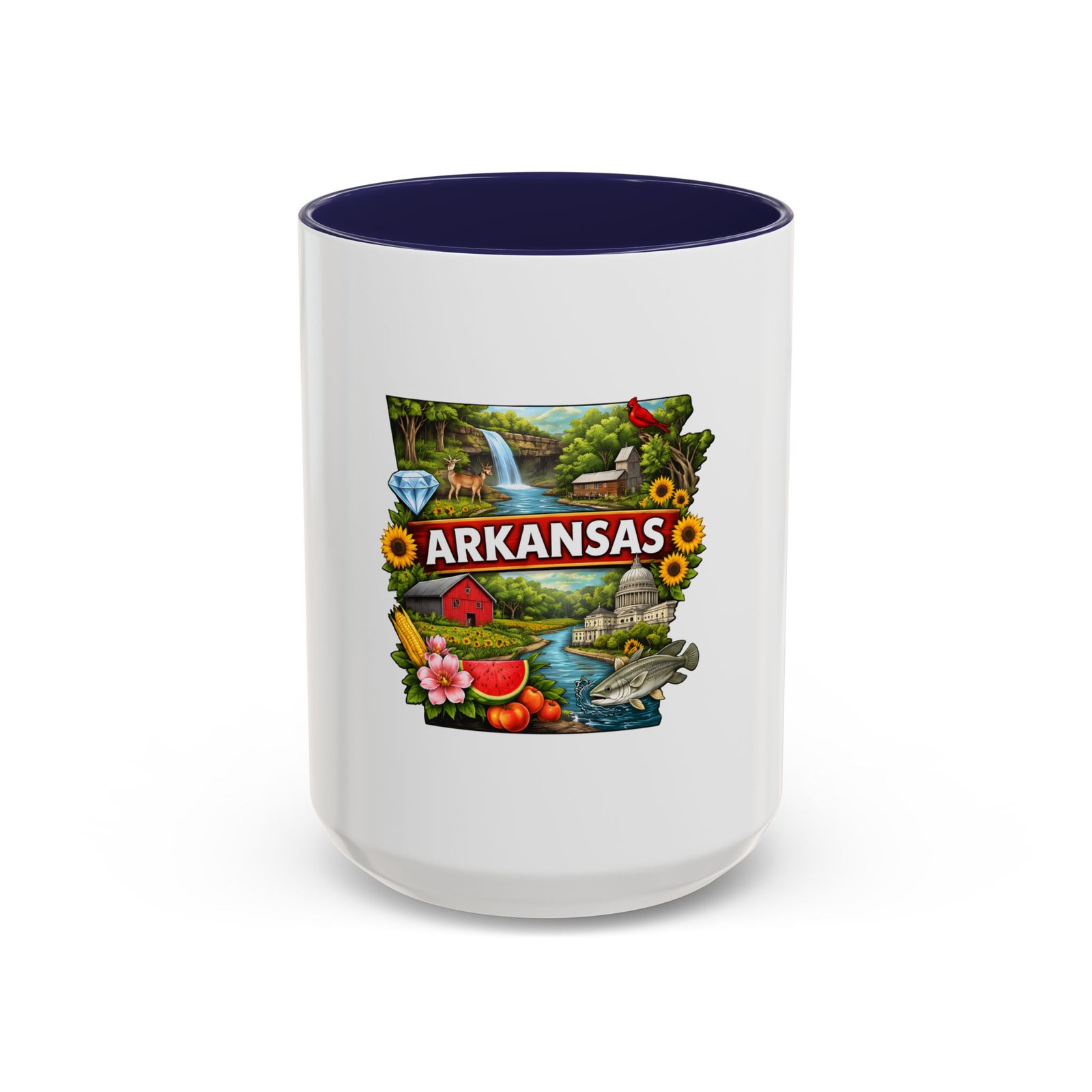 This glossy ceramic mug brings Arkansas to your morning routine with bright, detailed artwork that celebrates the state’s landscapes and local flavor. The colored interior and handle add a playful contrast to the white exterior, framing the vibrant design of waterfalls, wildlife, farmland, and regional icons. It feels like a little escape—hold it in your hands and remember riverbank mornings, shaded hollows, and weekend drives through blooming fields. Durable for everyday use, the mug stands up to microwave reheats and dishwasher cycles without dulling the print. For anyone who carries Arkansas in their heart, this mug turns coffee breaks into familiar, homespun moments.