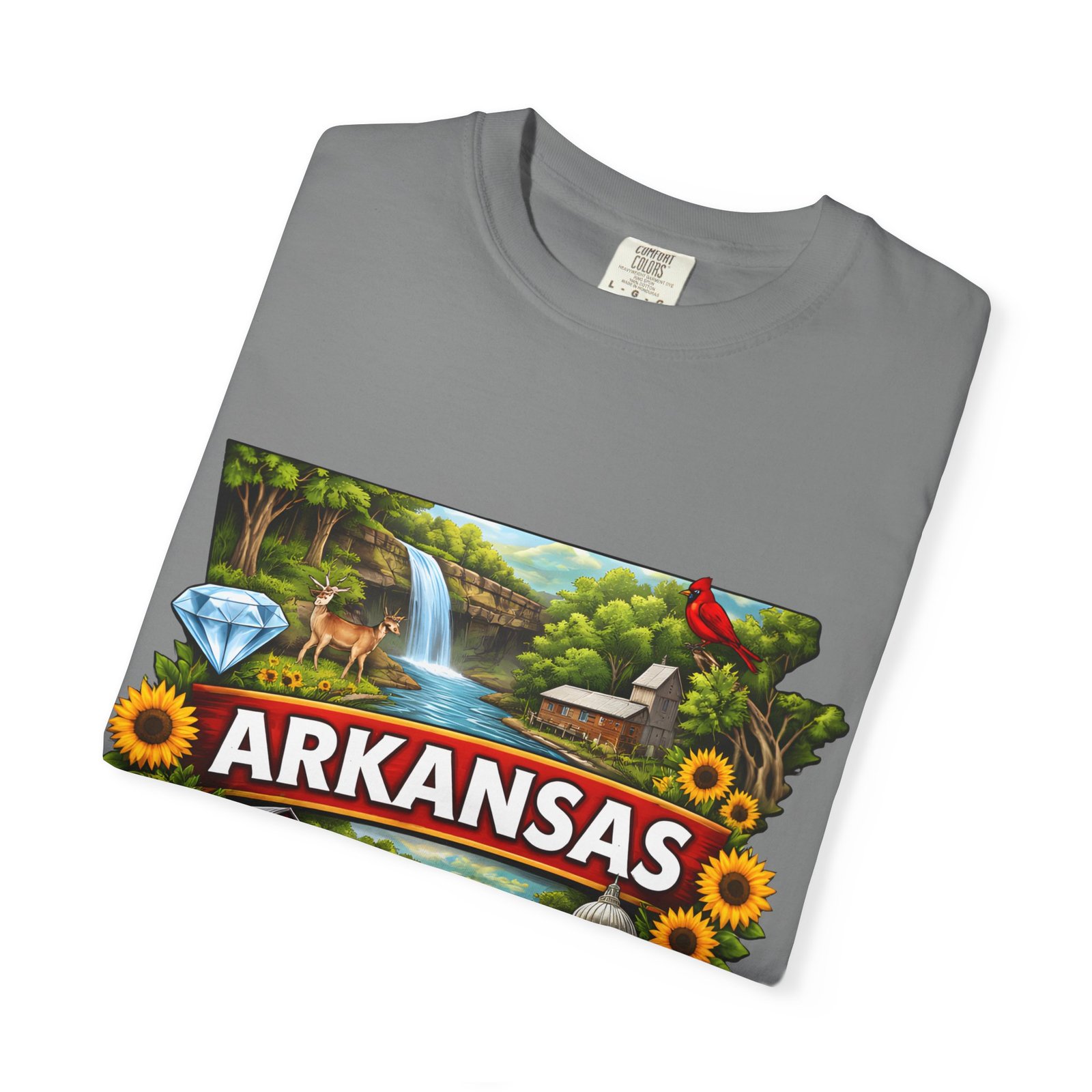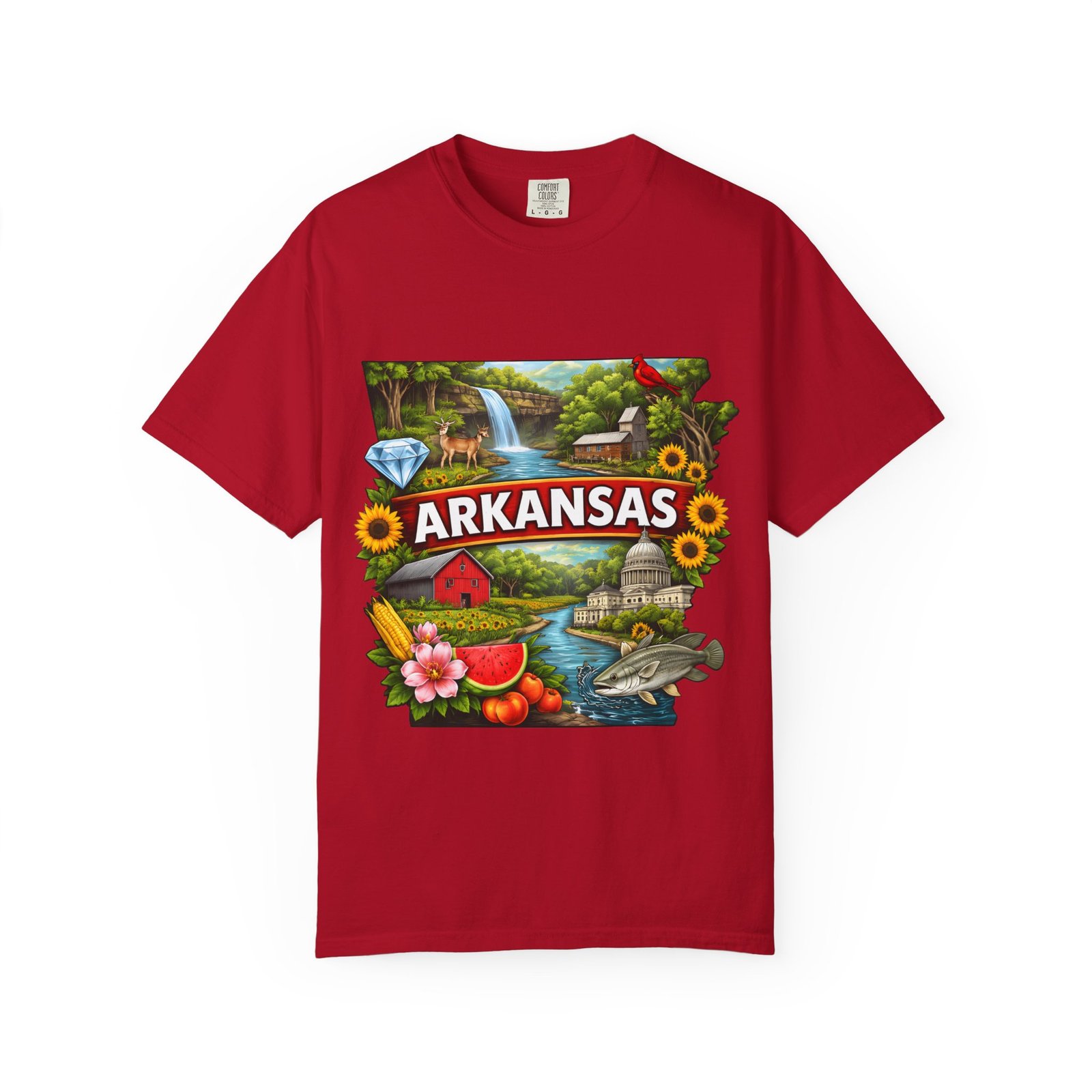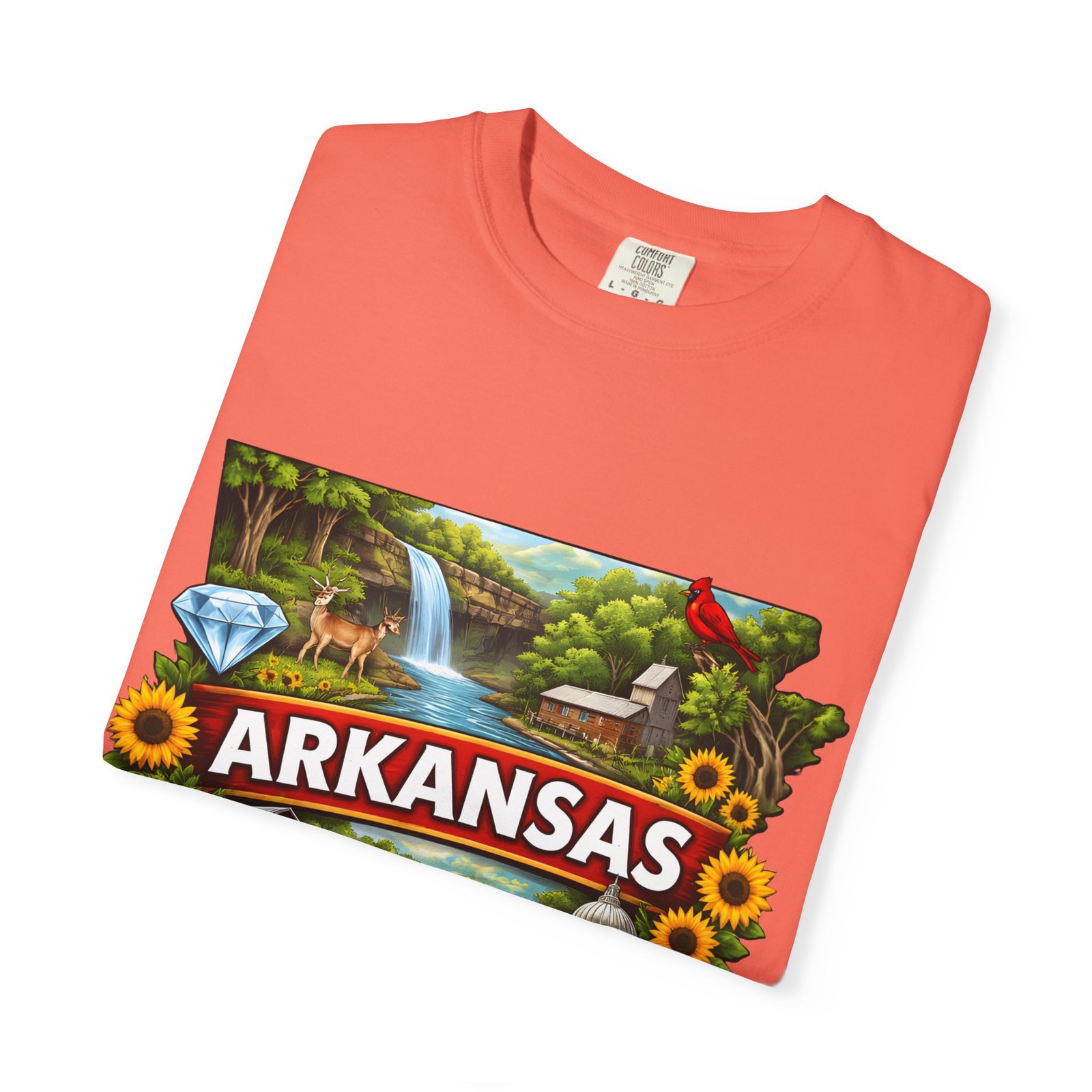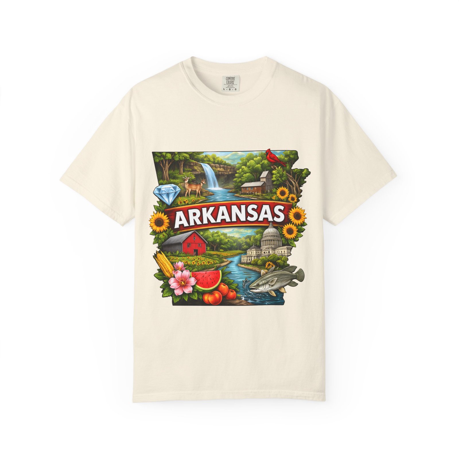 This garment-dyed tee brings Arkansas to life with vibrant, nostalgic illustration—waterfalls, river fishing, the state capitol dome, sunflowers, and local flora and fauna arranged around a bold “ARKANSAS” banner. The heavyweight cotton has a lived-in softness from the post-construction dye and a relaxed fit that drapes easily for days spent outdoors or wandering small-town streets. Wear it to celebrate backyard barbecues, weekend river runs, or anytime you want a wearable snapshot of Arkansas pride. The sewn-in label and double-needle stitched seams promise durability; the tubular knit keeps lines clean and comfortable. Available in many colors and sizes, this tee ages into its own story with each wash.