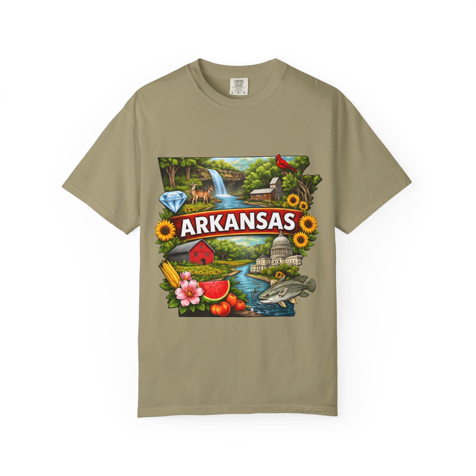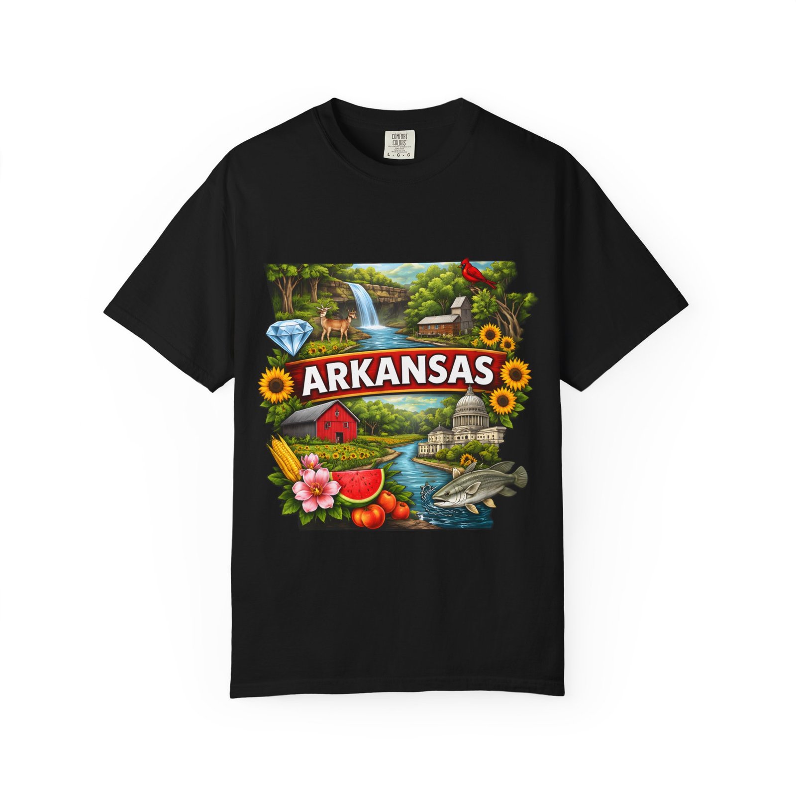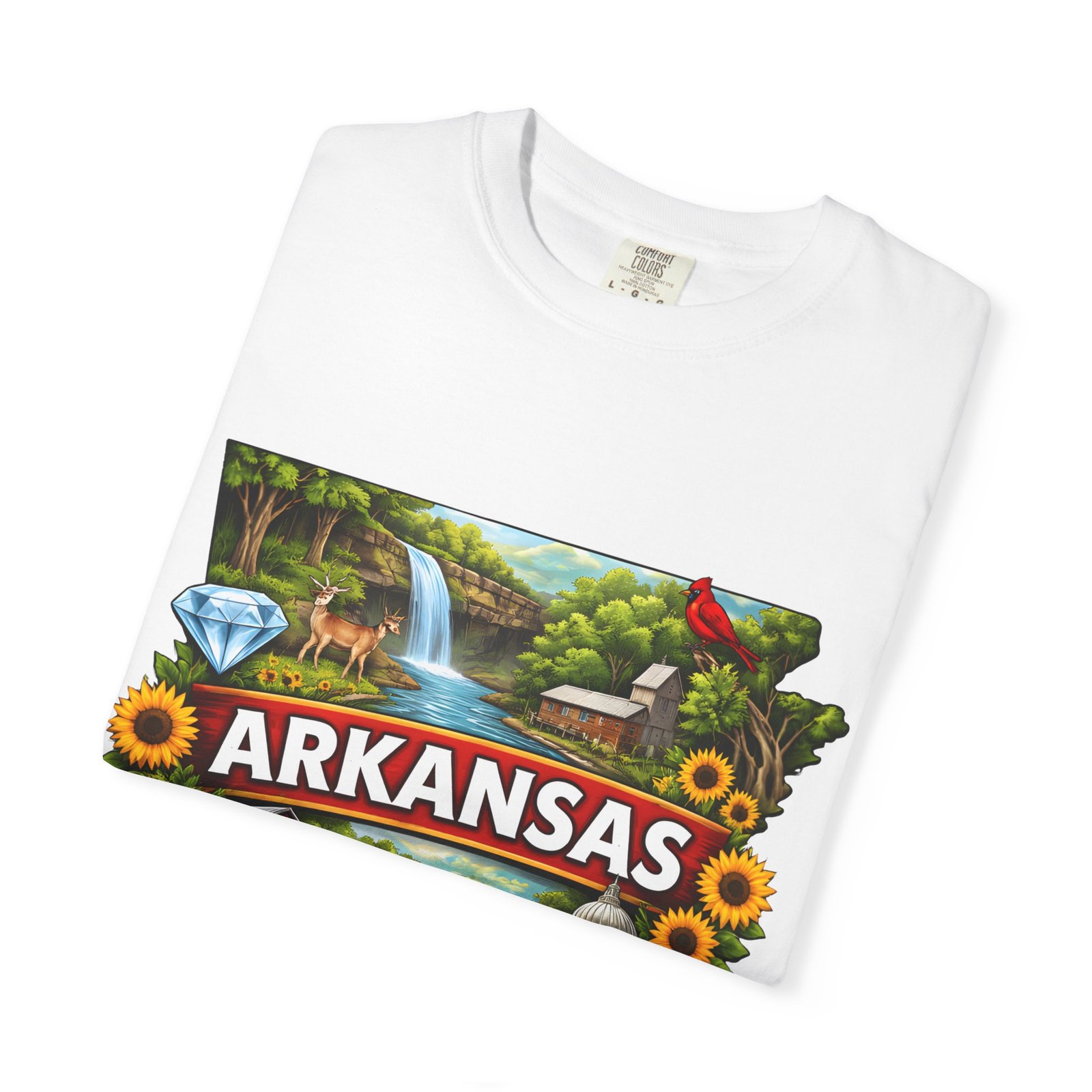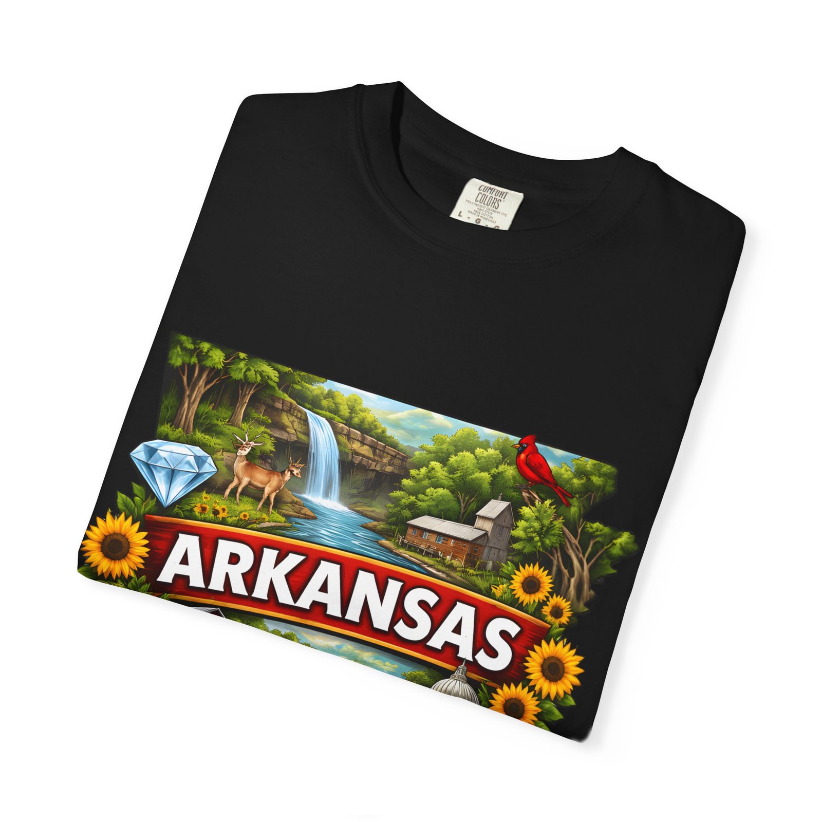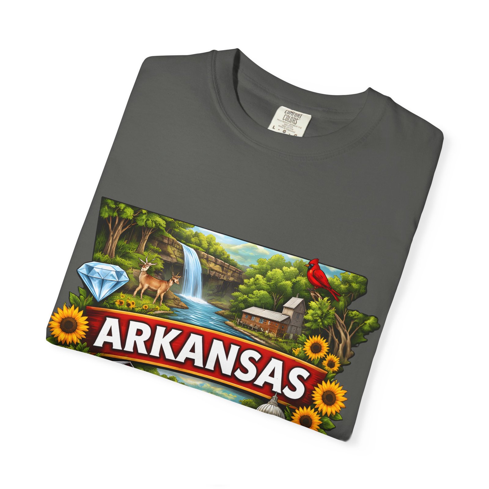 This garment-dyed tee brings Arkansas to life with vibrant, nostalgic illustration—waterfalls, river fishing, the state capitol dome, sunflowers, and local flora and fauna arranged around a bold “ARKANSAS” banner. The heavyweight cotton has a lived-in softness from the post-construction dye and a relaxed fit that drapes easily for days spent outdoors or wandering small-town streets. Wear it to celebrate backyard barbecues, weekend river runs, or anytime you want a wearable snapshot of Arkansas pride. The sewn-in label and double-needle stitched seams promise durability; the tubular knit keeps lines clean and comfortable. Available in many colors and sizes, this tee ages into its own story with each wash.