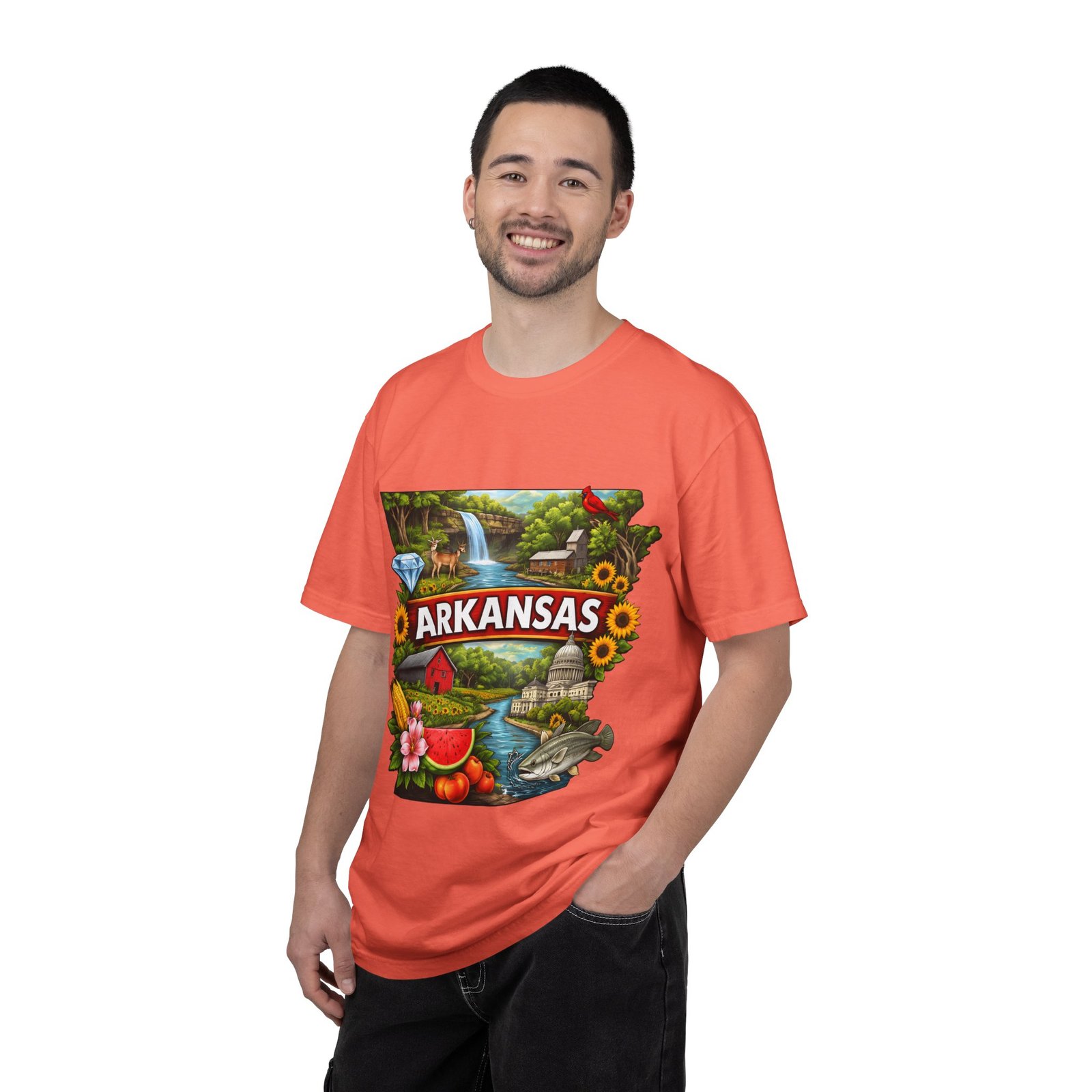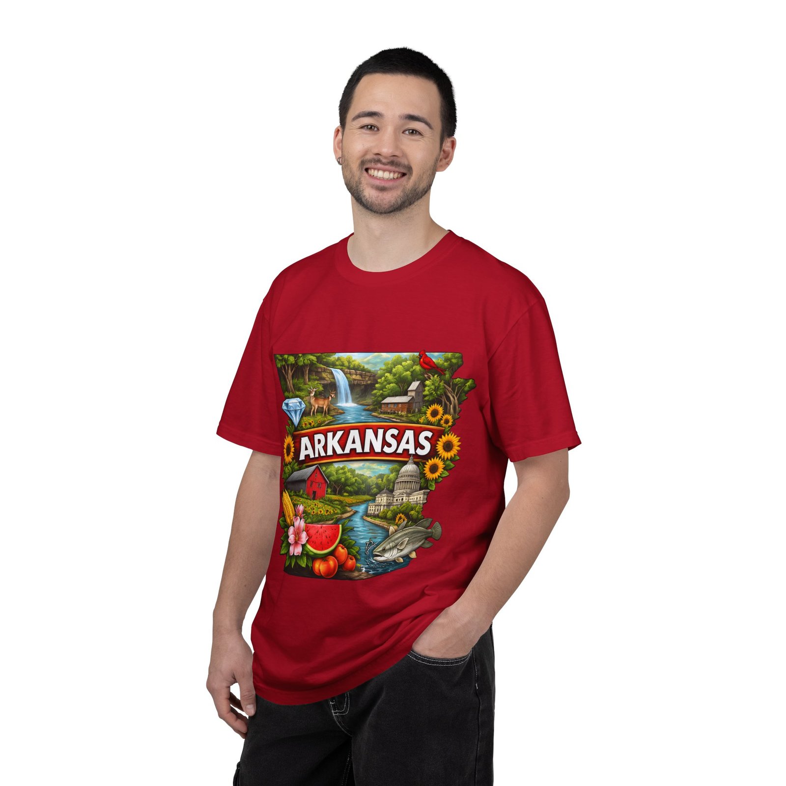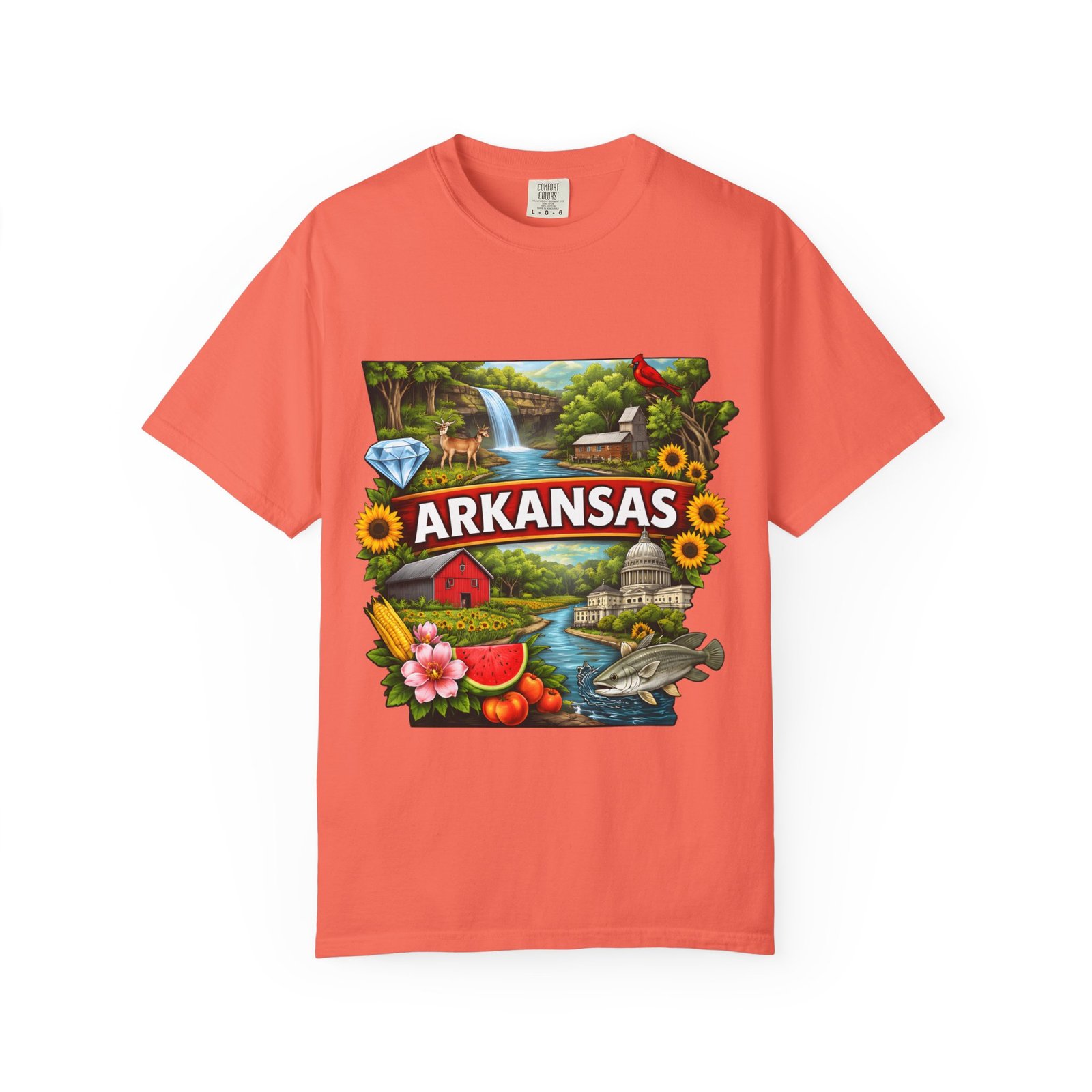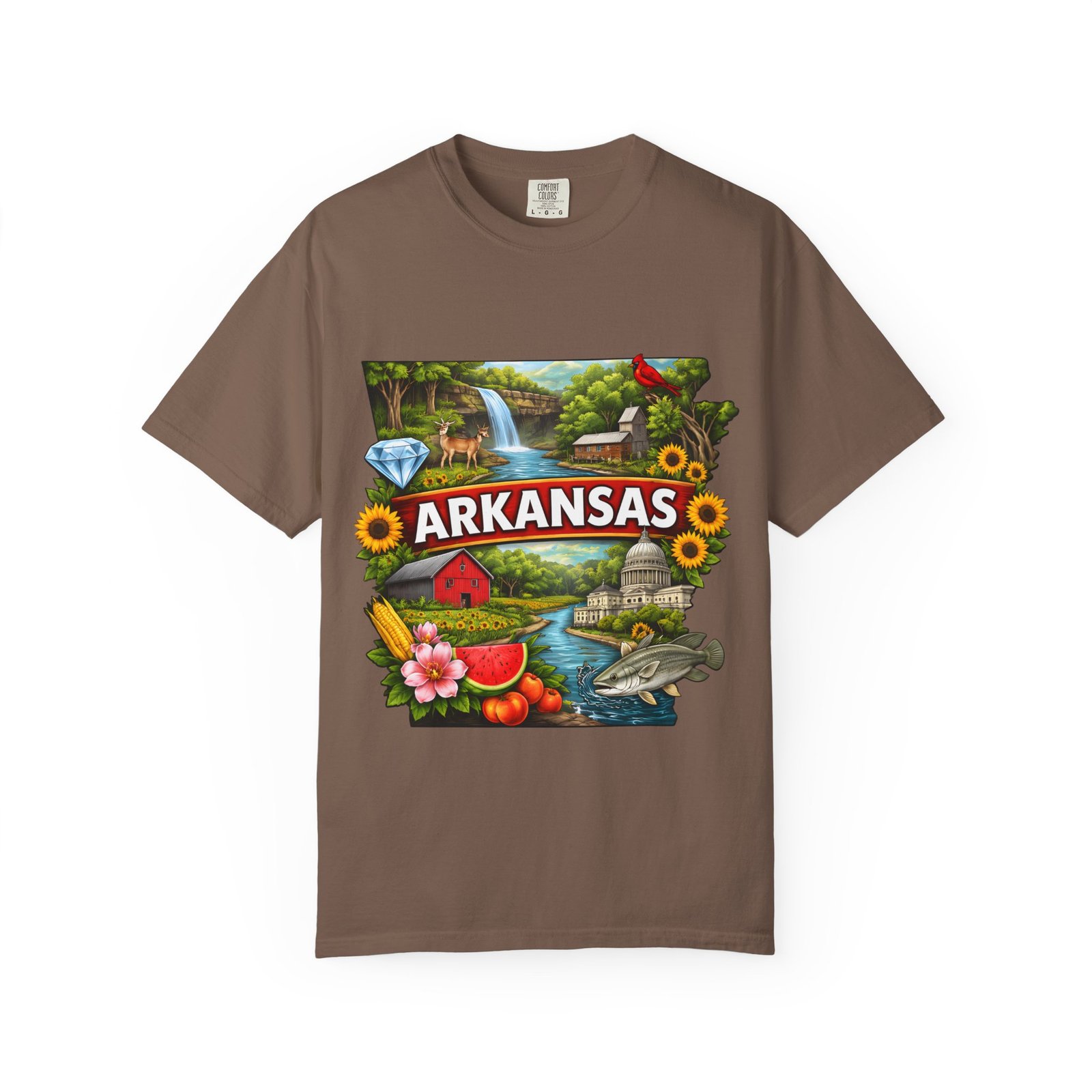 This garment-dyed tee brings Arkansas to life with vibrant, nostalgic illustration—waterfalls, river fishing, the state capitol dome, sunflowers, and local flora and fauna arranged around a bold “ARKANSAS” banner. The heavyweight cotton has a lived-in softness from the post-construction dye and a relaxed fit that drapes easily for days spent outdoors or wandering small-town streets. Wear it to celebrate backyard barbecues, weekend river runs, or anytime you want a wearable snapshot of Arkansas pride. The sewn-in label and double-needle stitched seams promise durability; the tubular knit keeps lines clean and comfortable. Available in many colors and sizes, this tee ages into its own story with each wash.