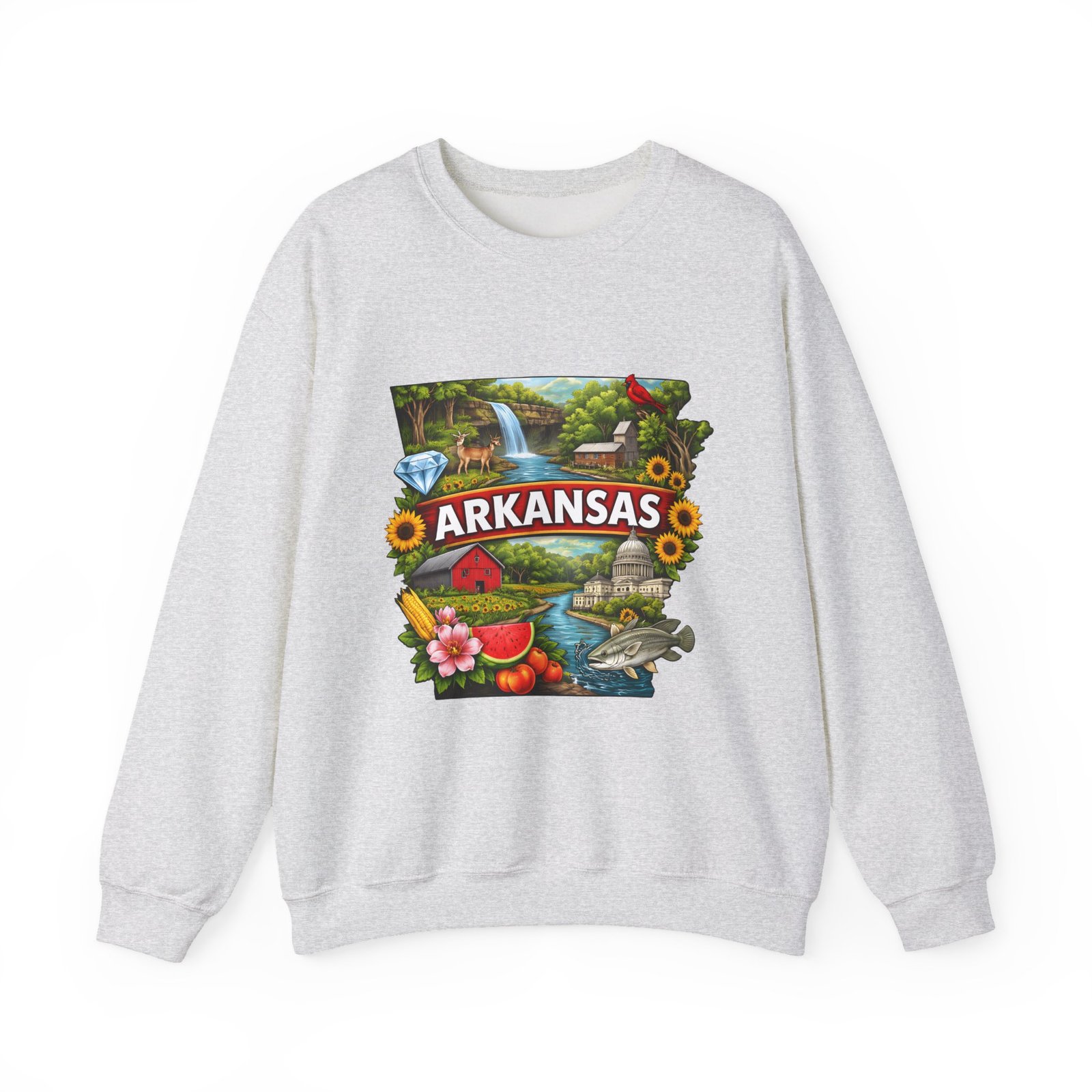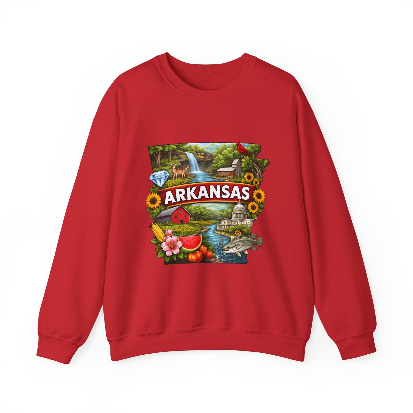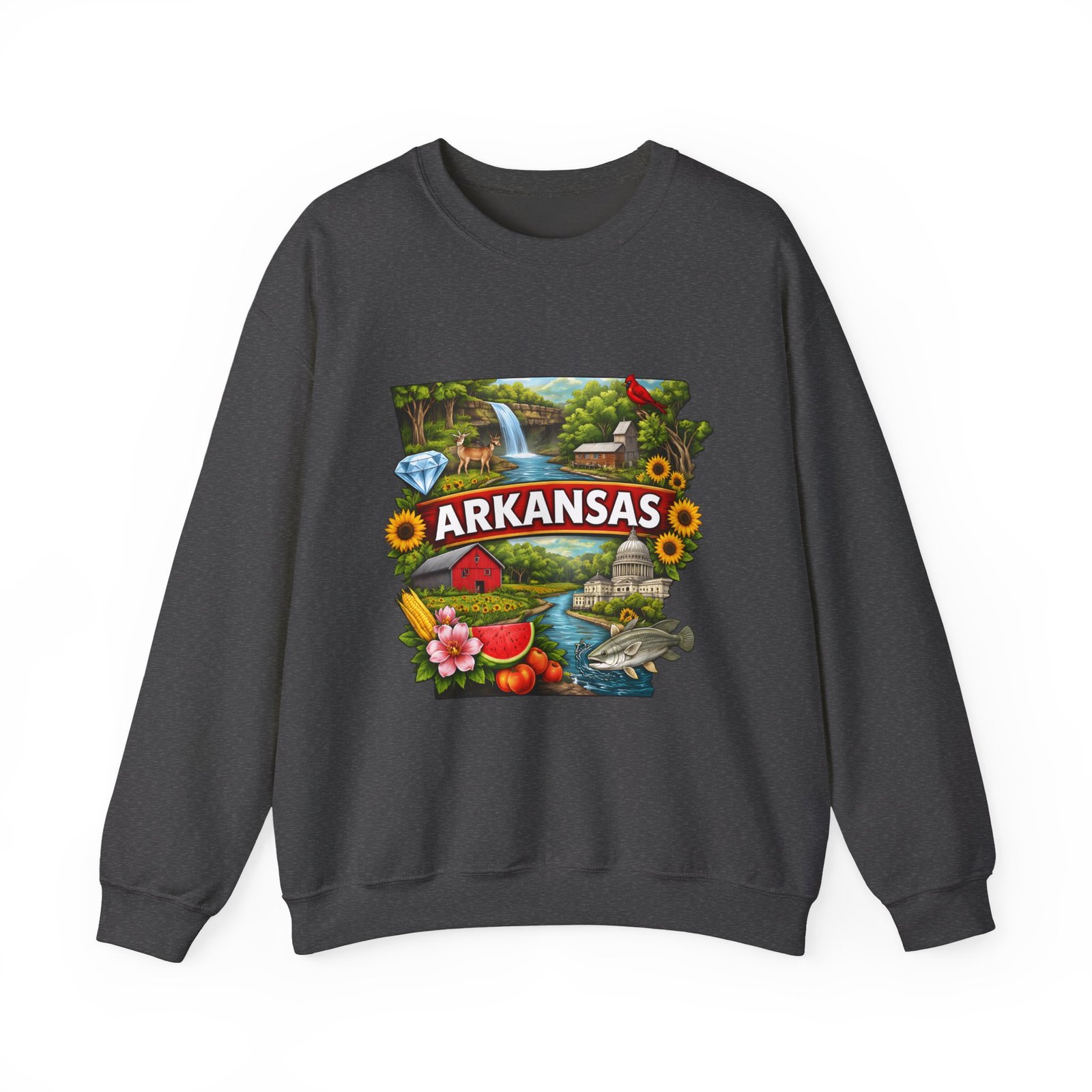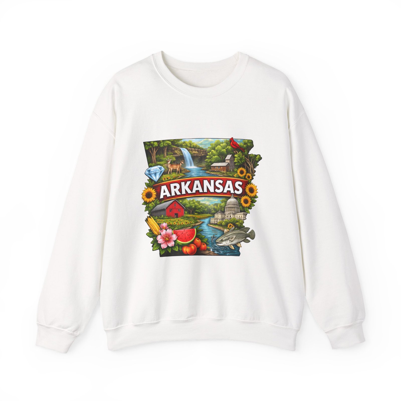 Soft, substantial, and quietly nostalgic — this crewneck brings Arkansas moments into everyday wear. A vibrant, layered print of state icons sits at the center chest: rolling hills and rivers, a cardinal perched among sunflowers, strawberries and juicy watermelon, and a leaping fish. The sweatshirt’s medium-heavy 50/50 cotton-poly blend feels warm without bulk. Tubular knit construction, ribbed collar, cuffs, and waistband hold their shape. Thoughtful details include double-needle stitching for long wear, DTF inner neck label for comfort, and OEKO-TEX certified dyes. Wear it on a cool morning drive through the Ozarks, to a local fair, or when you want to carry a little home with you wherever you go.