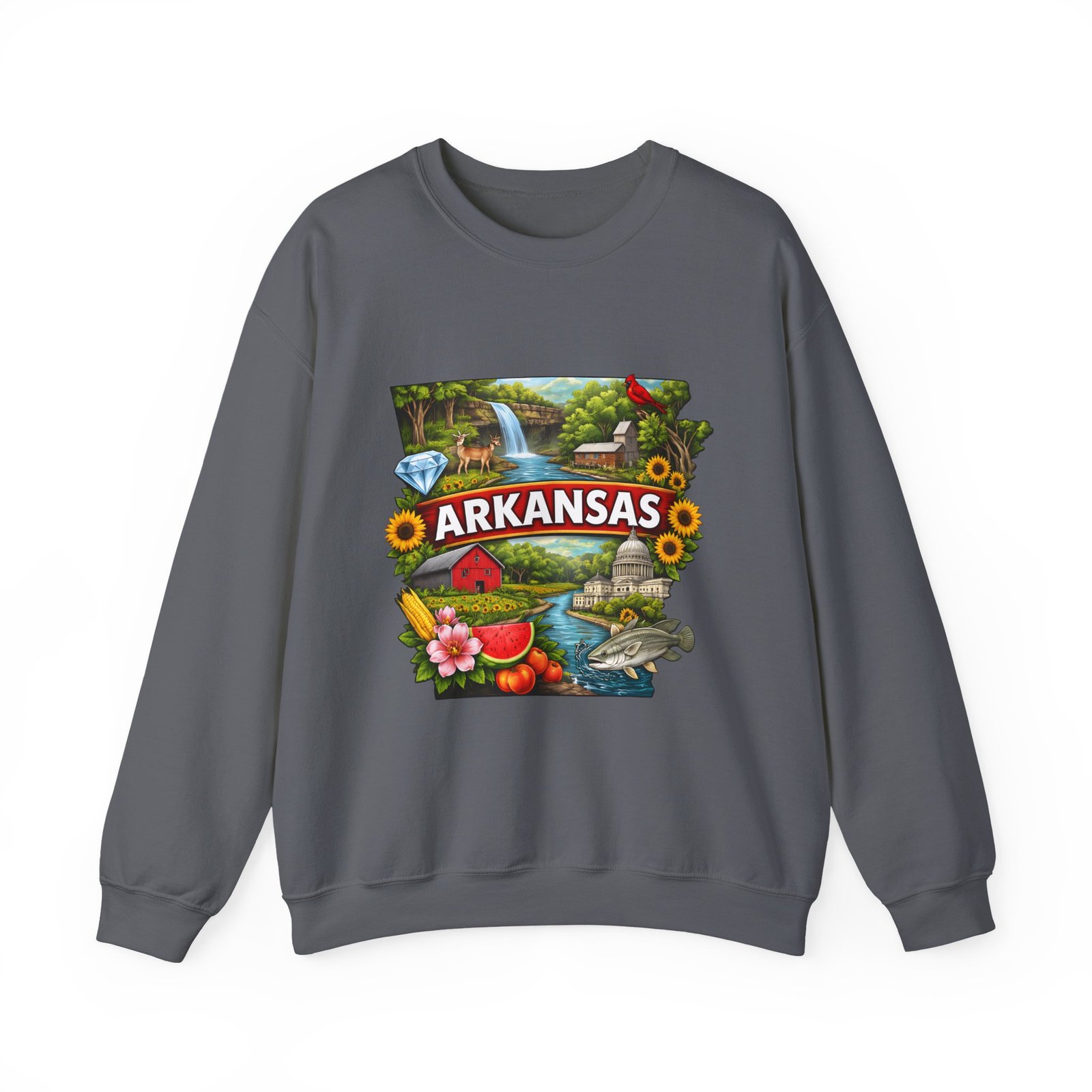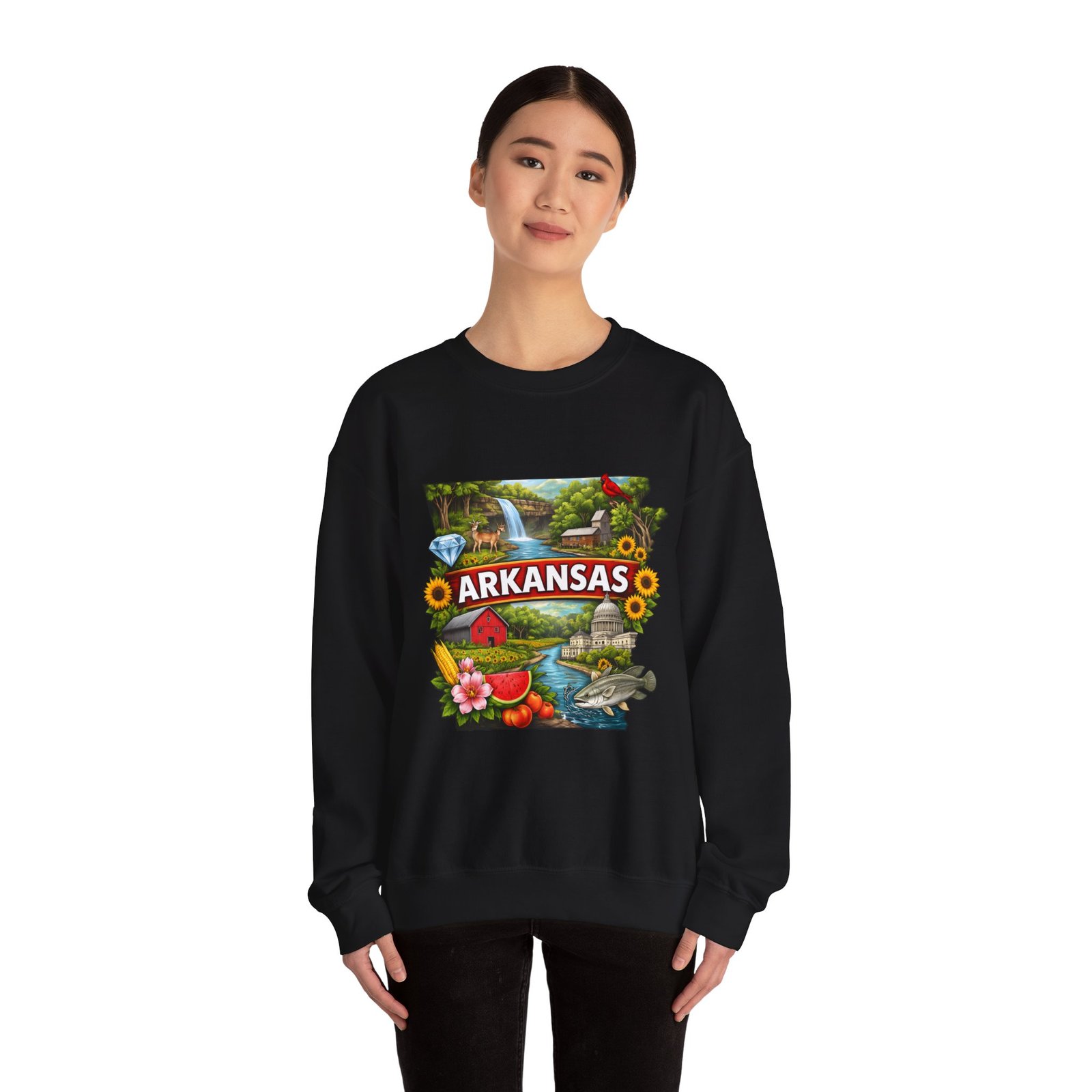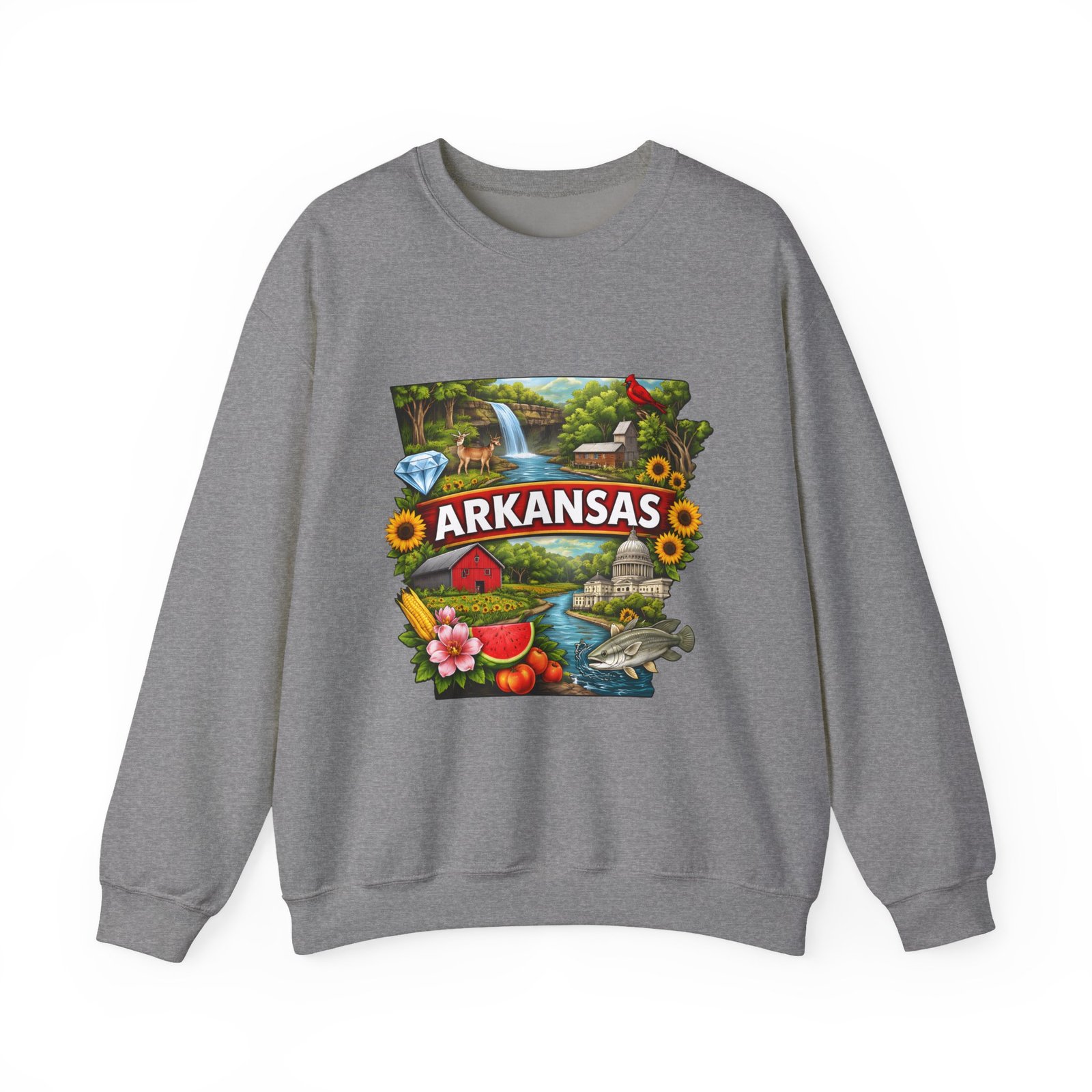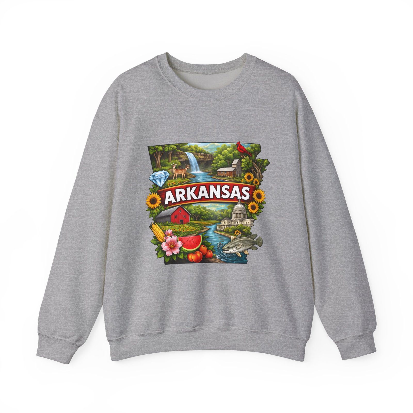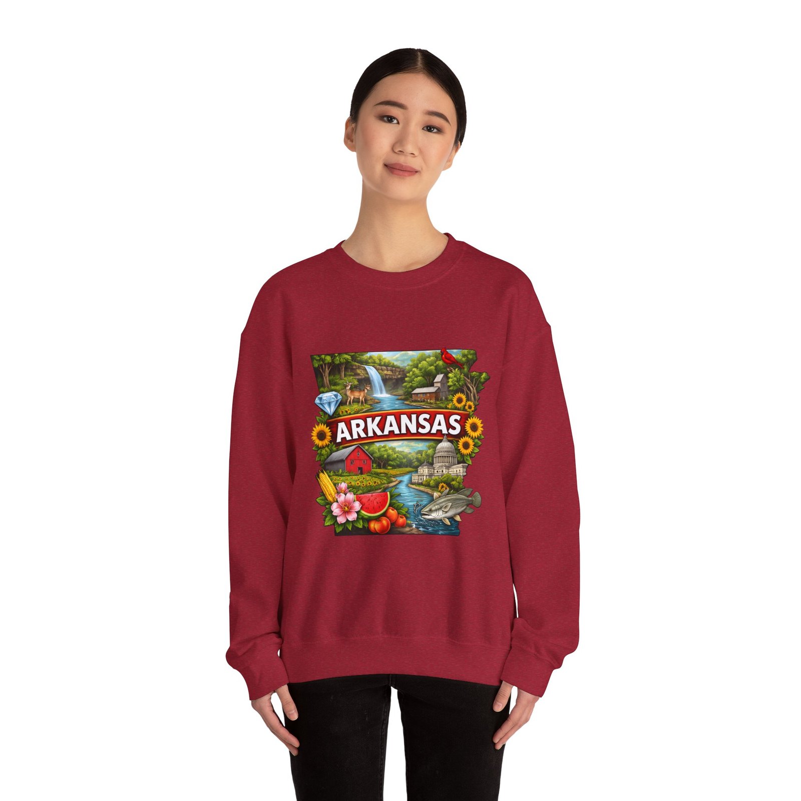 Soft, substantial, and quietly nostalgic — this crewneck brings Arkansas moments into everyday wear. A vibrant, layered print of state icons sits at the center chest: rolling hills and rivers, a cardinal perched among sunflowers, strawberries and juicy watermelon, and a leaping fish. The sweatshirt’s medium-heavy 50/50 cotton-poly blend feels warm without bulk. Tubular knit construction, ribbed collar, cuffs, and waistband hold their shape. Thoughtful details include double-needle stitching for long wear, DTF inner neck label for comfort, and OEKO-TEX certified dyes. Wear it on a cool morning drive through the Ozarks, to a local fair, or when you want to carry a little home with you wherever you go.