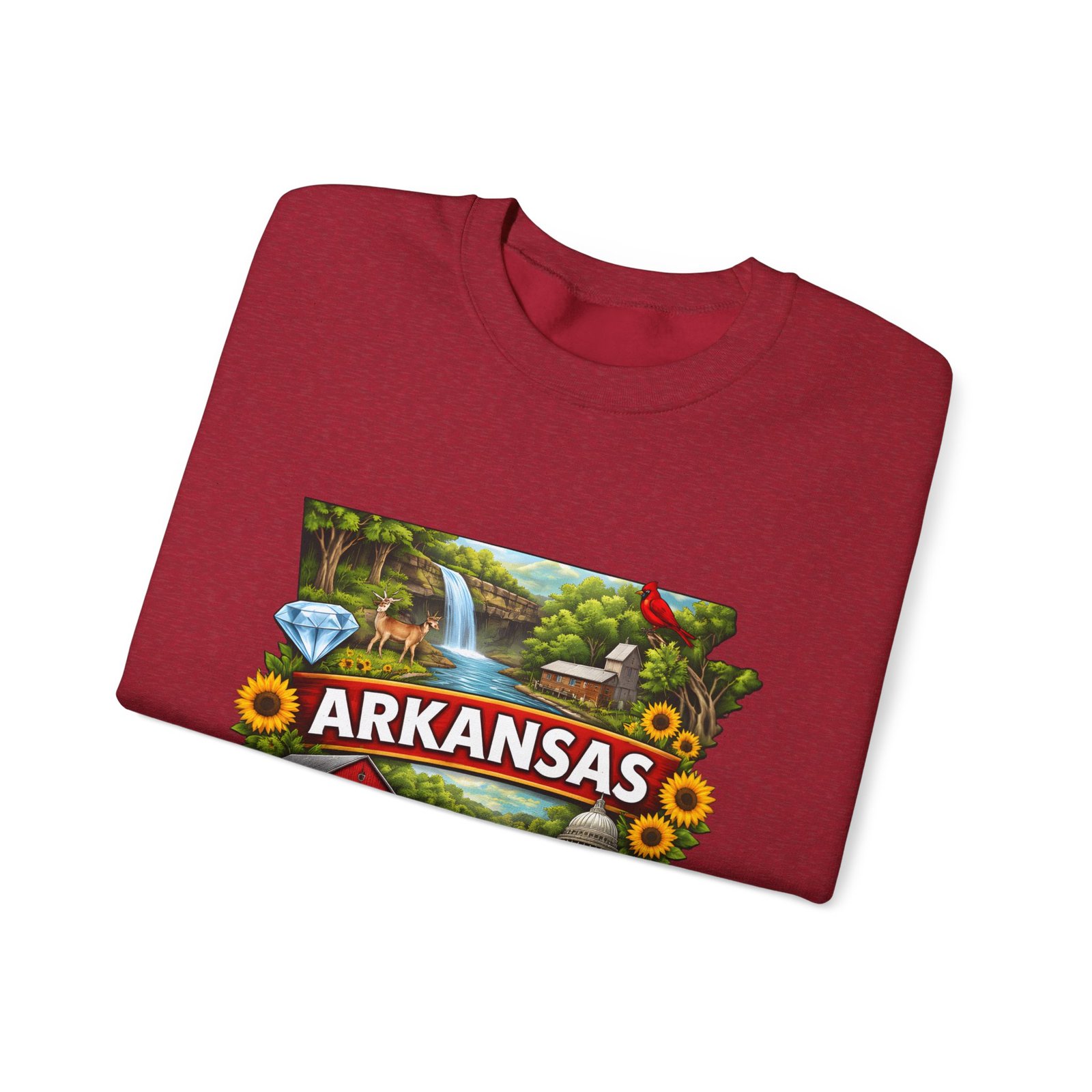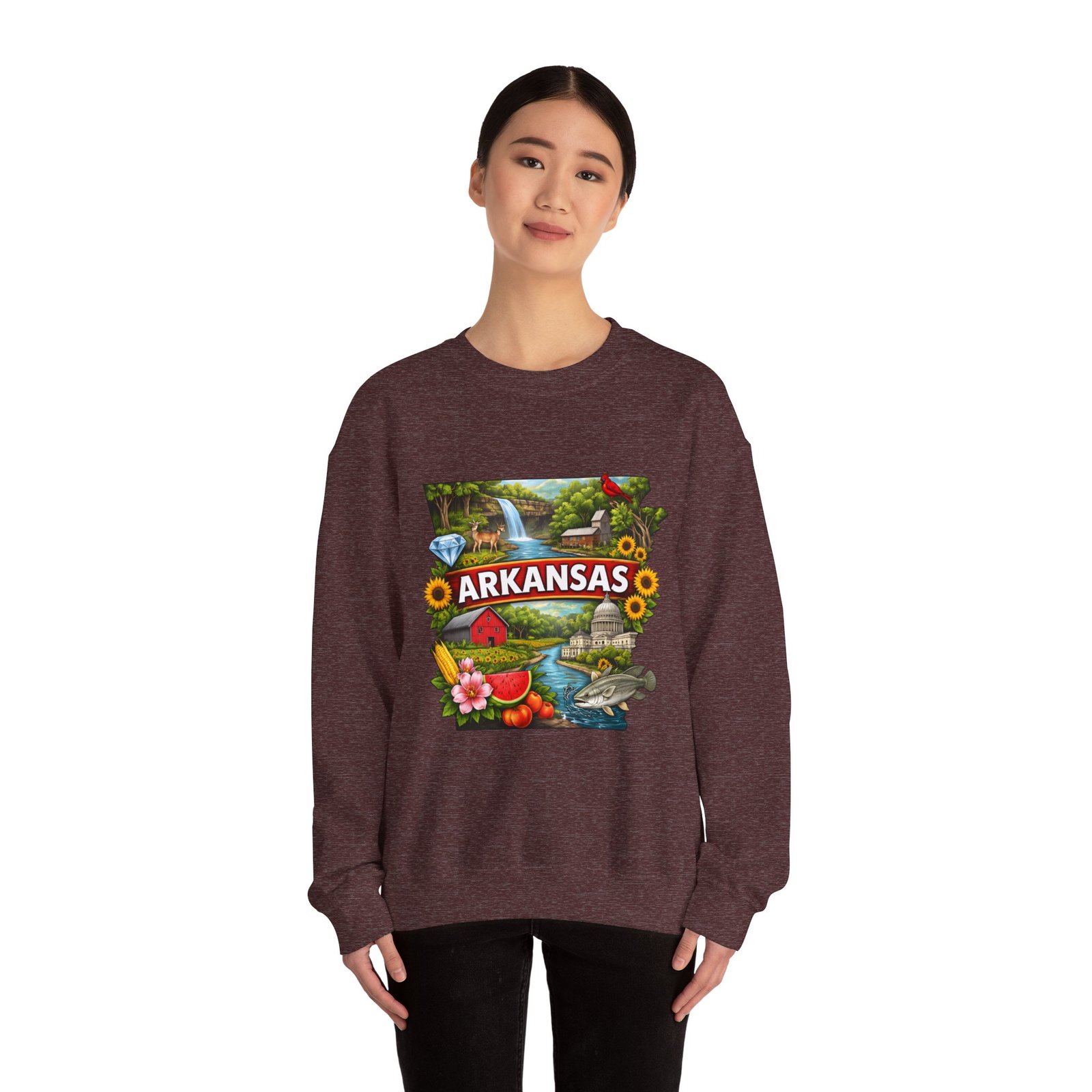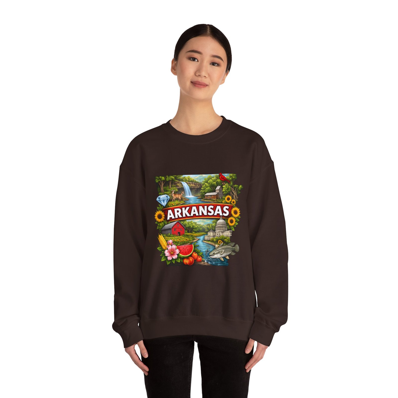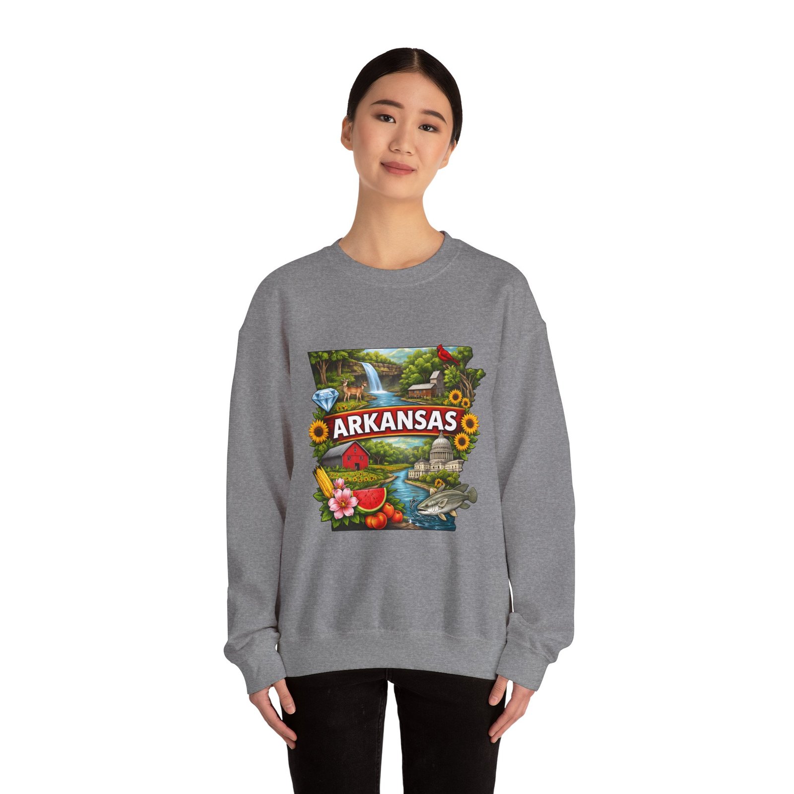 Soft, substantial, and quietly nostalgic — this crewneck brings Arkansas moments into everyday wear. A vibrant, layered print of state icons sits at the center chest: rolling hills and rivers, a cardinal perched among sunflowers, strawberries and juicy watermelon, and a leaping fish. The sweatshirt’s medium-heavy 50/50 cotton-poly blend feels warm without bulk. Tubular knit construction, ribbed collar, cuffs, and waistband hold their shape. Thoughtful details include double-needle stitching for long wear, DTF inner neck label for comfort, and OEKO-TEX certified dyes. Wear it on a cool morning drive through the Ozarks, to a local fair, or when you want to carry a little home with you wherever you go.