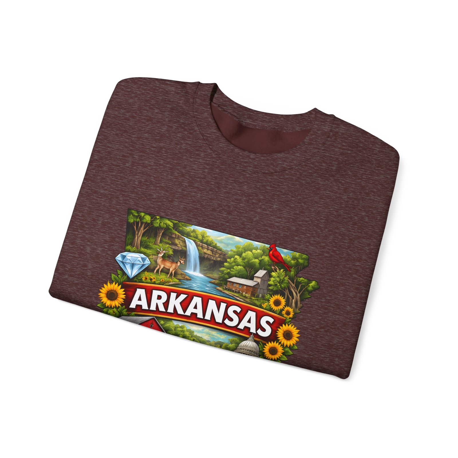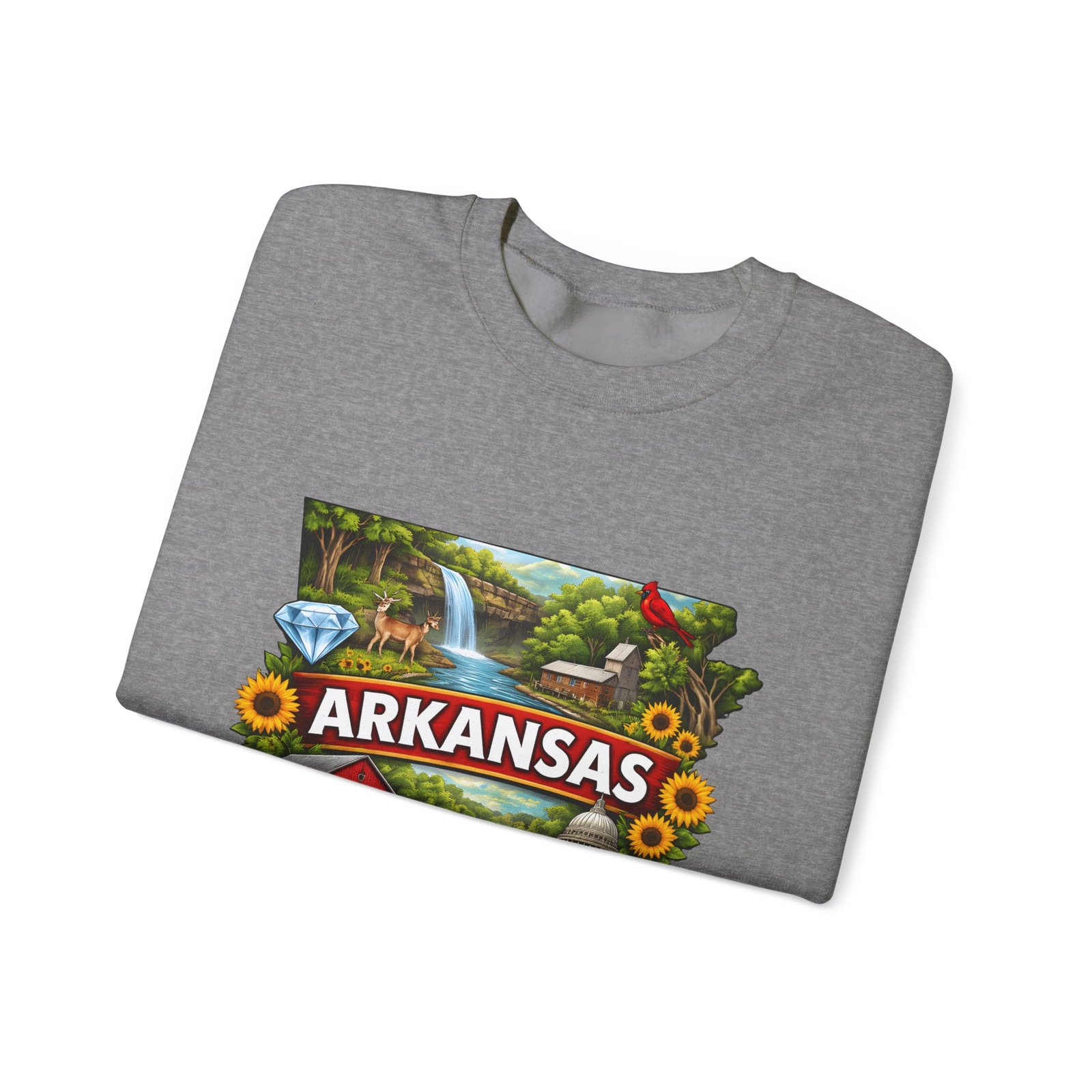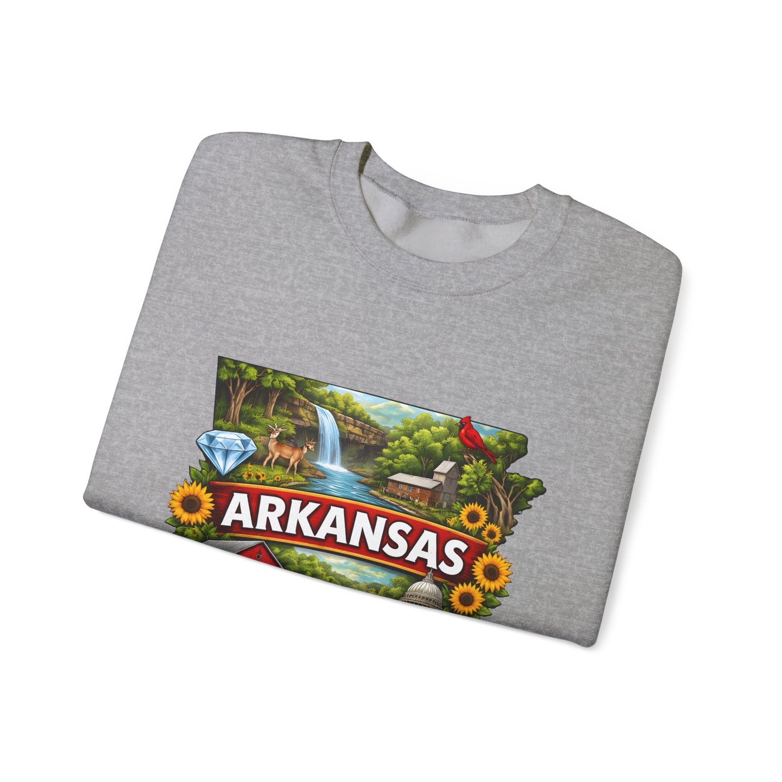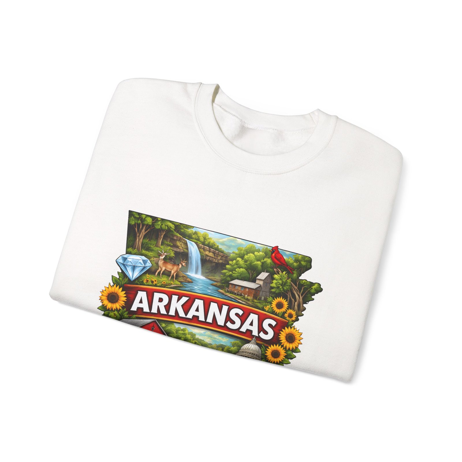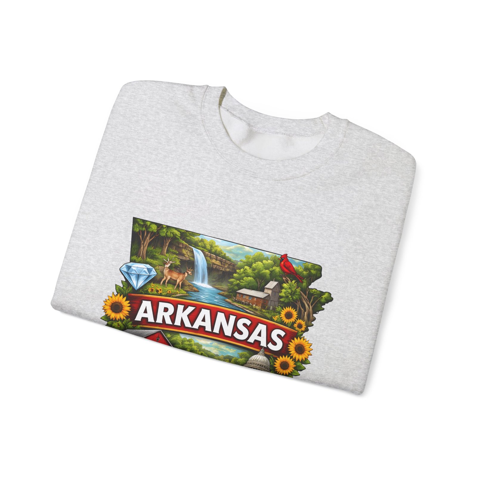 Soft, substantial, and quietly nostalgic — this crewneck brings Arkansas moments into everyday wear. A vibrant, layered print of state icons sits at the center chest: rolling hills and rivers, a cardinal perched among sunflowers, strawberries and juicy watermelon, and a leaping fish. The sweatshirt’s medium-heavy 50/50 cotton-poly blend feels warm without bulk. Tubular knit construction, ribbed collar, cuffs, and waistband hold their shape. Thoughtful details include double-needle stitching for long wear, DTF inner neck label for comfort, and OEKO-TEX certified dyes. Wear it on a cool morning drive through the Ozarks, to a local fair, or when you want to carry a little home with you wherever you go.