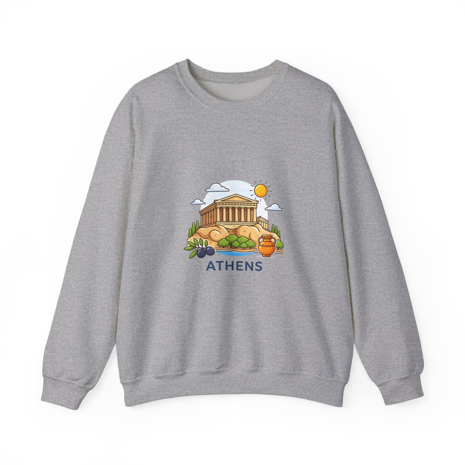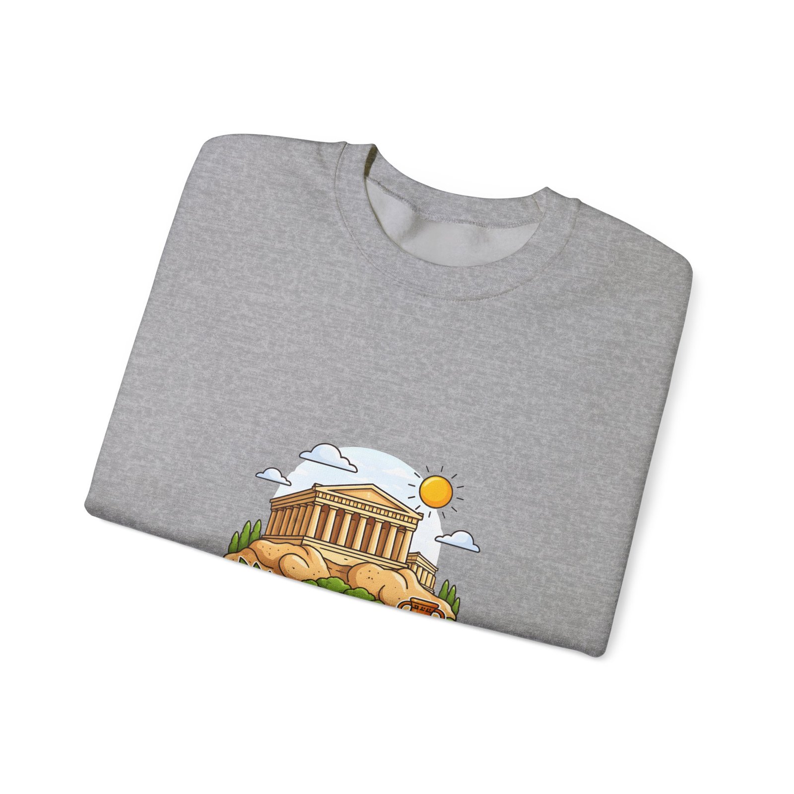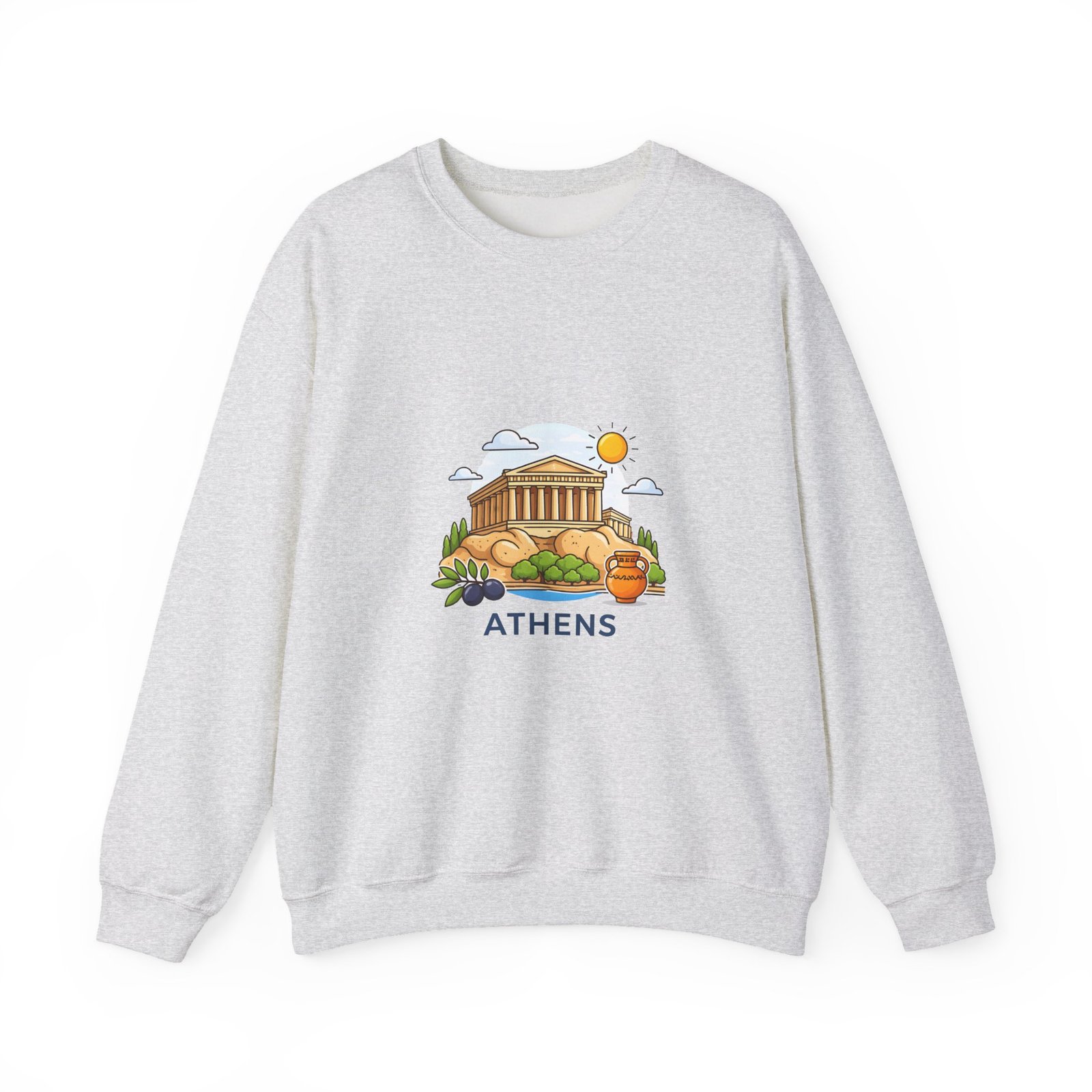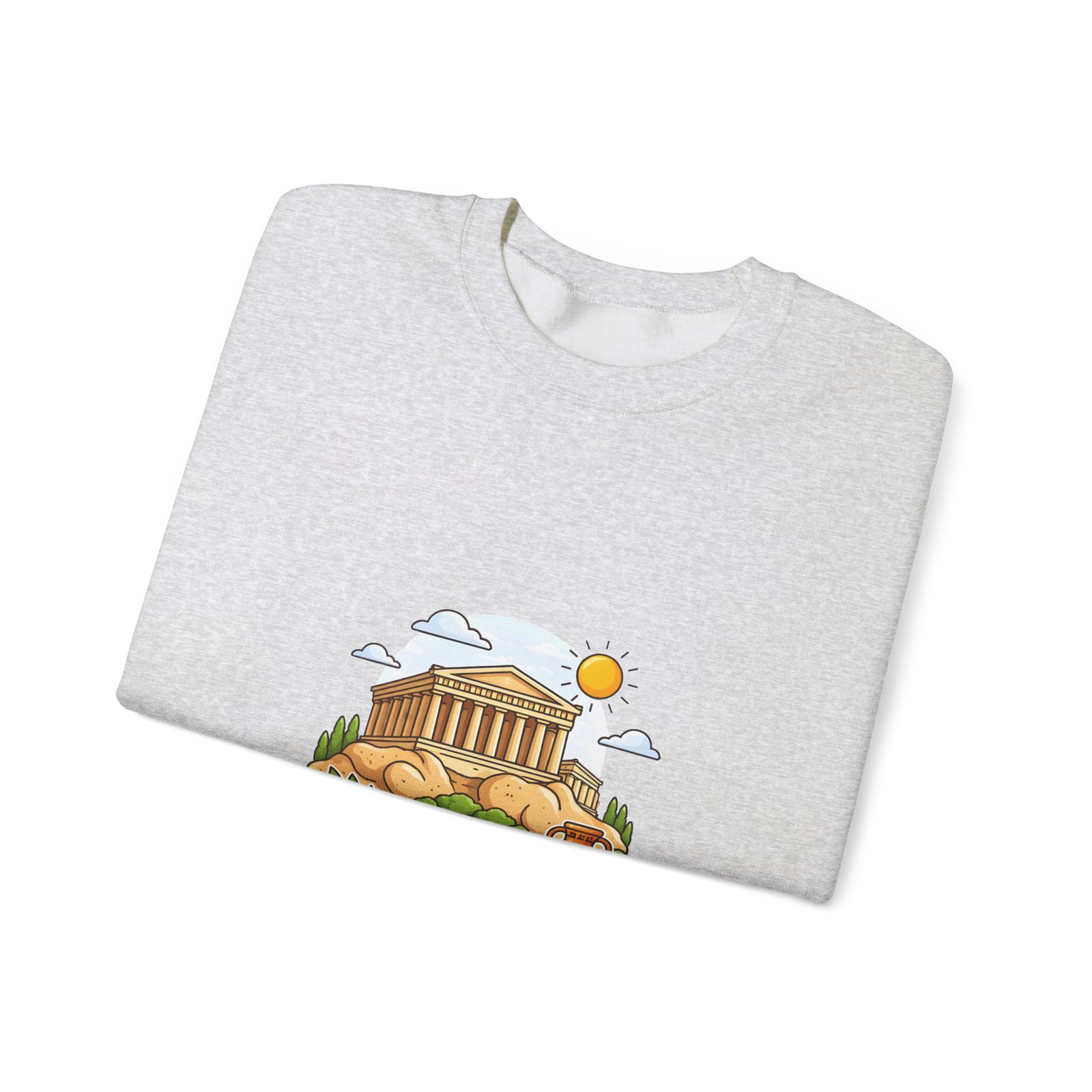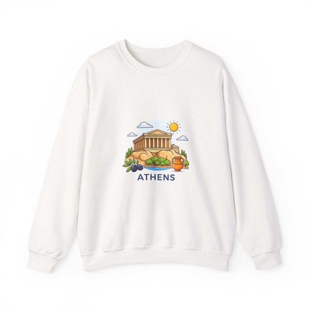 This soft, midweight crewneck brings a calm, sunlit corner of Athens into your everyday wardrobe. The clean white sweatshirt features an embroidered center-chest illustration of the Parthenon, olive branches, and a warm sun—small details that catch the eye and invite a quiet smile. It wears like a favorite: roomy through the body with a classic crew neckline, ribbed collar and cuffs that hold their shape, and double-needle stitching for long-lasting wear. Thoughtfully made with a 50/50 cotton-poly blend (heather sport colors vary), OEKO-TEX certified dyes, and ethically sourced US cotton, it’s built for comfortable travel days, museum strolls, or slow mornings with coffee and a map open on the table.