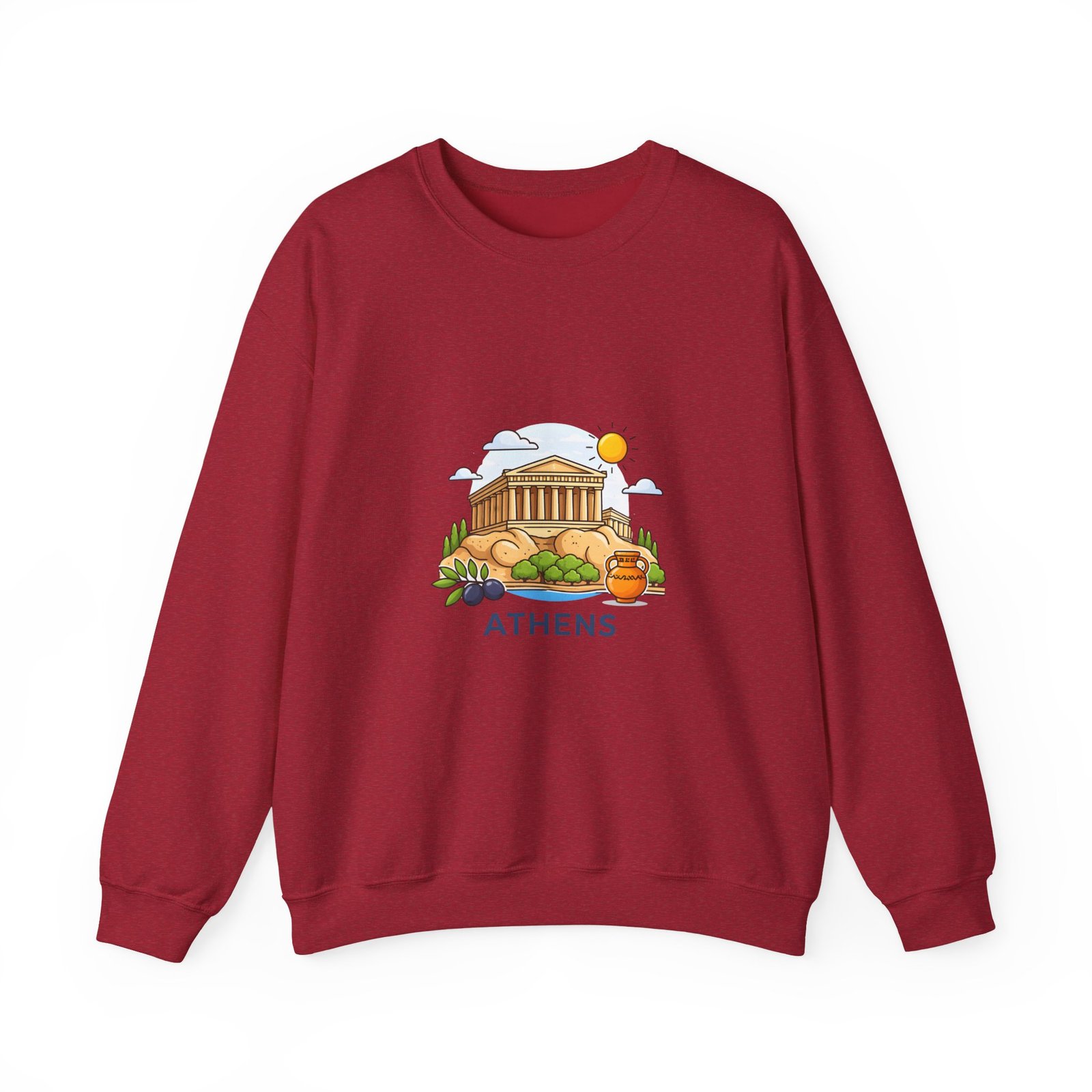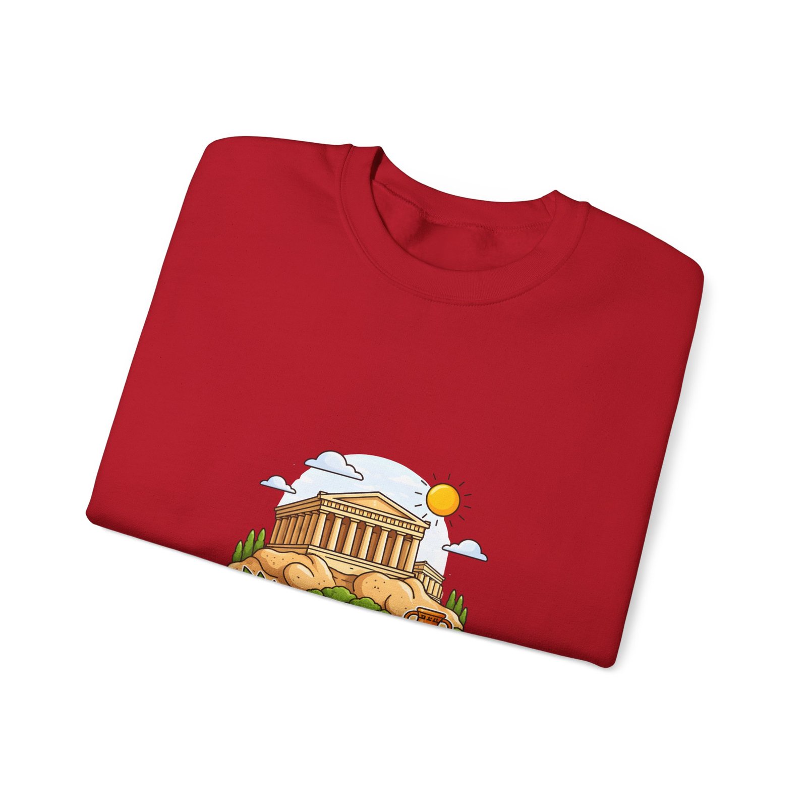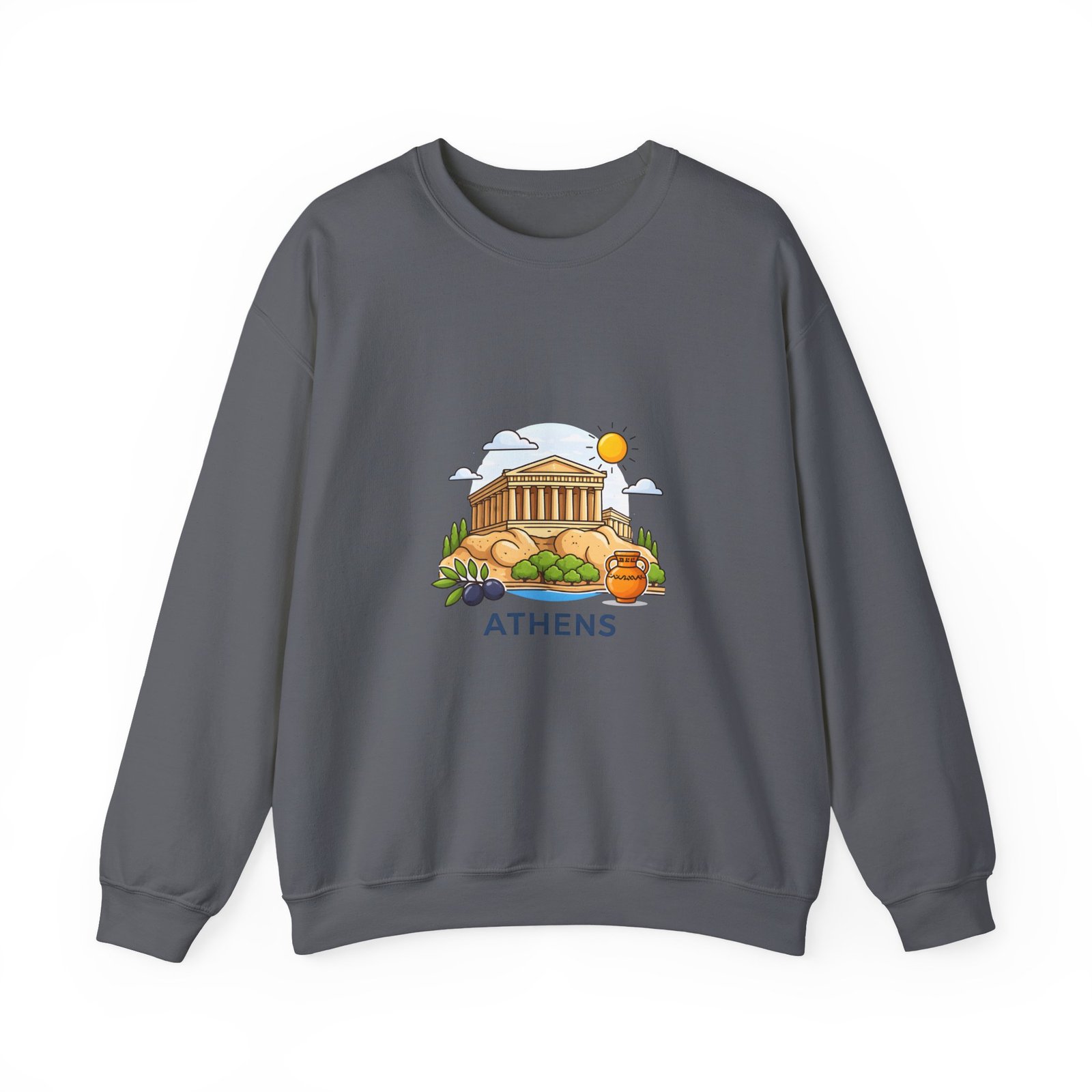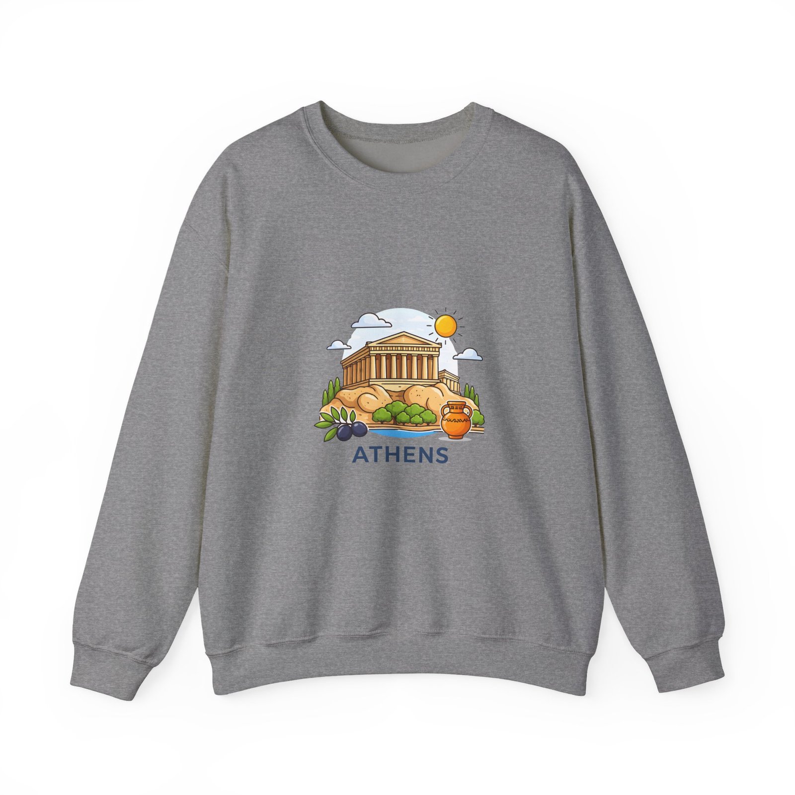 This soft, midweight crewneck brings a calm, sunlit corner of Athens into your everyday wardrobe. The clean white sweatshirt features an embroidered center-chest illustration of the Parthenon, olive branches, and a warm sun—small details that catch the eye and invite a quiet smile. It wears like a favorite: roomy through the body with a classic crew neckline, ribbed collar and cuffs that hold their shape, and double-needle stitching for long-lasting wear. Thoughtfully made with a 50/50 cotton-poly blend (heather sport colors vary), OEKO-TEX certified dyes, and ethically sourced US cotton, it’s built for comfortable travel days, museum strolls, or slow mornings with coffee and a map open on the table.