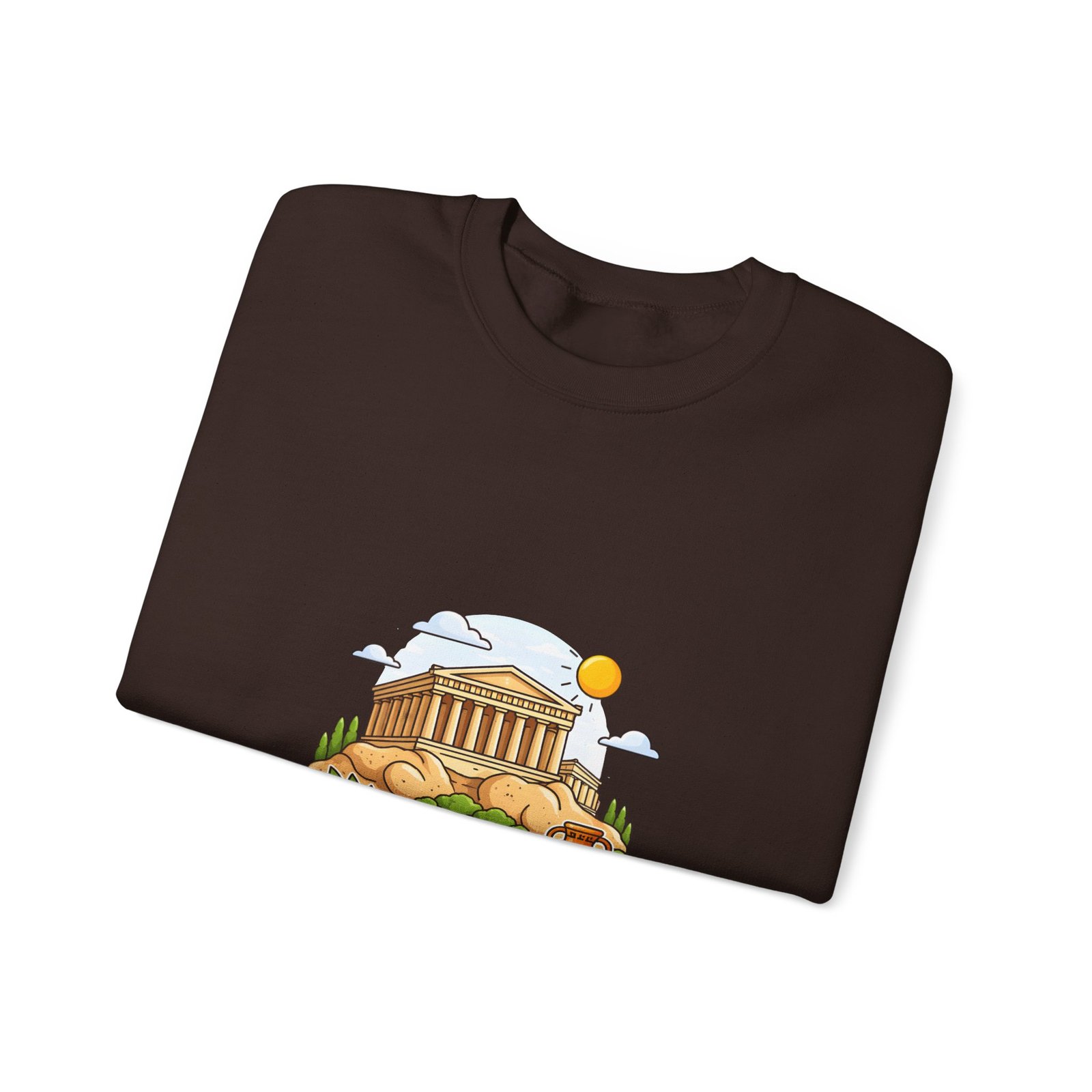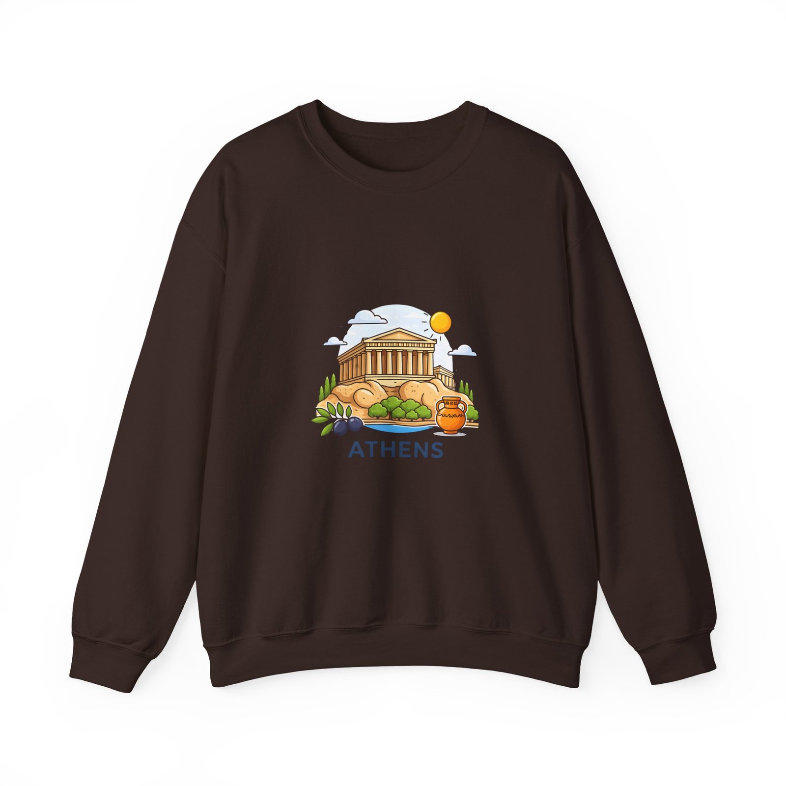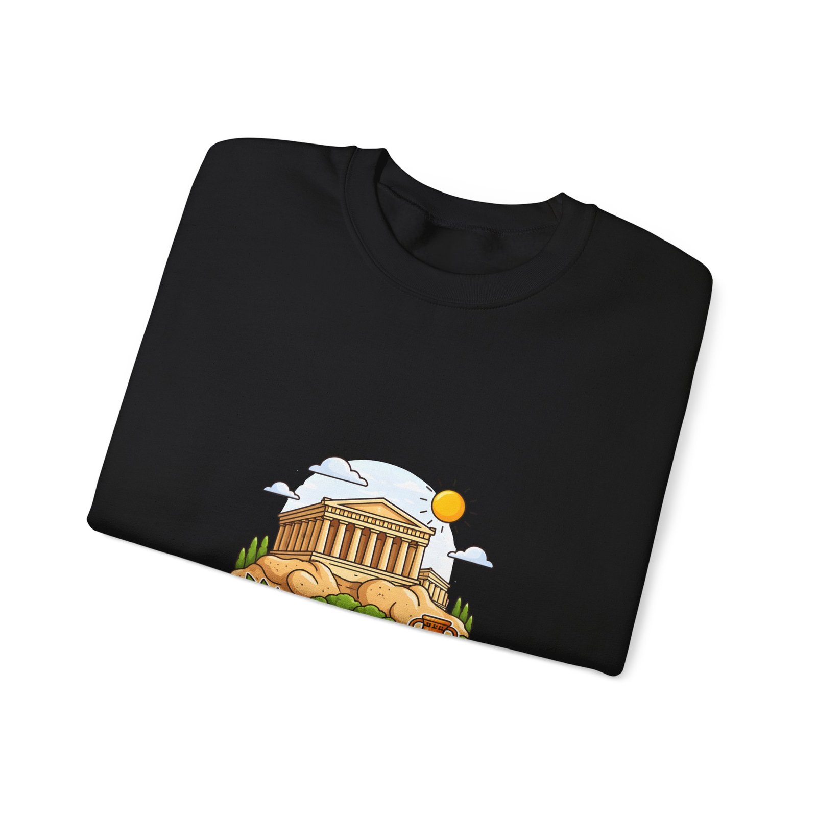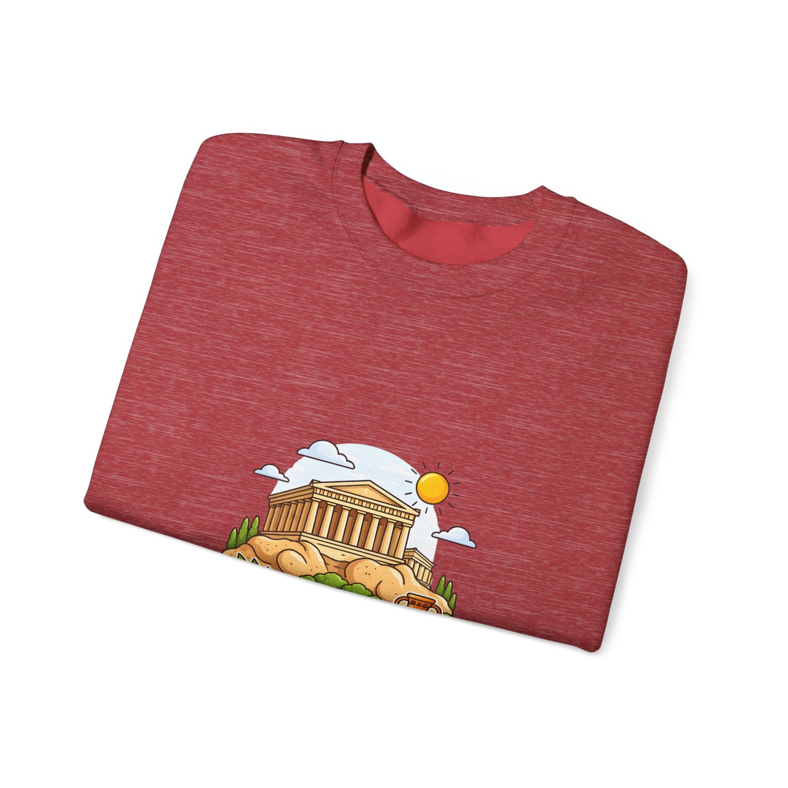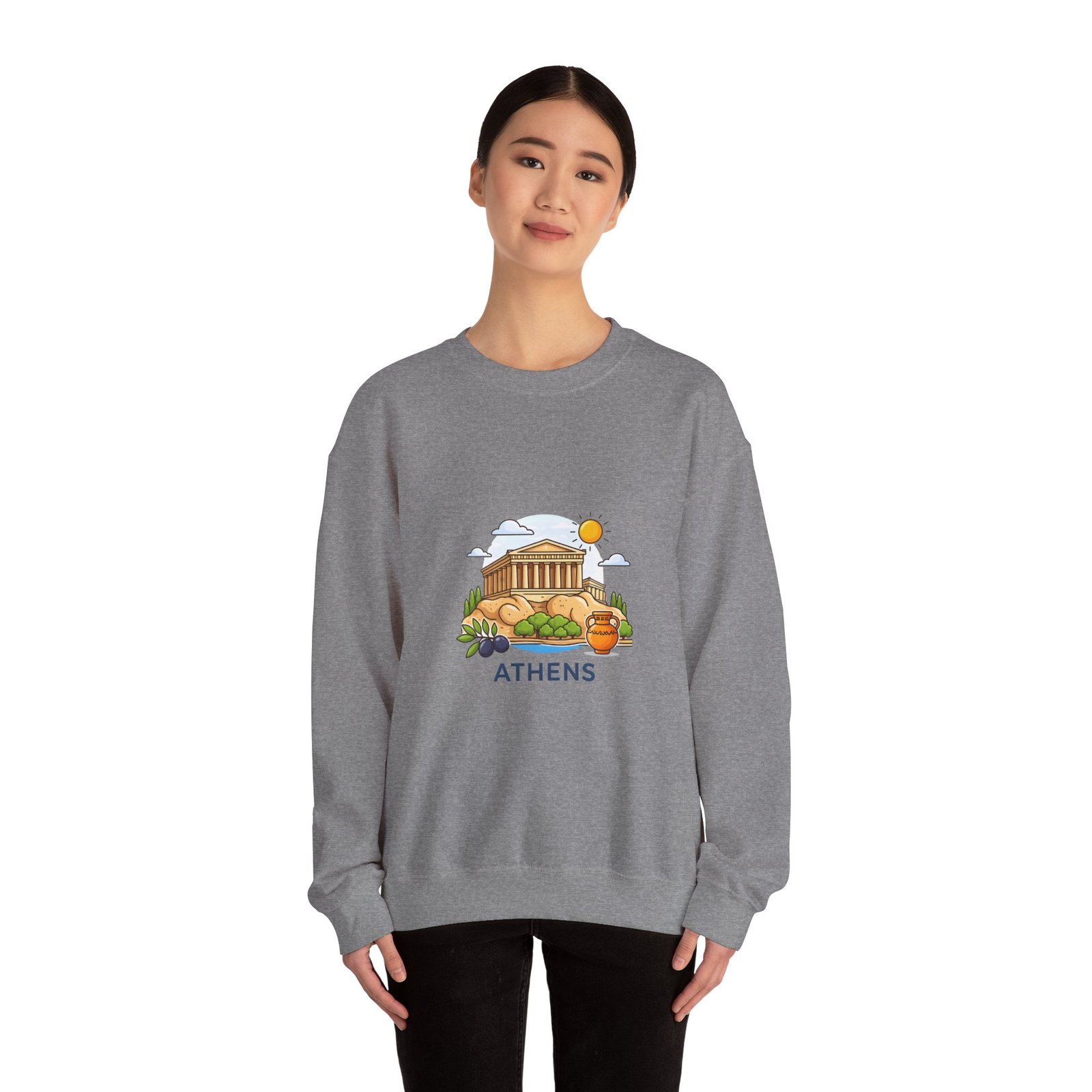 This soft, midweight crewneck brings a calm, sunlit corner of Athens into your everyday wardrobe. The clean white sweatshirt features an embroidered center-chest illustration of the Parthenon, olive branches, and a warm sun—small details that catch the eye and invite a quiet smile. It wears like a favorite: roomy through the body with a classic crew neckline, ribbed collar and cuffs that hold their shape, and double-needle stitching for long-lasting wear. Thoughtfully made with a 50/50 cotton-poly blend (heather sport colors vary), OEKO-TEX certified dyes, and ethically sourced US cotton, it’s built for comfortable travel days, museum strolls, or slow mornings with coffee and a map open on the table.