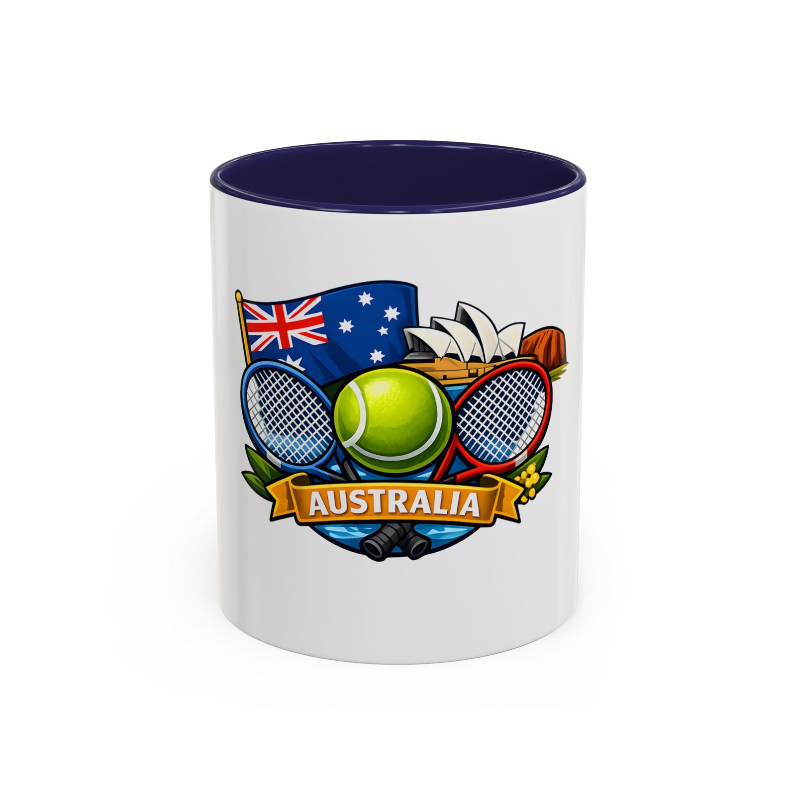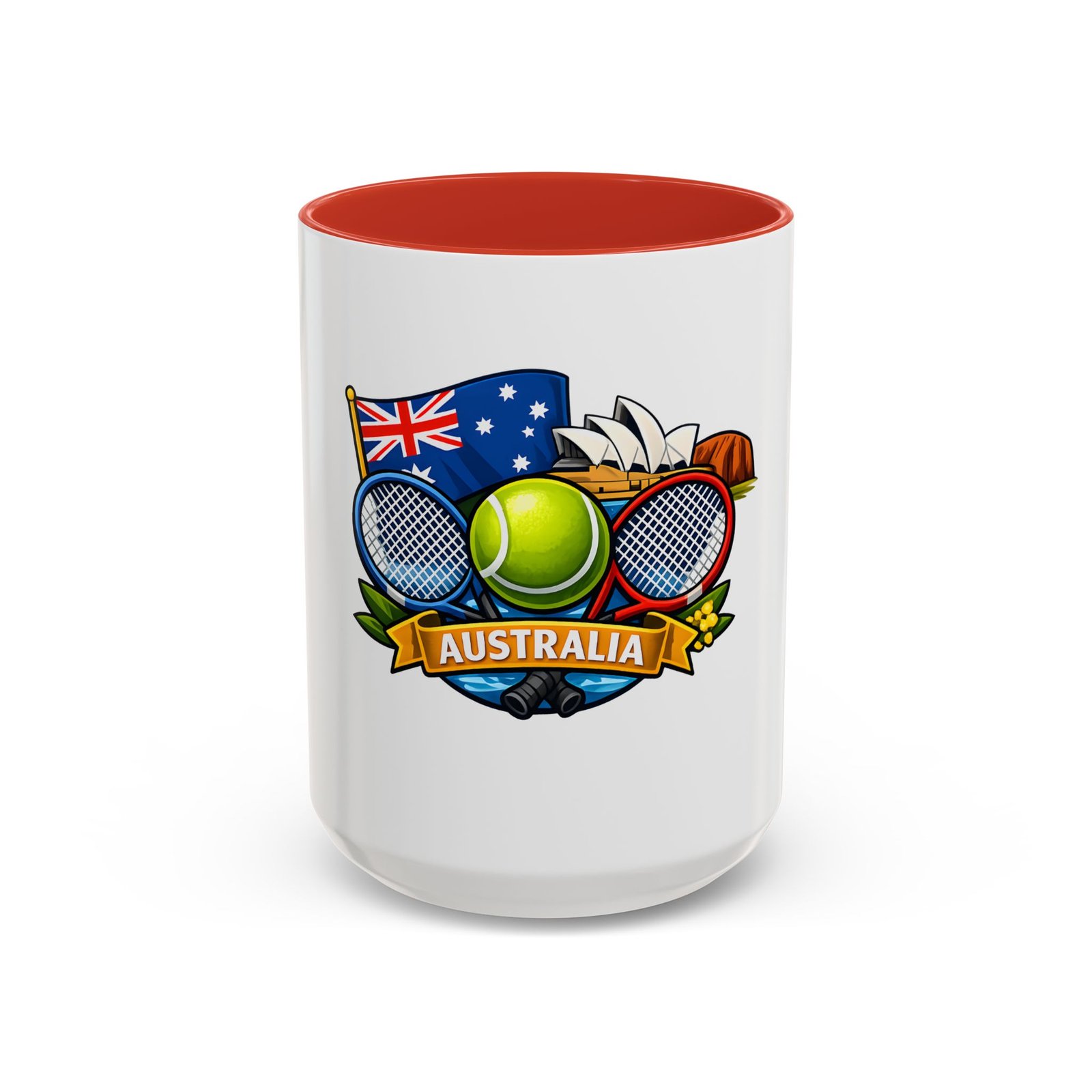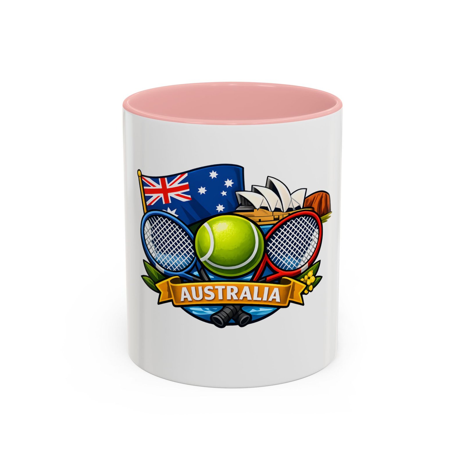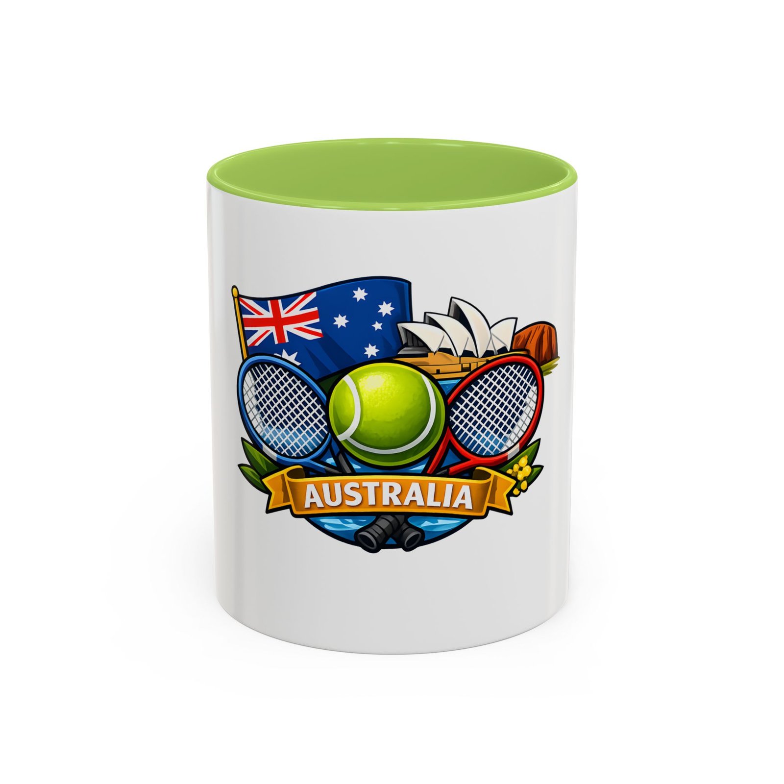 This ceramic accent mug brings a lively slice of Australia to your morning routine. Bold colors and a glossy finish showcase a playful crest—tennis racquets, a bright tennis ball, the Australian flag and a hint of the Opera House—so every sip feels like a small celebration of sport and place. The colored interior and handle add cheerful contrast while the sturdy C-handle and two size options let you choose your comfort level. Dishwasher- and microwave-safe, it’s built for everyday use and made without lead or BPA, so it stays vibrant through daily washes and quick reheats.