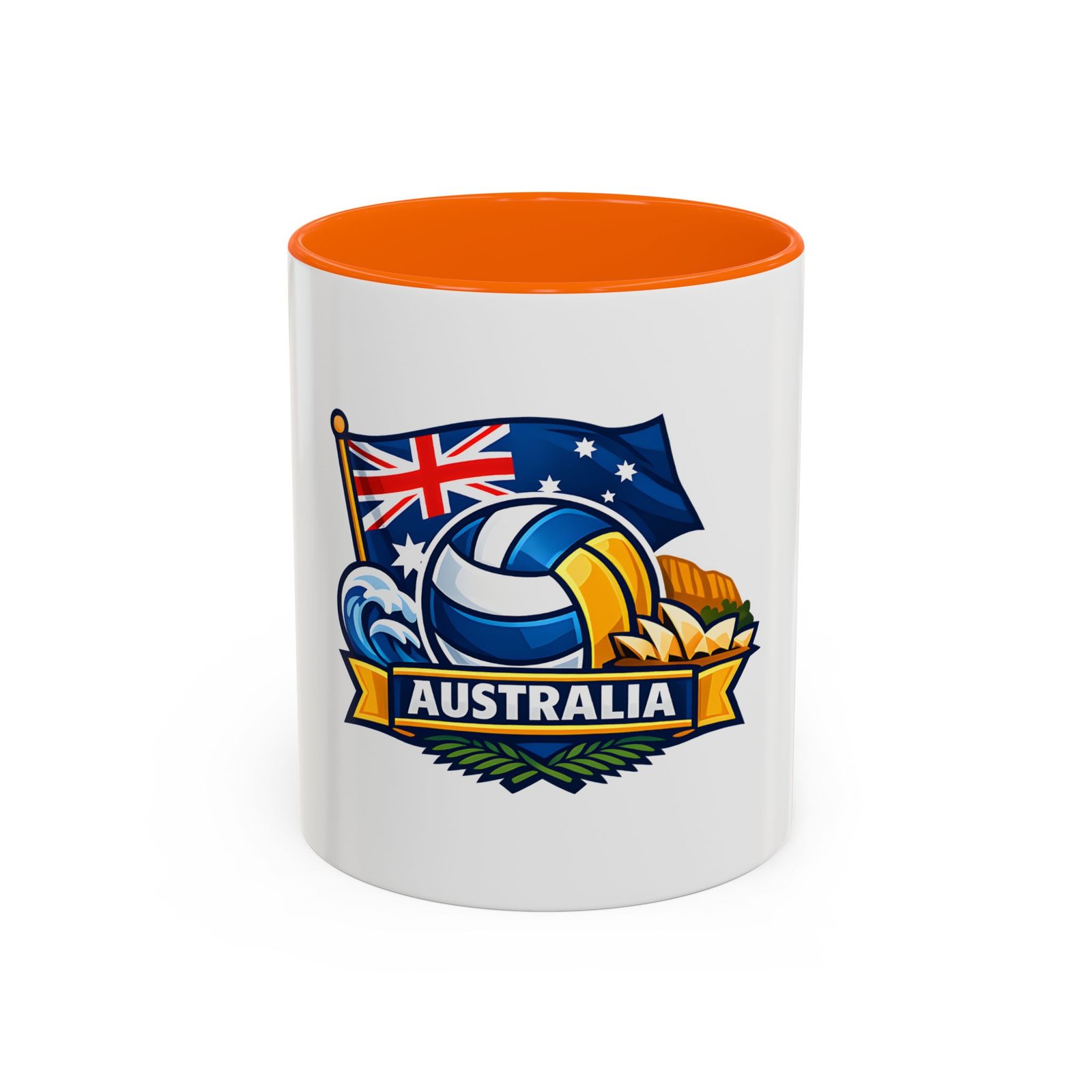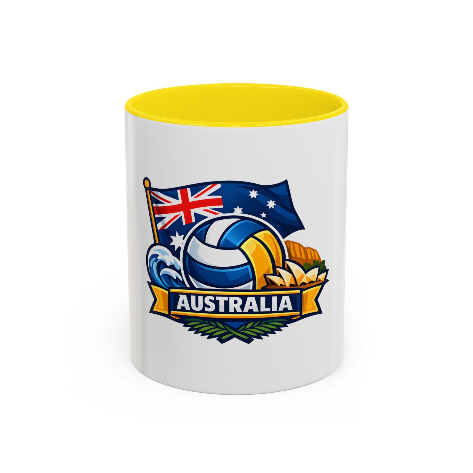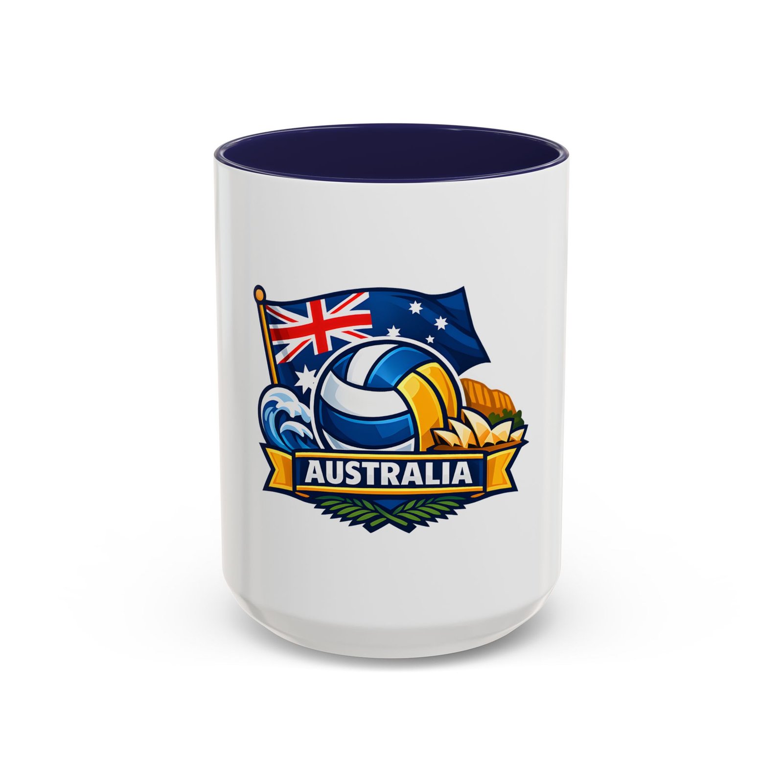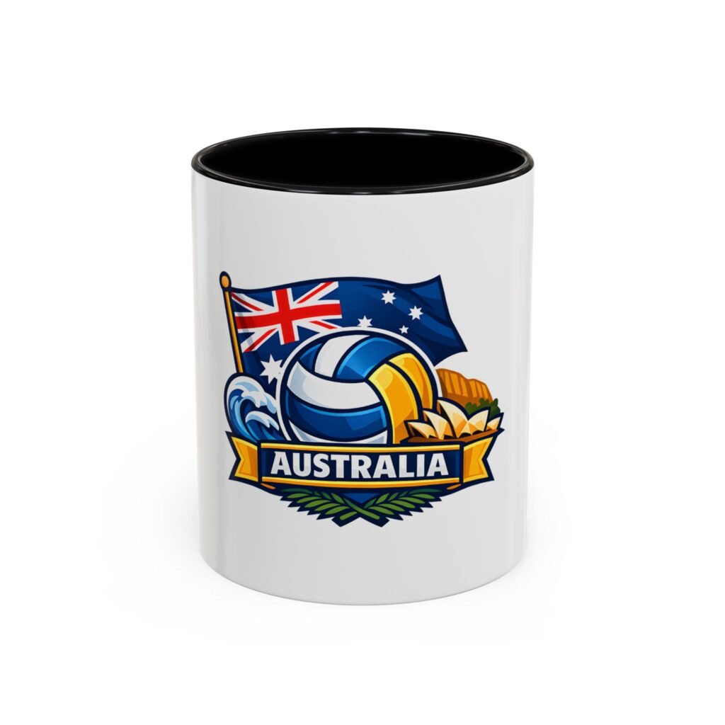 Celebrate the spirit of Aussie volleyball with a bright, proudly styled ceramic mug. The bold emblem—volleyballs, ocean waves, golden sunbeams and the Australian flag—wraps around a glossy white canvas, while the contrasting black interior and handle give it a sporty, modern edge. Sip your morning coffee or post-practice tea and feel connected to coastal courts, early-morning training, and the shared rush after a tight set. This mug sits naturally in the hands of players, coaches, and devoted fans who live for the serve, the sand, and the roar of the crowd. It’s the kind of everyday object that sparks quick smiles, team chatter, and memories of sunlit matches.