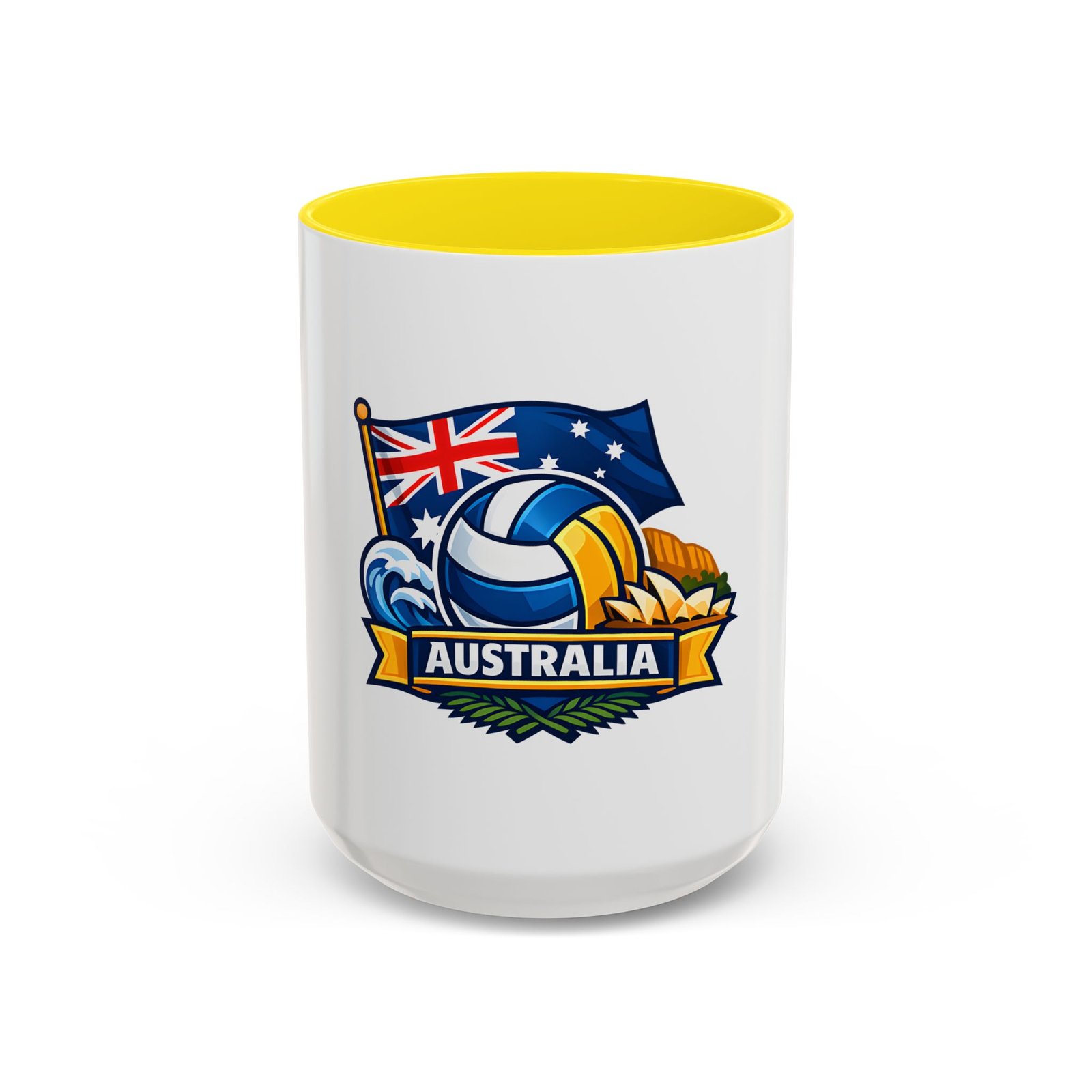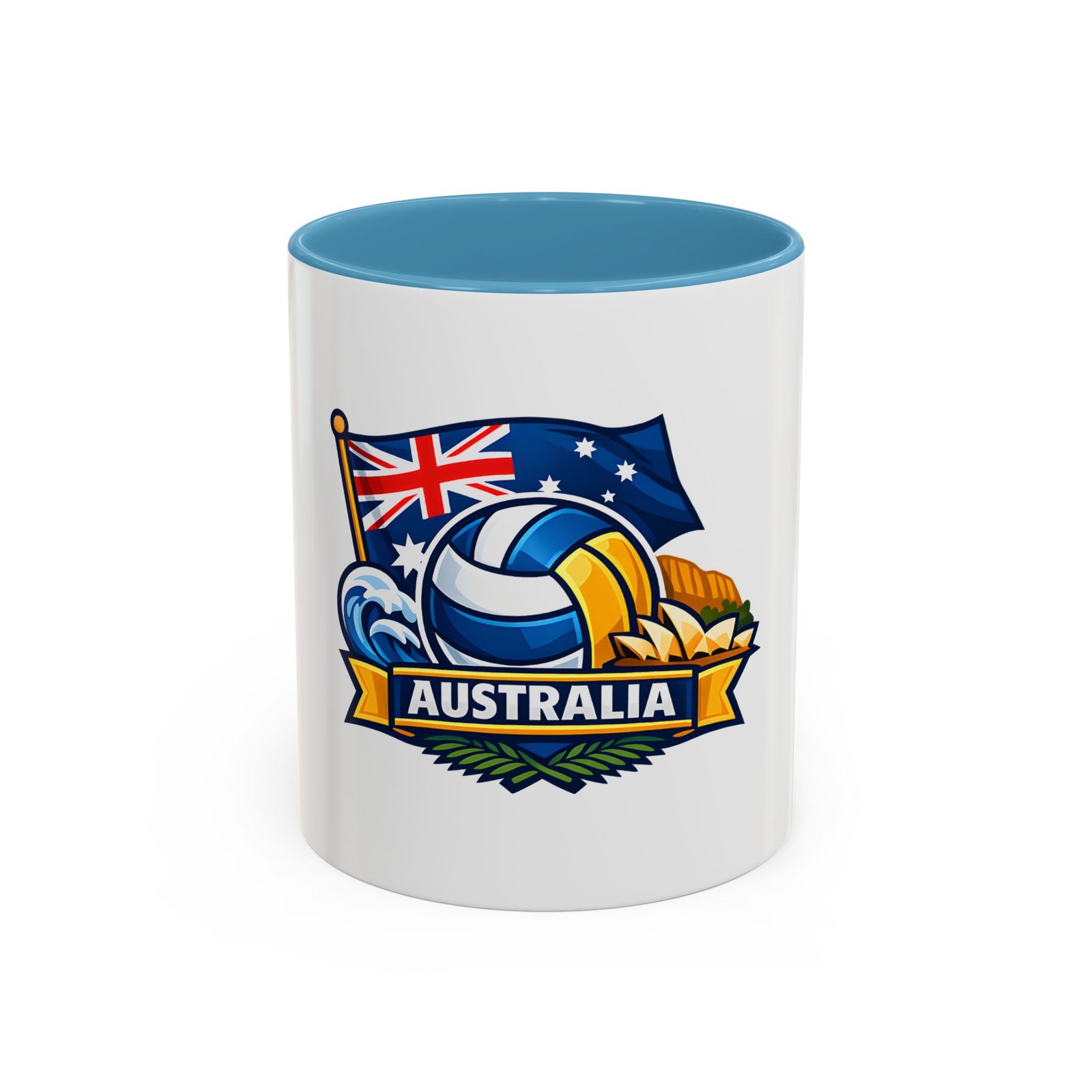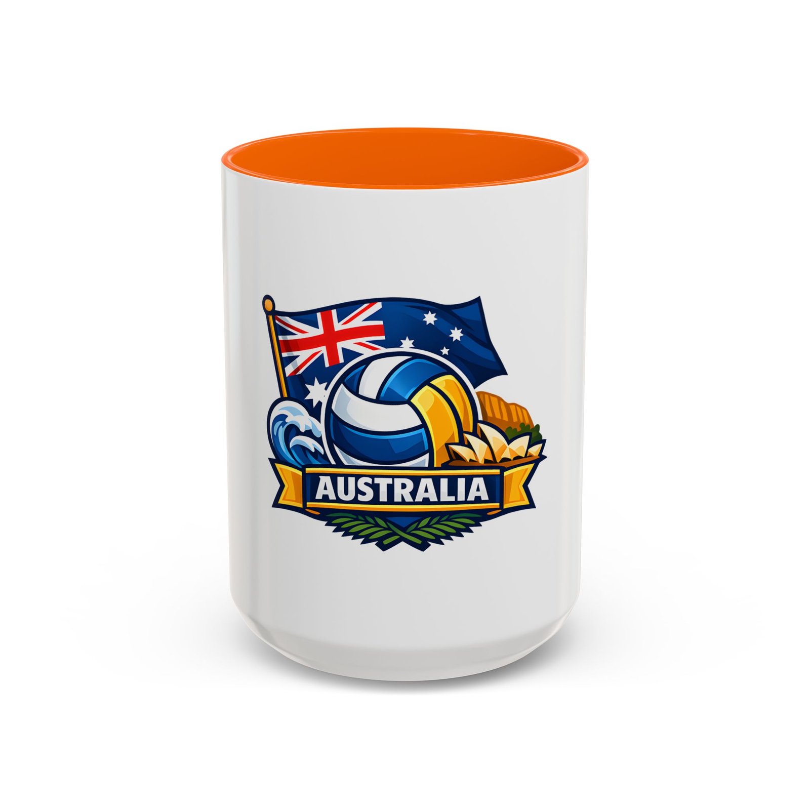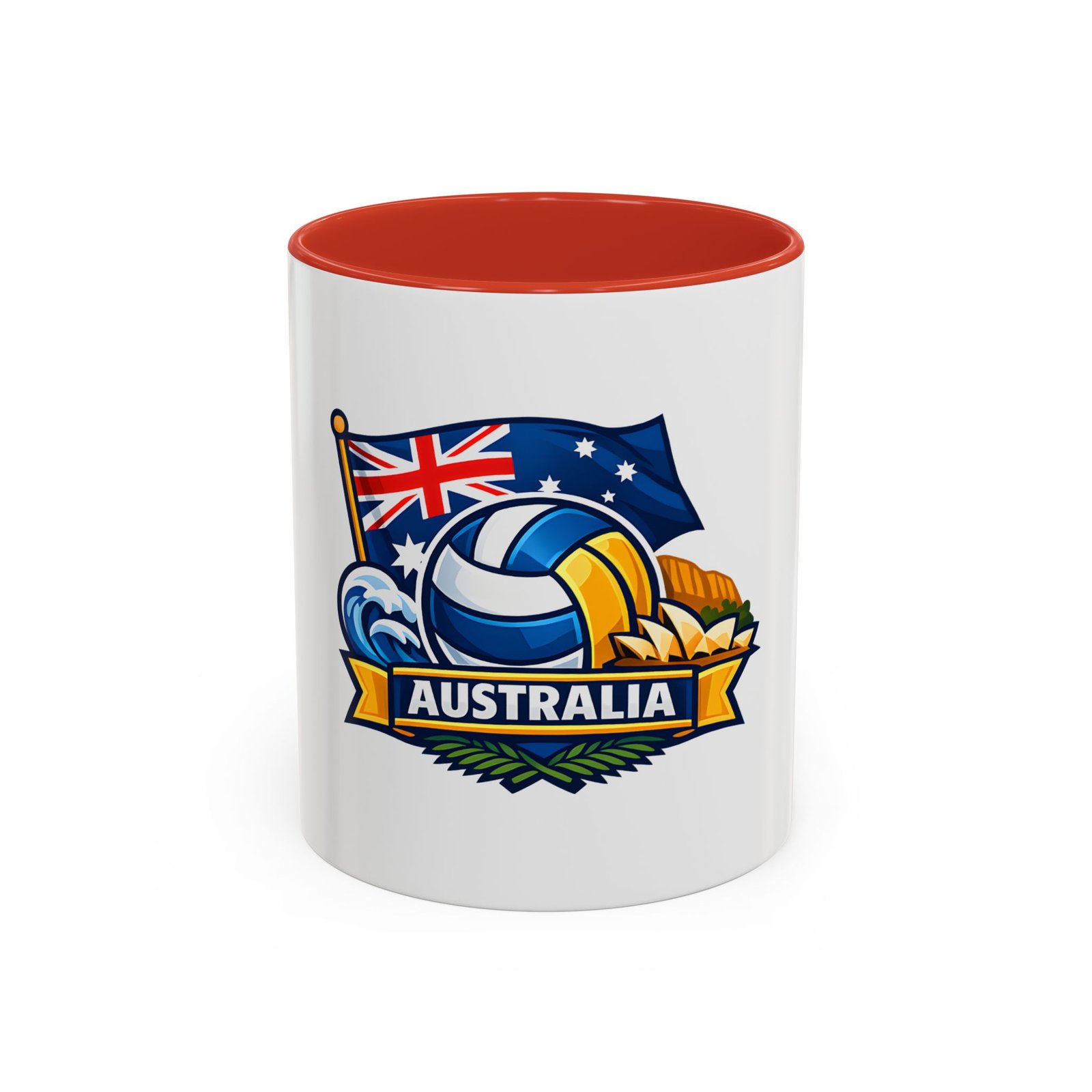 Celebrate the spirit of Aussie volleyball with a bright, proudly styled ceramic mug. The bold emblem—volleyballs, ocean waves, golden sunbeams and the Australian flag—wraps around a glossy white canvas, while the contrasting black interior and handle give it a sporty, modern edge. Sip your morning coffee or post-practice tea and feel connected to coastal courts, early-morning training, and the shared rush after a tight set. This mug sits naturally in the hands of players, coaches, and devoted fans who live for the serve, the sand, and the roar of the crowd. It’s the kind of everyday object that sparks quick smiles, team chatter, and memories of sunlit matches.