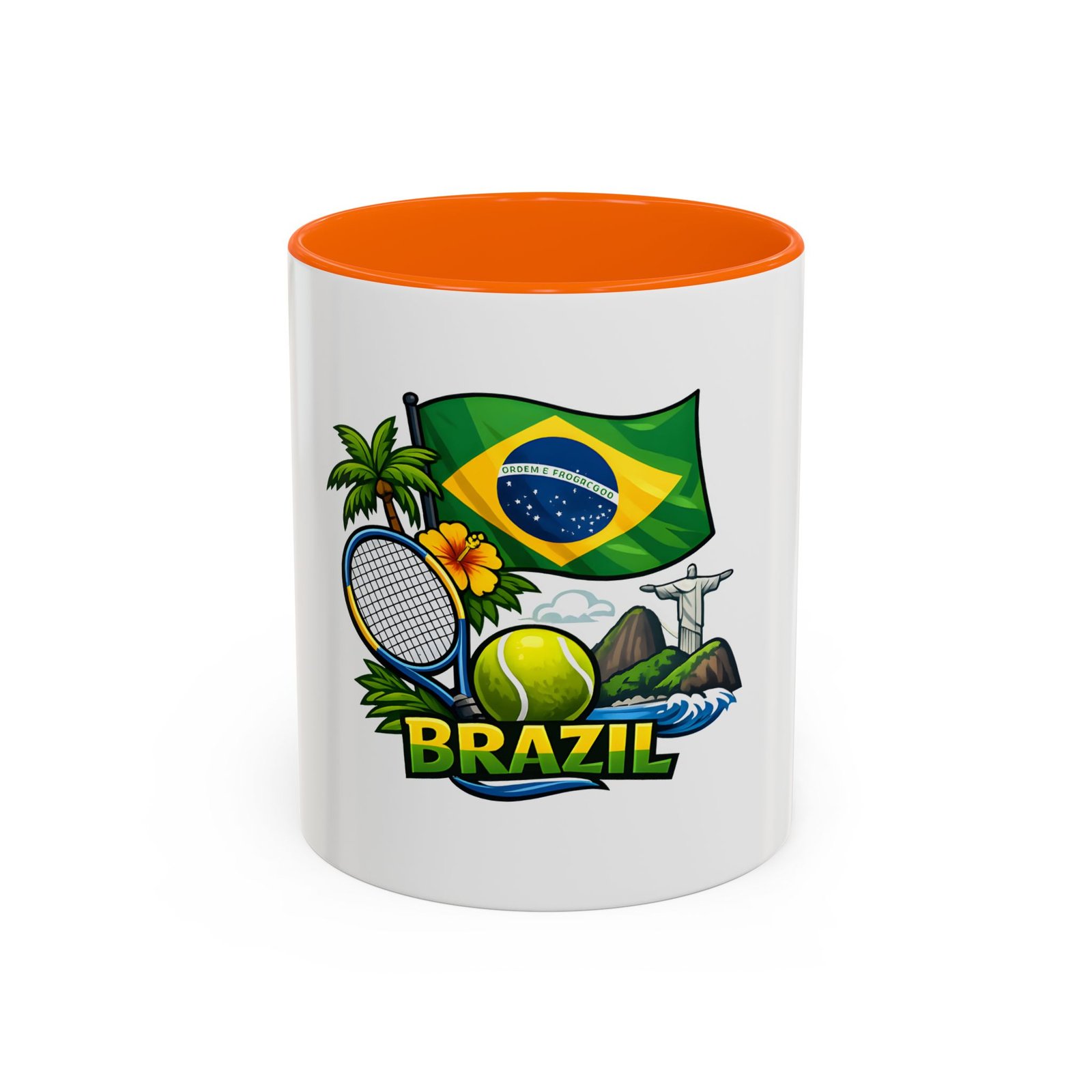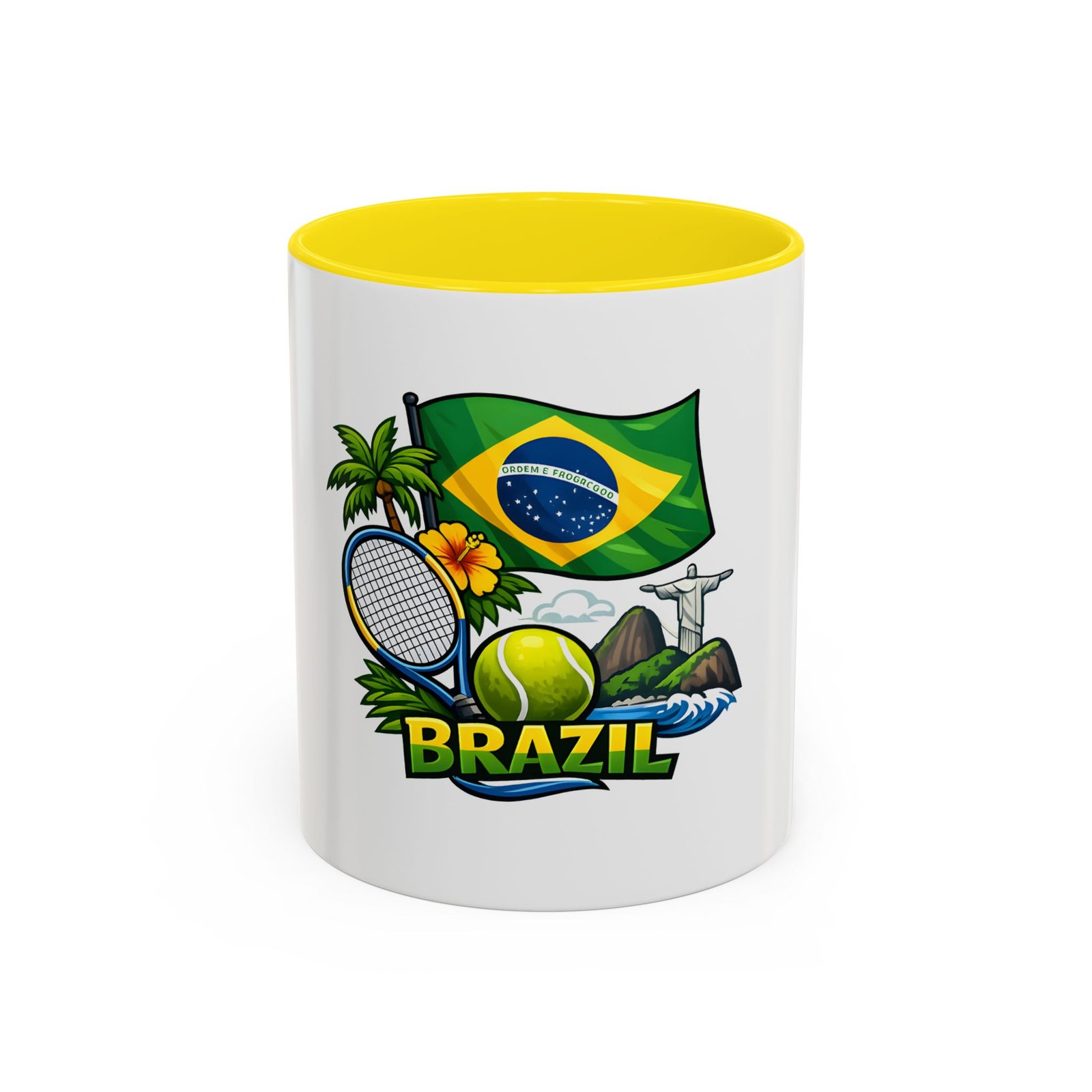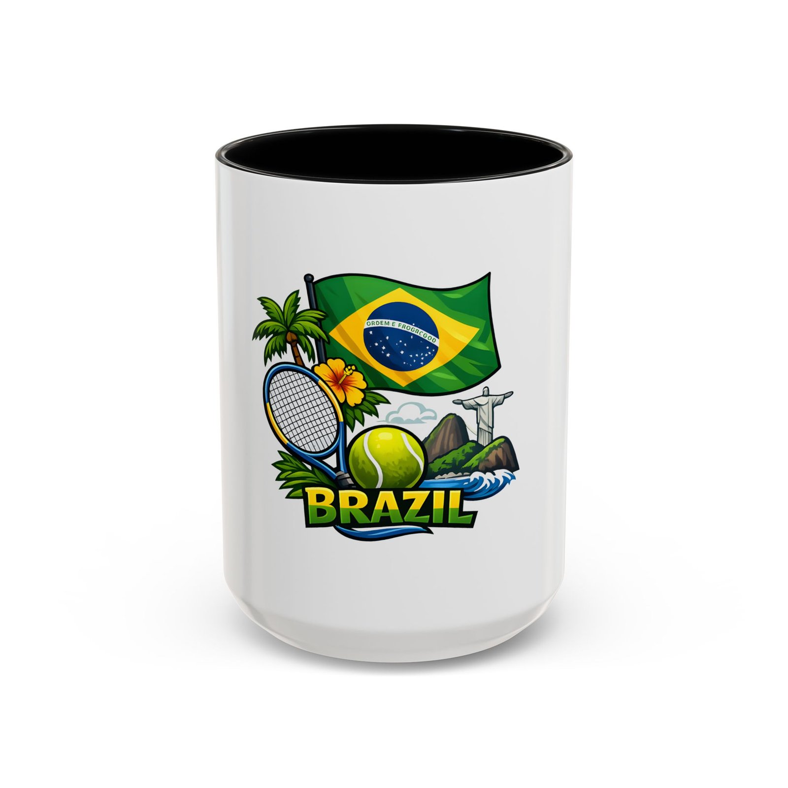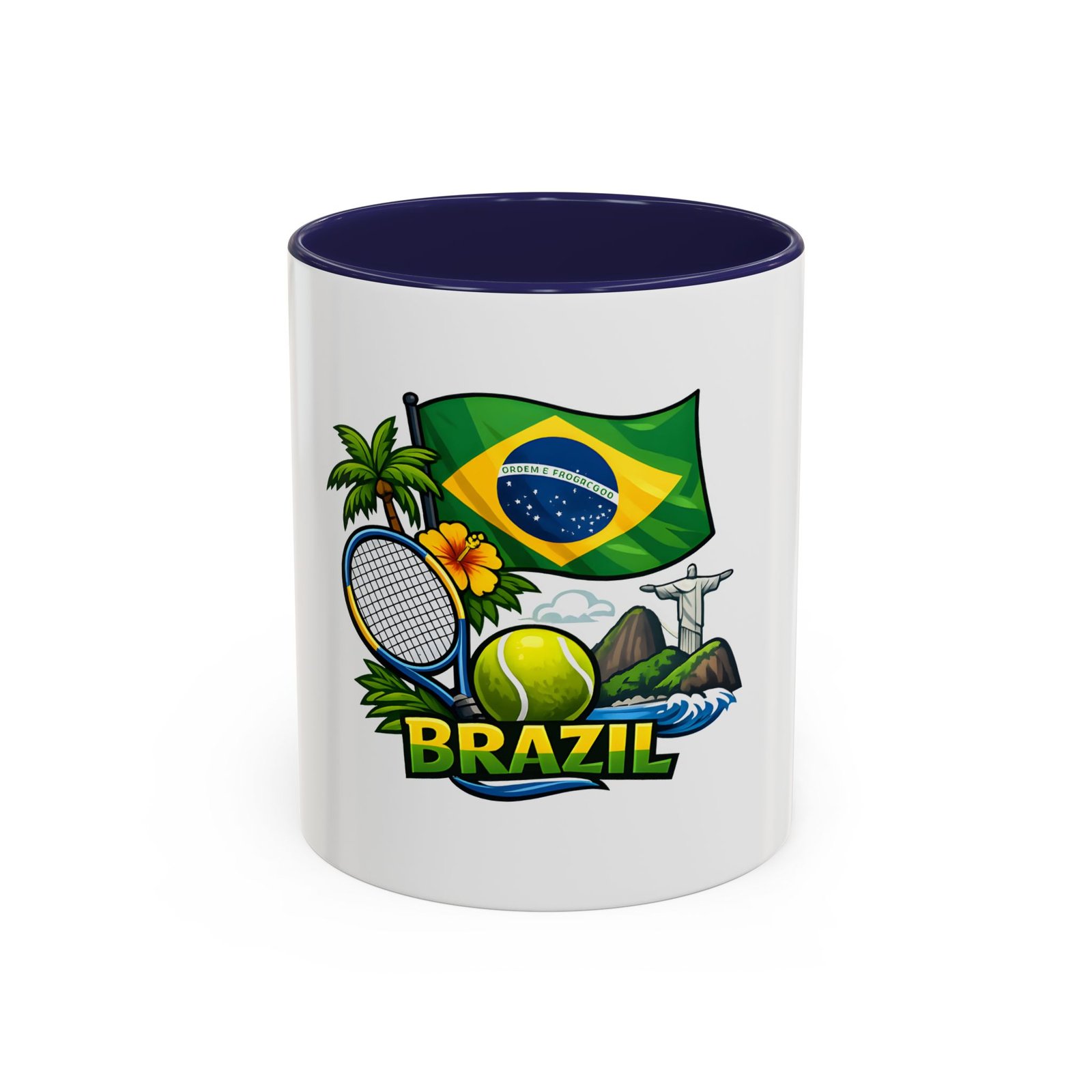 Morning light, strong coffee, and the hum of anticipation — this ceramic mug brings a little Brazil to your daily ritual. Color-rich printing showcases the Brazilian flag, a tennis racket and ball, tropical palms, hibiscus, and the silhouette of Christ the Redeemer, all framed by vivid contrast between the white exterior and the colored interior and handle. It feels lively in your hands and lively on the table, whether you’re sipping before a match, celebrating a win, or reminiscing about sunlit courts and coastal breezes. The glossy finish and bold colors keep the design bright through regular use, and the comfortable C-shaped handle fits naturally whether you reach for an espresso shot or a long, leisurely pour-over.