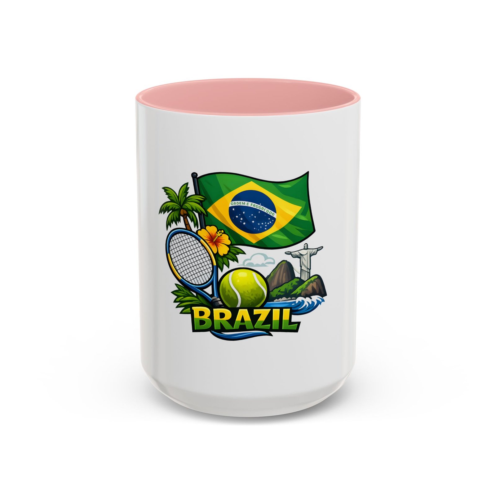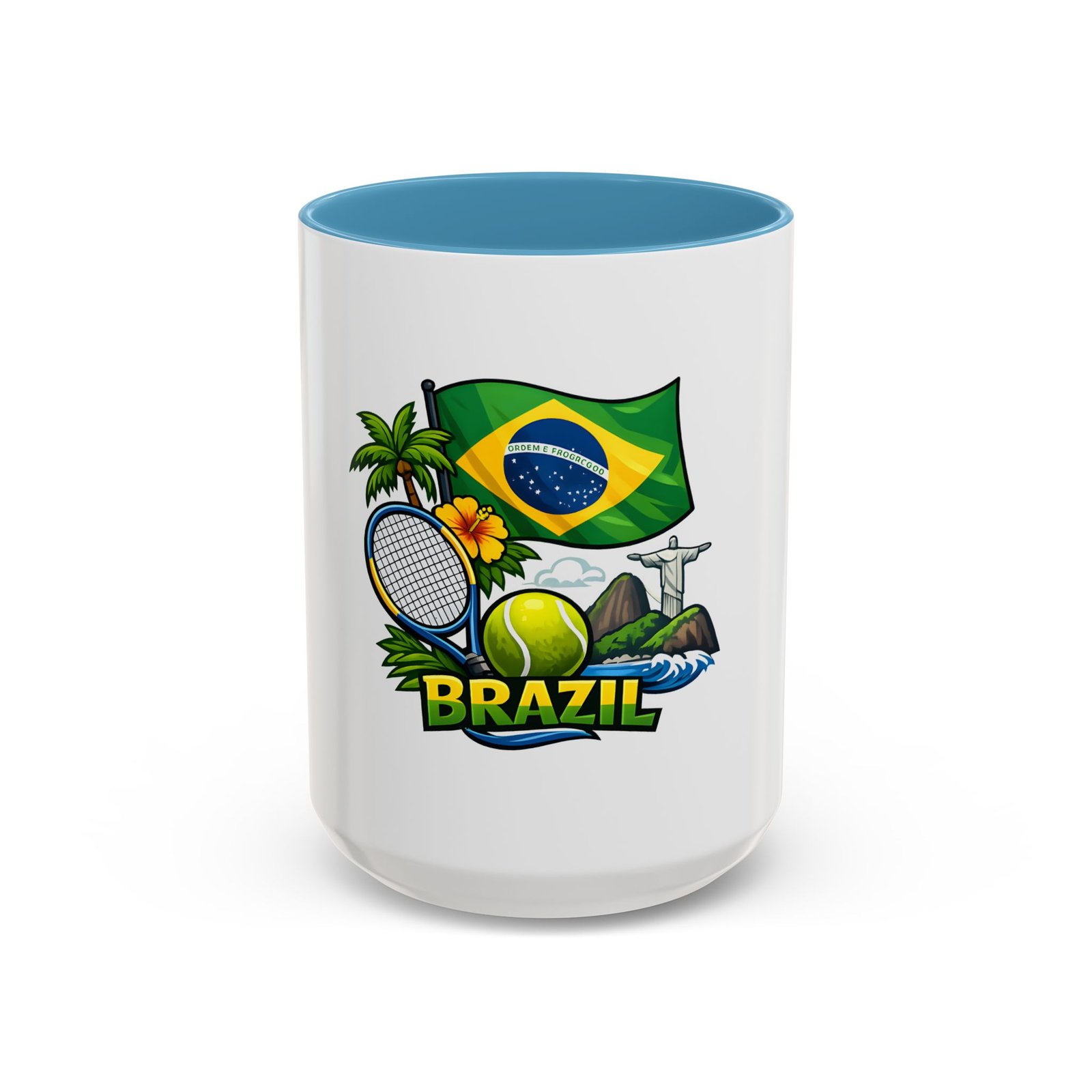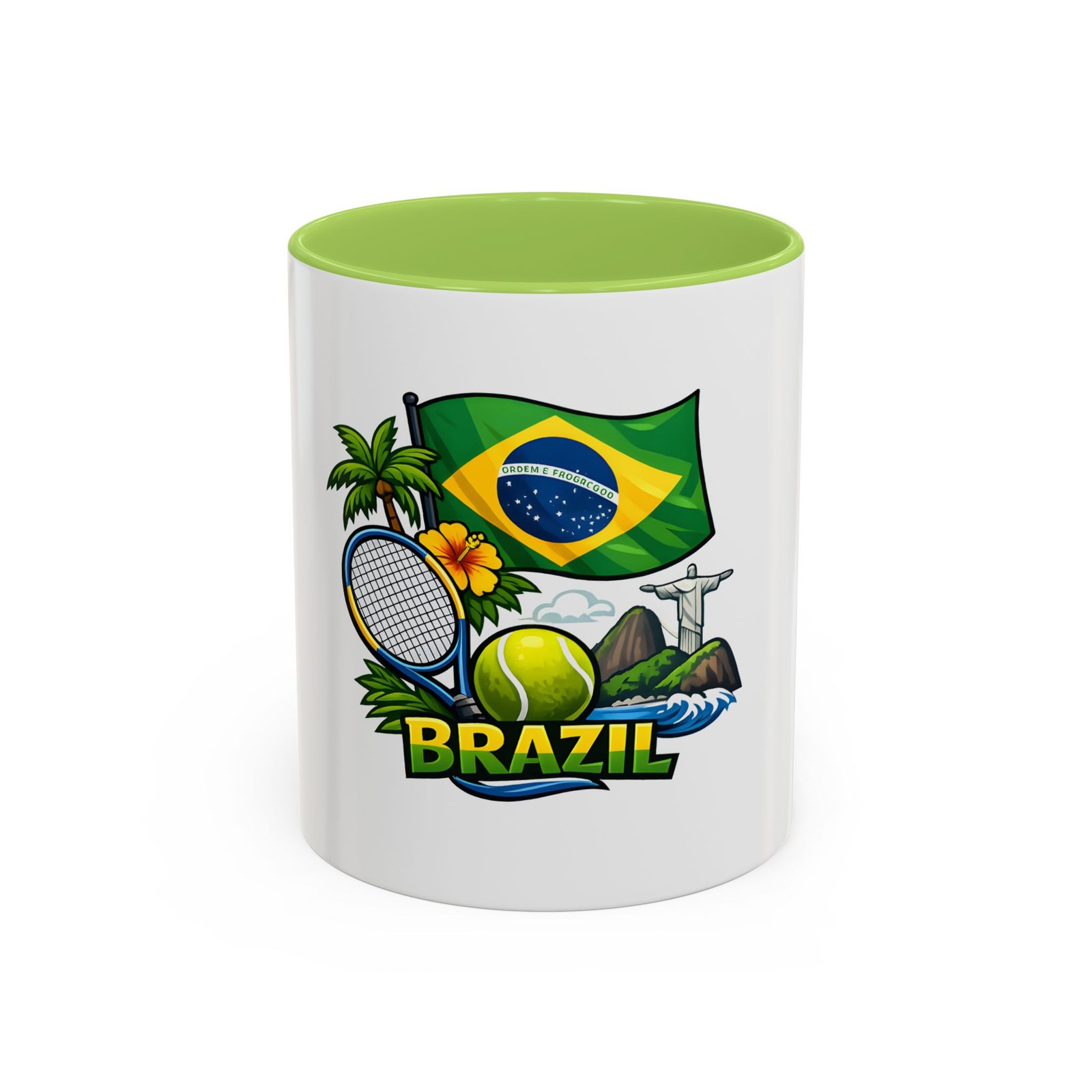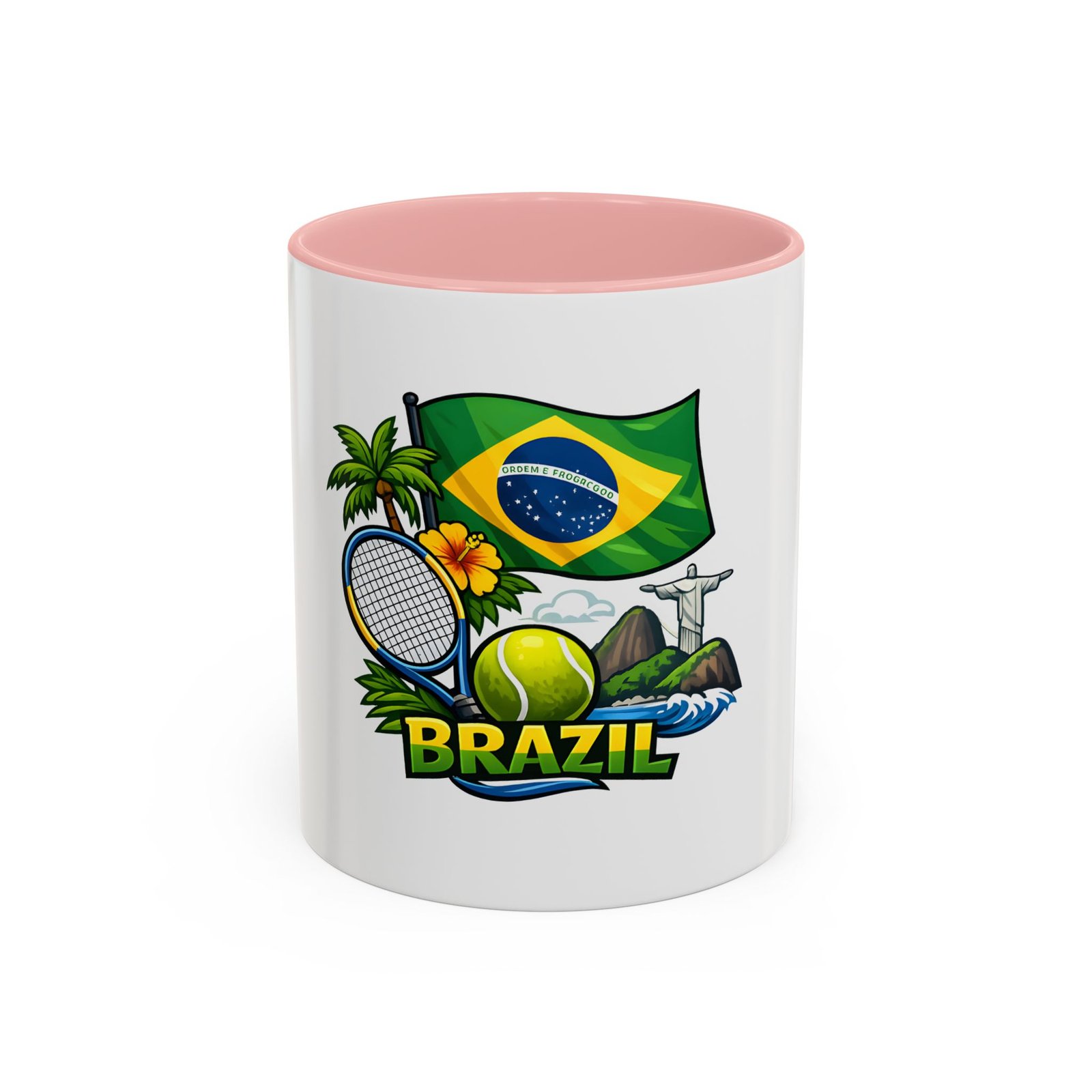 Morning light, strong coffee, and the hum of anticipation — this ceramic mug brings a little Brazil to your daily ritual. Color-rich printing showcases the Brazilian flag, a tennis racket and ball, tropical palms, hibiscus, and the silhouette of Christ the Redeemer, all framed by vivid contrast between the white exterior and the colored interior and handle. It feels lively in your hands and lively on the table, whether you’re sipping before a match, celebrating a win, or reminiscing about sunlit courts and coastal breezes. The glossy finish and bold colors keep the design bright through regular use, and the comfortable C-shaped handle fits naturally whether you reach for an espresso shot or a long, leisurely pour-over.