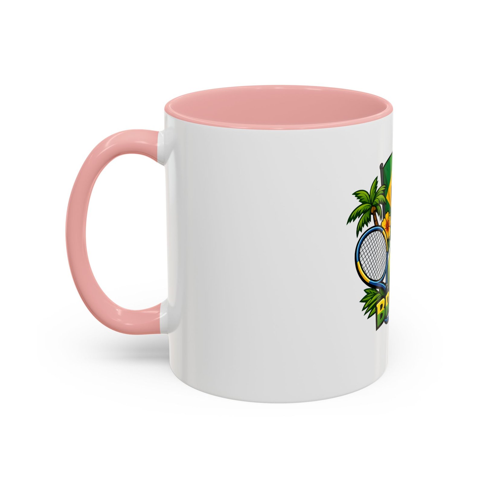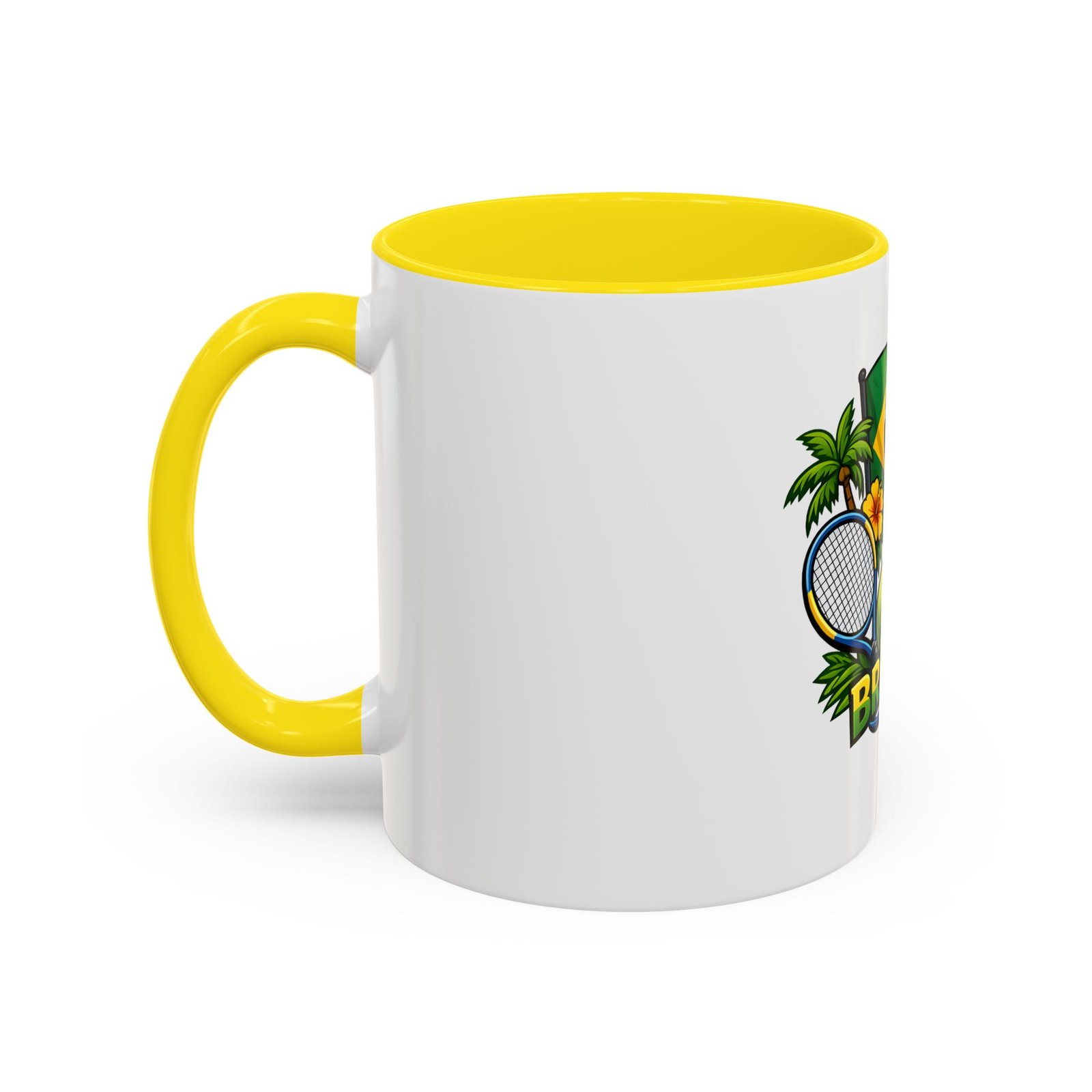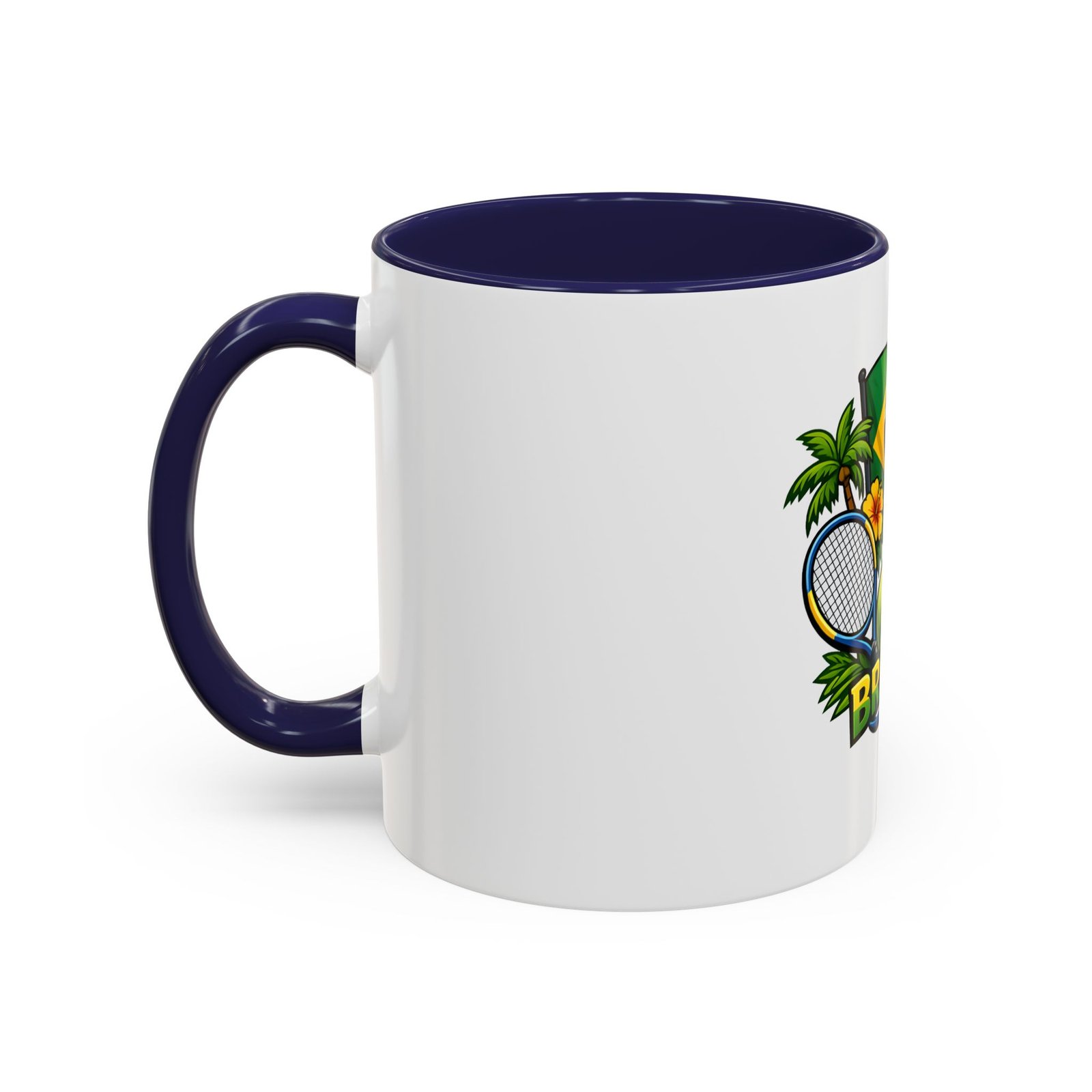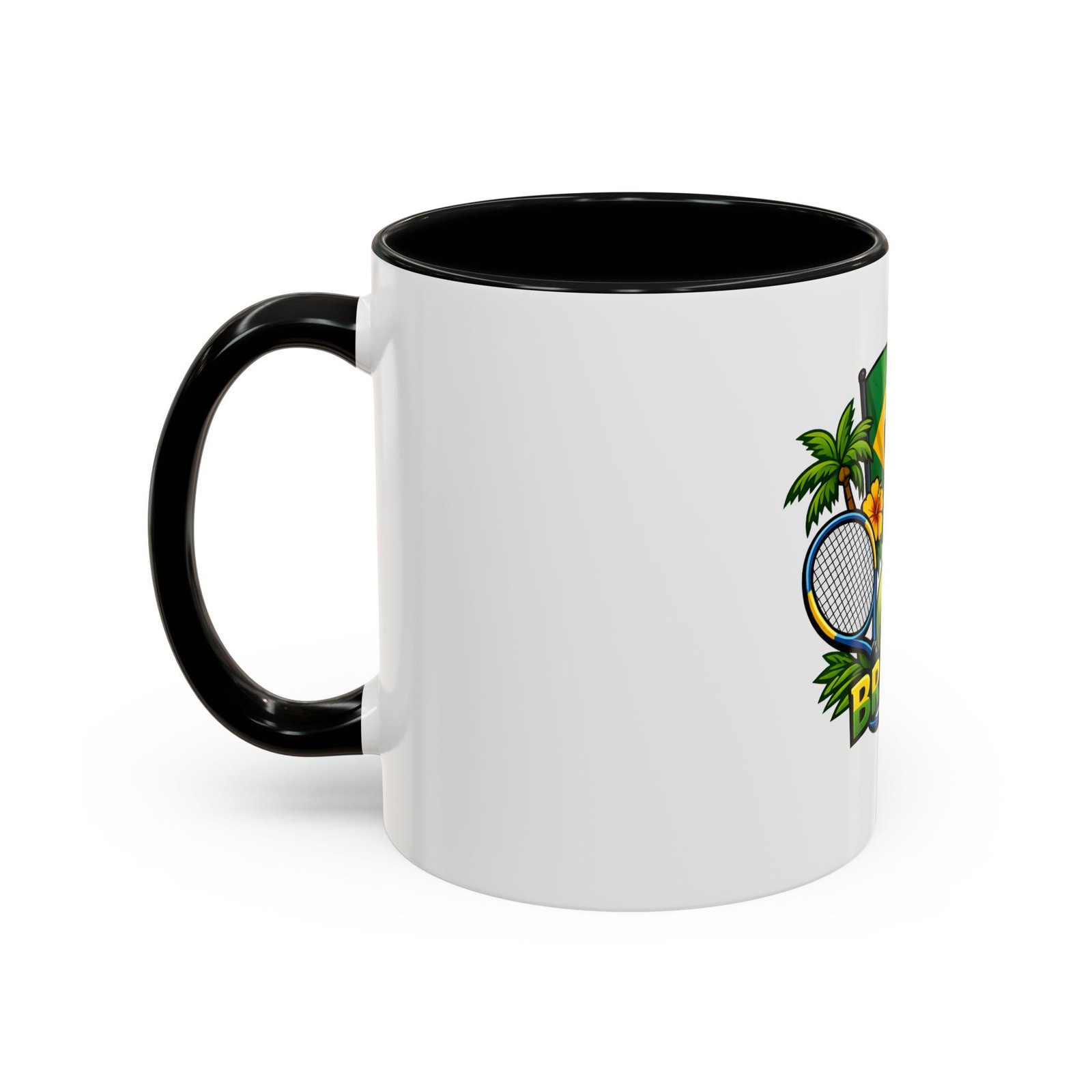 Morning light, strong coffee, and the hum of anticipation — this ceramic mug brings a little Brazil to your daily ritual. Color-rich printing showcases the Brazilian flag, a tennis racket and ball, tropical palms, hibiscus, and the silhouette of Christ the Redeemer, all framed by vivid contrast between the white exterior and the colored interior and handle. It feels lively in your hands and lively on the table, whether you’re sipping before a match, celebrating a win, or reminiscing about sunlit courts and coastal breezes. The glossy finish and bold colors keep the design bright through regular use, and the comfortable C-shaped handle fits naturally whether you reach for an espresso shot or a long, leisurely pour-over.
