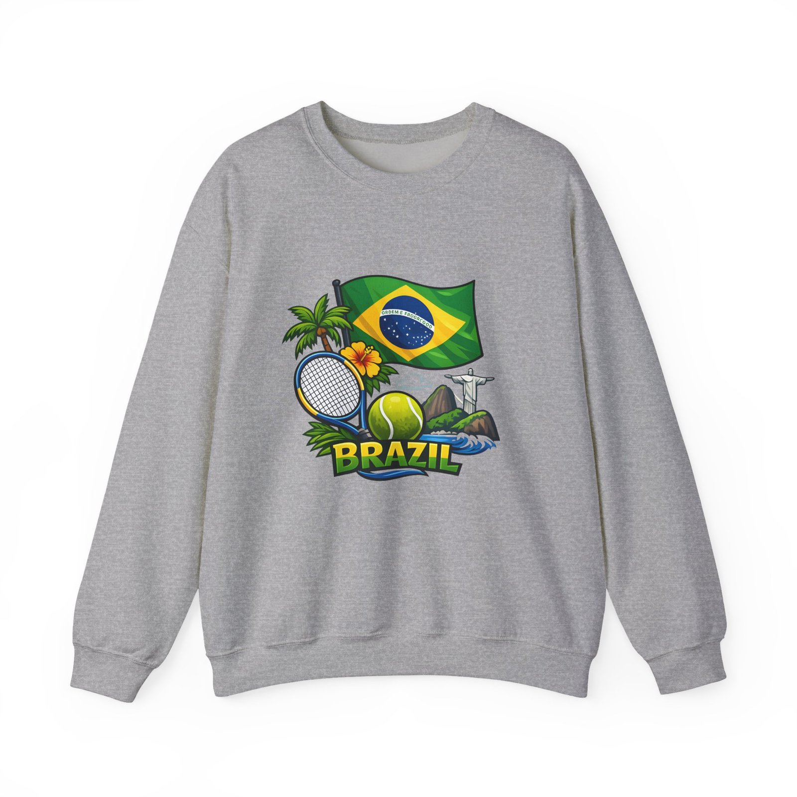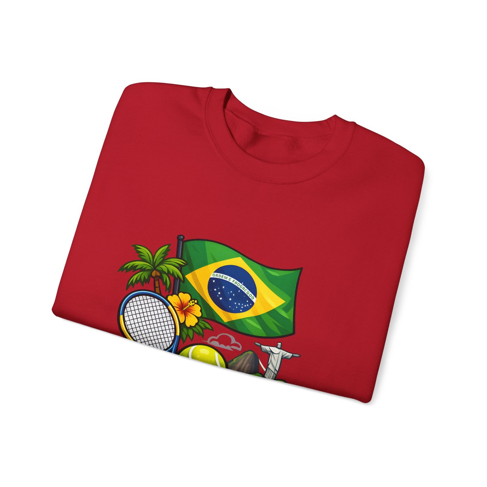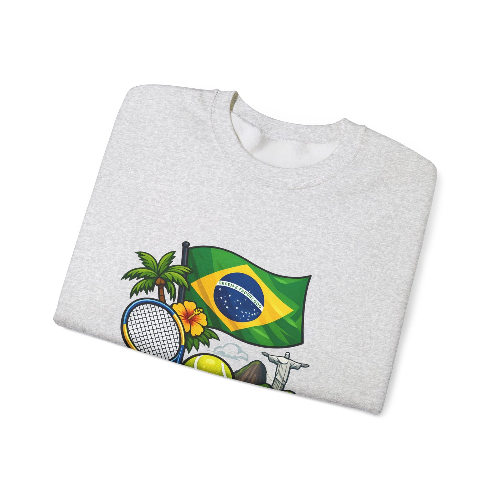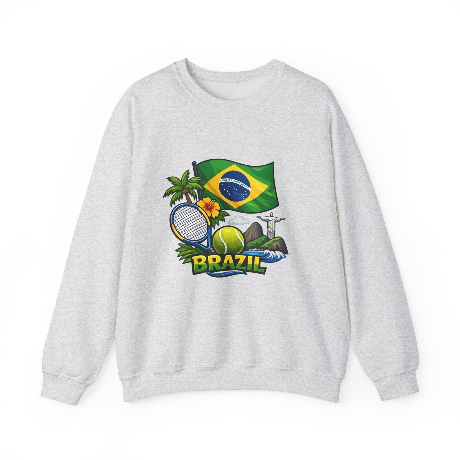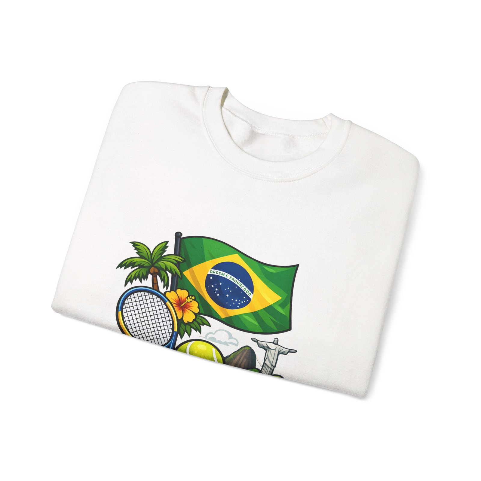 This cozy crewneck brings a sunny slice of Brazil into everyday wear. Lightweight but substantial, the sweatshirt features a vibrant, sports-themed illustration—Brazil’s flag, palm trees, a tennis racket and ball, and a hint of coastal landscape—centered on a clean white canvas. It drapes with a classic, relaxed fit and holds its shape thanks to a ribbed knit collar and double-needle stitching at high-stress seams. The soft medium-heavy cotton-poly blend feels warm without weighing you down; tubular knit construction keeps lines smooth and reduces fabric waste. Details like tear-away neck labels and OEKO‑TEX certified dyes mean comfort meets thoughtful sourcing. Choose embroidered placement on the chest or wrists if you want added texture and a handcrafted touch.