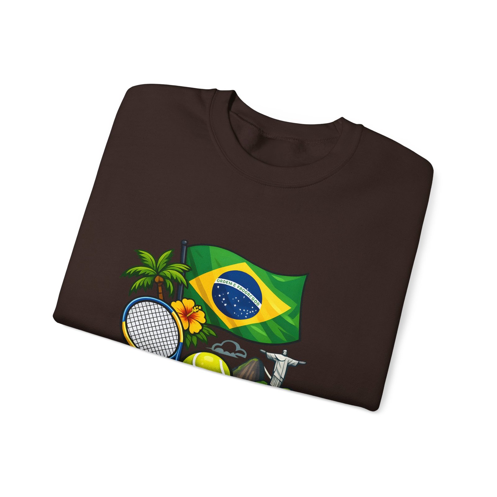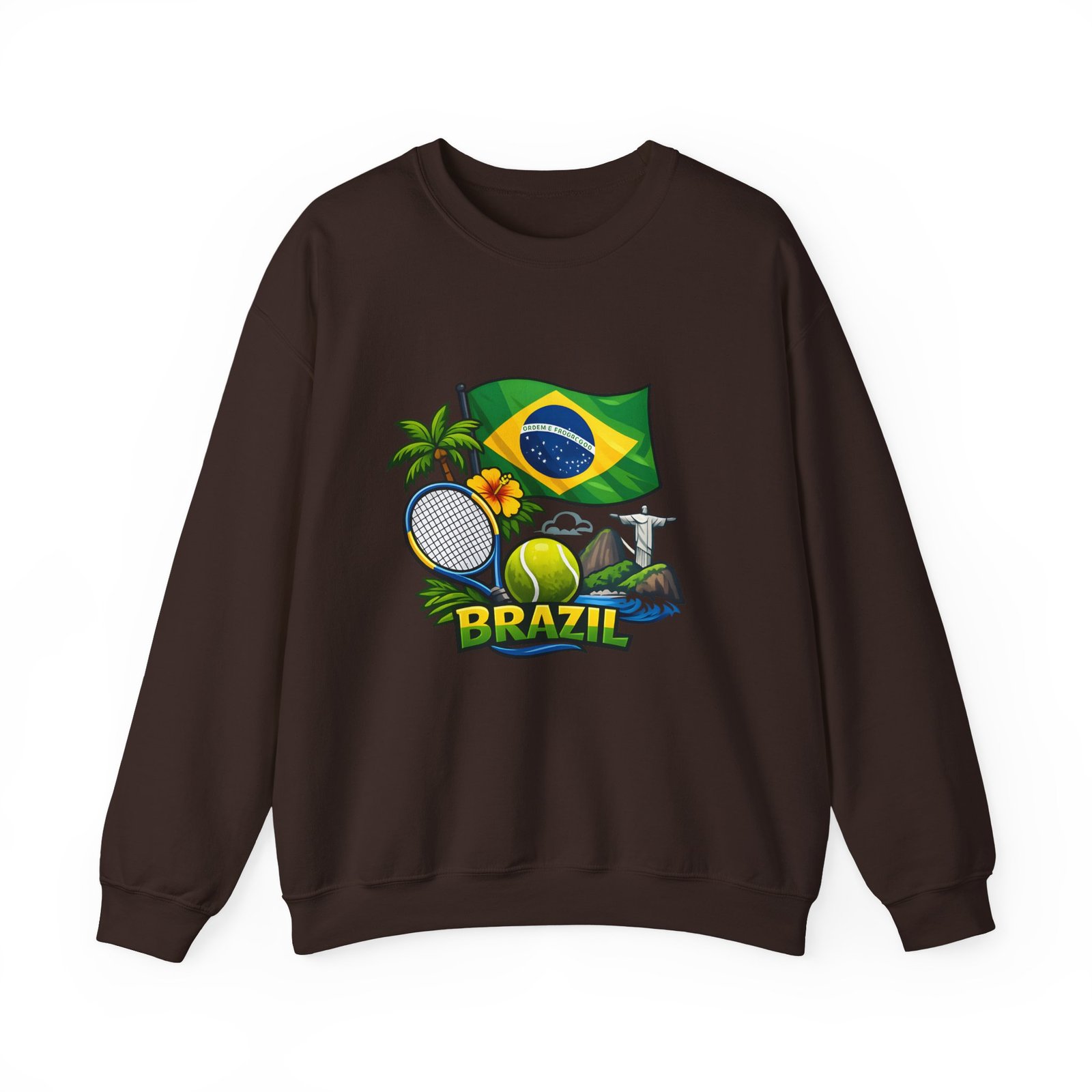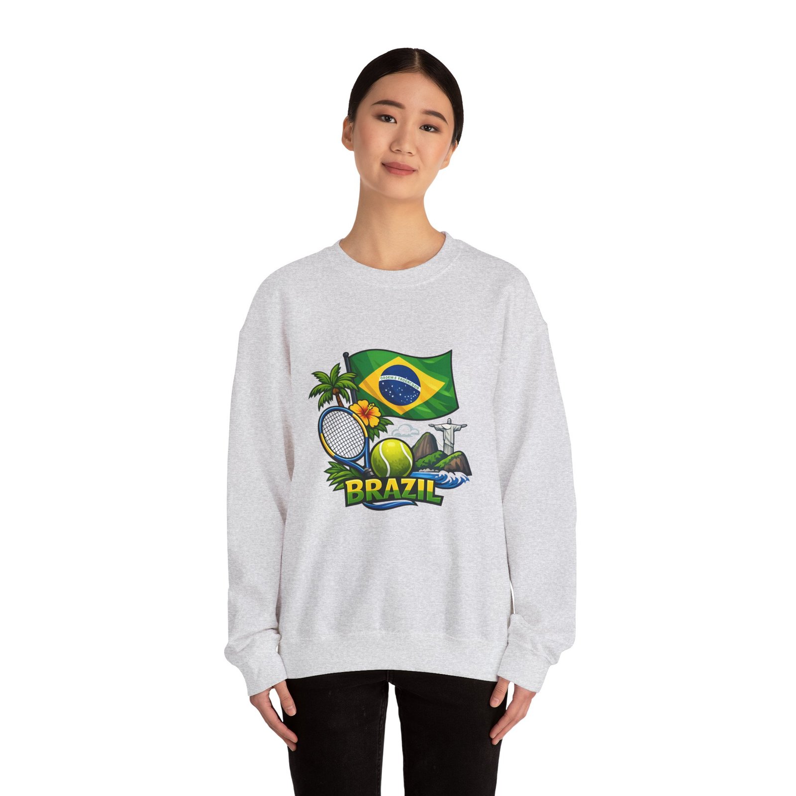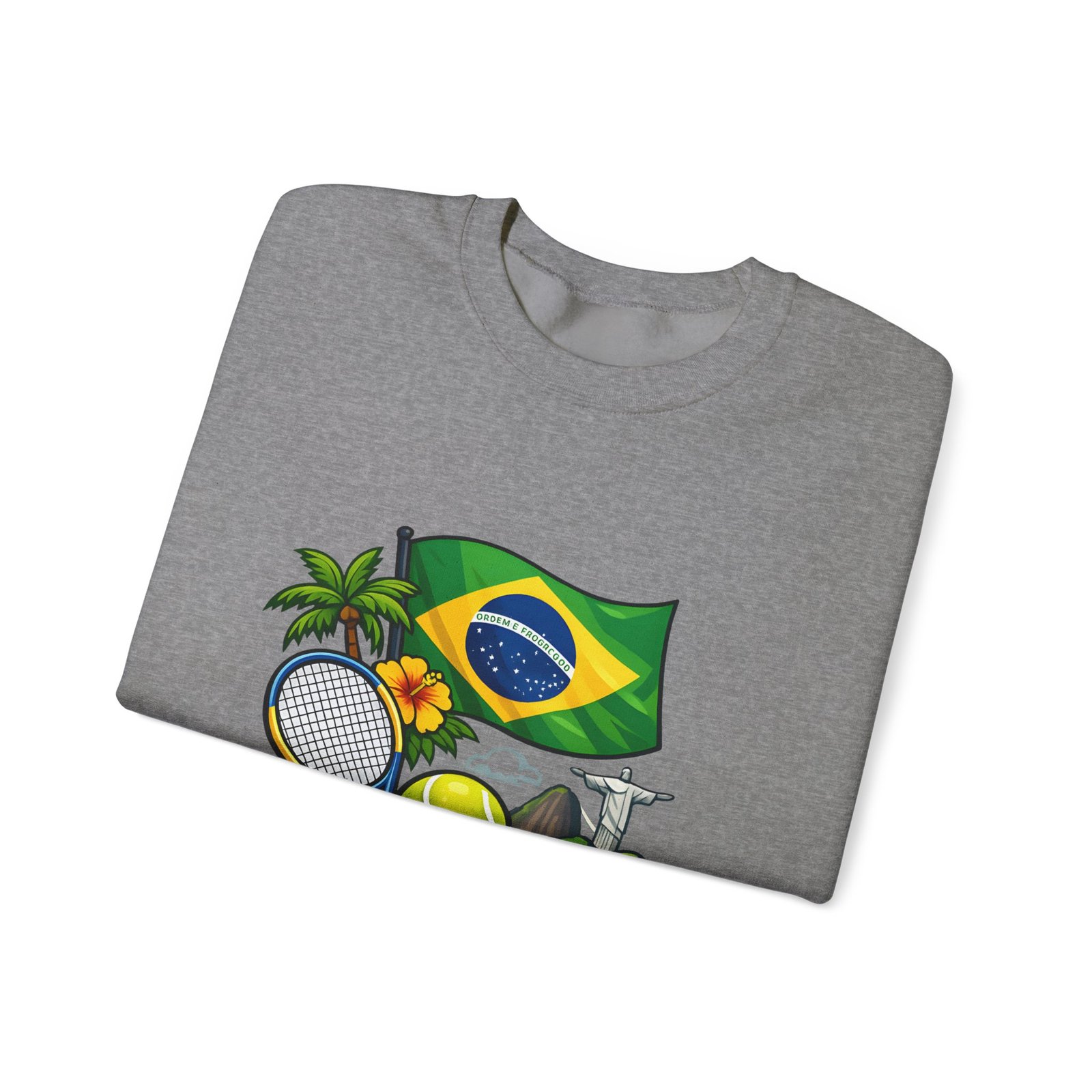 This cozy crewneck brings a sunny slice of Brazil into everyday wear. Lightweight but substantial, the sweatshirt features a vibrant, sports-themed illustration—Brazil’s flag, palm trees, a tennis racket and ball, and a hint of coastal landscape—centered on a clean white canvas. It drapes with a classic, relaxed fit and holds its shape thanks to a ribbed knit collar and double-needle stitching at high-stress seams. The soft medium-heavy cotton-poly blend feels warm without weighing you down; tubular knit construction keeps lines smooth and reduces fabric waste. Details like tear-away neck labels and OEKO‑TEX certified dyes mean comfort meets thoughtful sourcing. Choose embroidered placement on the chest or wrists if you want added texture and a handcrafted touch.
