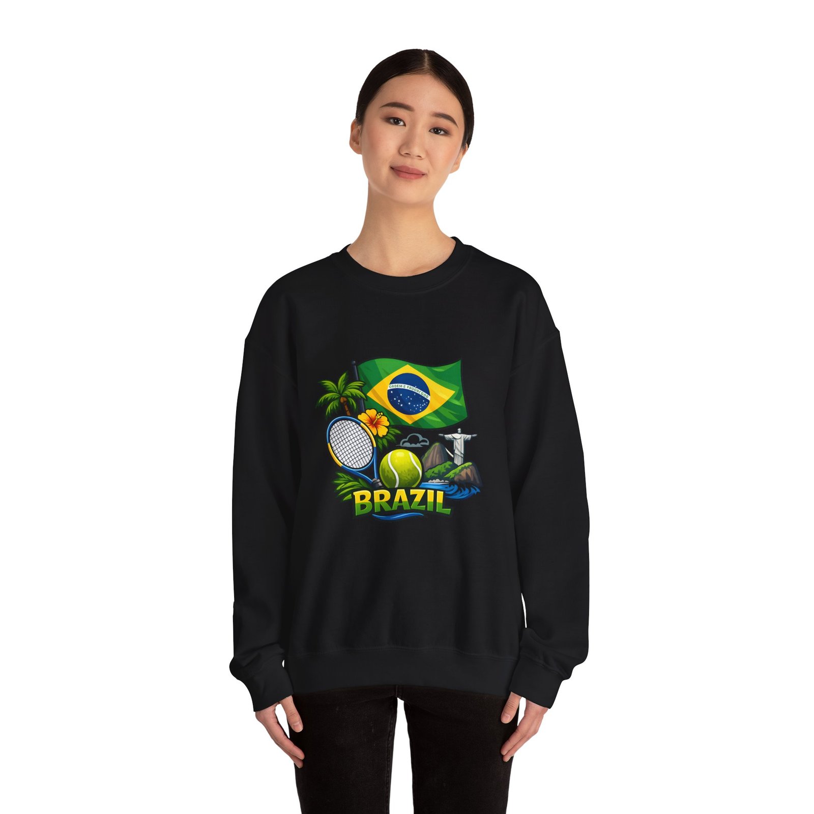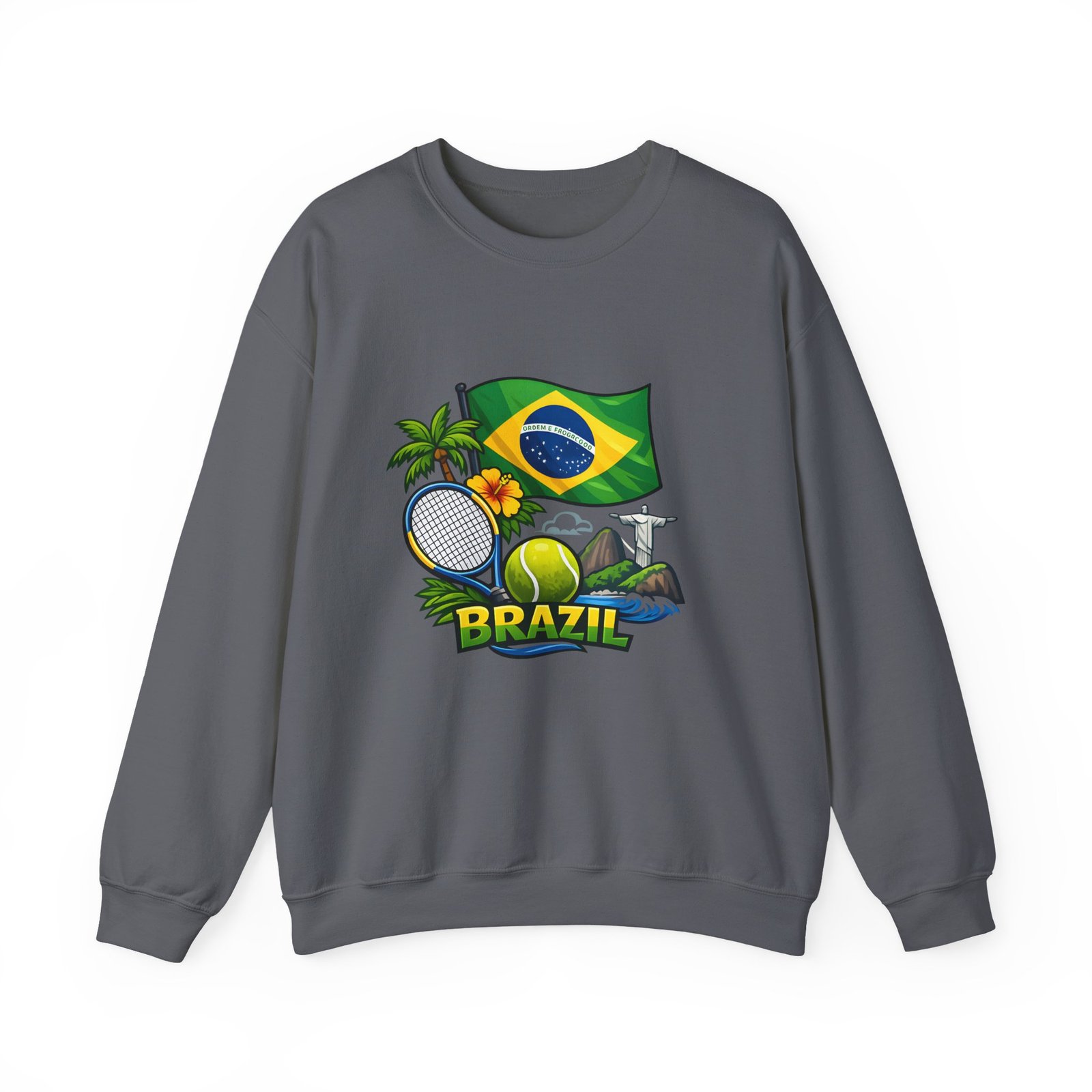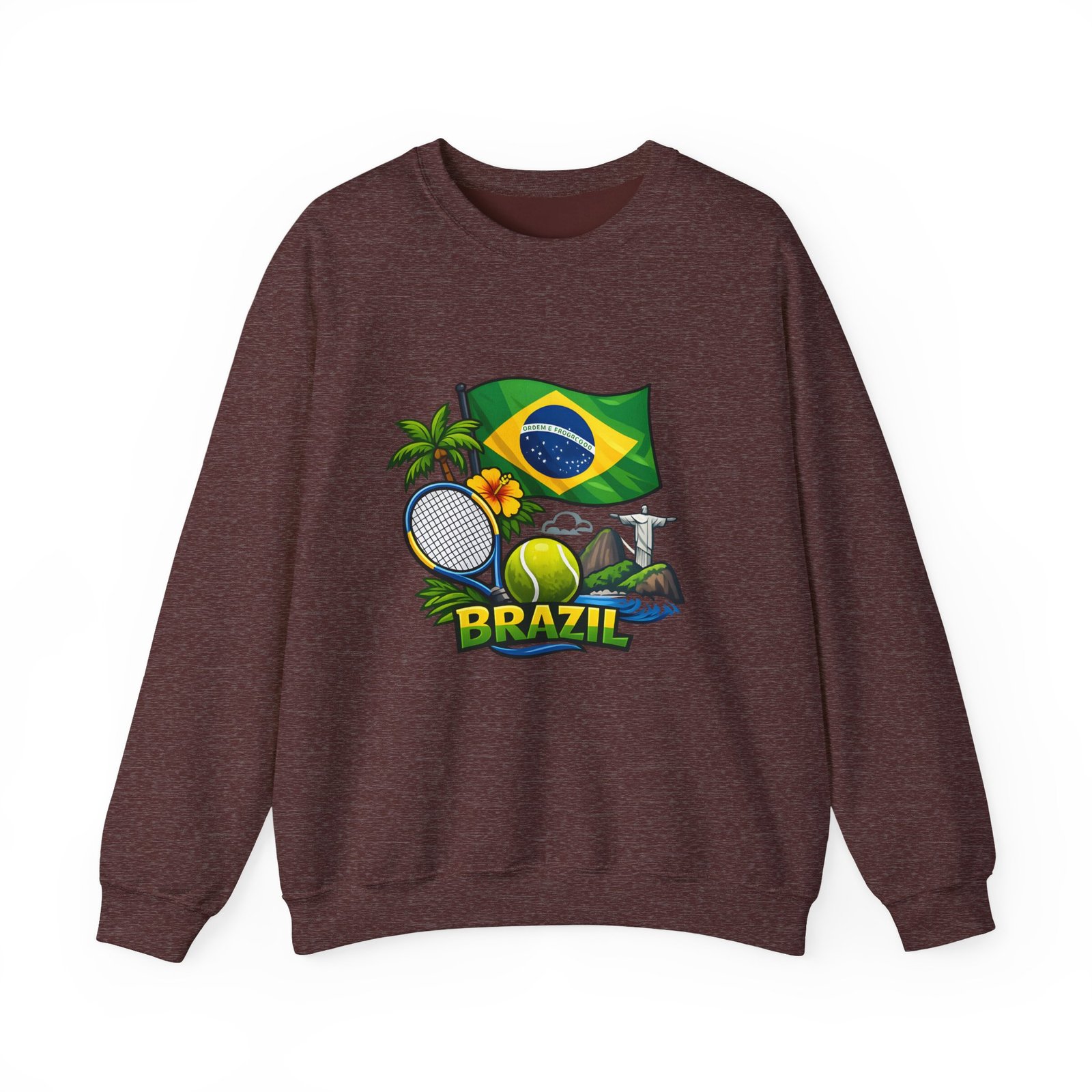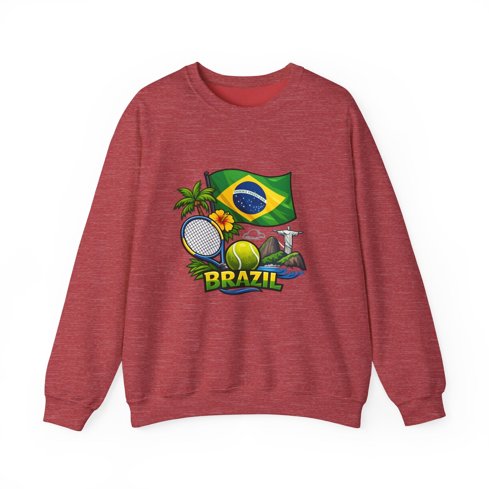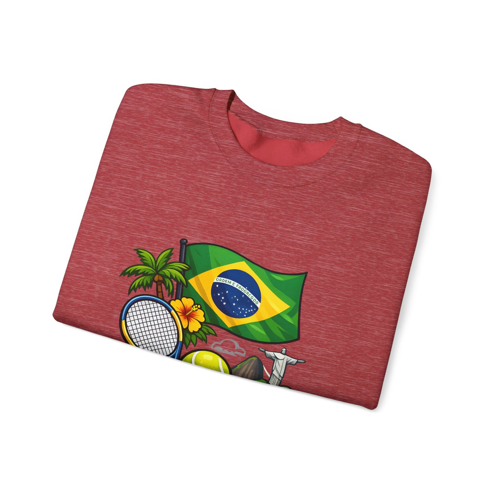 This cozy crewneck brings a sunny slice of Brazil into everyday wear. Lightweight but substantial, the sweatshirt features a vibrant, sports-themed illustration—Brazil’s flag, palm trees, a tennis racket and ball, and a hint of coastal landscape—centered on a clean white canvas. It drapes with a classic, relaxed fit and holds its shape thanks to a ribbed knit collar and double-needle stitching at high-stress seams. The soft medium-heavy cotton-poly blend feels warm without weighing you down; tubular knit construction keeps lines smooth and reduces fabric waste. Details like tear-away neck labels and OEKO‑TEX certified dyes mean comfort meets thoughtful sourcing. Choose embroidered placement on the chest or wrists if you want added texture and a handcrafted touch.
