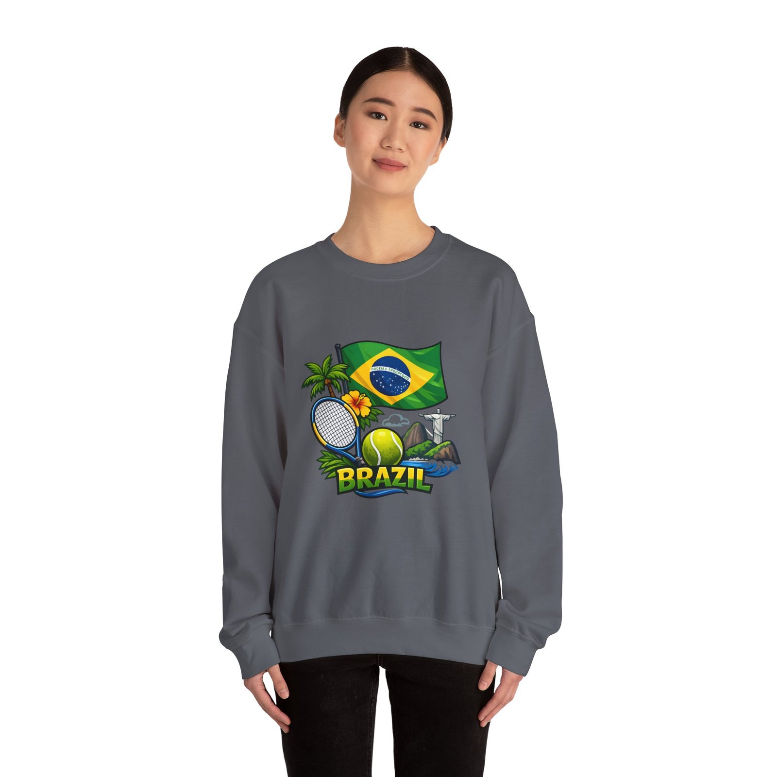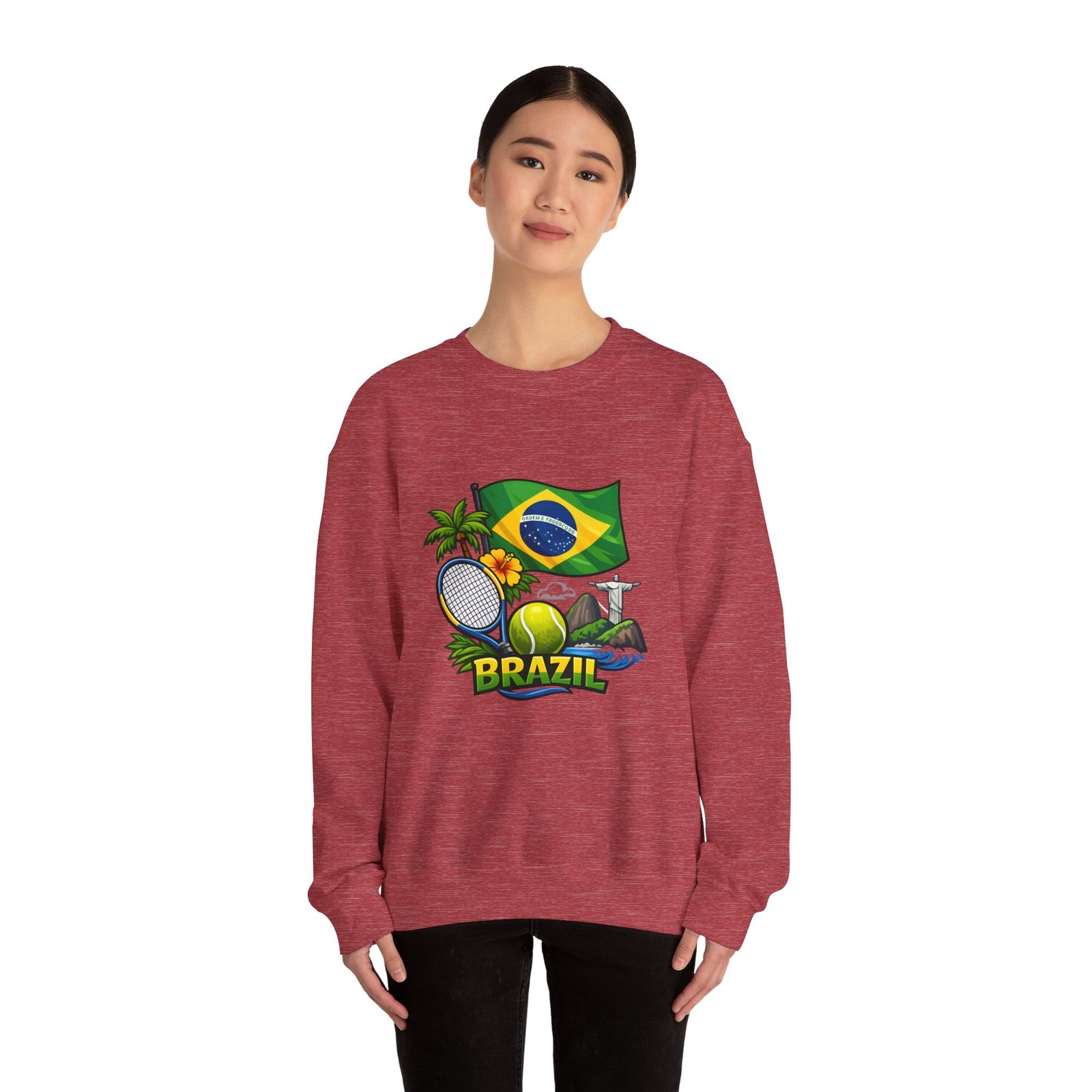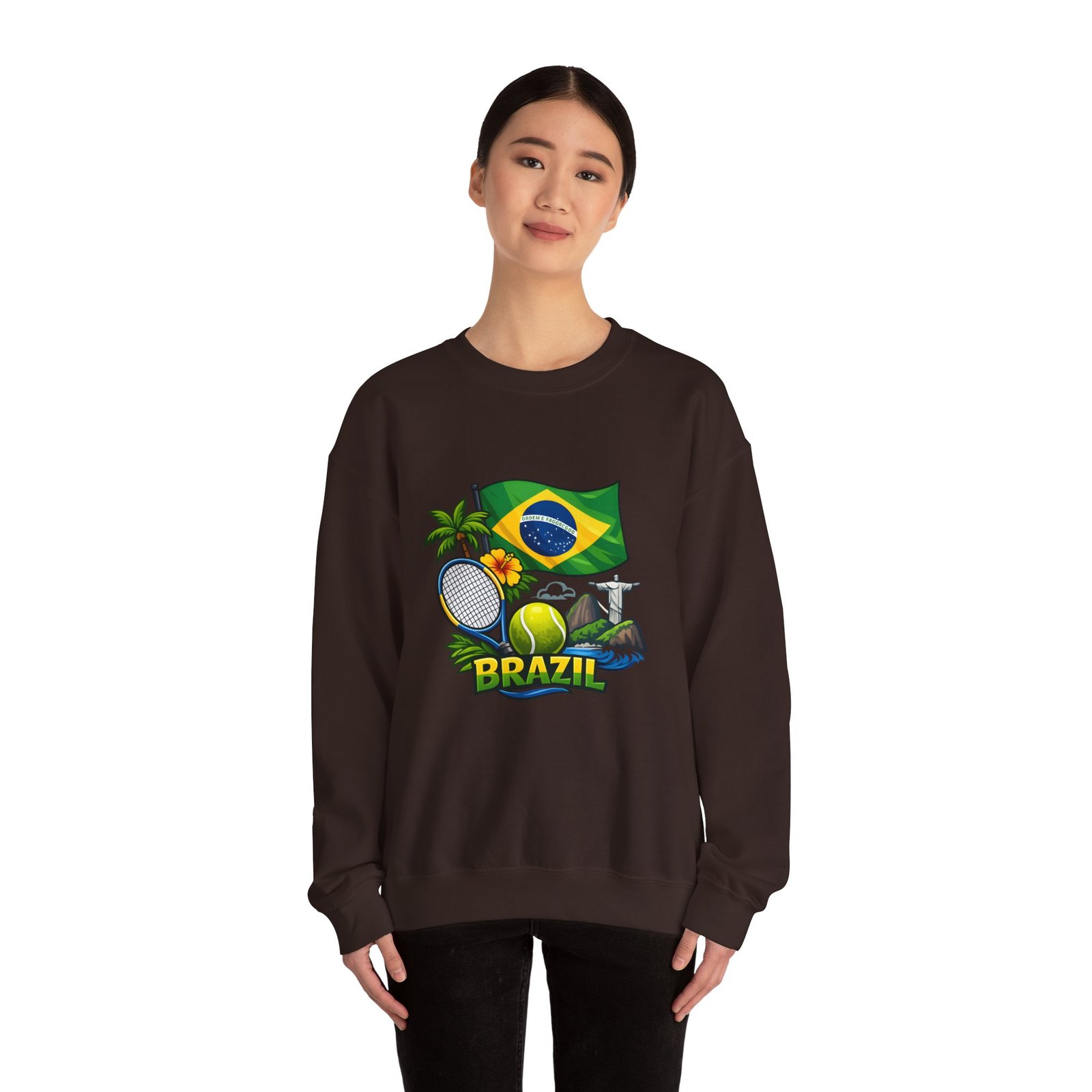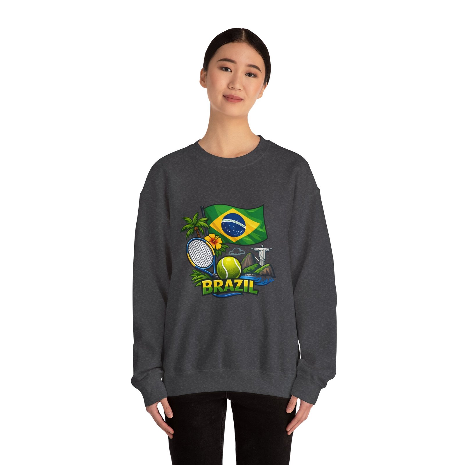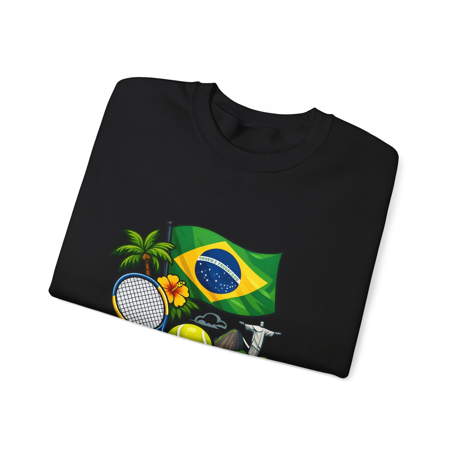 This cozy crewneck brings a sunny slice of Brazil into everyday wear. Lightweight but substantial, the sweatshirt features a vibrant, sports-themed illustration—Brazil’s flag, palm trees, a tennis racket and ball, and a hint of coastal landscape—centered on a clean white canvas. It drapes with a classic, relaxed fit and holds its shape thanks to a ribbed knit collar and double-needle stitching at high-stress seams. The soft medium-heavy cotton-poly blend feels warm without weighing you down; tubular knit construction keeps lines smooth and reduces fabric waste. Details like tear-away neck labels and OEKO‑TEX certified dyes mean comfort meets thoughtful sourcing. Choose embroidered placement on the chest or wrists if you want added texture and a handcrafted touch.