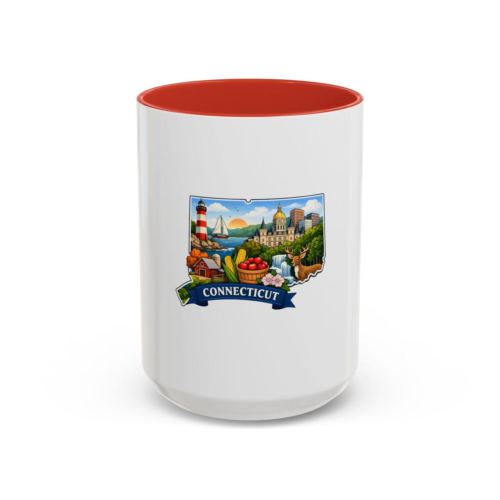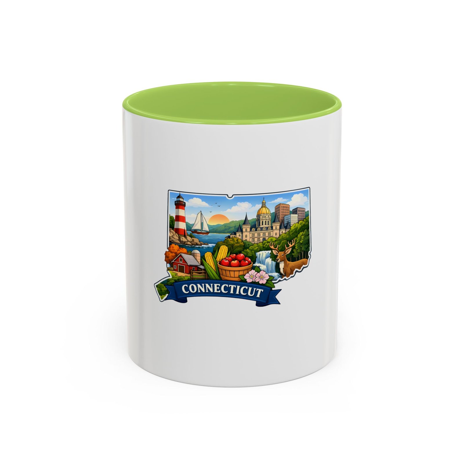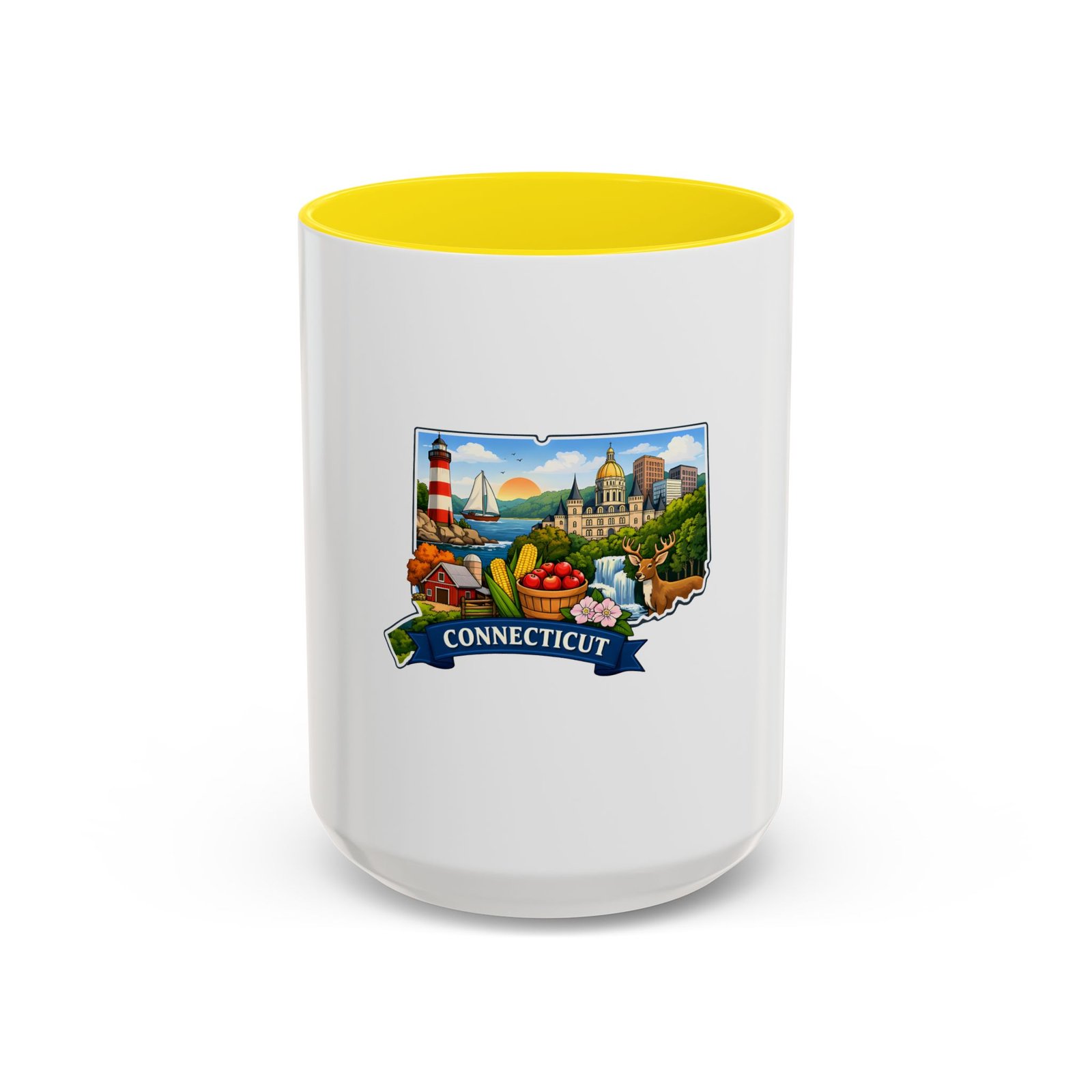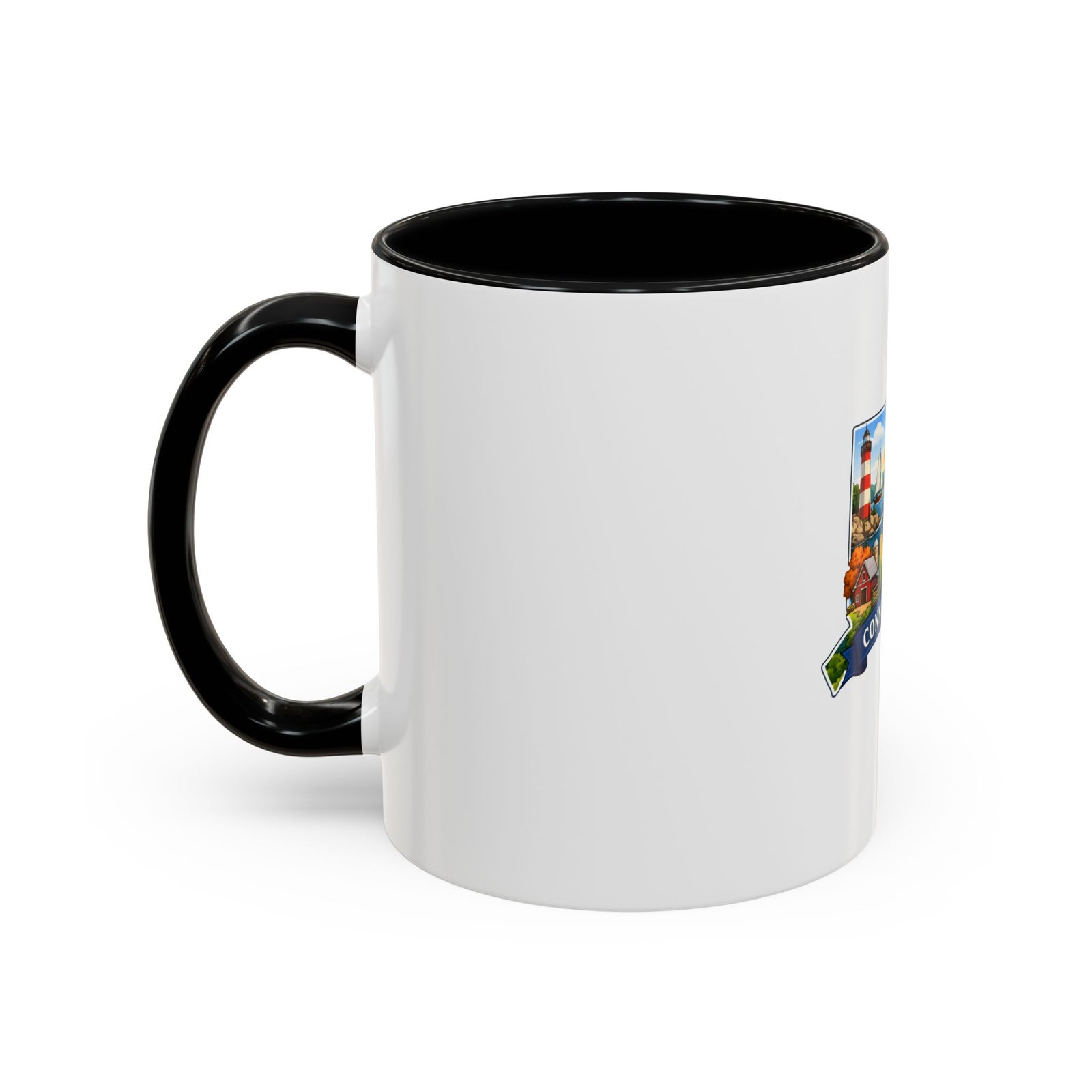 Warm, bright, and full of local charm — this ceramic accent mug celebrates Connecticut with a cheerful illustrated map wrapped around a glossy white canvas. A bold colored interior and handle add playful contrast, while the vivid print captures lighthouses, sailboats, fall foliage, and classic shoreline scenes that bring a morning cup of coffee or tea to life. The comfortable C-shaped handle and two size options make it easy to reach for every day. It’s the kind of mug that feels like home: familiar, colorful, and a little bit nostalgic.