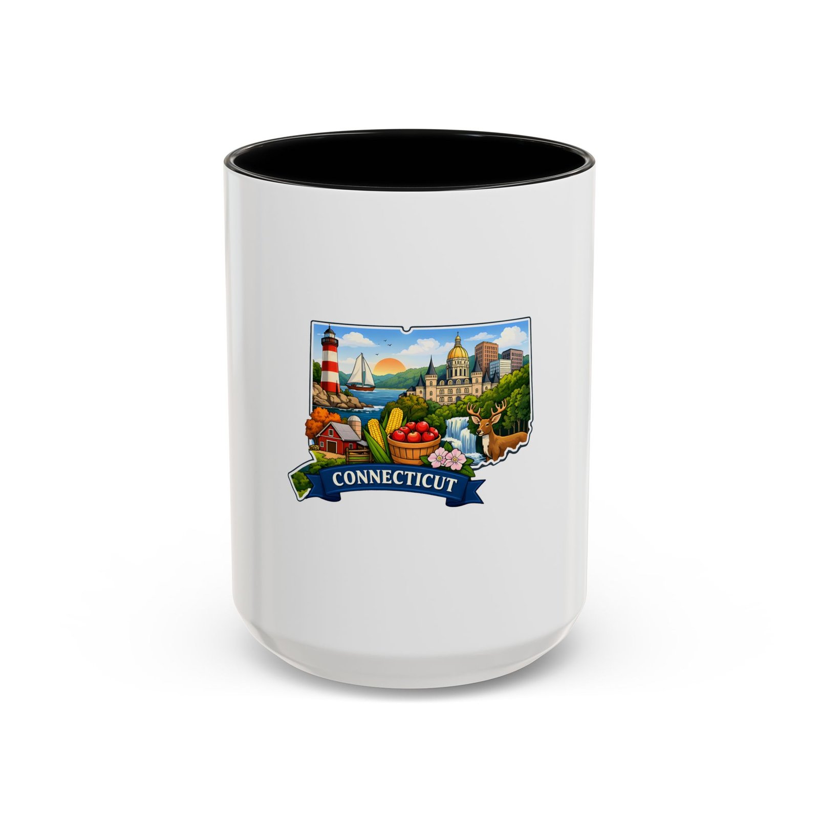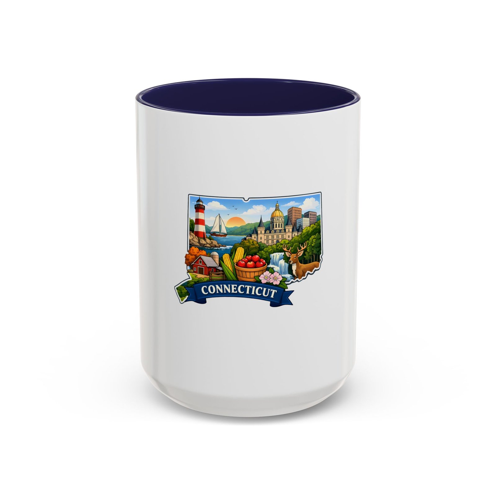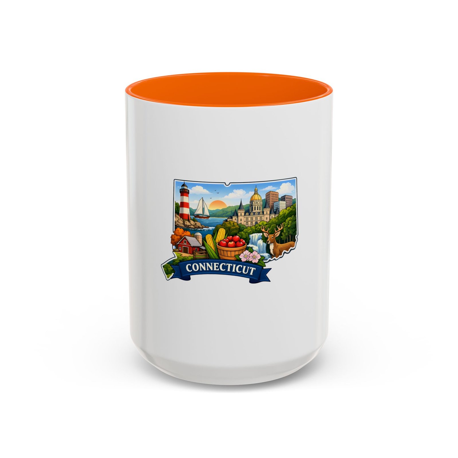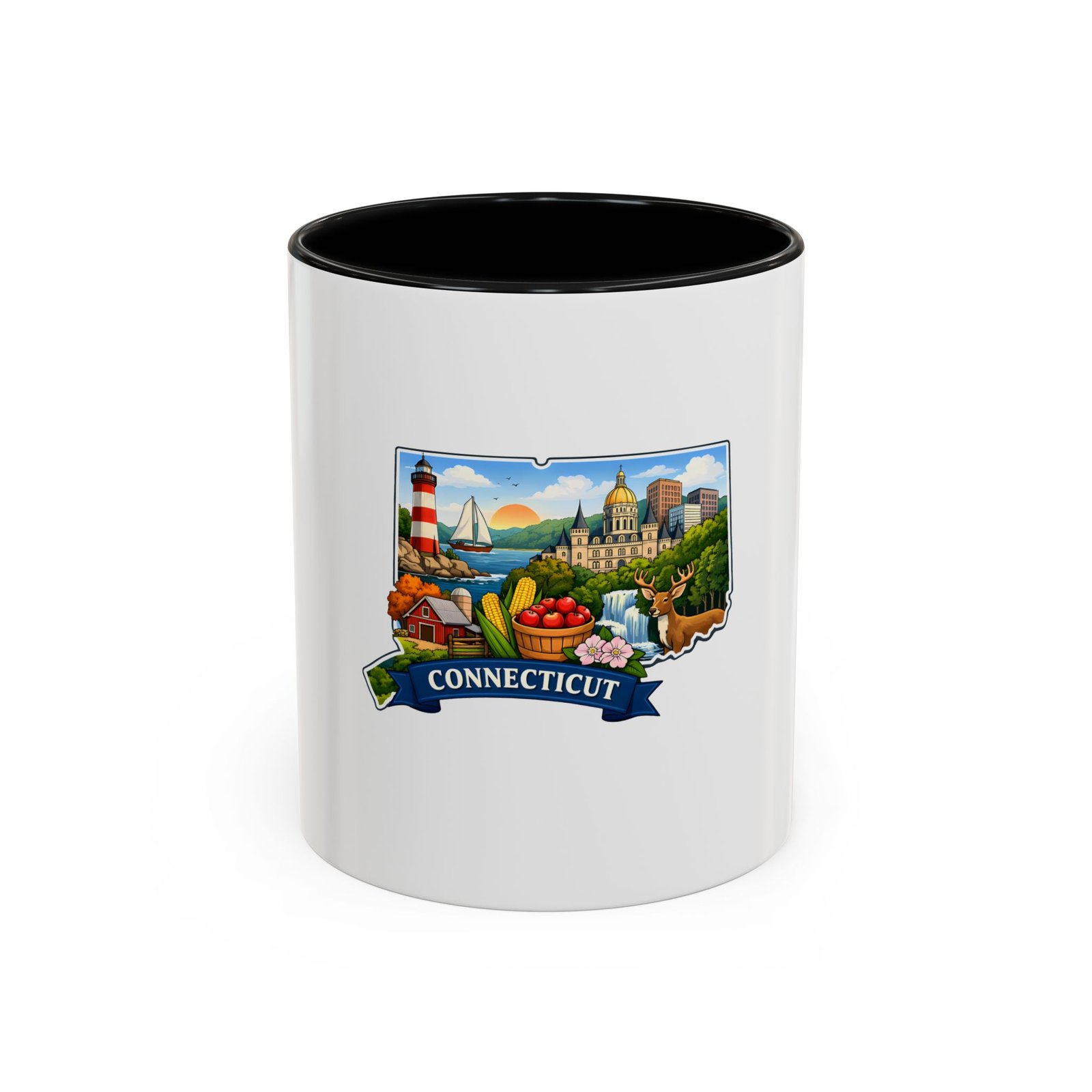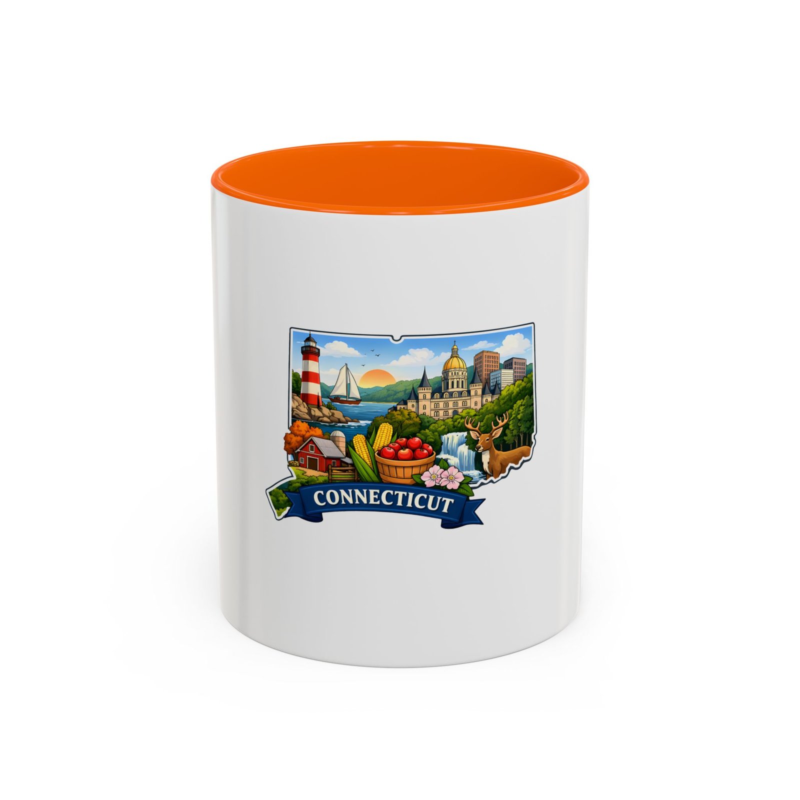 Warm, bright, and full of local charm — this ceramic accent mug celebrates Connecticut with a cheerful illustrated map wrapped around a glossy white canvas. A bold colored interior and handle add playful contrast, while the vivid print captures lighthouses, sailboats, fall foliage, and classic shoreline scenes that bring a morning cup of coffee or tea to life. The comfortable C-shaped handle and two size options make it easy to reach for every day. It’s the kind of mug that feels like home: familiar, colorful, and a little bit nostalgic.