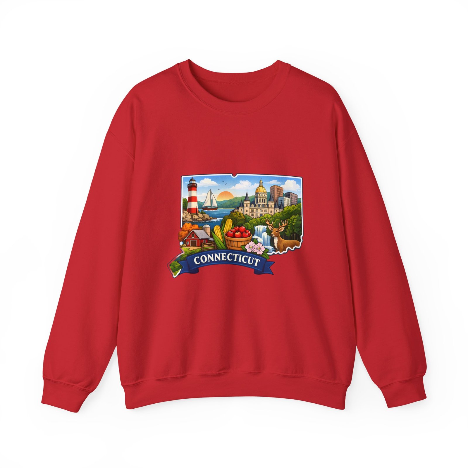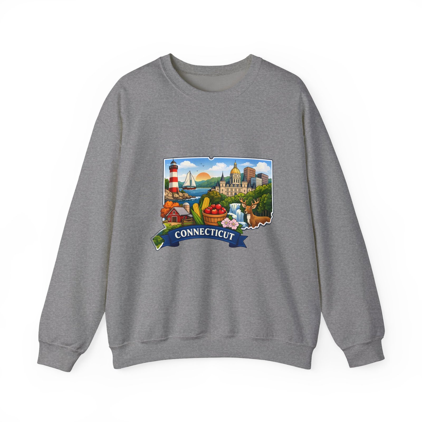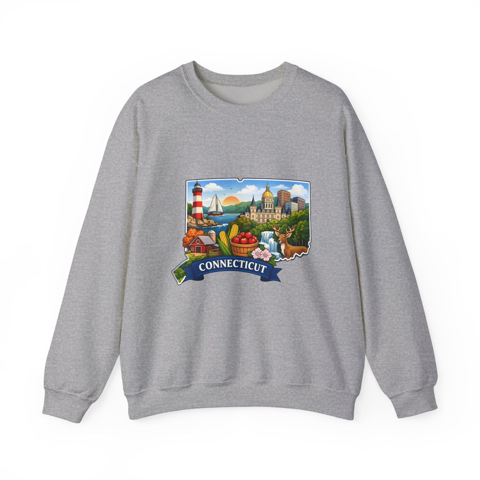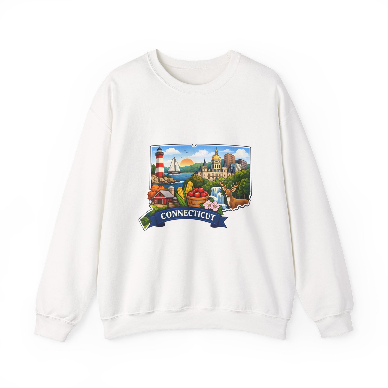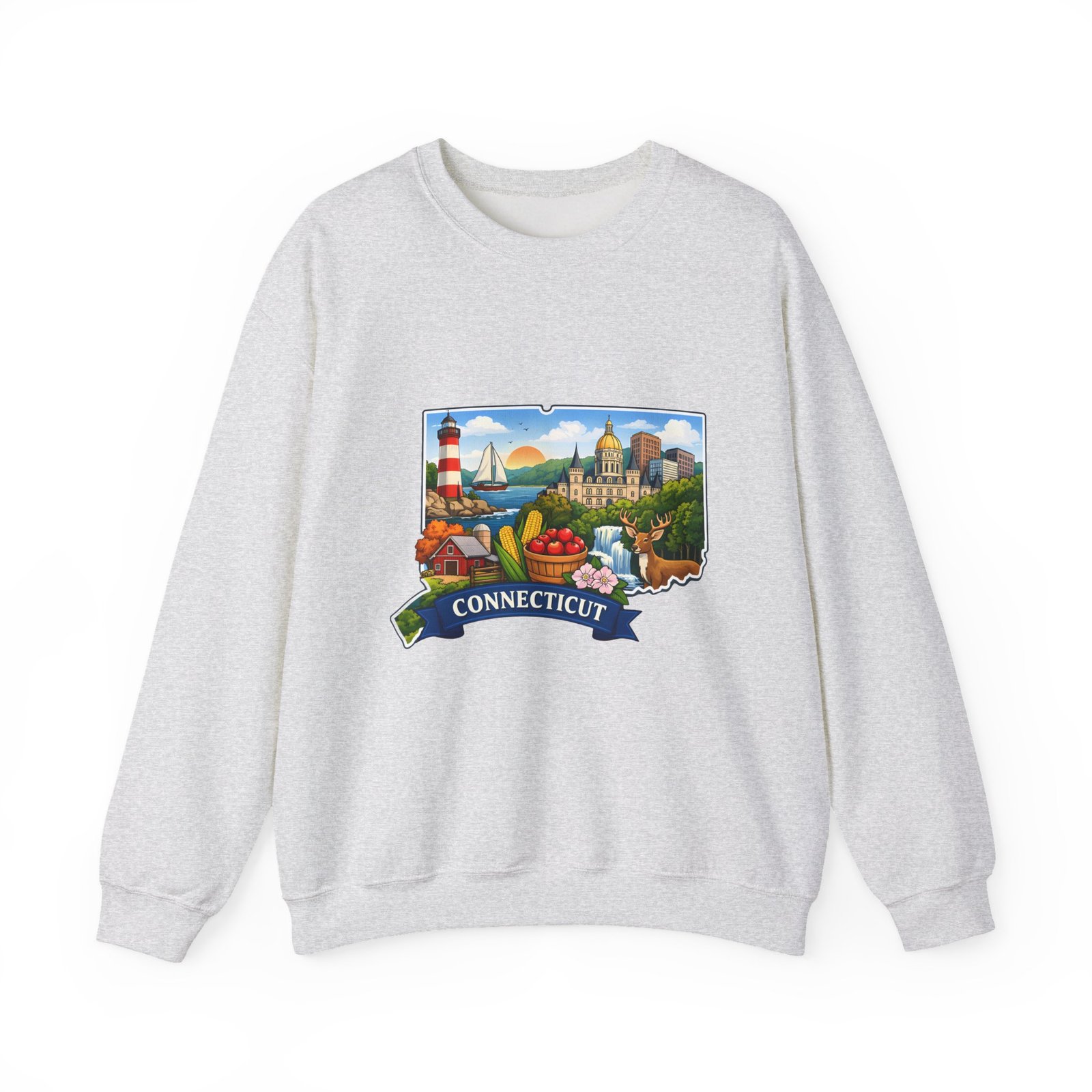 This soft, medium-weight sweatshirt brings a cozy nod to Connecticut wherever you wear it. The classic crew silhouette and ribbed collar hold shape while the 50/50 cotton-poly blend feels warm without bulk. A full-color scenic emblem sits on the chest — lighthouse, shoreline and fall foliage framed by a banner reading “CONNECTICUT” — giving the piece a nostalgic, hometown vibe. Thoughtful construction (tubular knit, double-needle stitching, tear-away label) makes it comfortable for long days of travel, cool evenings on the harbor, or relaxed weekends at home. Subtle durability and quality dyes mean the print stays bright and the garment keeps its shape wash after wash.