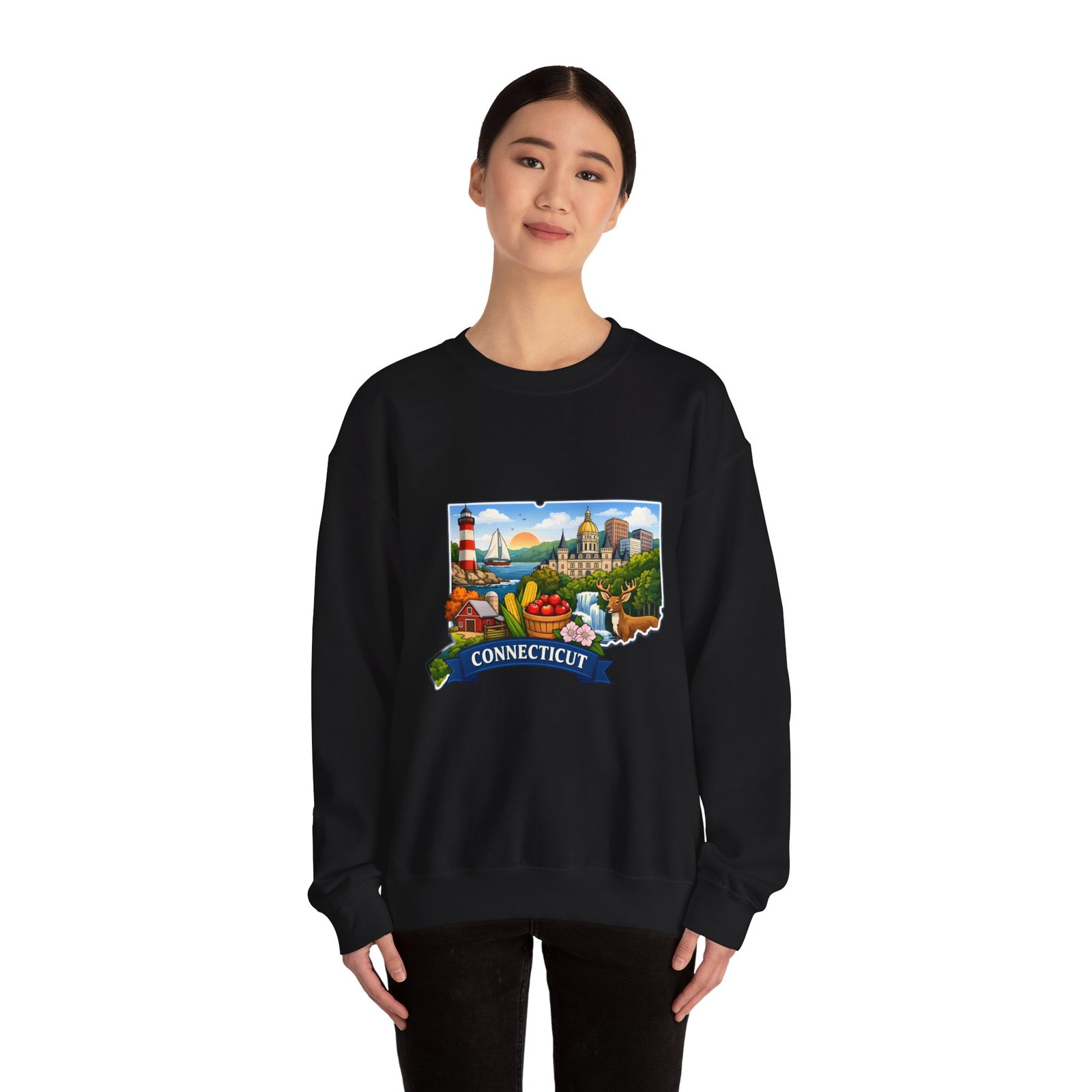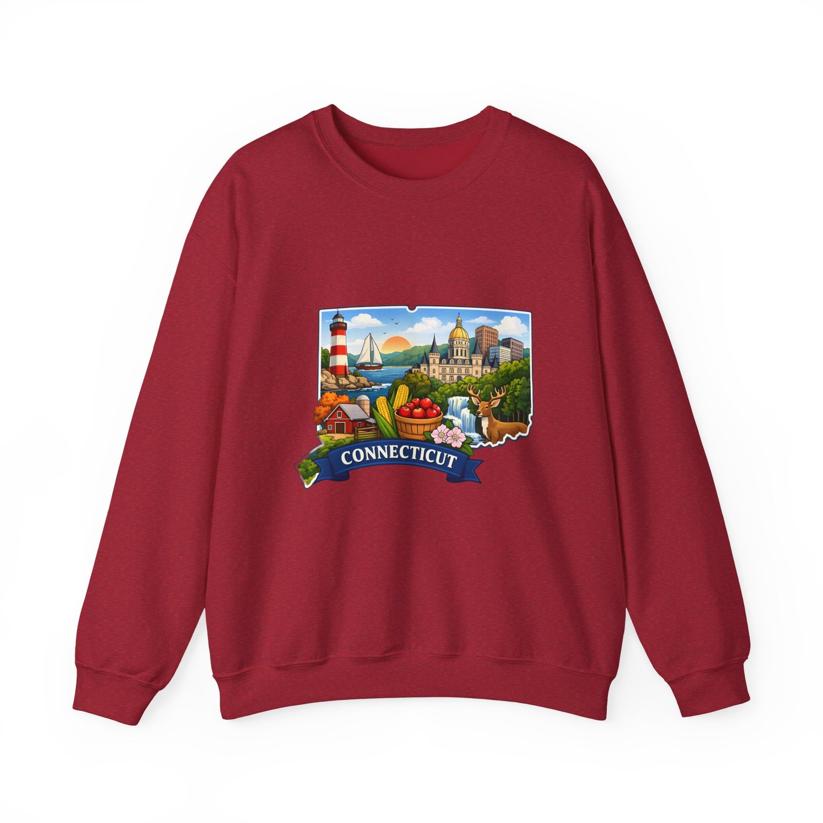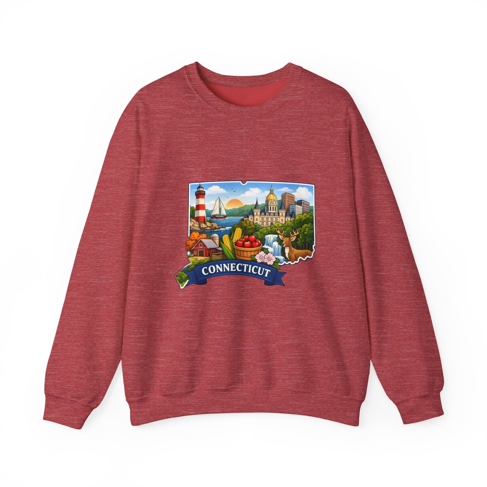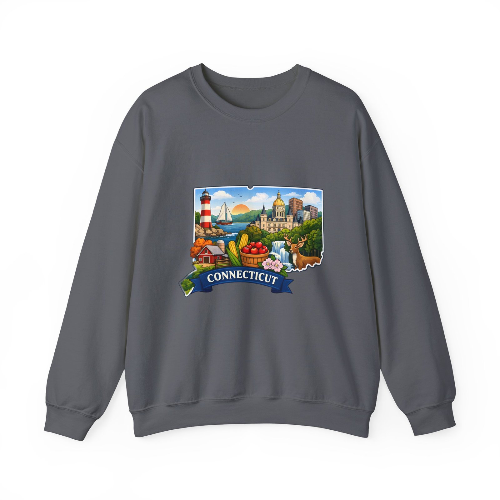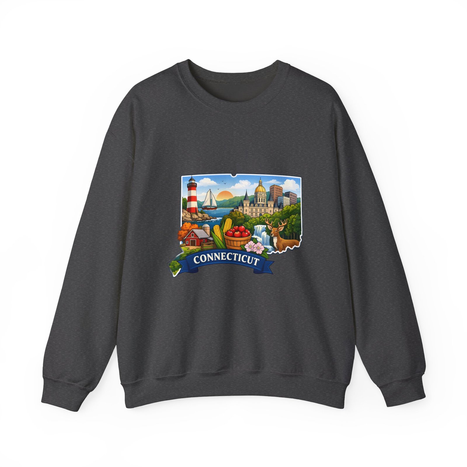 This soft, medium-weight sweatshirt brings a cozy nod to Connecticut wherever you wear it. The classic crew silhouette and ribbed collar hold shape while the 50/50 cotton-poly blend feels warm without bulk. A full-color scenic emblem sits on the chest — lighthouse, shoreline and fall foliage framed by a banner reading “CONNECTICUT” — giving the piece a nostalgic, hometown vibe. Thoughtful construction (tubular knit, double-needle stitching, tear-away label) makes it comfortable for long days of travel, cool evenings on the harbor, or relaxed weekends at home. Subtle durability and quality dyes mean the print stays bright and the garment keeps its shape wash after wash.