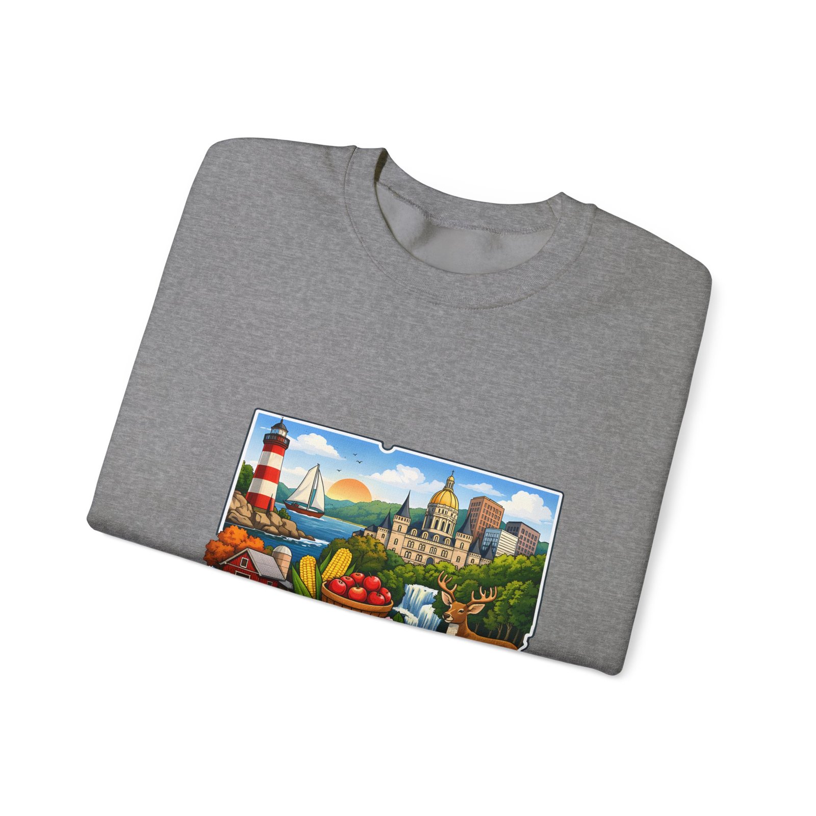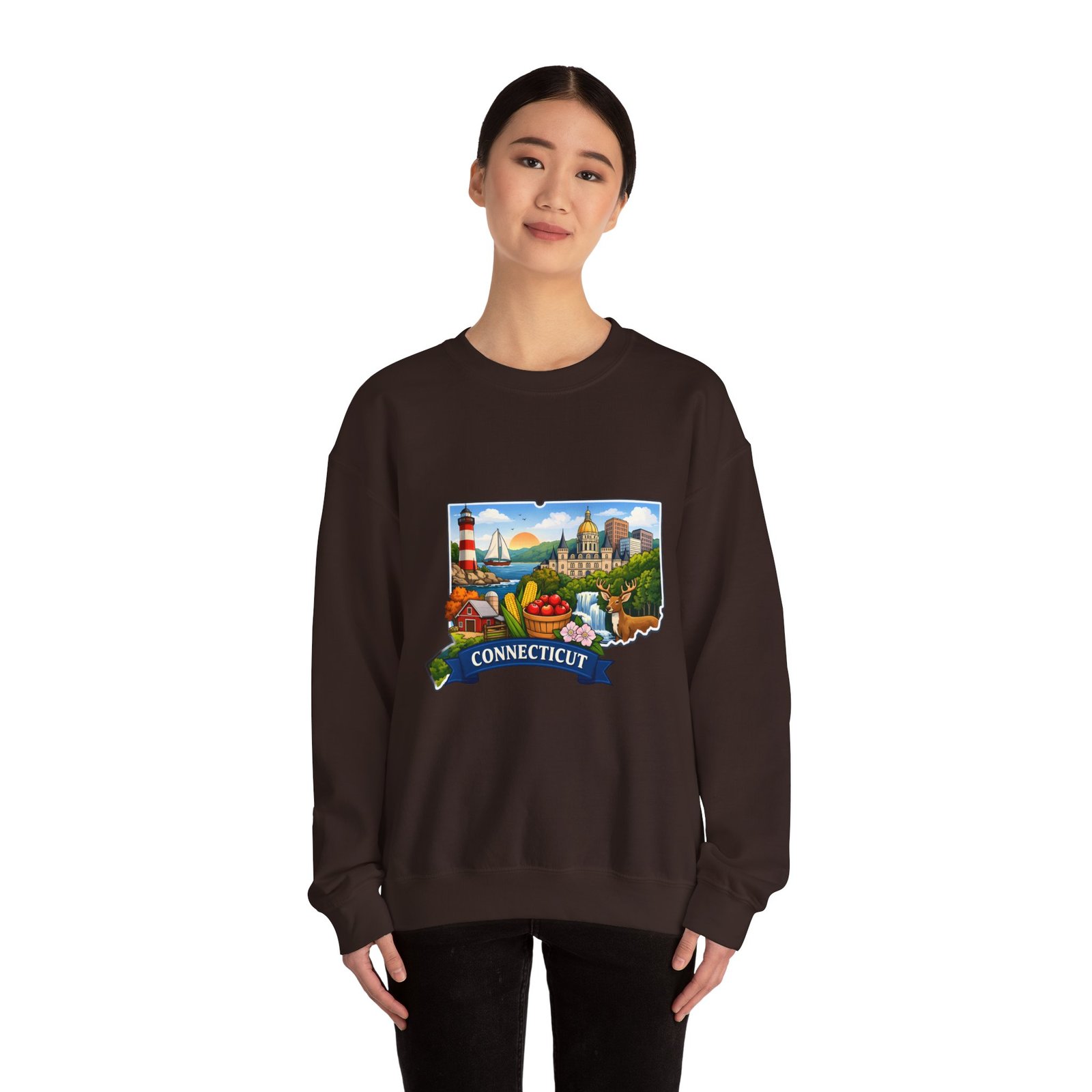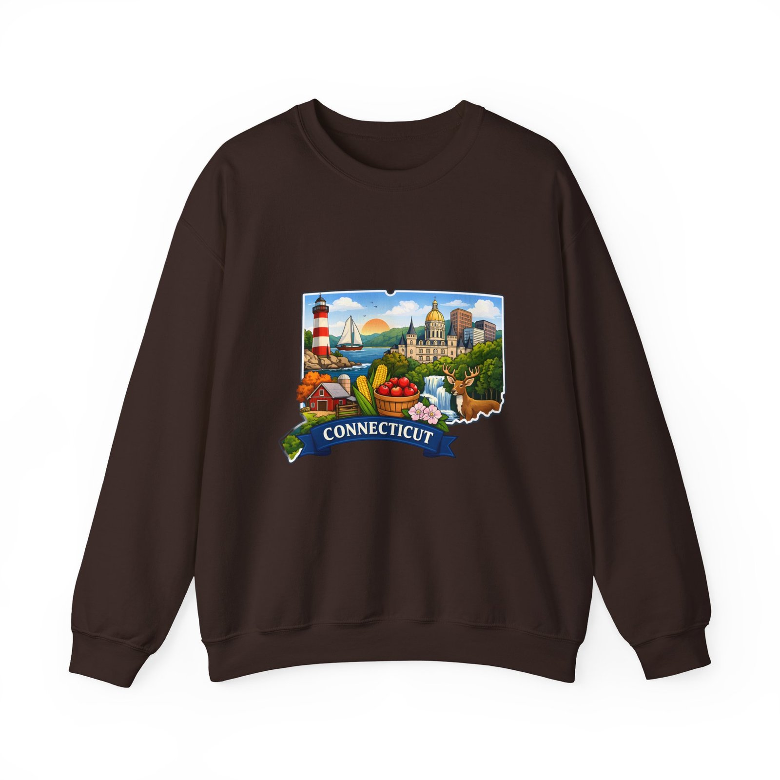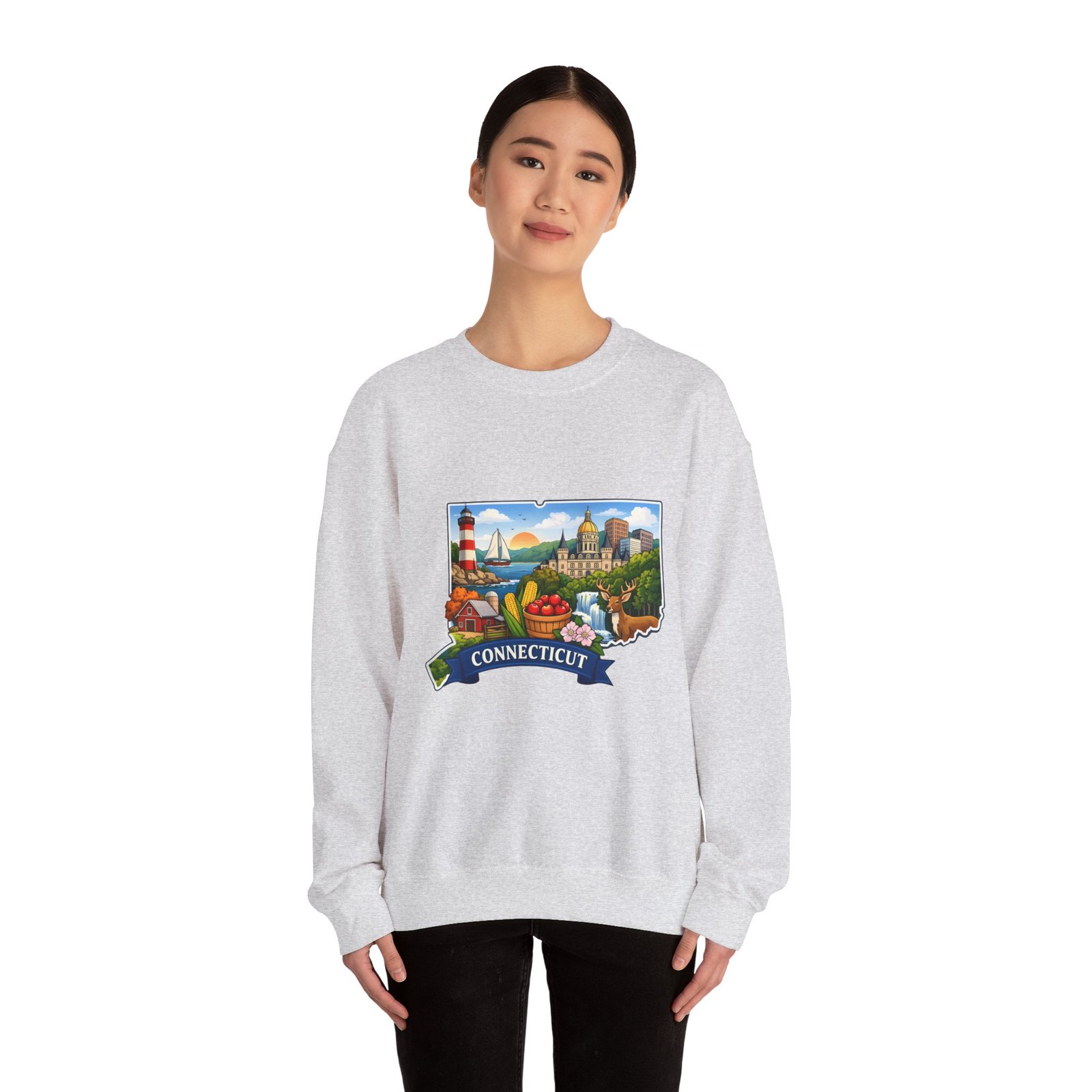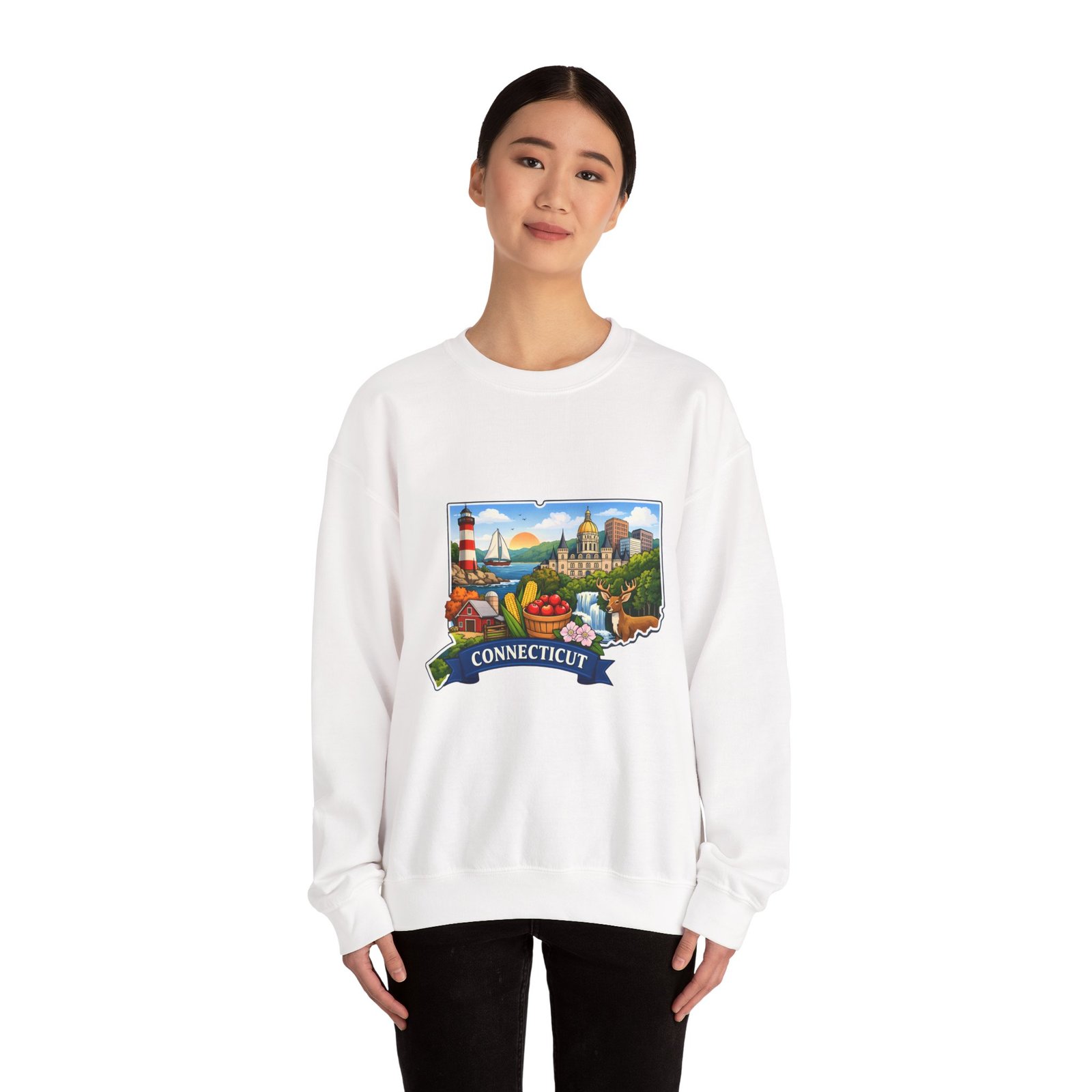 This soft, medium-weight sweatshirt brings a cozy nod to Connecticut wherever you wear it. The classic crew silhouette and ribbed collar hold shape while the 50/50 cotton-poly blend feels warm without bulk. A full-color scenic emblem sits on the chest — lighthouse, shoreline and fall foliage framed by a banner reading “CONNECTICUT” — giving the piece a nostalgic, hometown vibe. Thoughtful construction (tubular knit, double-needle stitching, tear-away label) makes it comfortable for long days of travel, cool evenings on the harbor, or relaxed weekends at home. Subtle durability and quality dyes mean the print stays bright and the garment keeps its shape wash after wash.