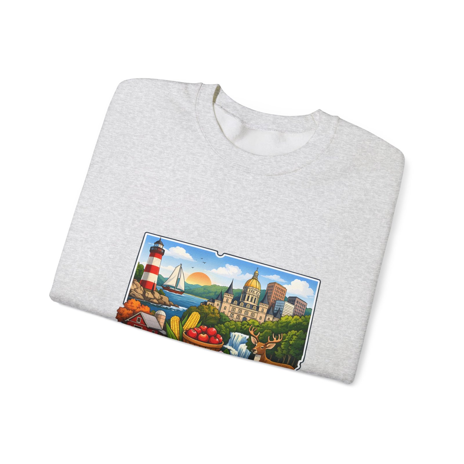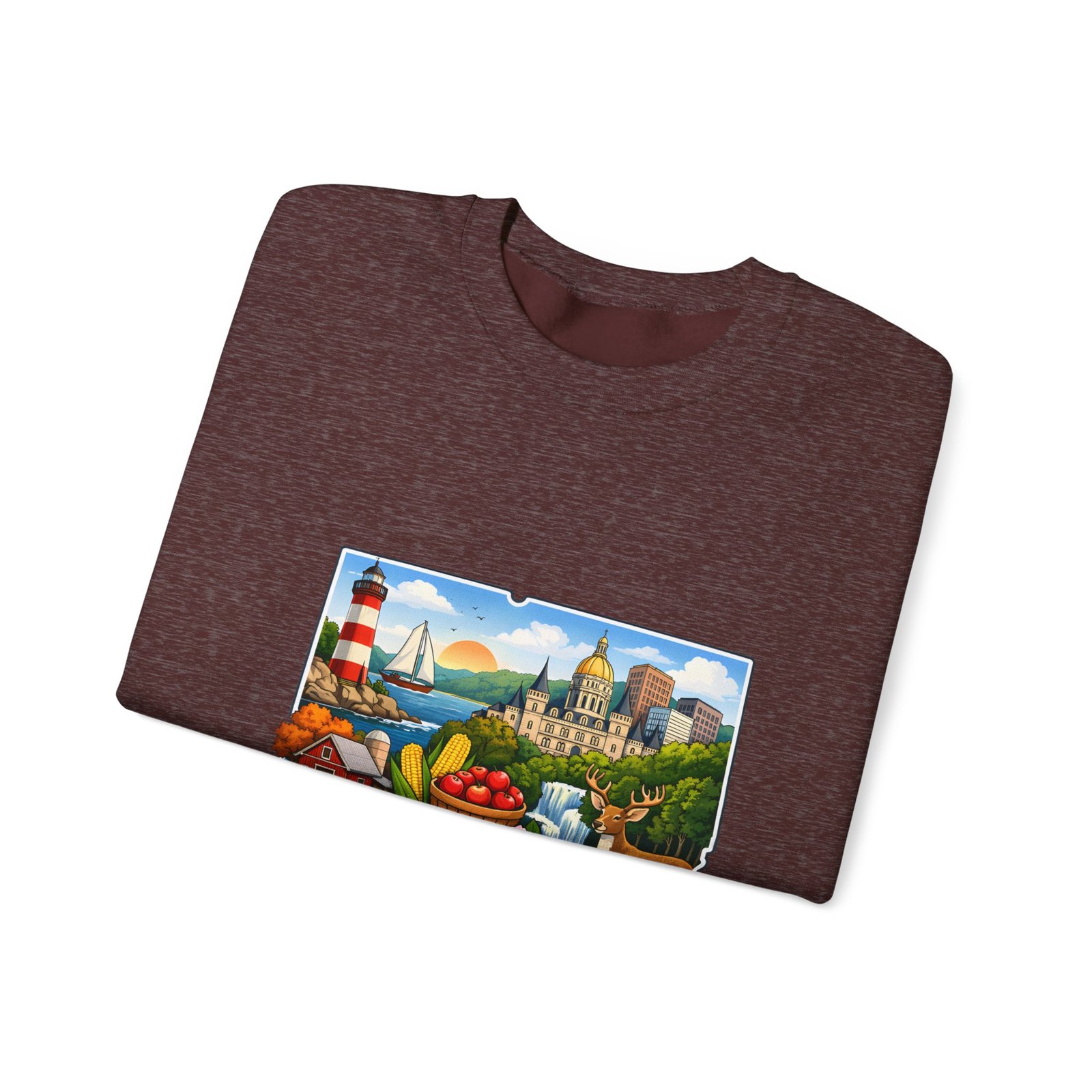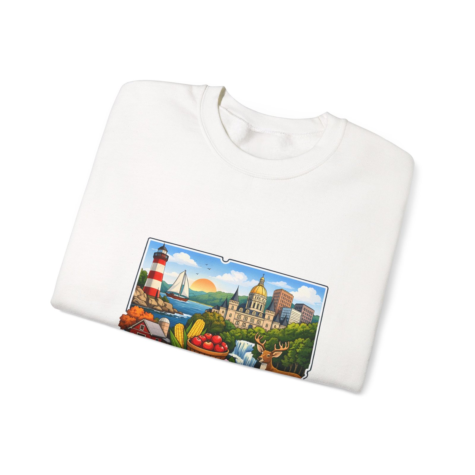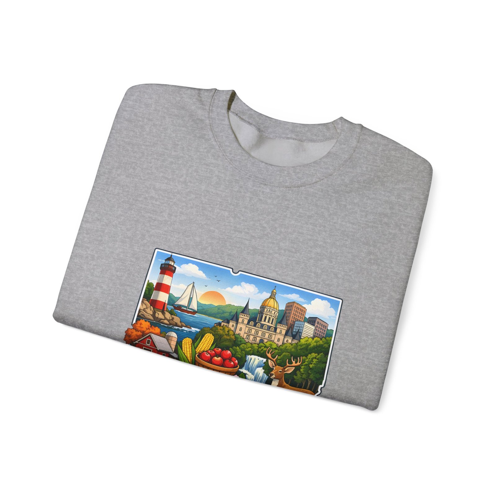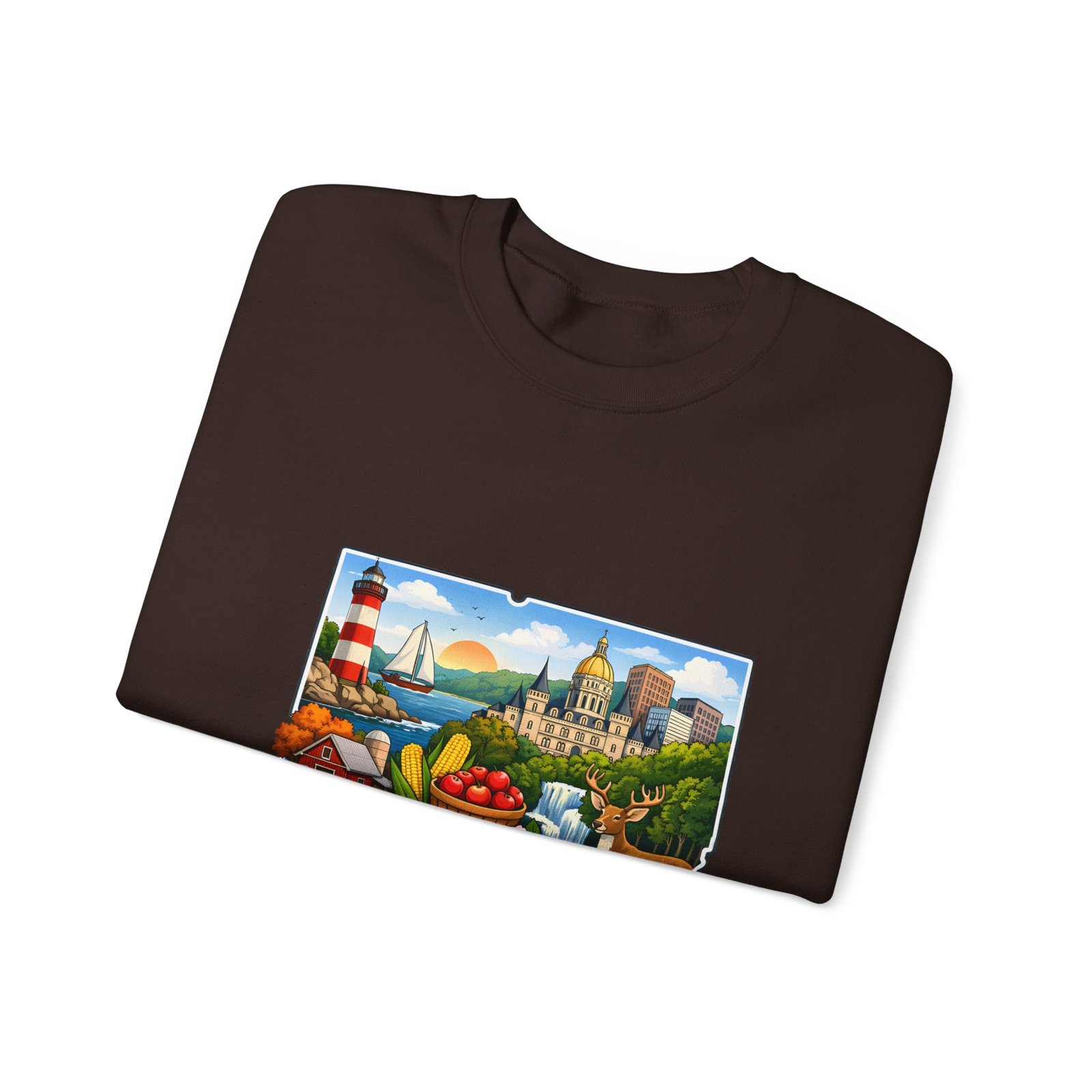 This soft, medium-weight sweatshirt brings a cozy nod to Connecticut wherever you wear it. The classic crew silhouette and ribbed collar hold shape while the 50/50 cotton-poly blend feels warm without bulk. A full-color scenic emblem sits on the chest — lighthouse, shoreline and fall foliage framed by a banner reading “CONNECTICUT” — giving the piece a nostalgic, hometown vibe. Thoughtful construction (tubular knit, double-needle stitching, tear-away label) makes it comfortable for long days of travel, cool evenings on the harbor, or relaxed weekends at home. Subtle durability and quality dyes mean the print stays bright and the garment keeps its shape wash after wash.