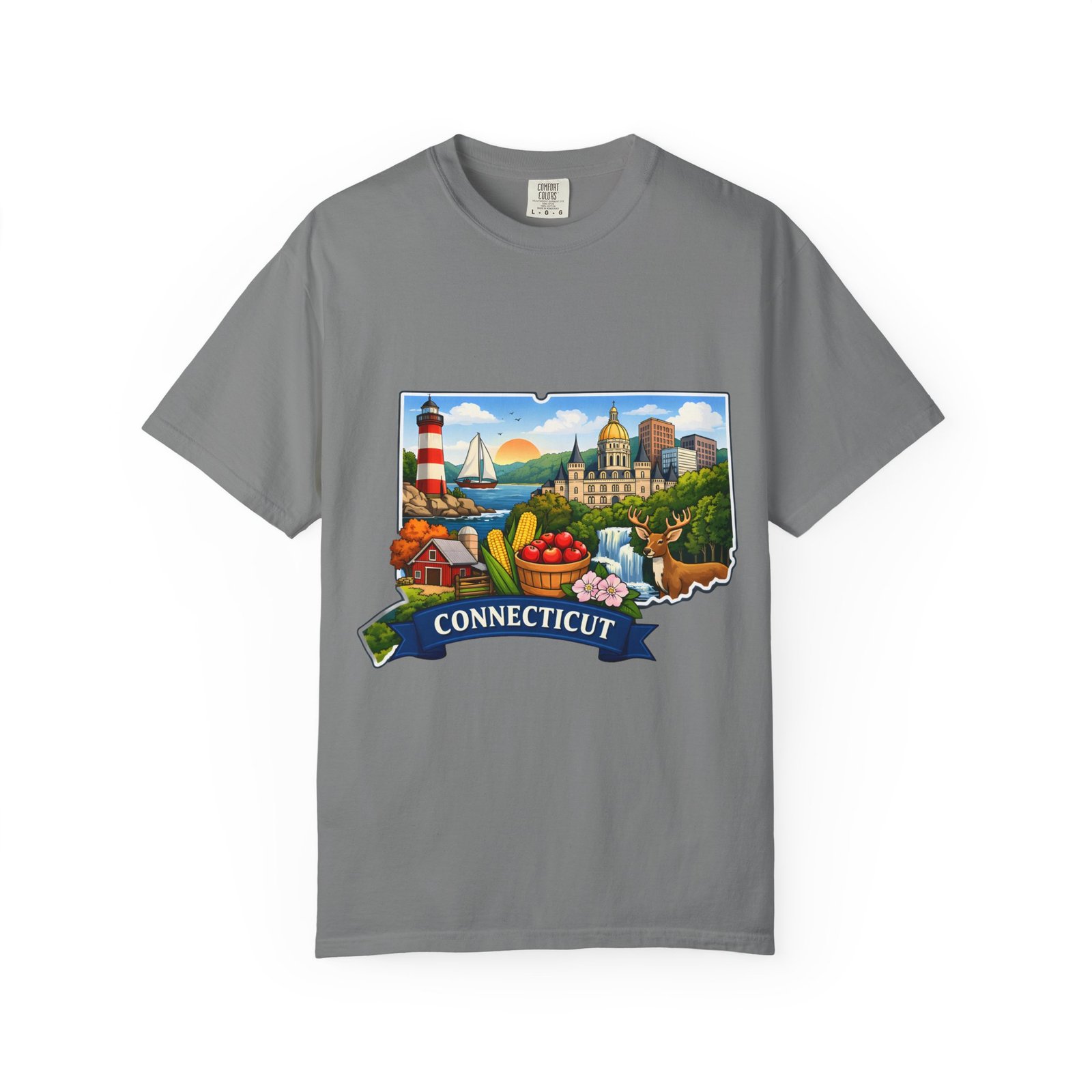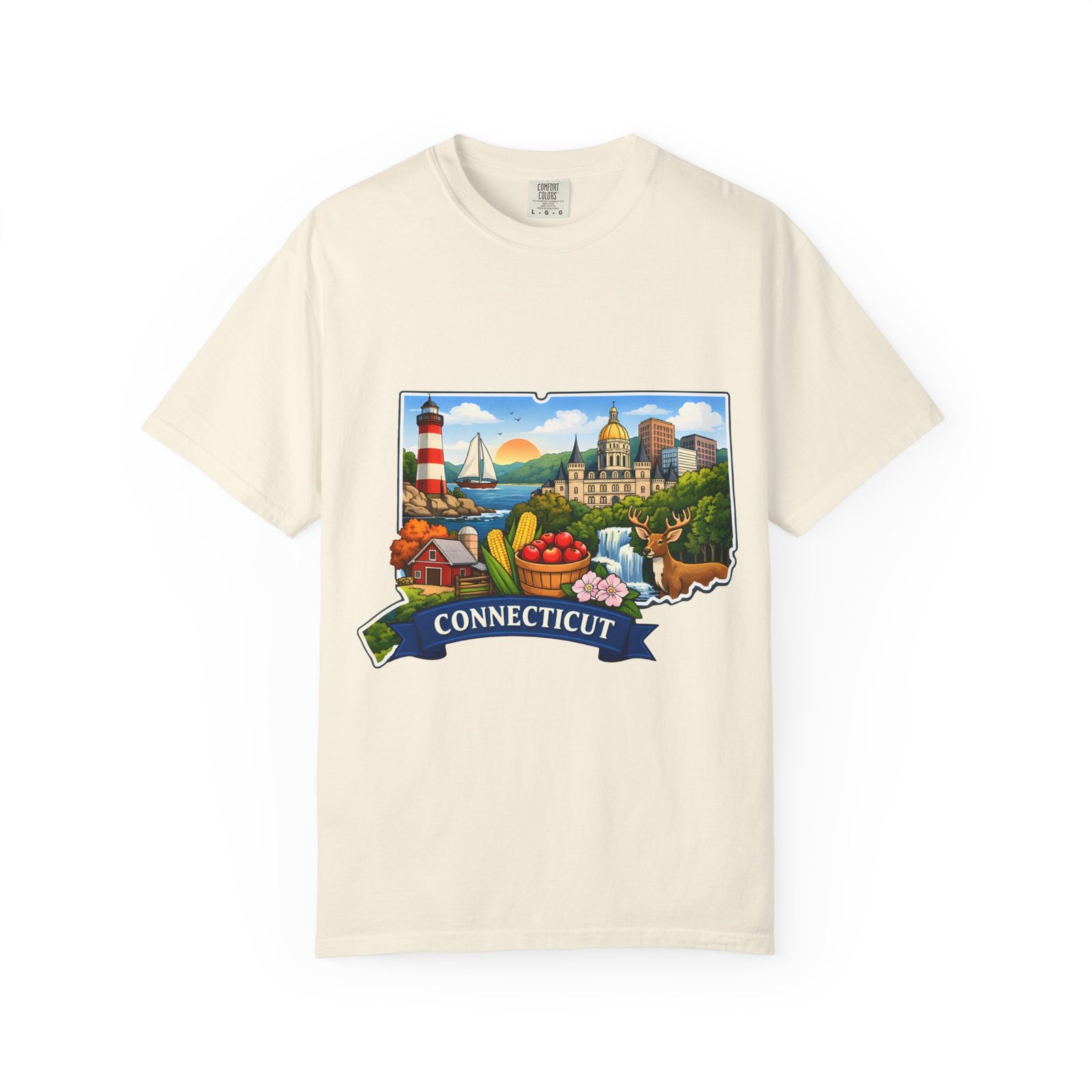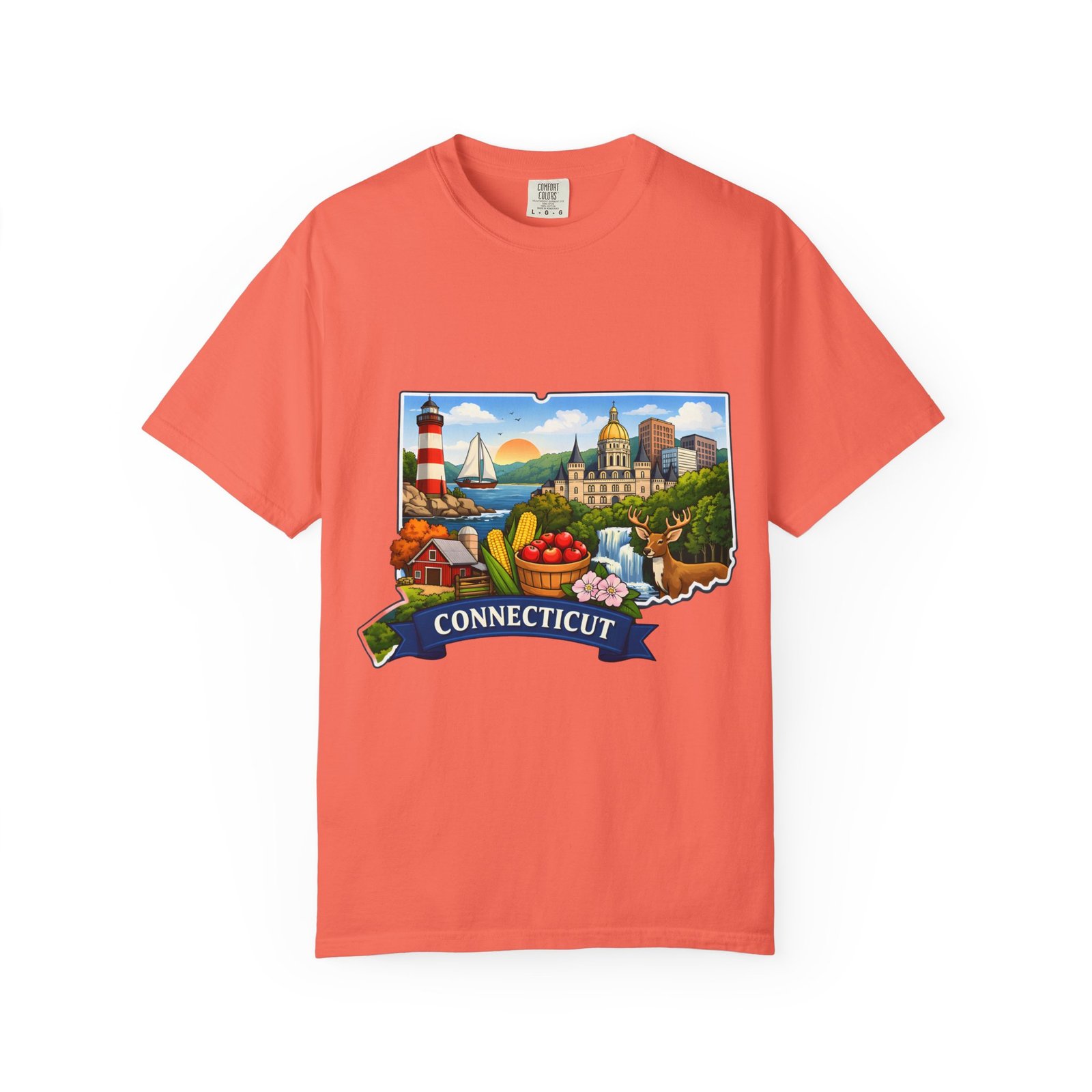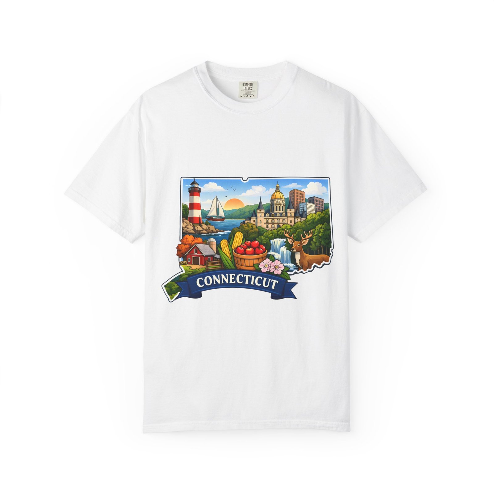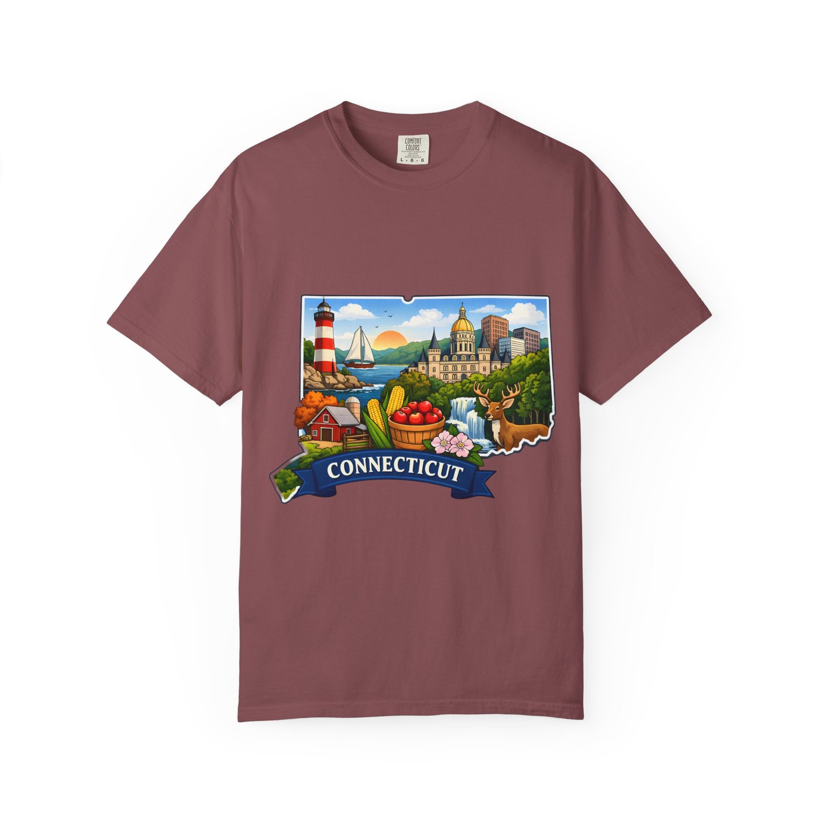 This relaxed, garment-dyed tee brings a sunlit slice of Connecticut to everyday wear. The soft, lived-in color and heavyweight cotton feel like a favorite you’ve owned for years, while the vibrant state-themed graphic—lighthouses, sailboats, orchards and a ribbon reading “CONNECTICUT”—adds cheerful local pride. Wear it to stroll coastal walkways, run weekend errands, or layer under a flannel for cooler nights. The roomy cut and sturdy construction mean it moves with you and holds up wash after wash, becoming part of your regular rotation rather than taking up space in the closet.