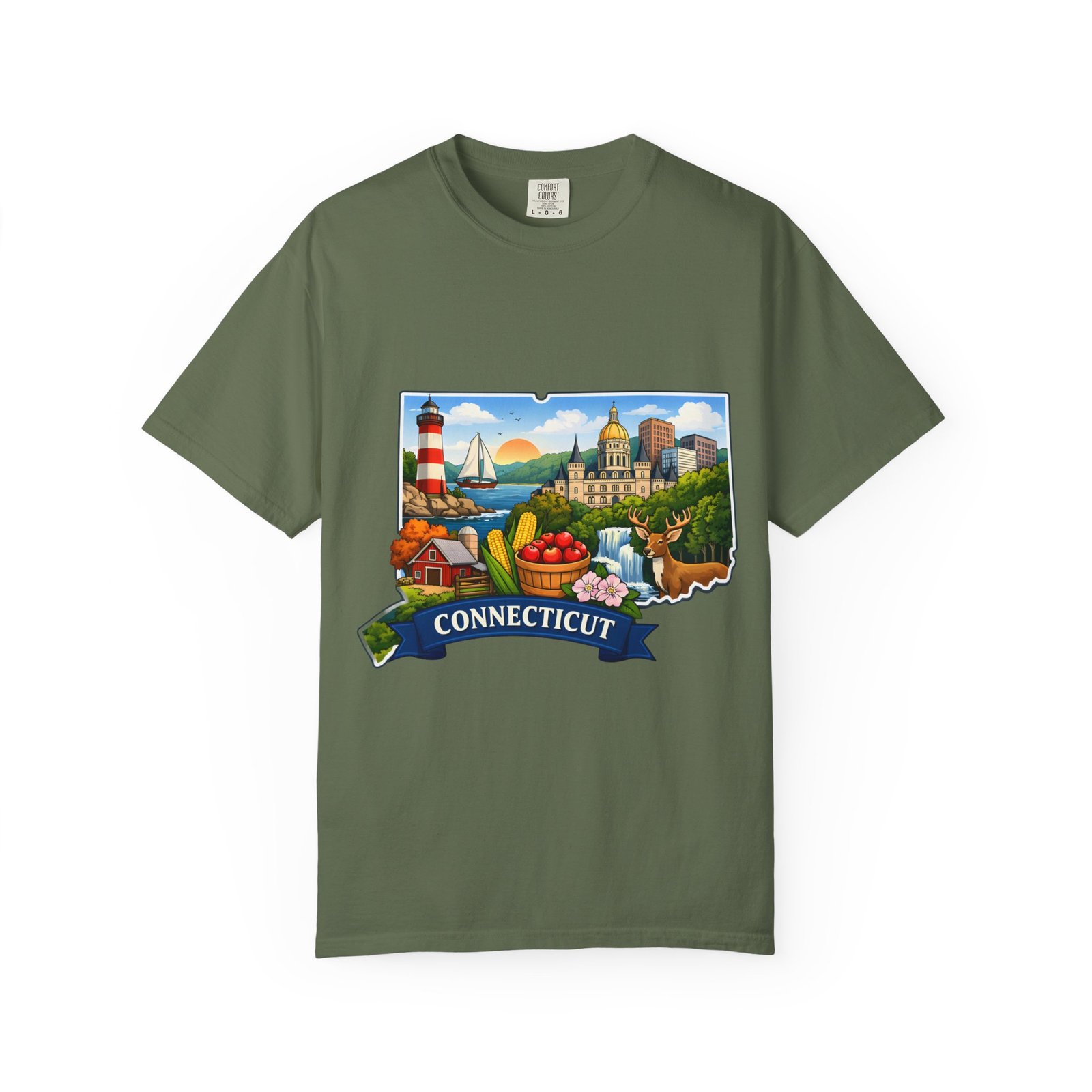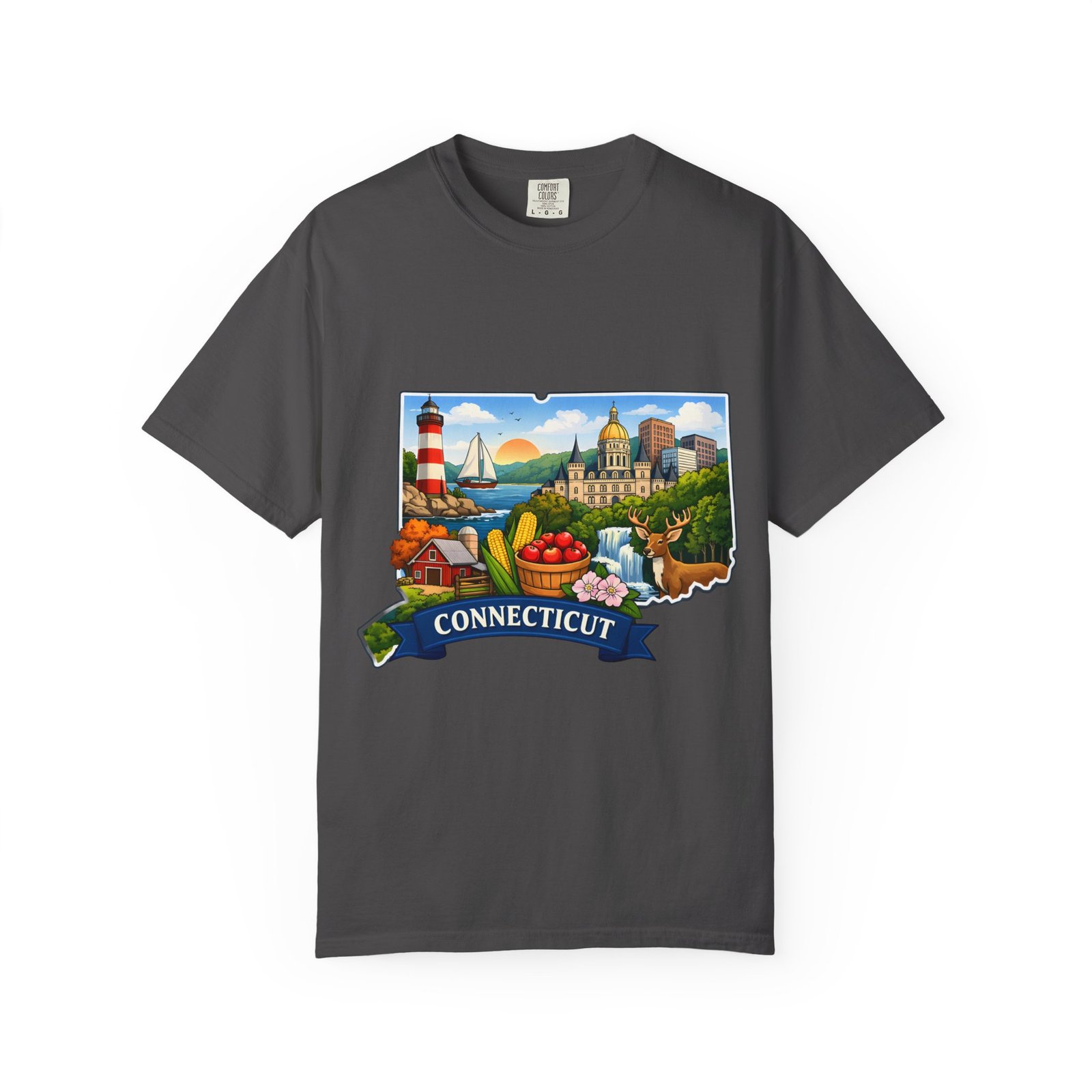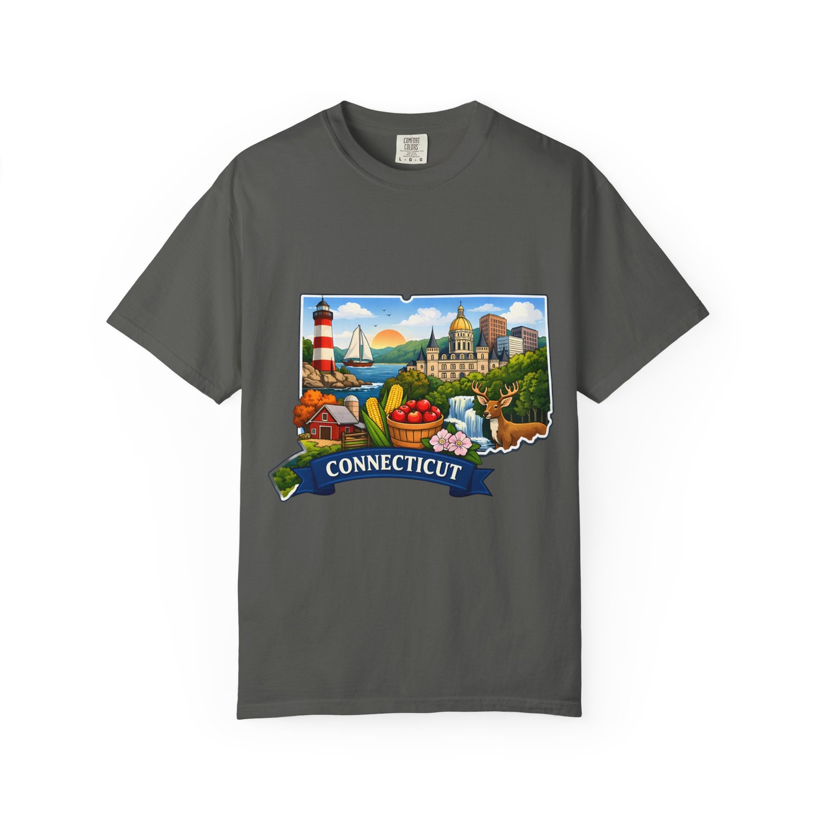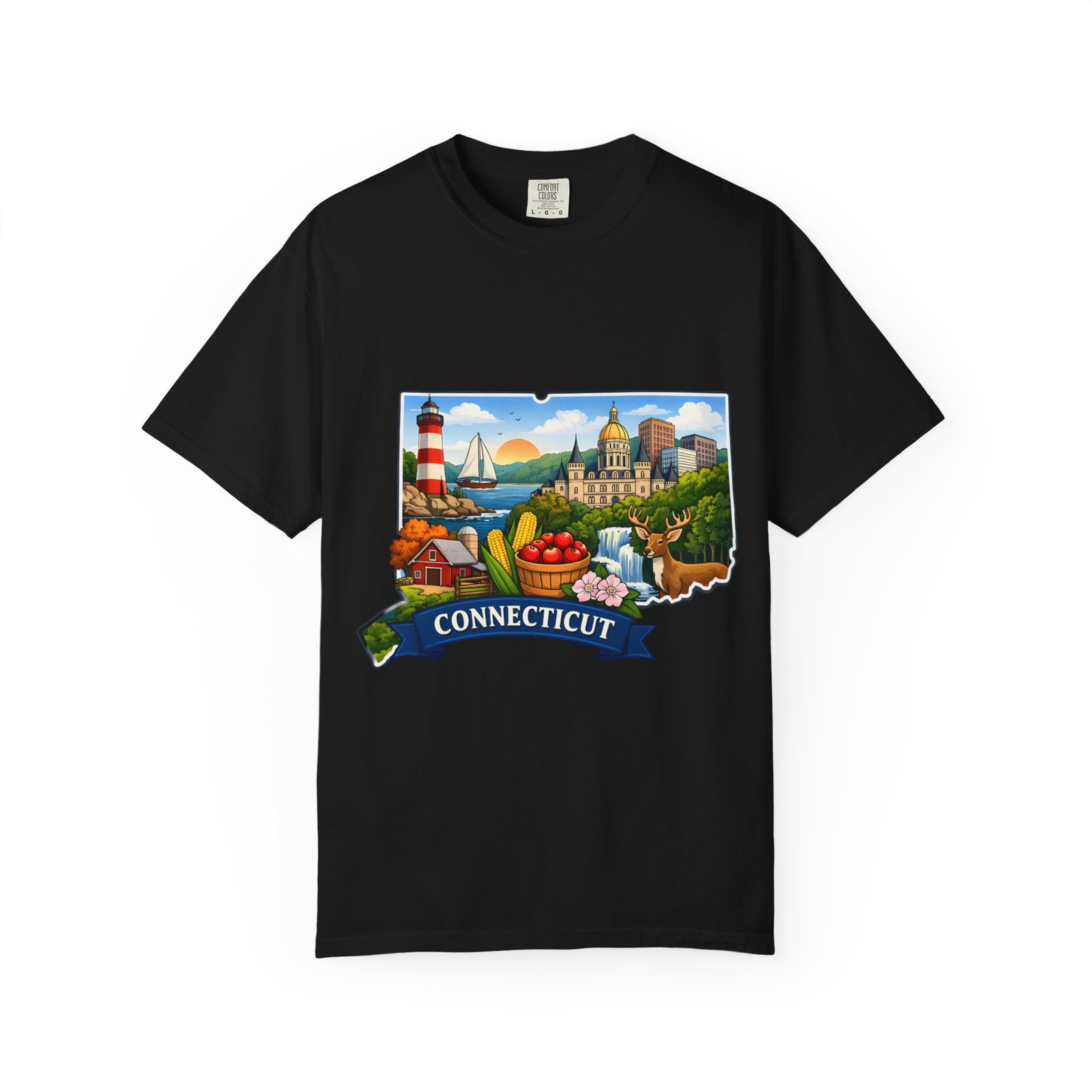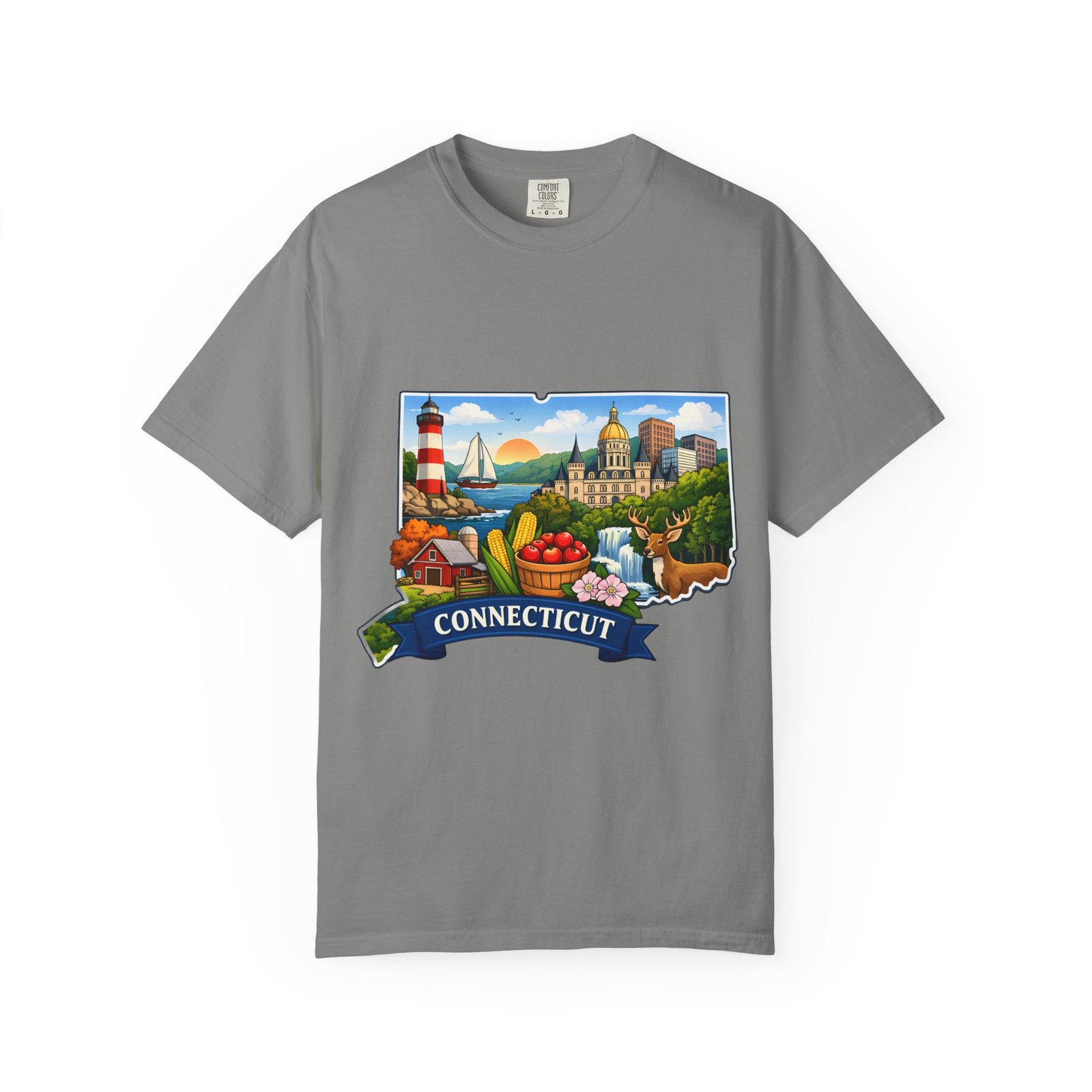 This relaxed, garment-dyed tee brings a sunlit slice of Connecticut to everyday wear. The soft, lived-in color and heavyweight cotton feel like a favorite you’ve owned for years, while the vibrant state-themed graphic—lighthouses, sailboats, orchards and a ribbon reading “CONNECTICUT”—adds cheerful local pride. Wear it to stroll coastal walkways, run weekend errands, or layer under a flannel for cooler nights. The roomy cut and sturdy construction mean it moves with you and holds up wash after wash, becoming part of your regular rotation rather than taking up space in the closet.