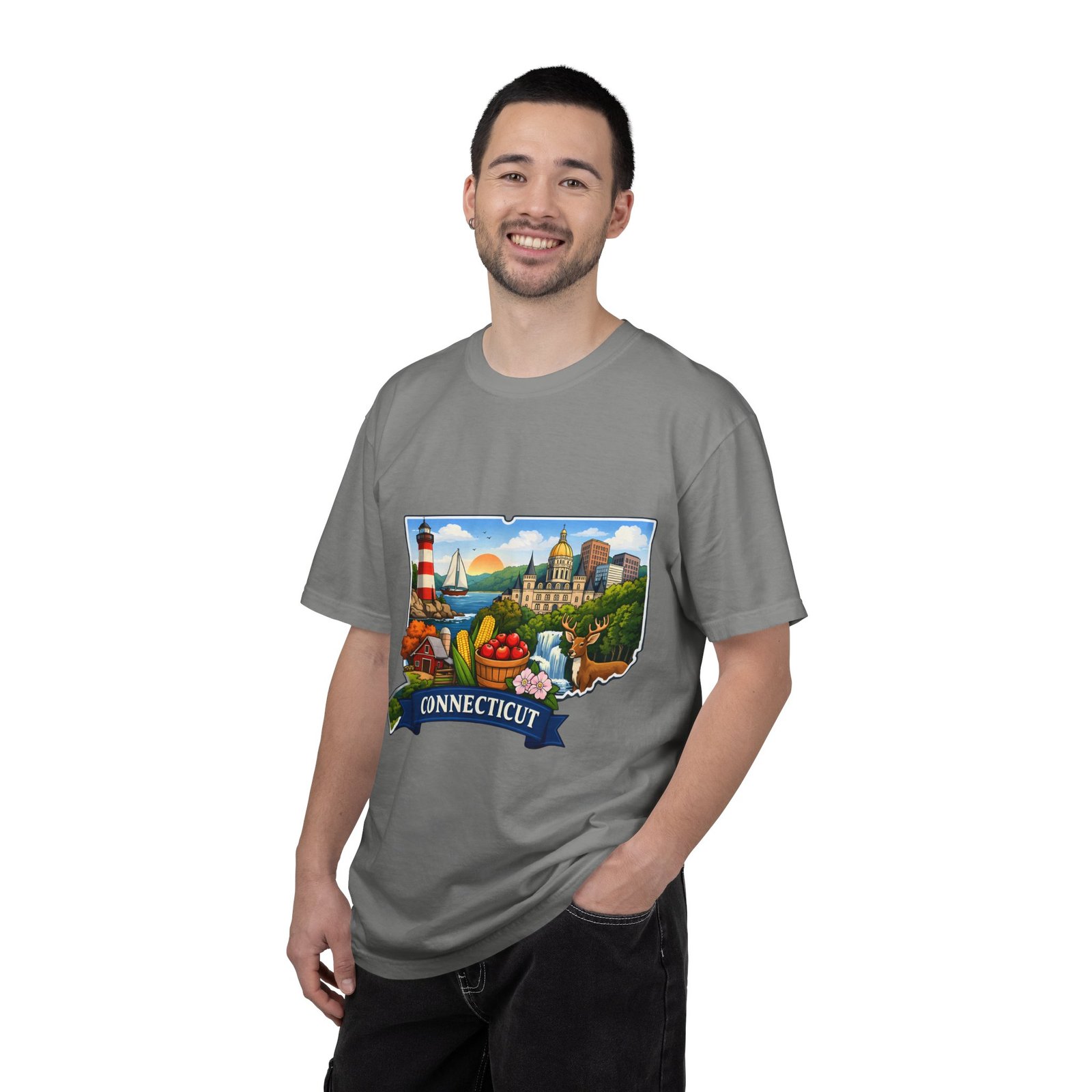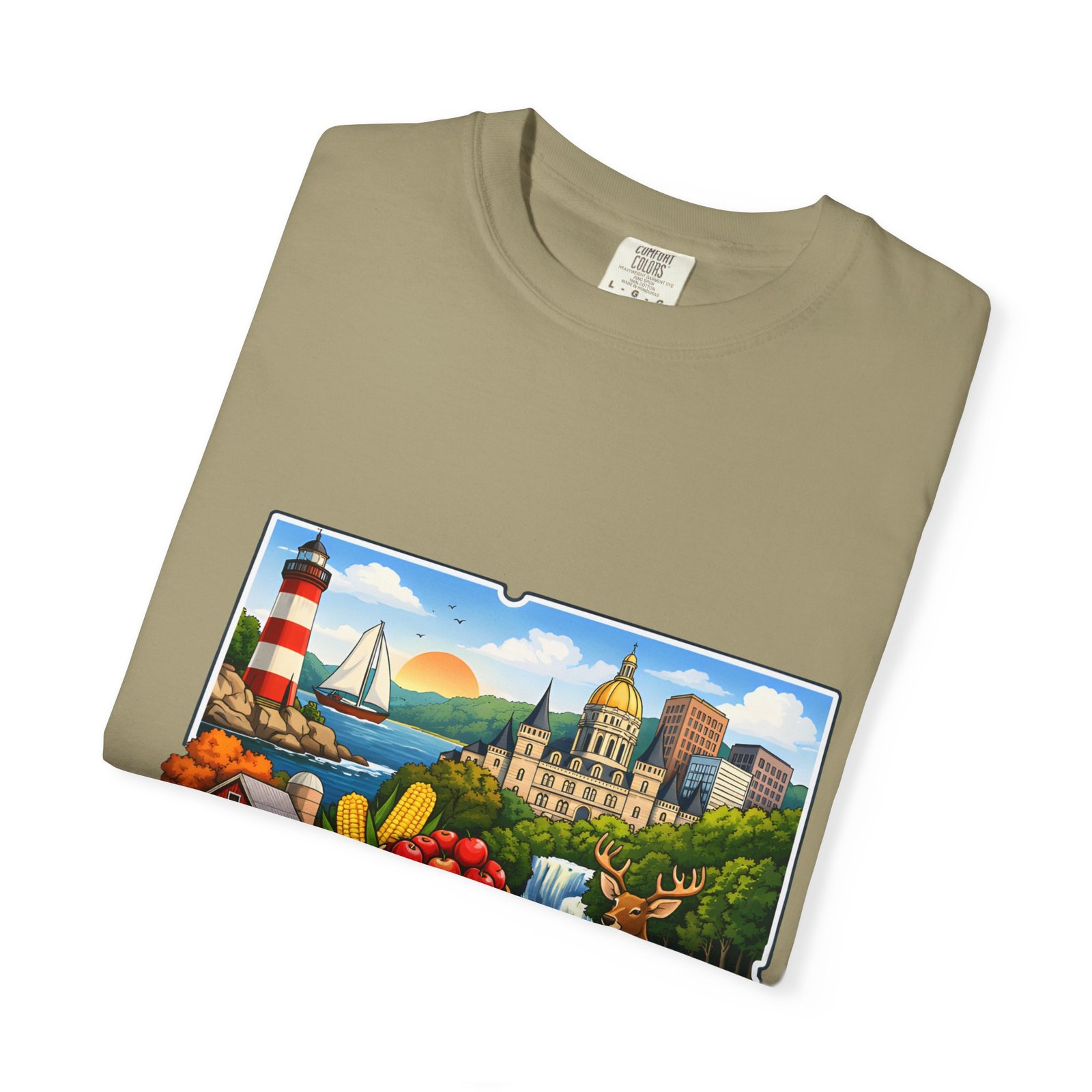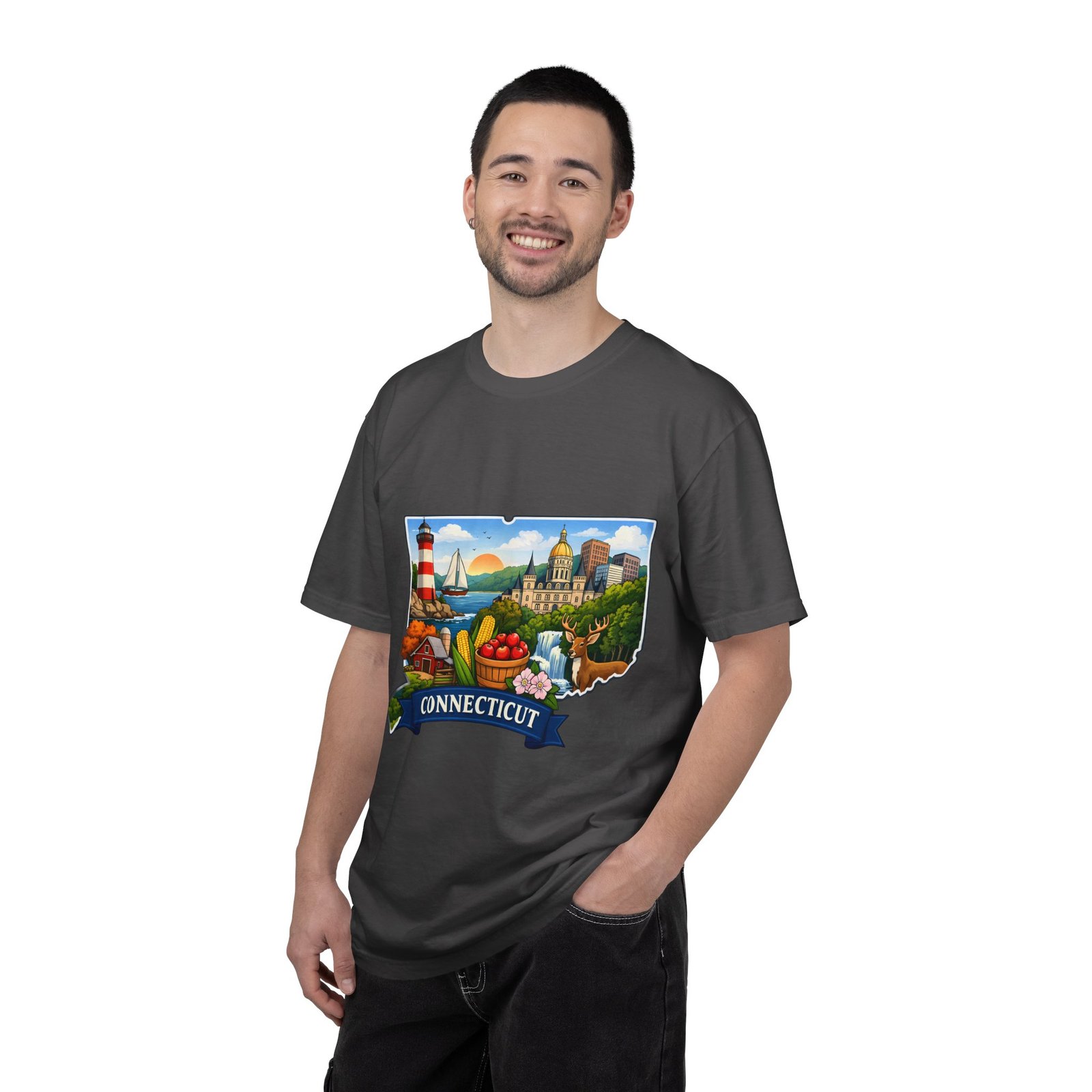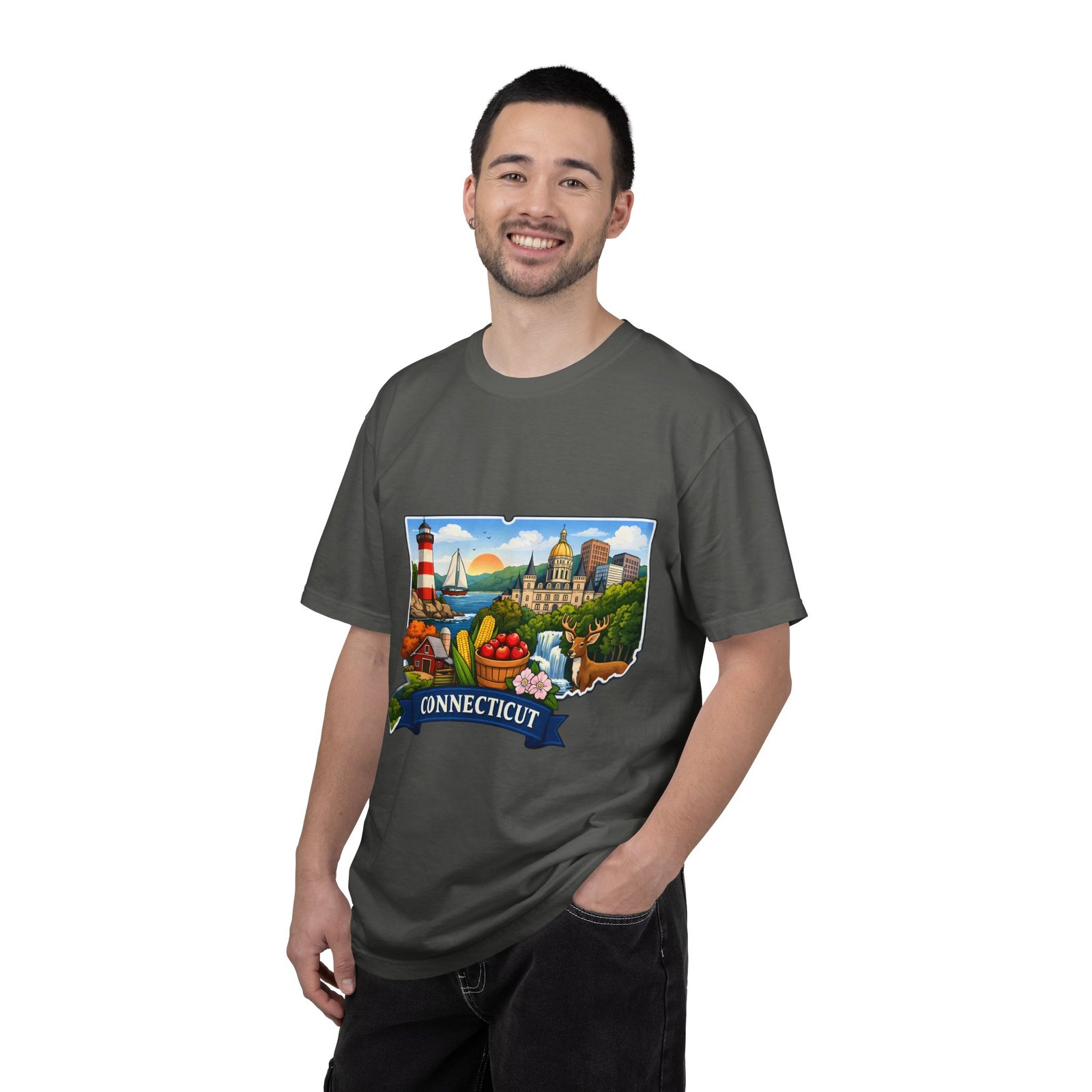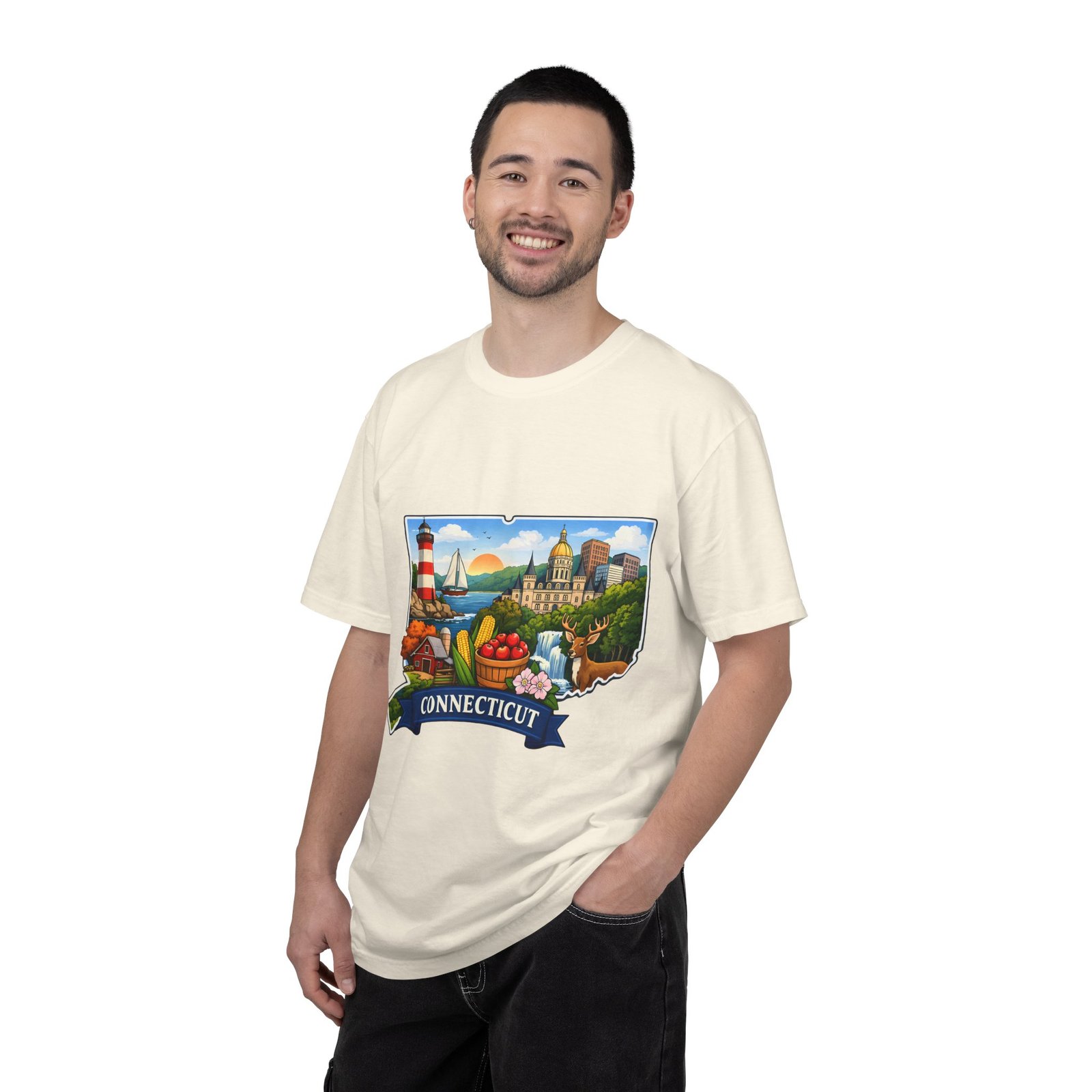 This relaxed, garment-dyed tee brings a sunlit slice of Connecticut to everyday wear. The soft, lived-in color and heavyweight cotton feel like a favorite you’ve owned for years, while the vibrant state-themed graphic—lighthouses, sailboats, orchards and a ribbon reading “CONNECTICUT”—adds cheerful local pride. Wear it to stroll coastal walkways, run weekend errands, or layer under a flannel for cooler nights. The roomy cut and sturdy construction mean it moves with you and holds up wash after wash, becoming part of your regular rotation rather than taking up space in the closet.