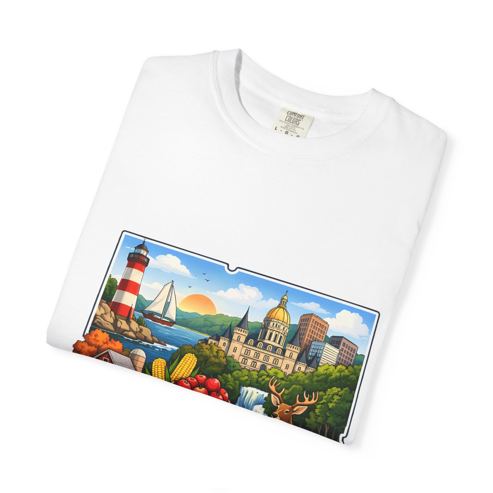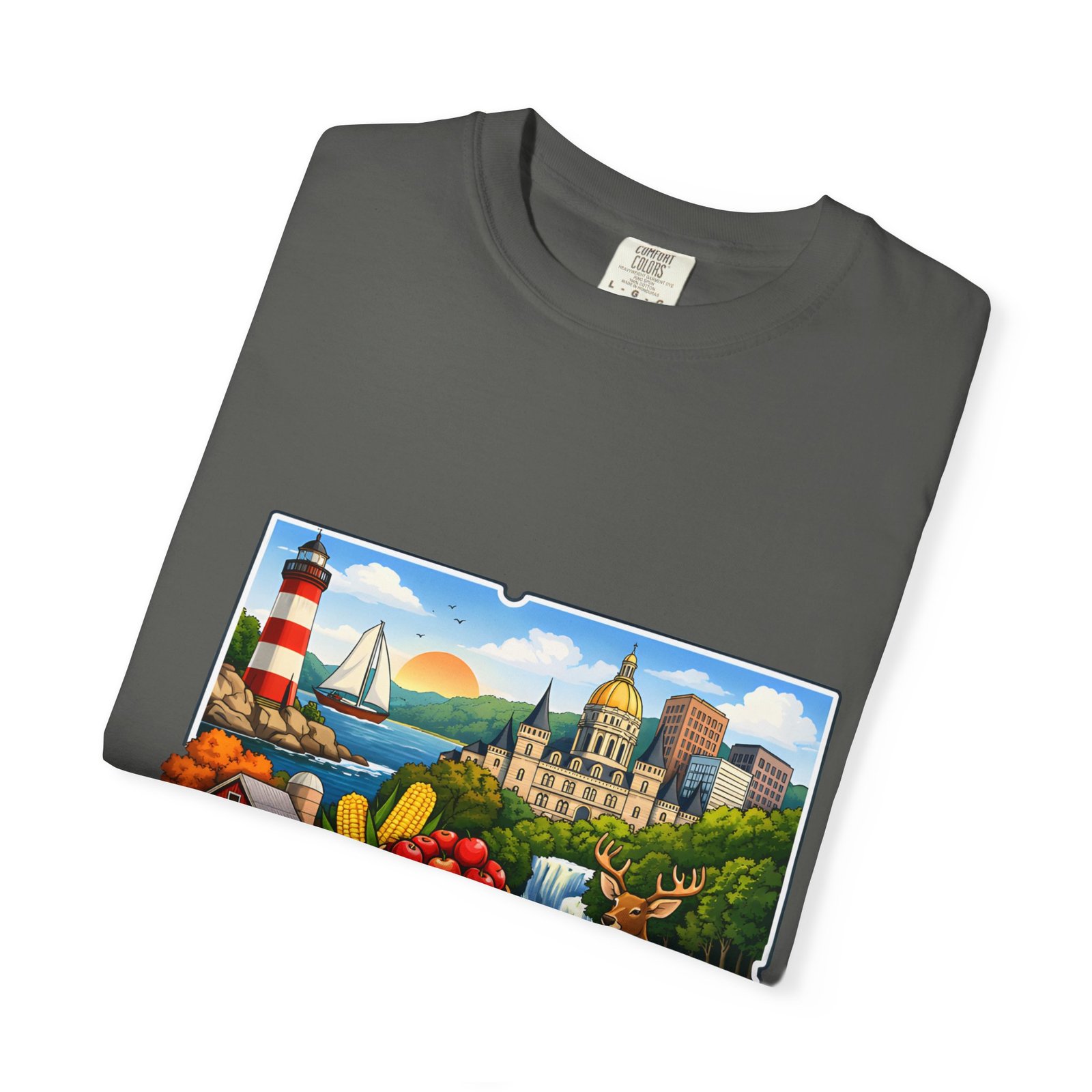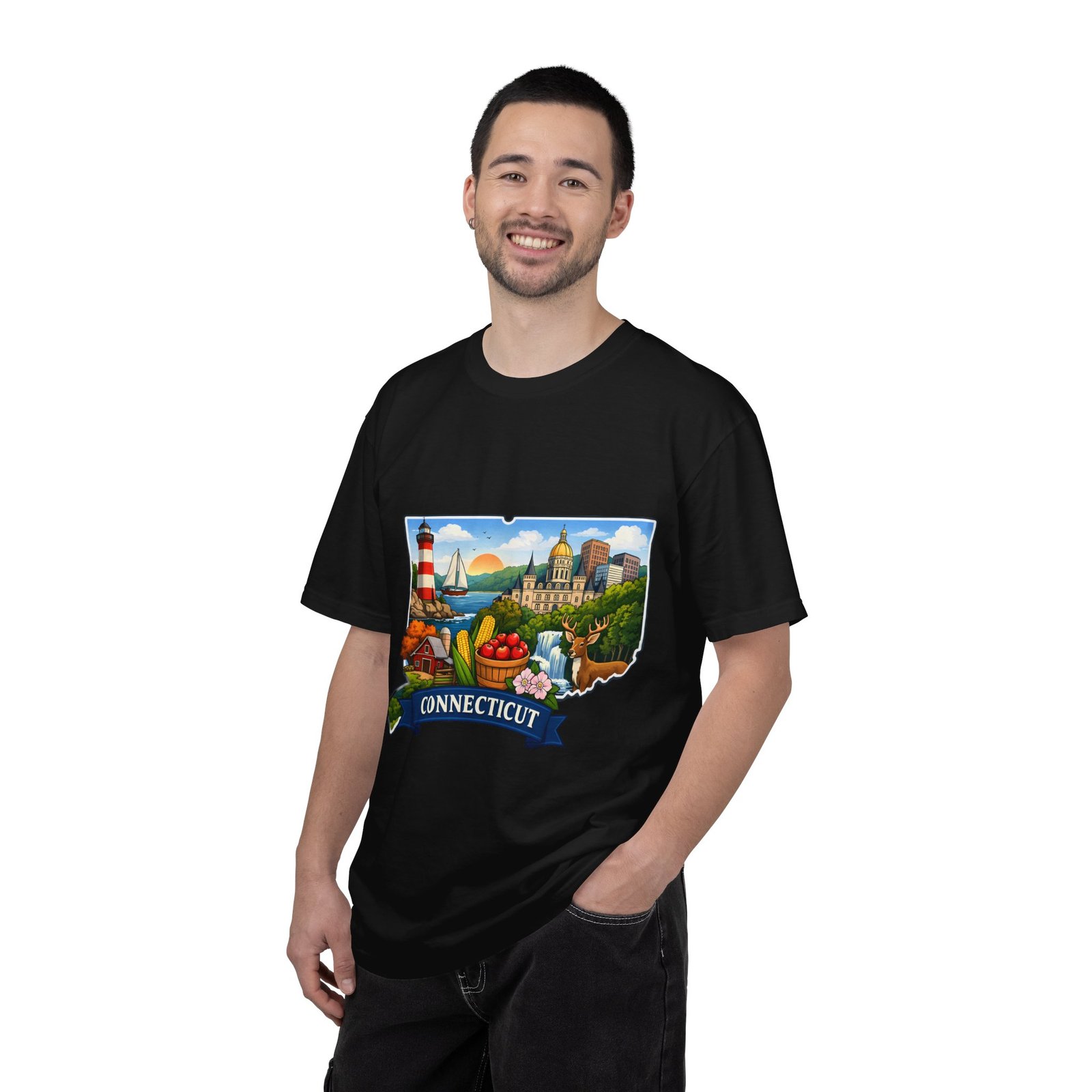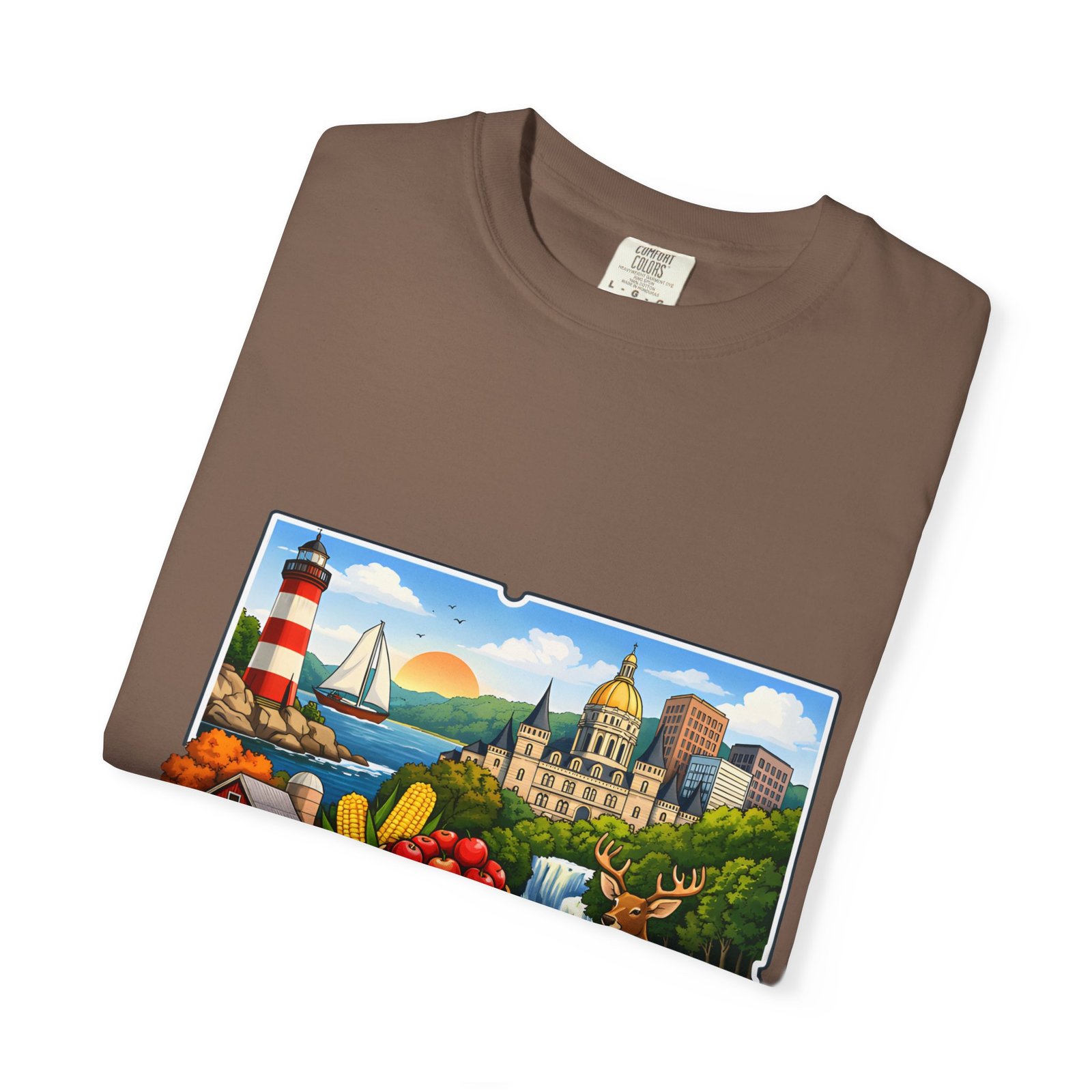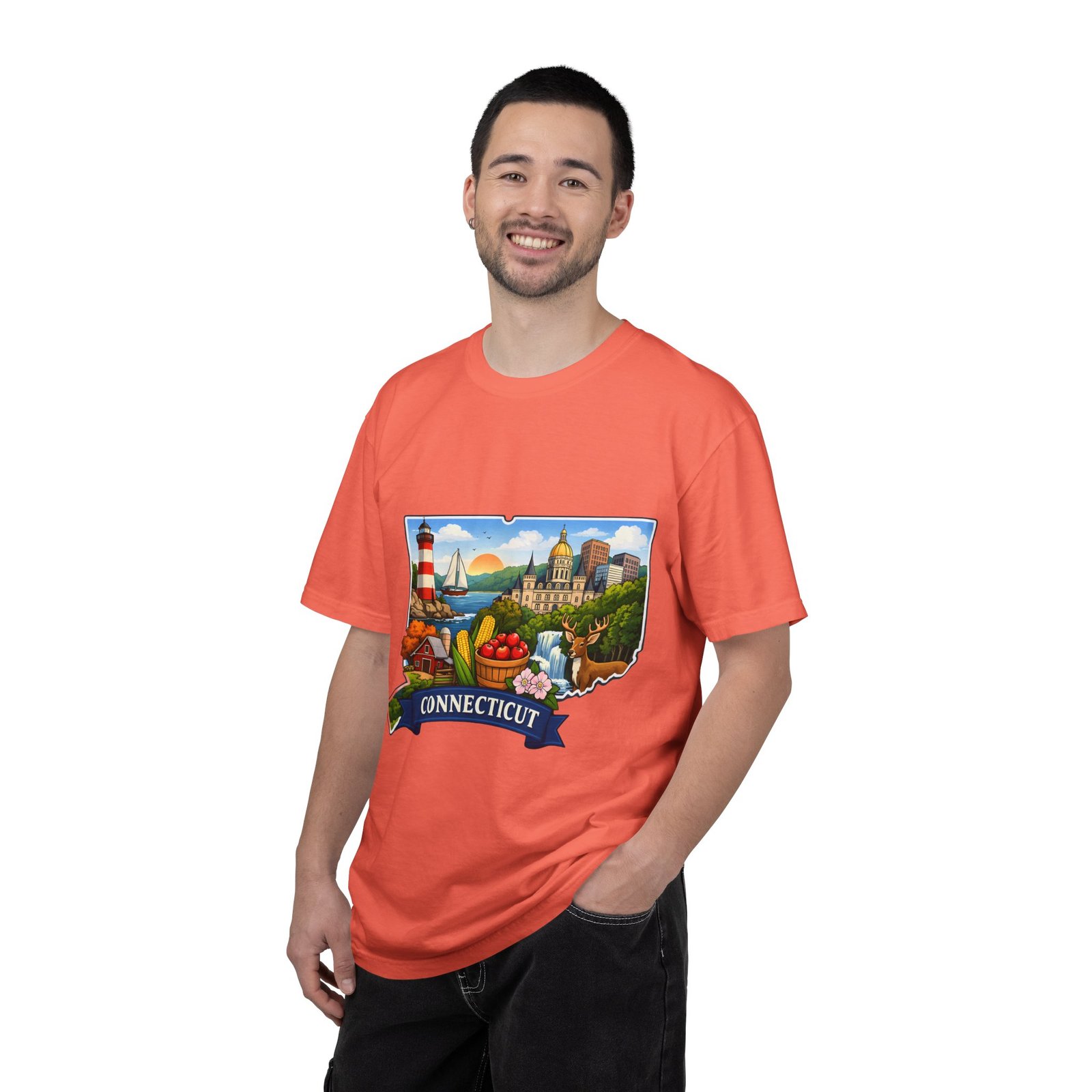 This relaxed, garment-dyed tee brings a sunlit slice of Connecticut to everyday wear. The soft, lived-in color and heavyweight cotton feel like a favorite you’ve owned for years, while the vibrant state-themed graphic—lighthouses, sailboats, orchards and a ribbon reading “CONNECTICUT”—adds cheerful local pride. Wear it to stroll coastal walkways, run weekend errands, or layer under a flannel for cooler nights. The roomy cut and sturdy construction mean it moves with you and holds up wash after wash, becoming part of your regular rotation rather than taking up space in the closet.