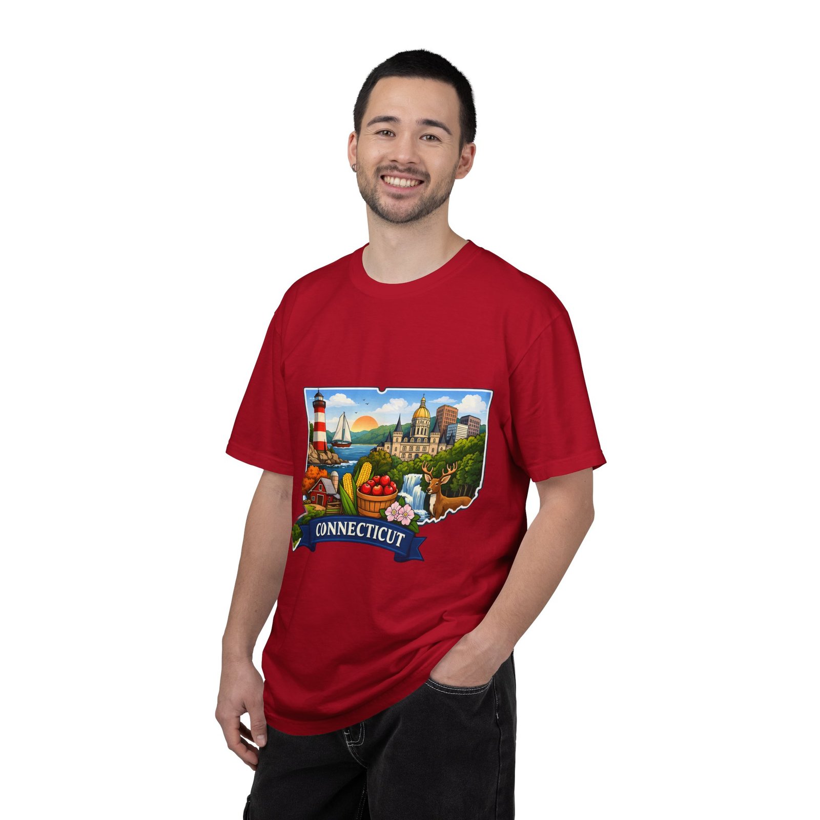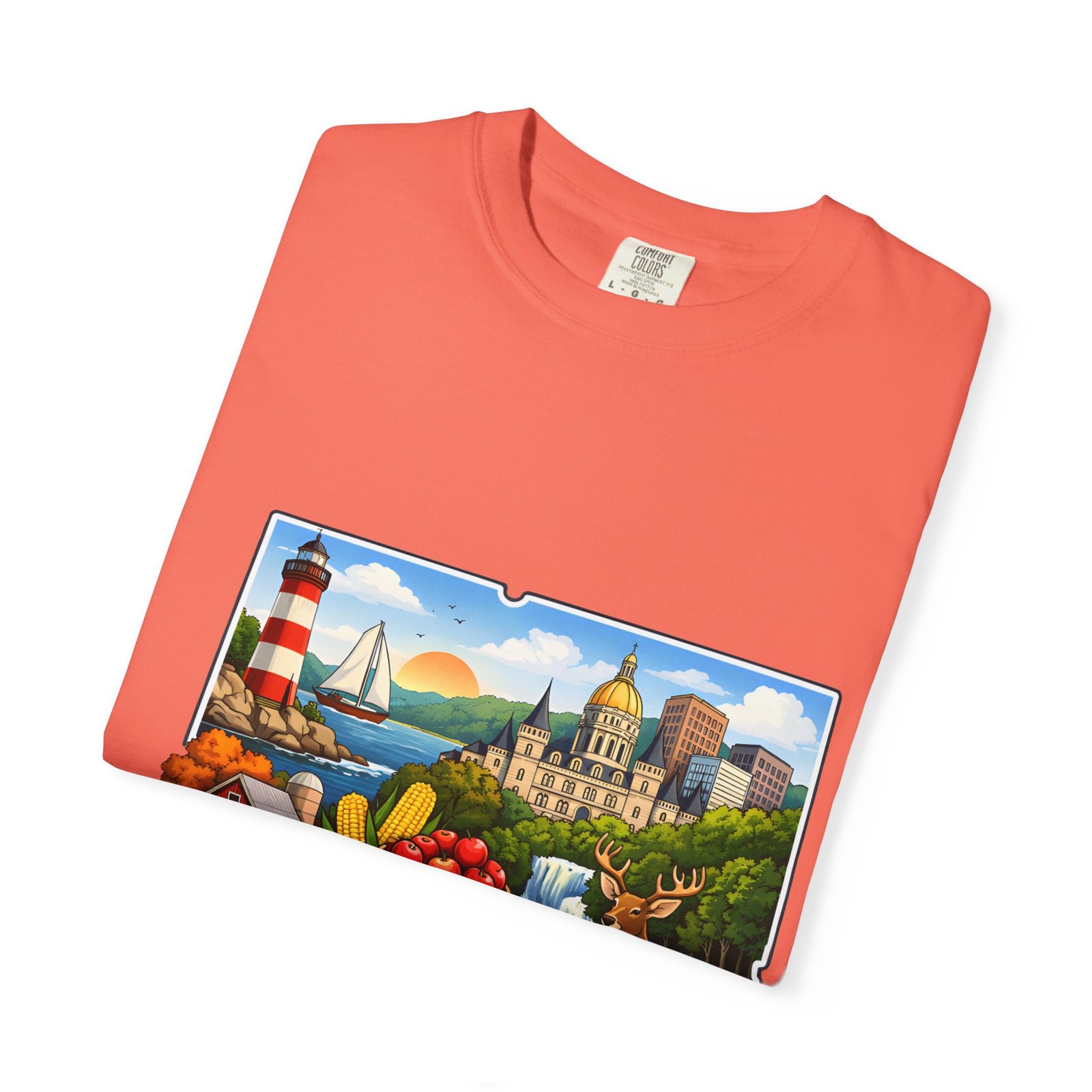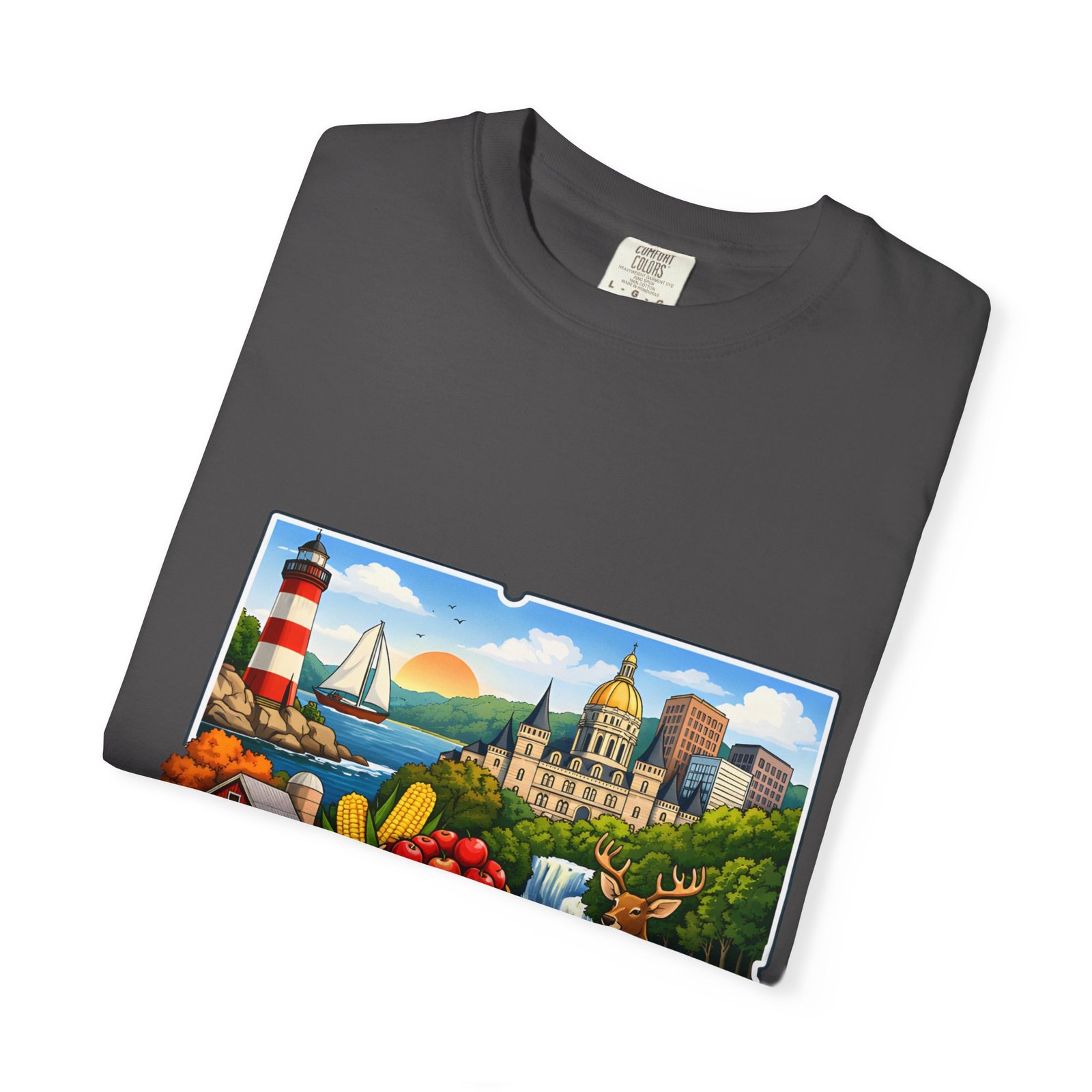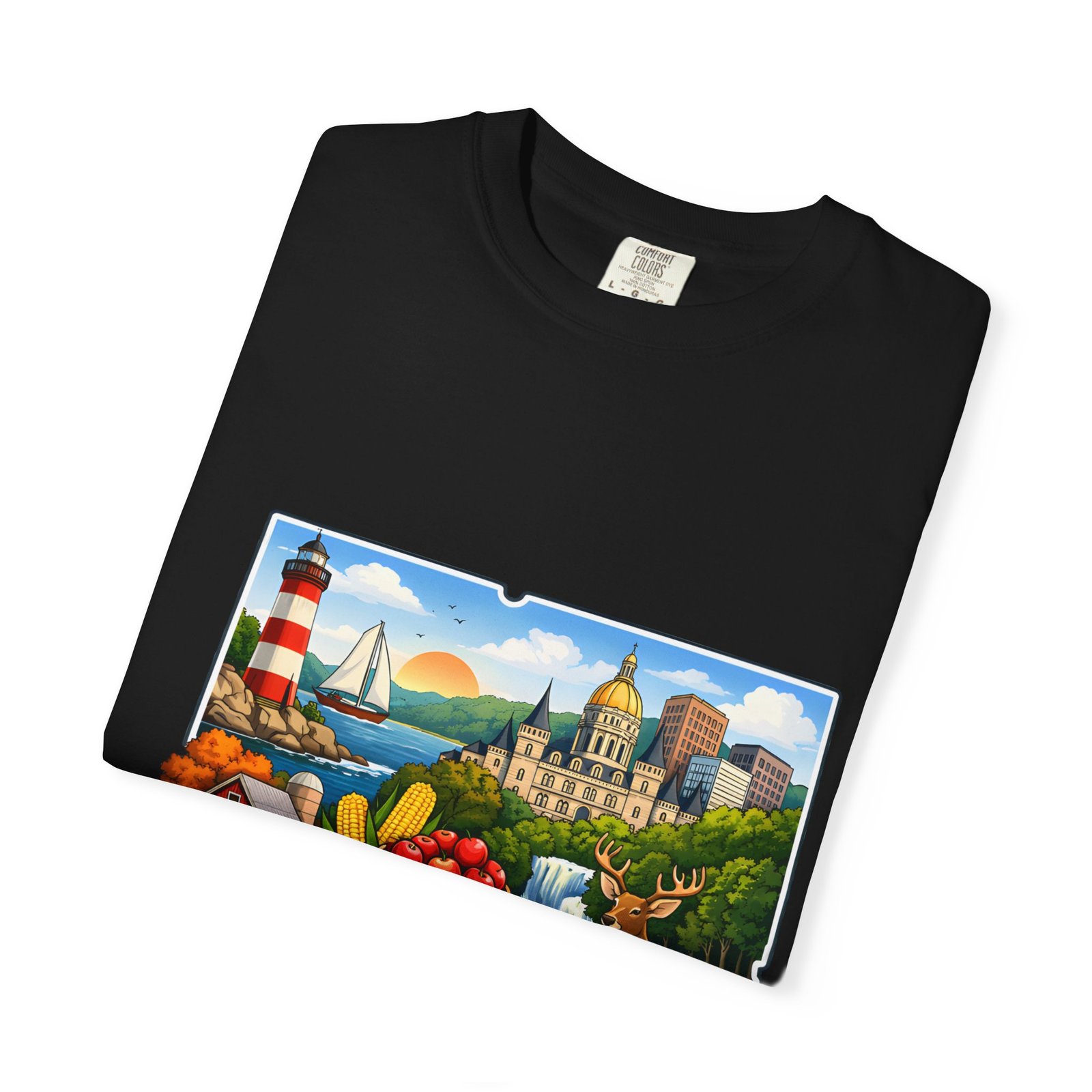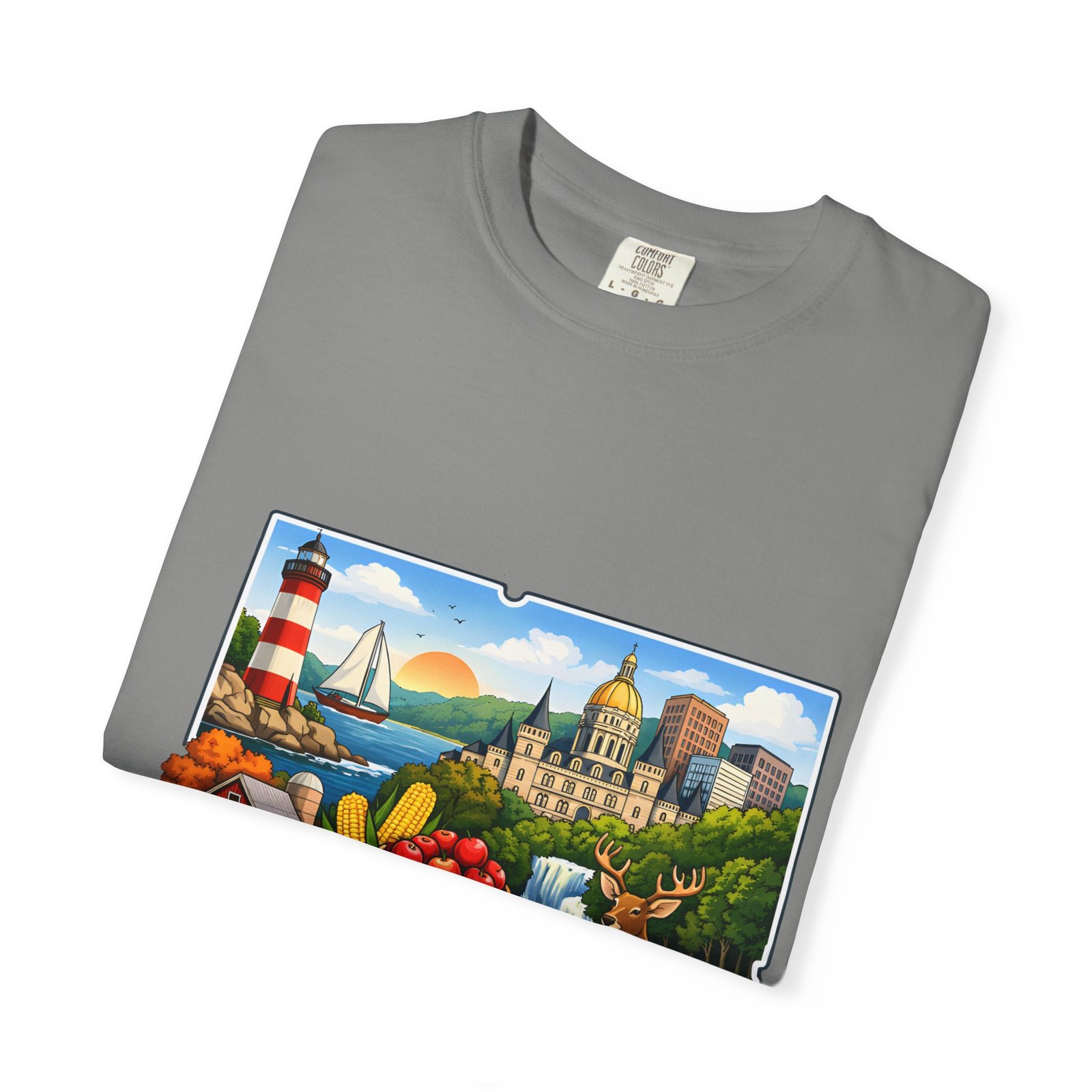 This relaxed, garment-dyed tee brings a sunlit slice of Connecticut to everyday wear. The soft, lived-in color and heavyweight cotton feel like a favorite you’ve owned for years, while the vibrant state-themed graphic—lighthouses, sailboats, orchards and a ribbon reading “CONNECTICUT”—adds cheerful local pride. Wear it to stroll coastal walkways, run weekend errands, or layer under a flannel for cooler nights. The roomy cut and sturdy construction mean it moves with you and holds up wash after wash, becoming part of your regular rotation rather than taking up space in the closet.