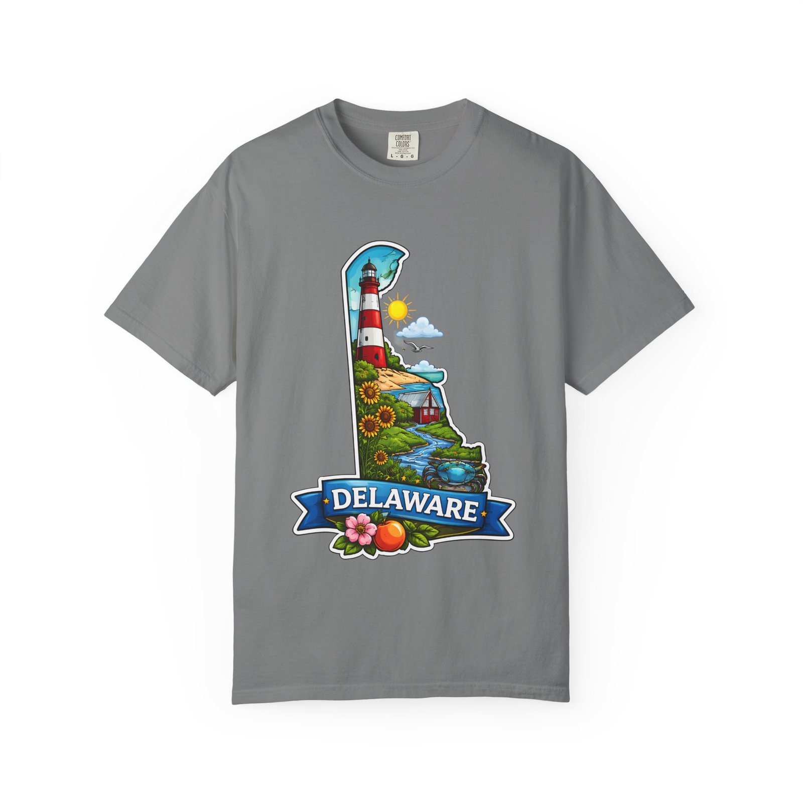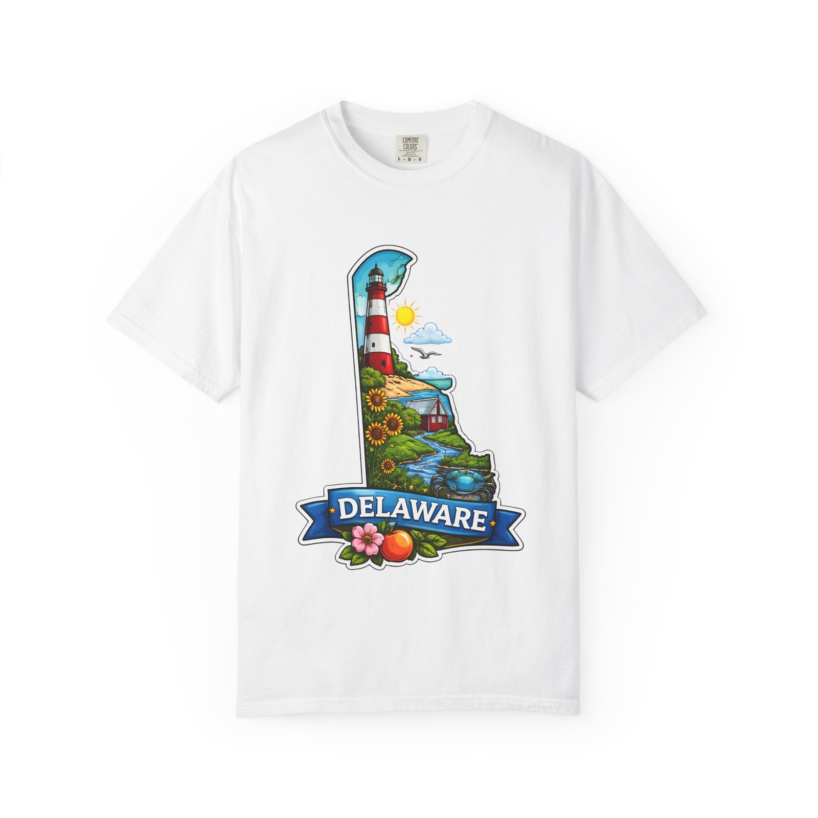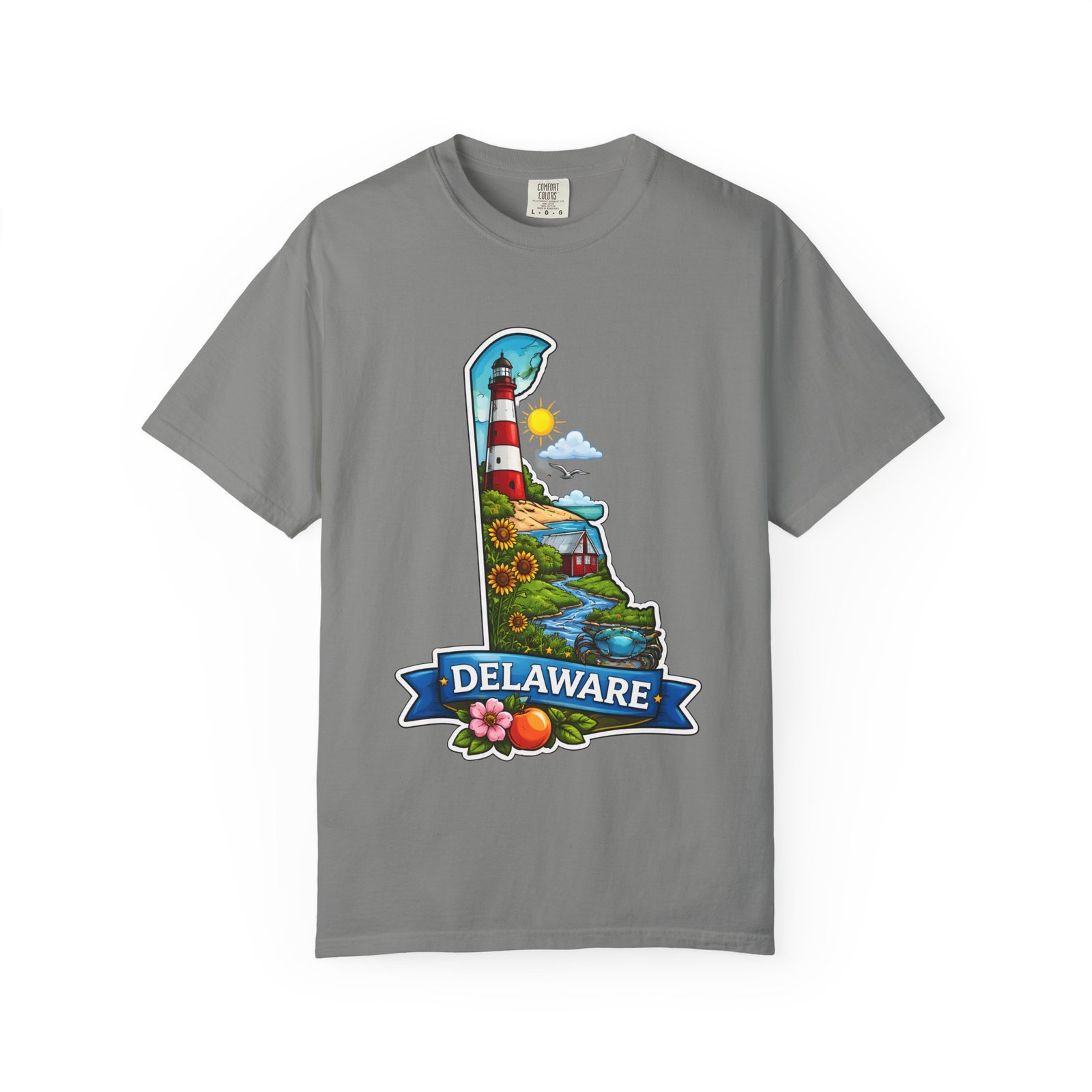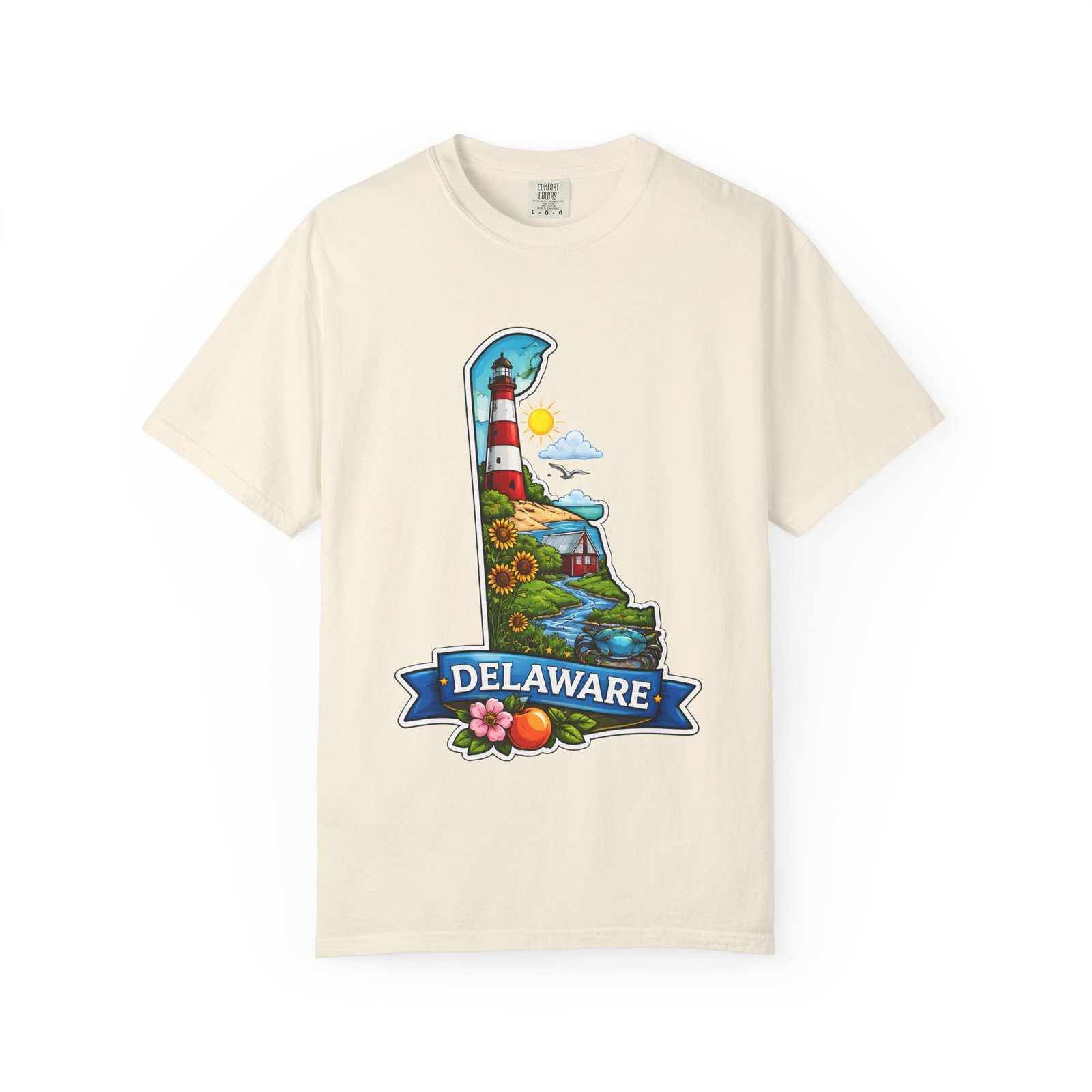 This garment-dyed tee brings a sunlit Delaware coastline to everyday wear. The soft, broken-in fabric and relaxed cut make it feel like a favorite from the first wear. The front artwork — a playful Delaware-shaped scene with lighthouse, beaches, farmland and bright banner — reads like a small travel poster worn close to the heart. Wear it to morning coffee runs, weekend drives to the shore, or backyard cookouts where conversation drifts to sea breezes and salt air. The heavyweight cotton holds the print crisply while the garment-dye process gives each shirt a lived-in softness and subtle color depth. Available in a wide range of colors and sizes, this tee layers easily under a flannel or stands alone when the temperature spikes. It suits anyone who collects state memories, shore days, or those who want a casual shirt that feels like home.