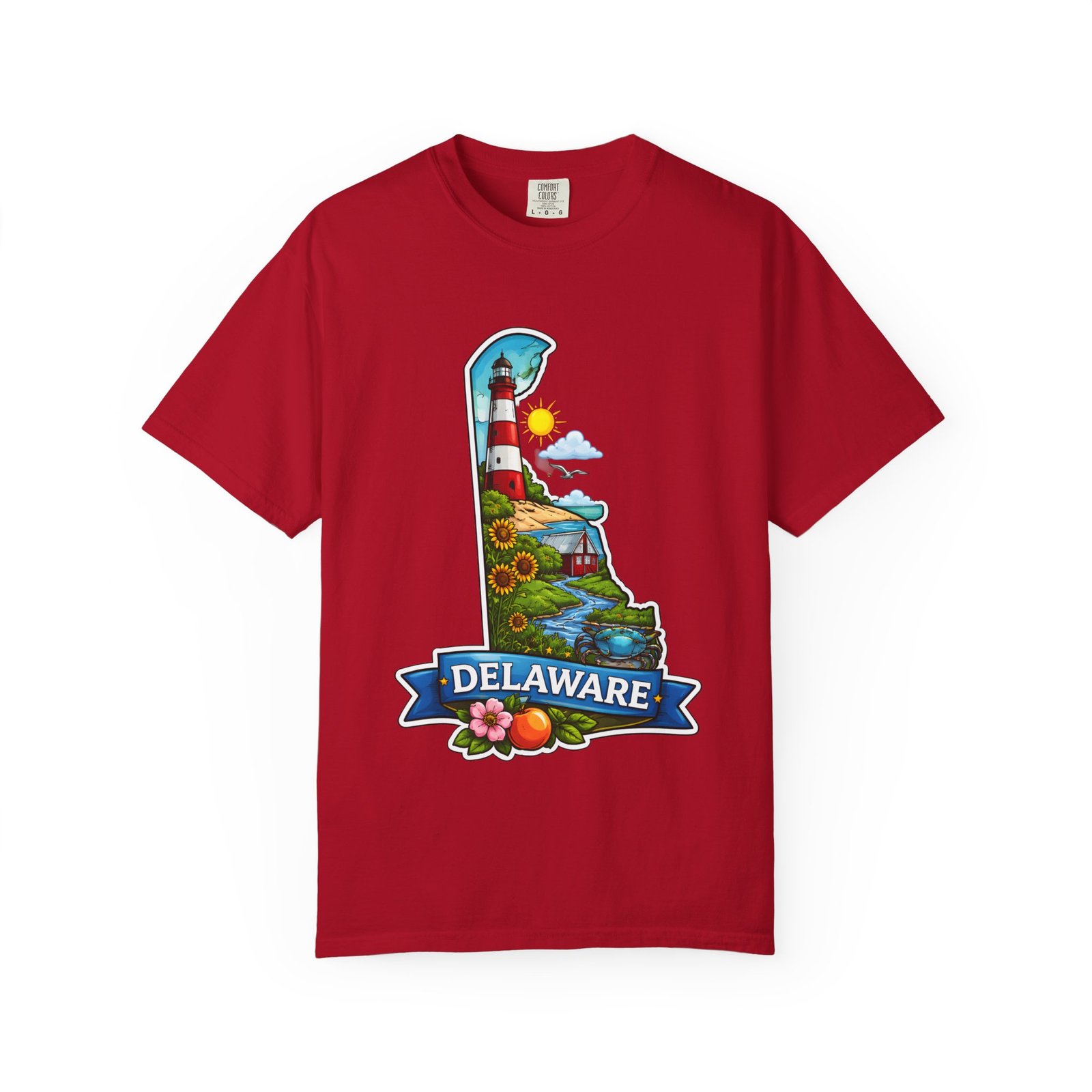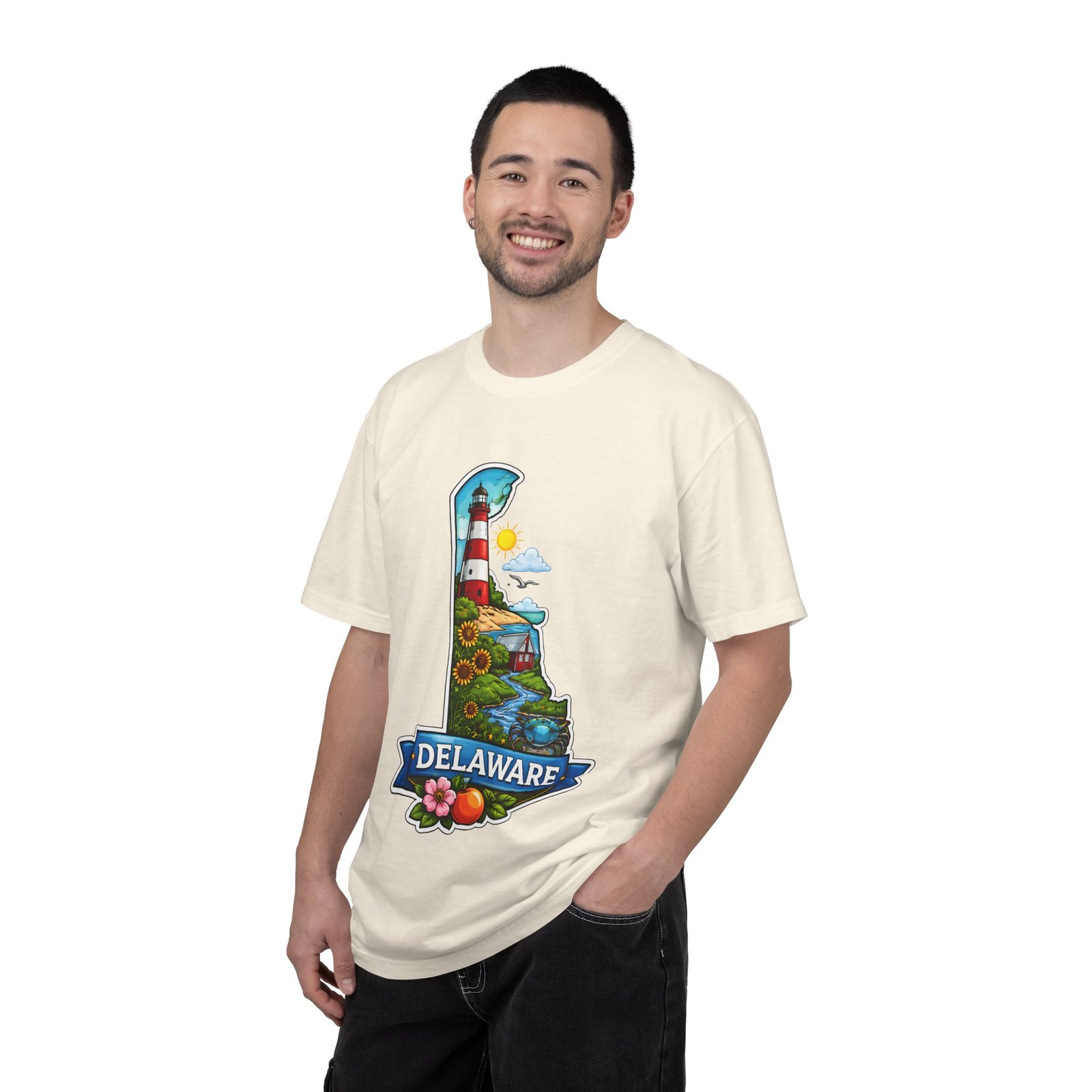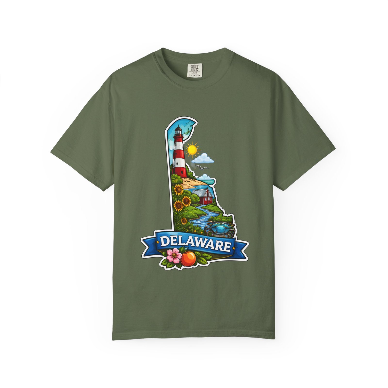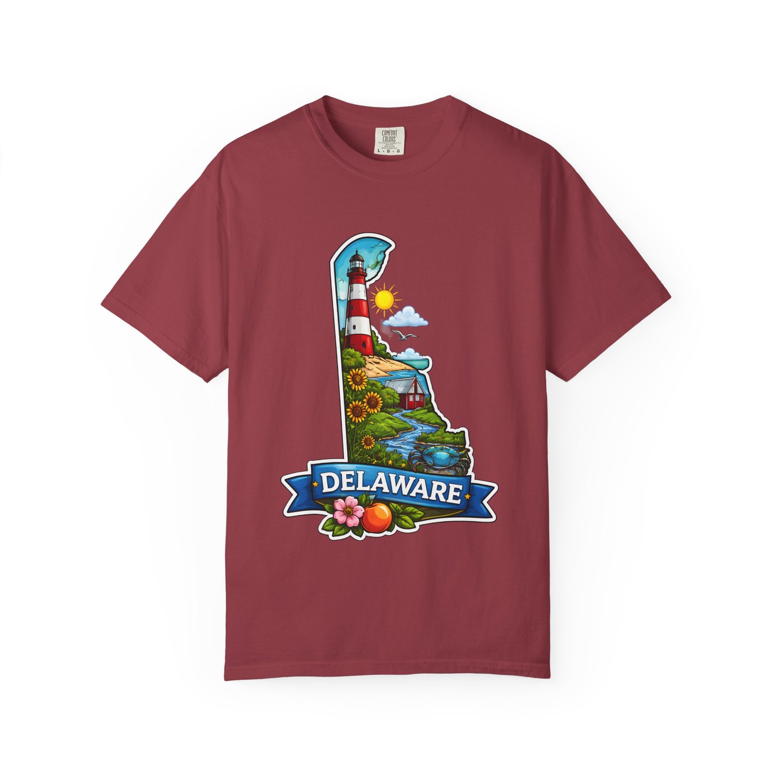 This garment-dyed tee brings a sunlit Delaware coastline to everyday wear. The soft, broken-in fabric and relaxed cut make it feel like a favorite from the first wear. The front artwork — a playful Delaware-shaped scene with lighthouse, beaches, farmland and bright banner — reads like a small travel poster worn close to the heart. Wear it to morning coffee runs, weekend drives to the shore, or backyard cookouts where conversation drifts to sea breezes and salt air. The heavyweight cotton holds the print crisply while the garment-dye process gives each shirt a lived-in softness and subtle color depth. Available in a wide range of colors and sizes, this tee layers easily under a flannel or stands alone when the temperature spikes. It suits anyone who collects state memories, shore days, or those who want a casual shirt that feels like home.