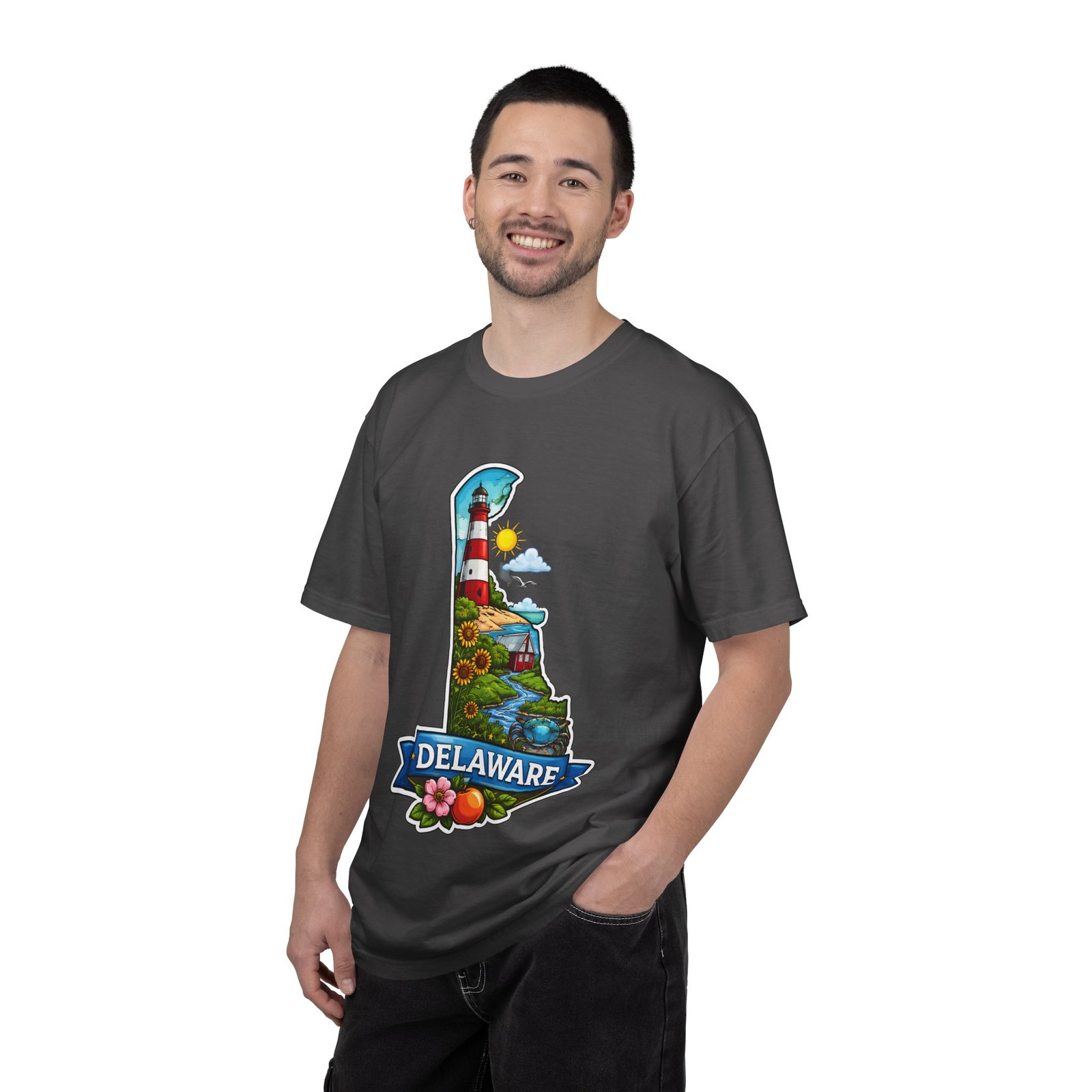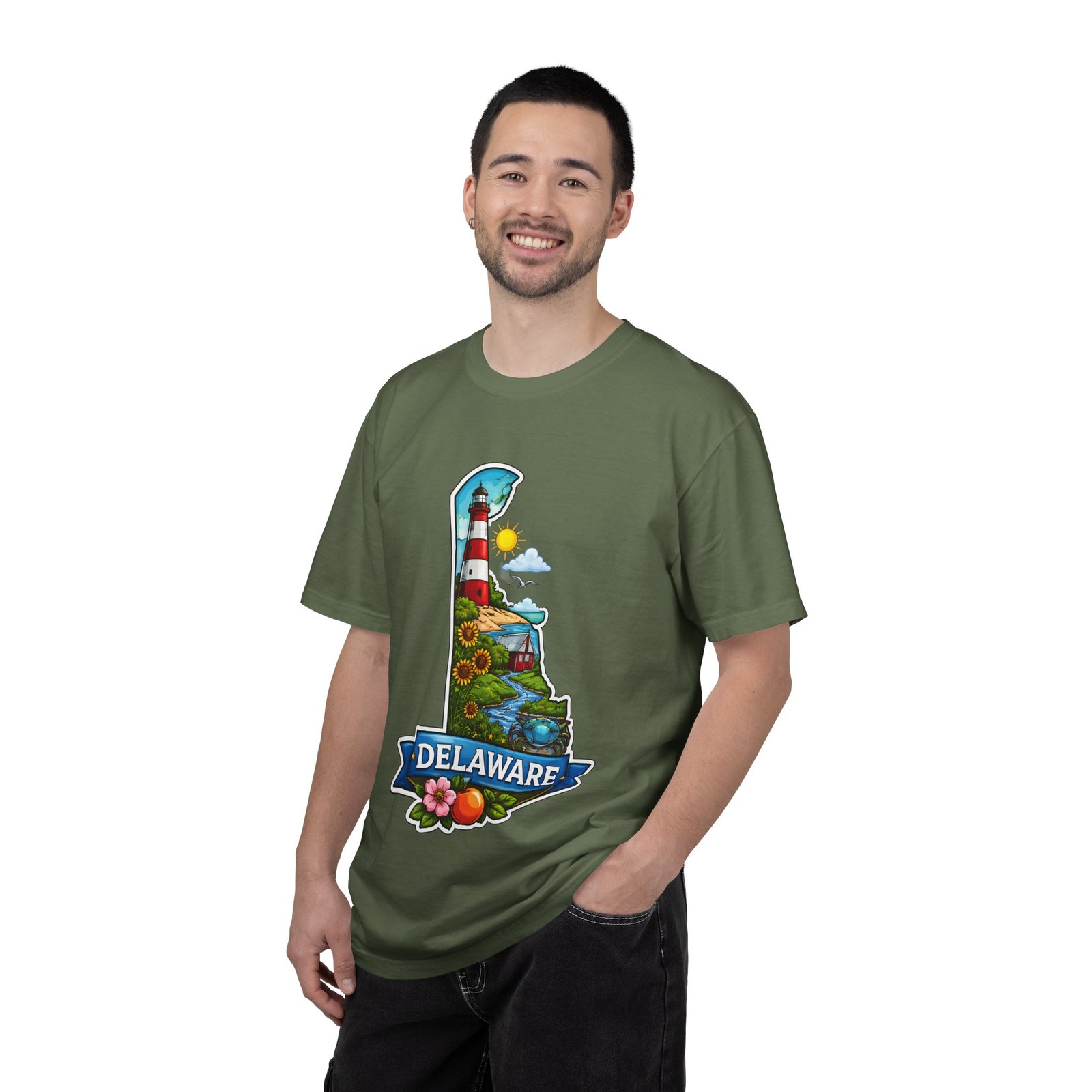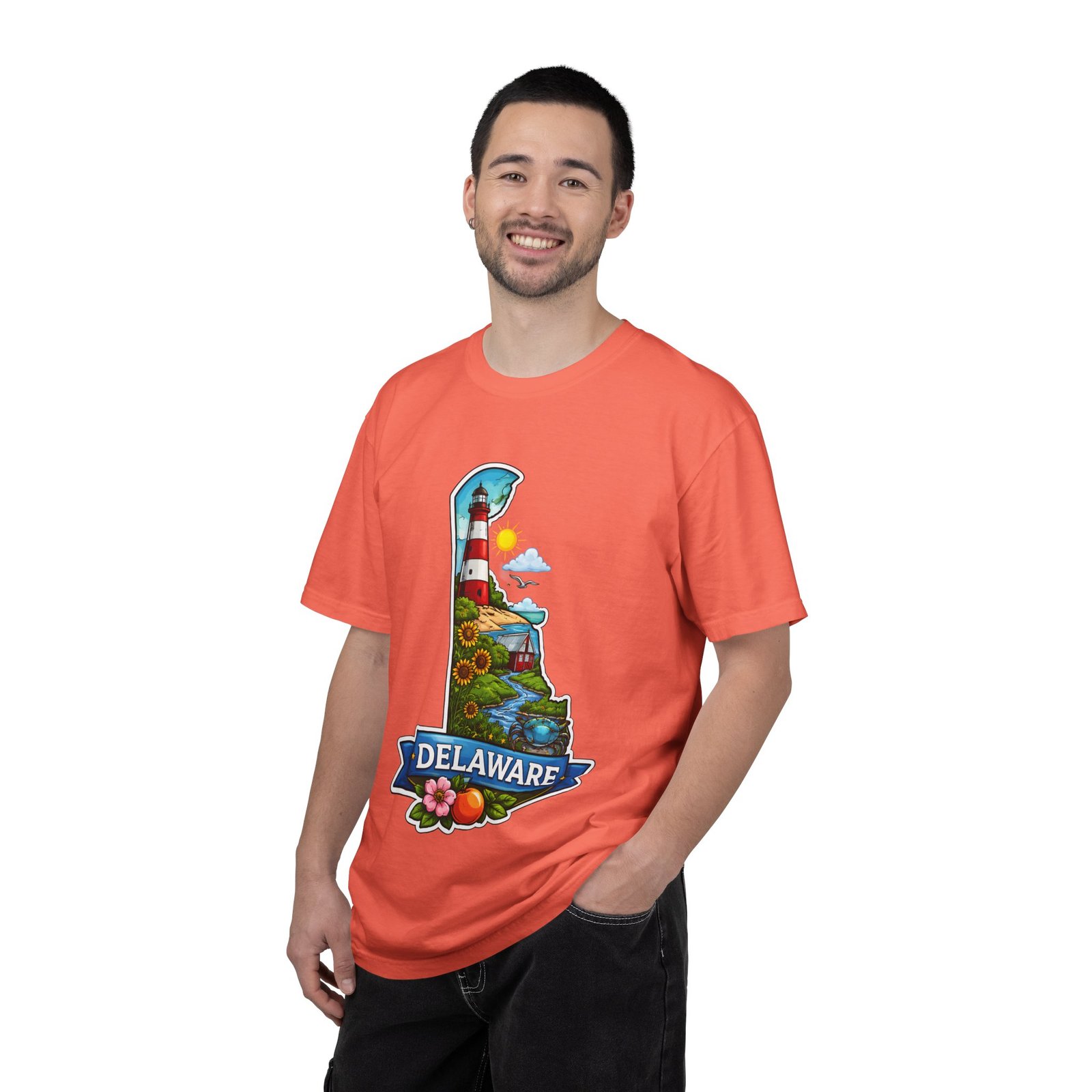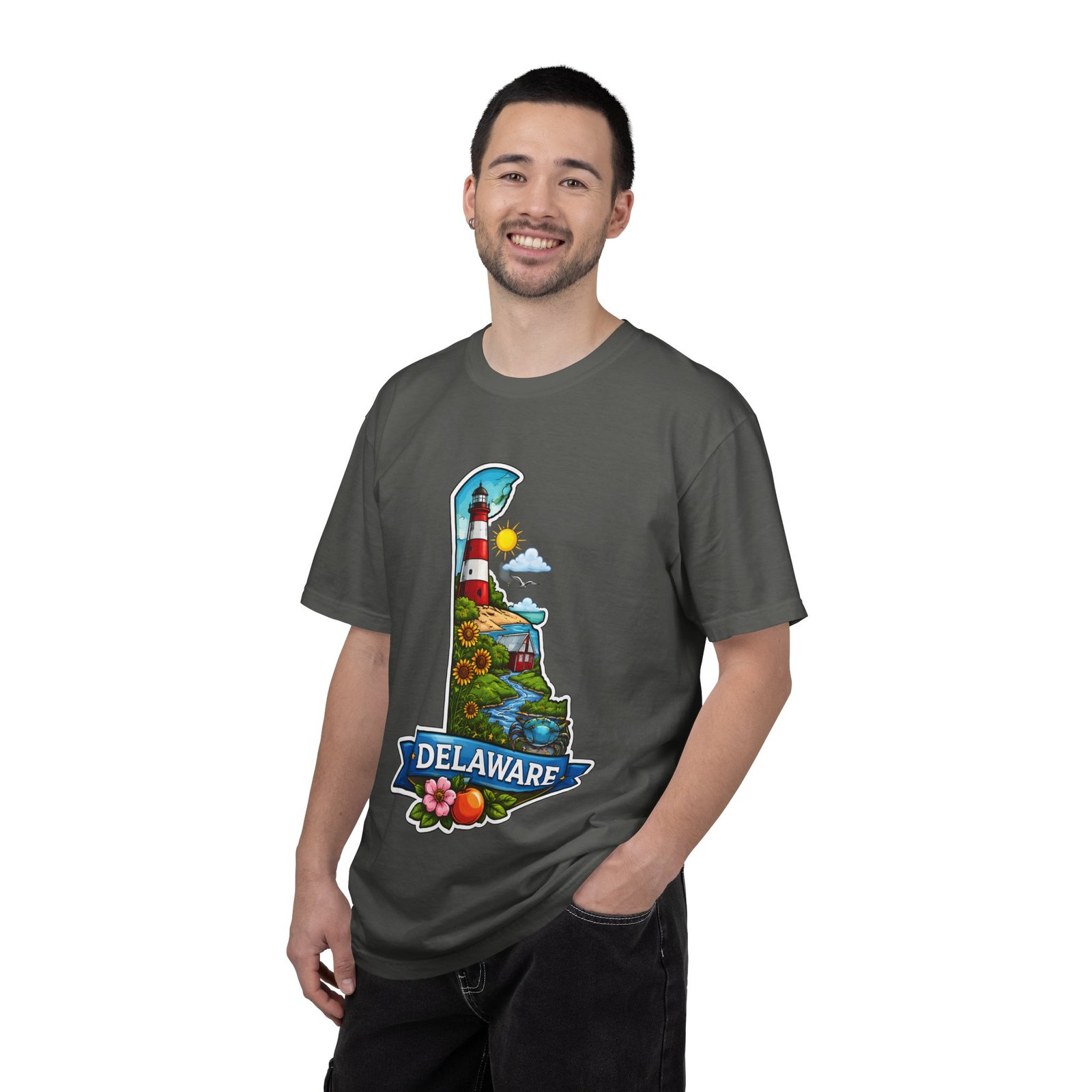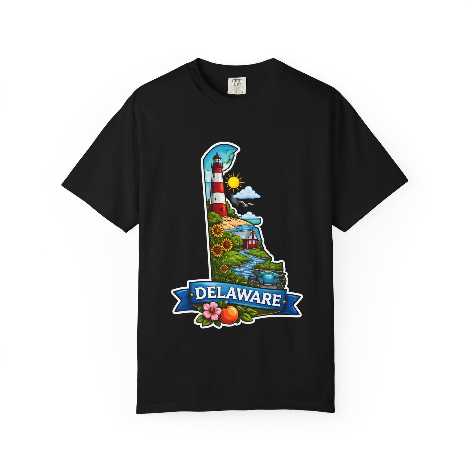 This garment-dyed tee brings a sunlit Delaware coastline to everyday wear. The soft, broken-in fabric and relaxed cut make it feel like a favorite from the first wear. The front artwork — a playful Delaware-shaped scene with lighthouse, beaches, farmland and bright banner — reads like a small travel poster worn close to the heart. Wear it to morning coffee runs, weekend drives to the shore, or backyard cookouts where conversation drifts to sea breezes and salt air. The heavyweight cotton holds the print crisply while the garment-dye process gives each shirt a lived-in softness and subtle color depth. Available in a wide range of colors and sizes, this tee layers easily under a flannel or stands alone when the temperature spikes. It suits anyone who collects state memories, shore days, or those who want a casual shirt that feels like home.