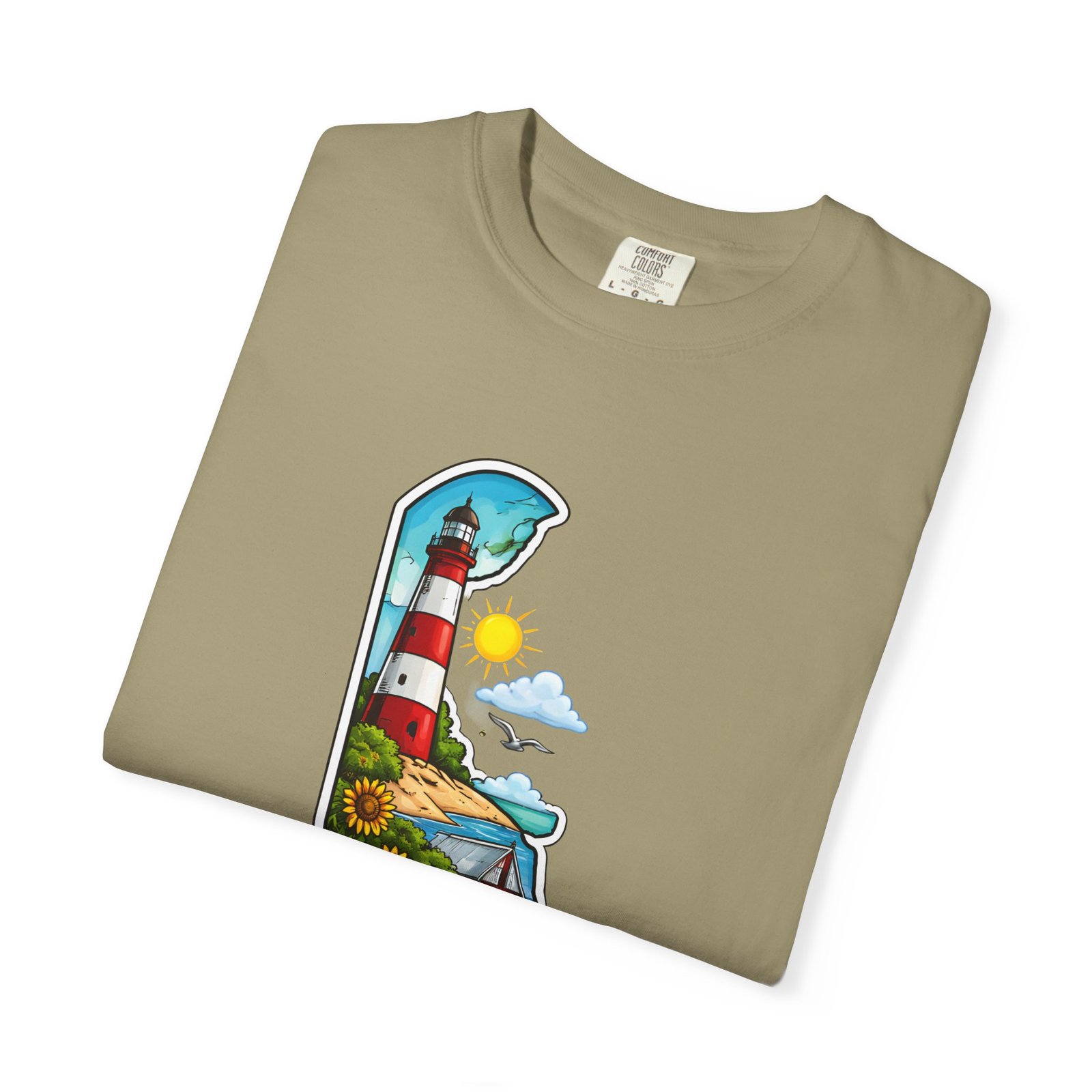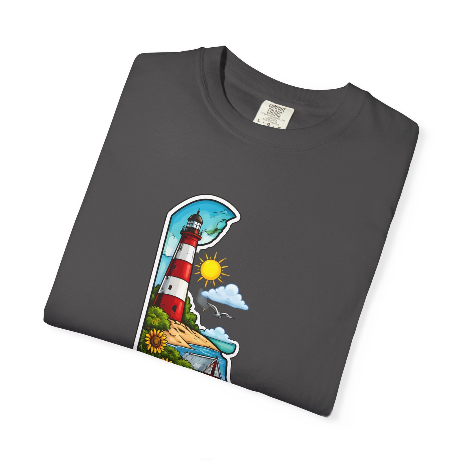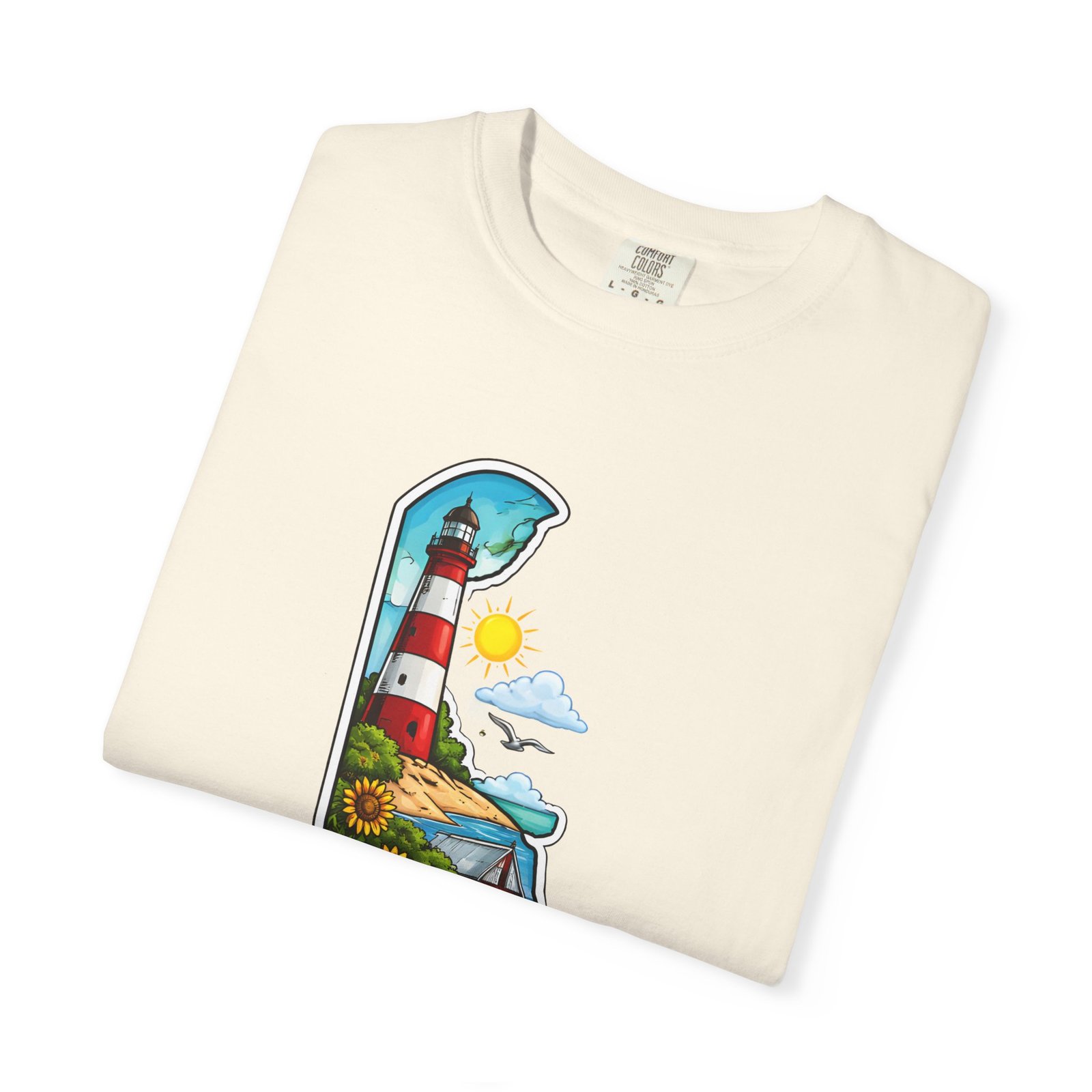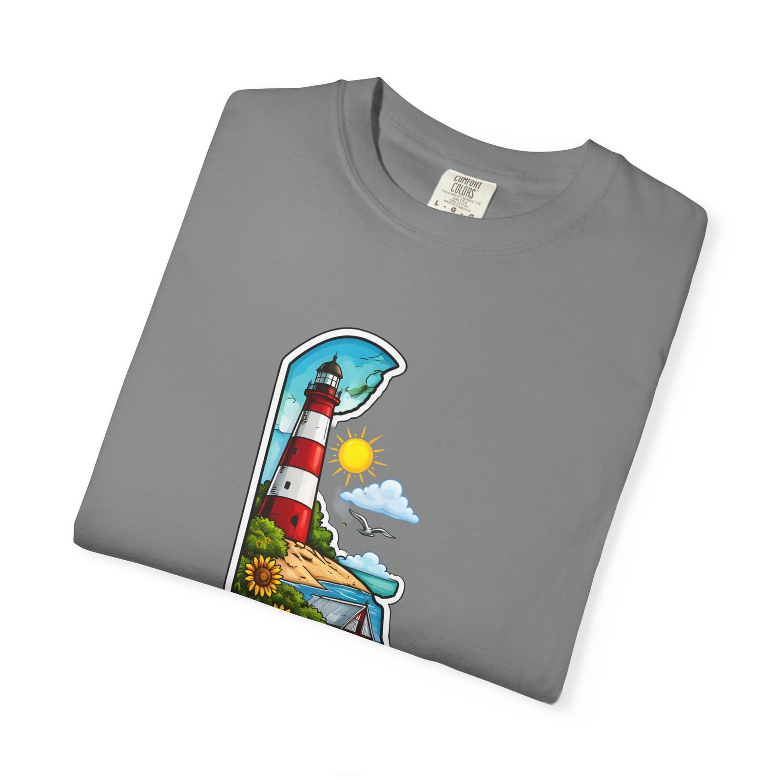 This garment-dyed tee brings a sunlit Delaware coastline to everyday wear. The soft, broken-in fabric and relaxed cut make it feel like a favorite from the first wear. The front artwork — a playful Delaware-shaped scene with lighthouse, beaches, farmland and bright banner — reads like a small travel poster worn close to the heart. Wear it to morning coffee runs, weekend drives to the shore, or backyard cookouts where conversation drifts to sea breezes and salt air. The heavyweight cotton holds the print crisply while the garment-dye process gives each shirt a lived-in softness and subtle color depth. Available in a wide range of colors and sizes, this tee layers easily under a flannel or stands alone when the temperature spikes. It suits anyone who collects state memories, shore days, or those who want a casual shirt that feels like home.