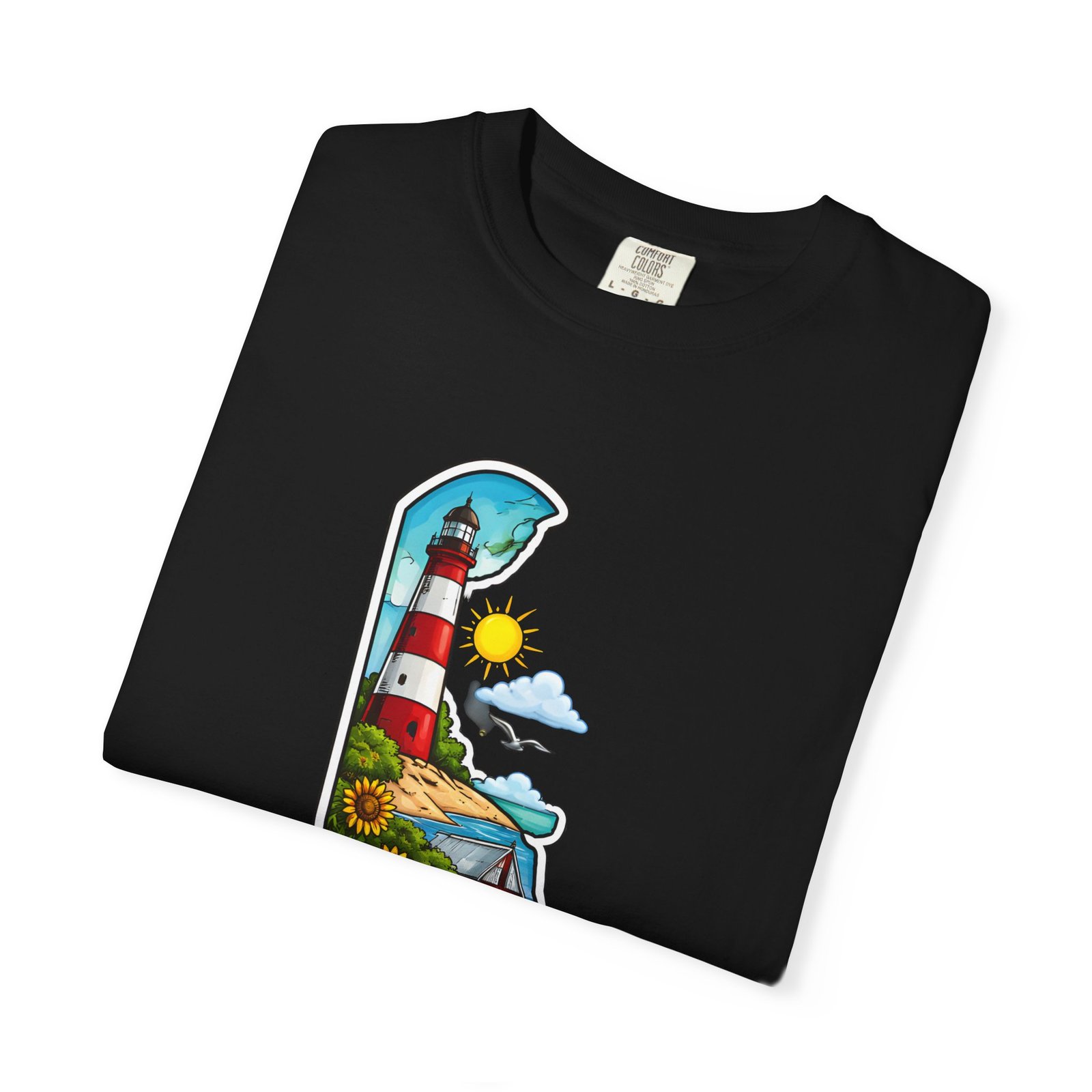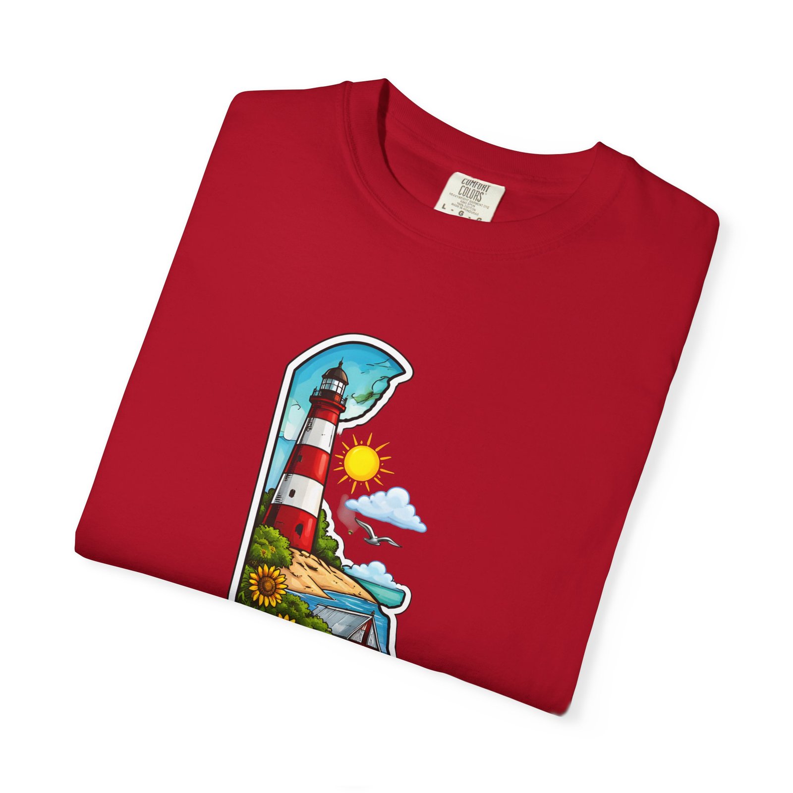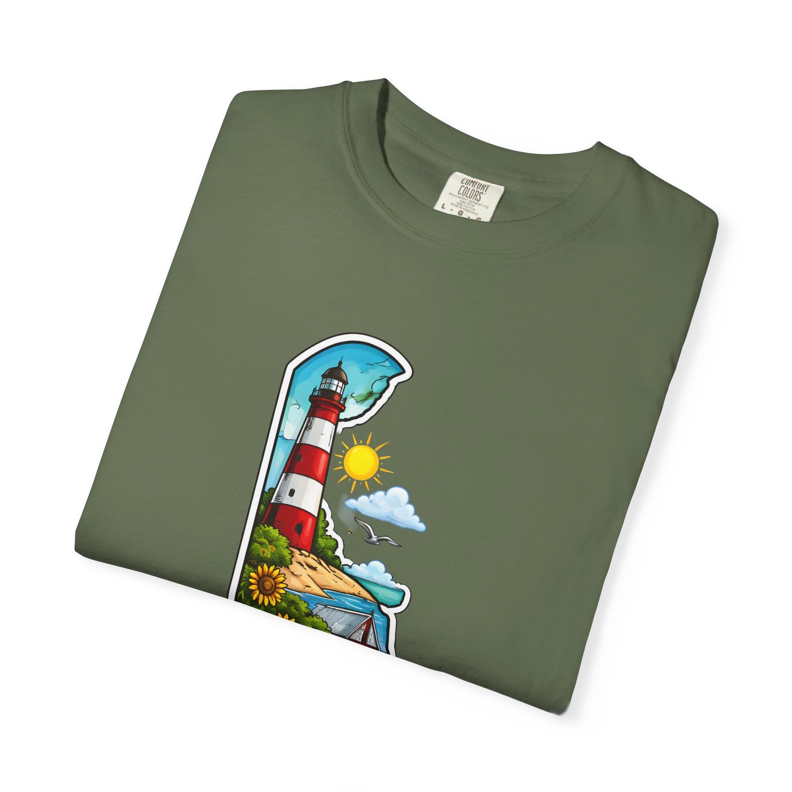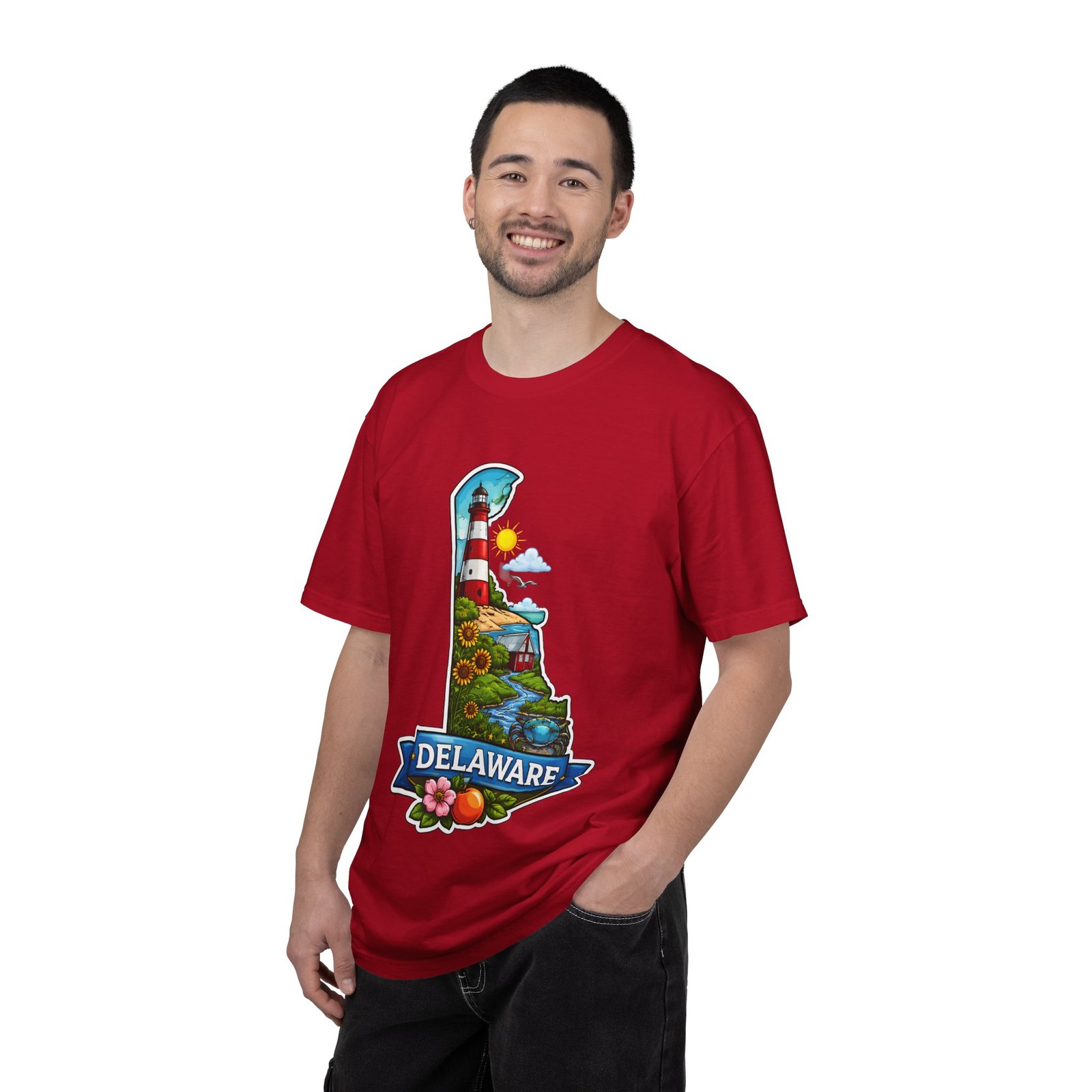 This garment-dyed tee brings a sunlit Delaware coastline to everyday wear. The soft, broken-in fabric and relaxed cut make it feel like a favorite from the first wear. The front artwork — a playful Delaware-shaped scene with lighthouse, beaches, farmland and bright banner — reads like a small travel poster worn close to the heart. Wear it to morning coffee runs, weekend drives to the shore, or backyard cookouts where conversation drifts to sea breezes and salt air. The heavyweight cotton holds the print crisply while the garment-dye process gives each shirt a lived-in softness and subtle color depth. Available in a wide range of colors and sizes, this tee layers easily under a flannel or stands alone when the temperature spikes. It suits anyone who collects state memories, shore days, or those who want a casual shirt that feels like home.