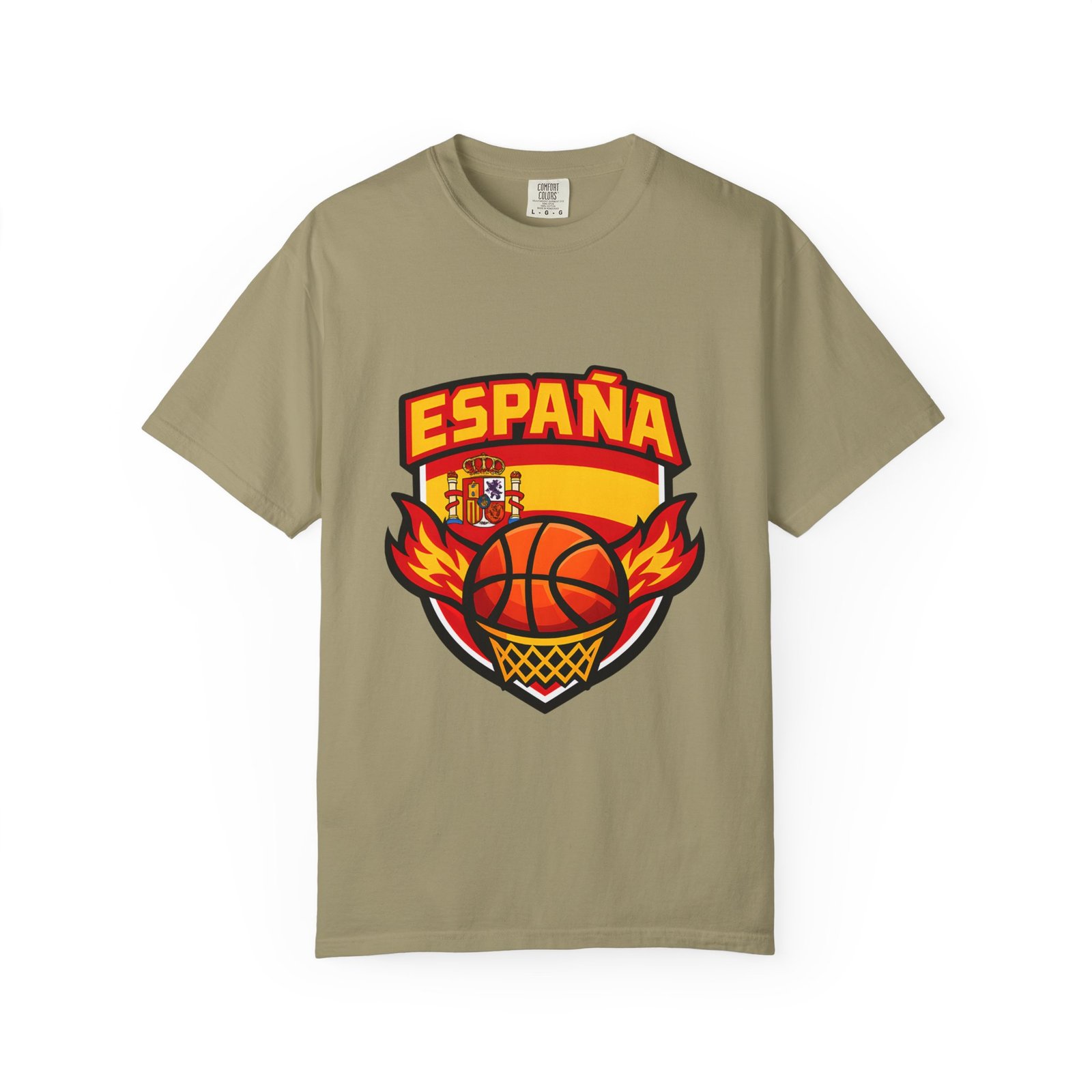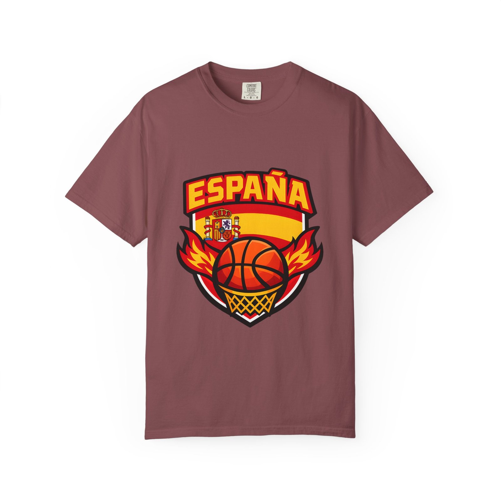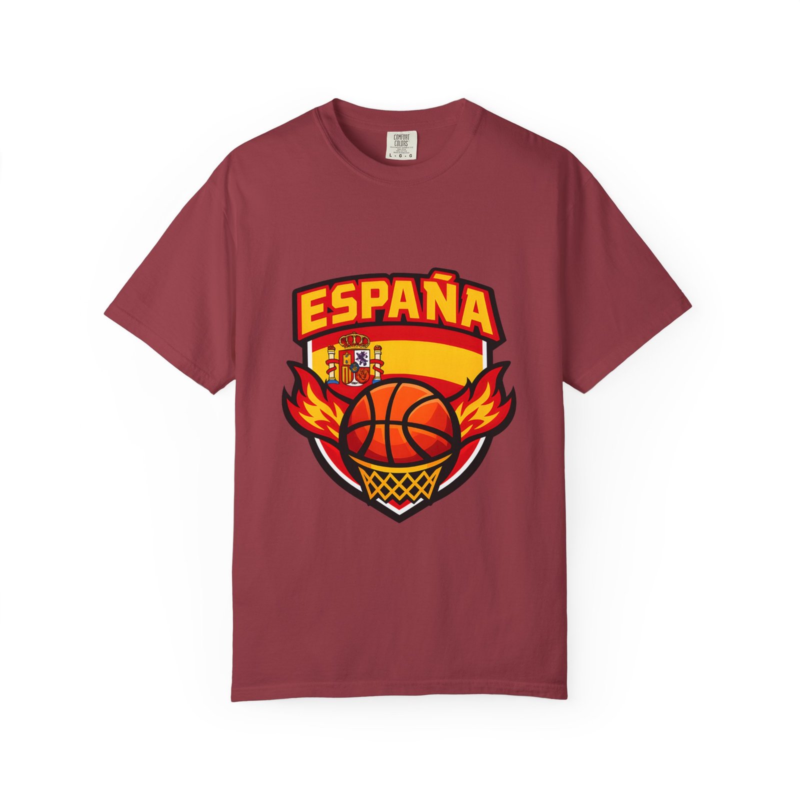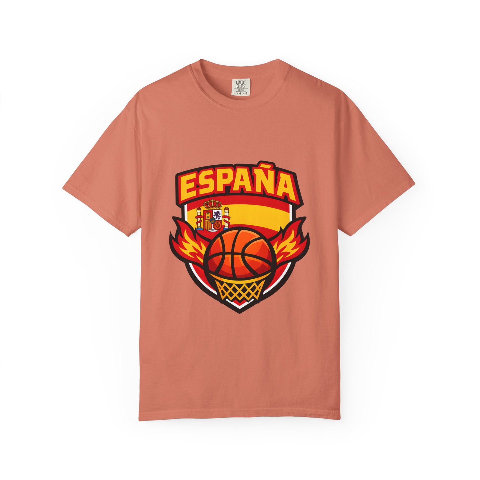 This garment-dyed tee brings warm, lived-in color and a bold Spanish basketball emblem to everyday wear. The heavy, 6.1 oz cotton feels substantial and soft after dyeing, so the shirt drapes with a relaxed, broken-in comfort that welcomes hours on the court, at a rally, or cheering from the stands. The fiery basketball crest and “España” banner read loud and proud, adding sporty energy to a casual wardrobe. Sizes run S–4XL and the tubular knit means clean lines with no side seams — a simple silhouette that showcases the graphic front and ages beautifully with wash after wash. Wear it to watch a match, for pickup games, or layered under a jacket when the evening cools; it’s built to feel like an old favorite from day one.